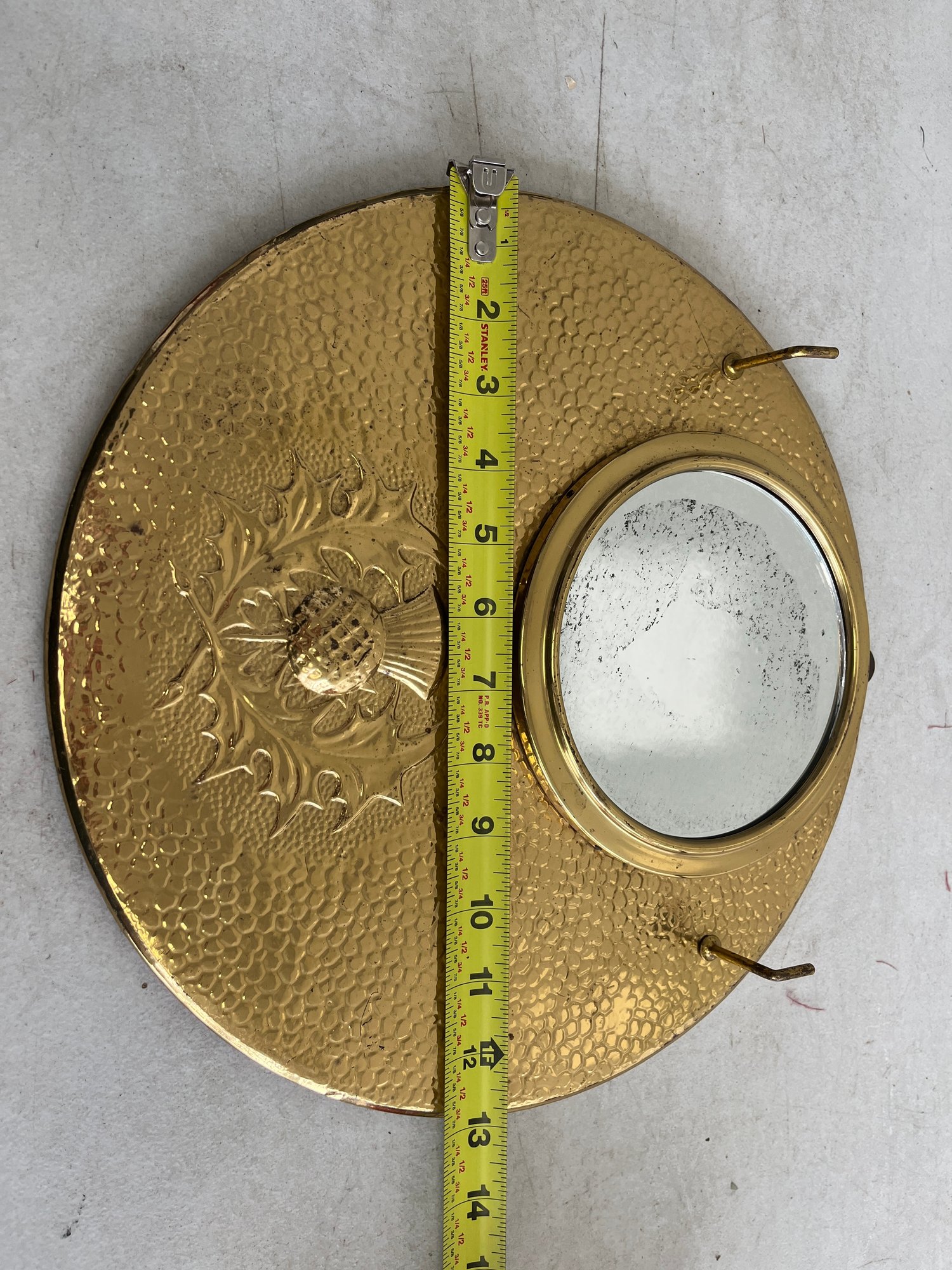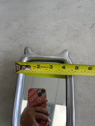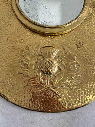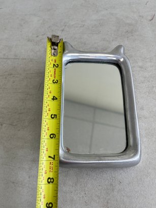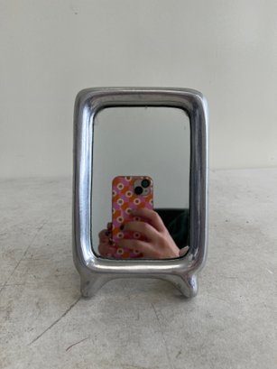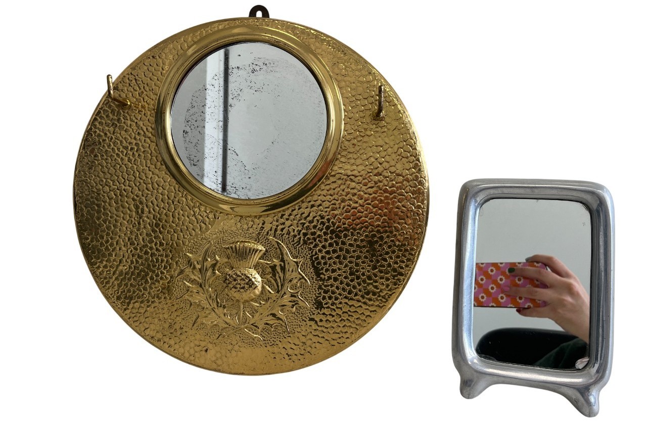 A curated lot featuring two distinct examples of 20th-century decorative mirrors, including a significant Arts & Crafts-style wall mirror and a sleek Mid-Century Modern vanity mirror. This lot provides excellent examples of contrasting period design aesthetics.