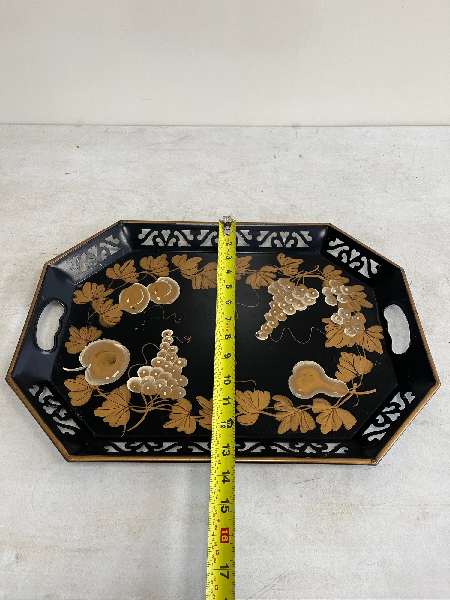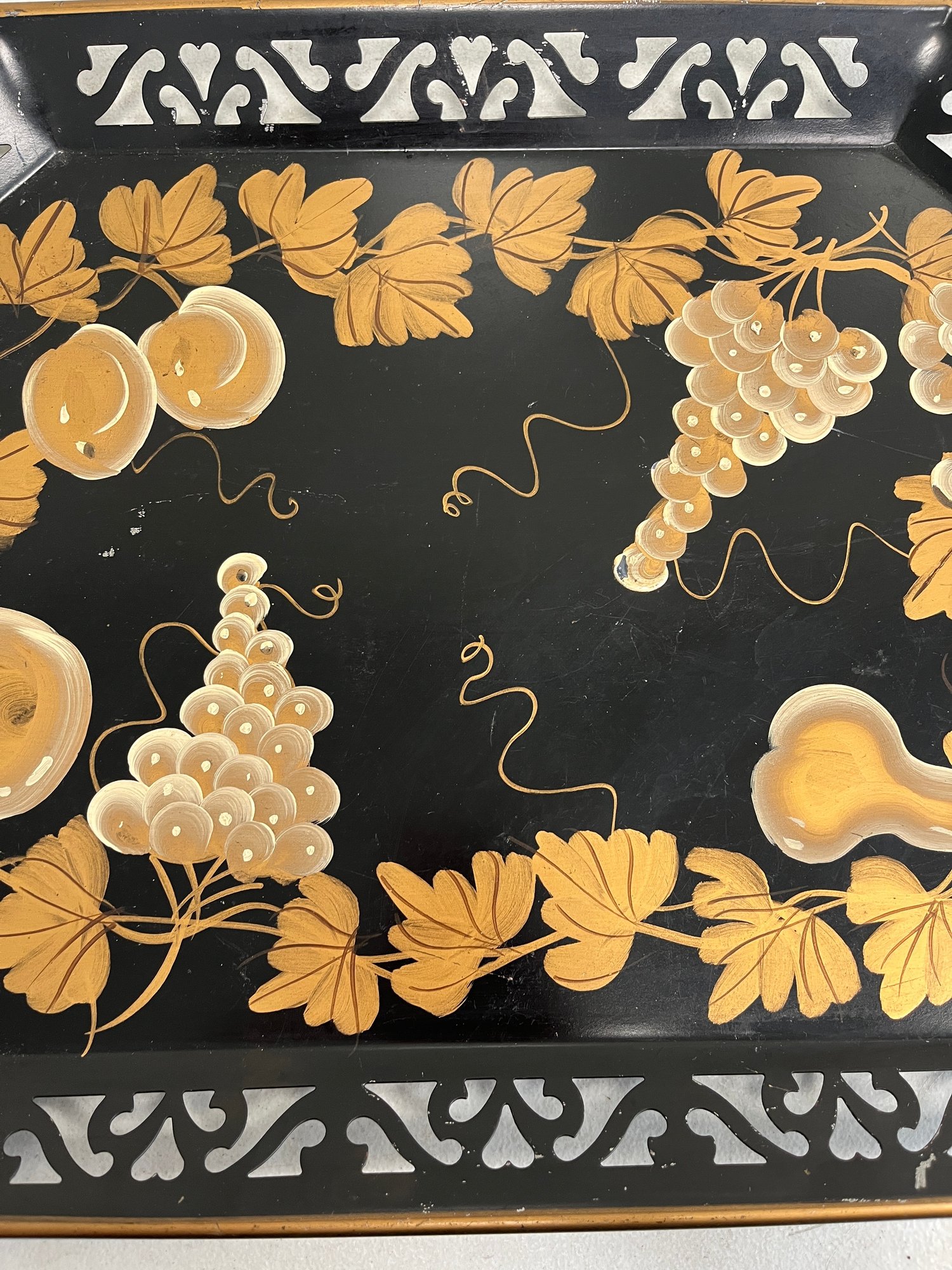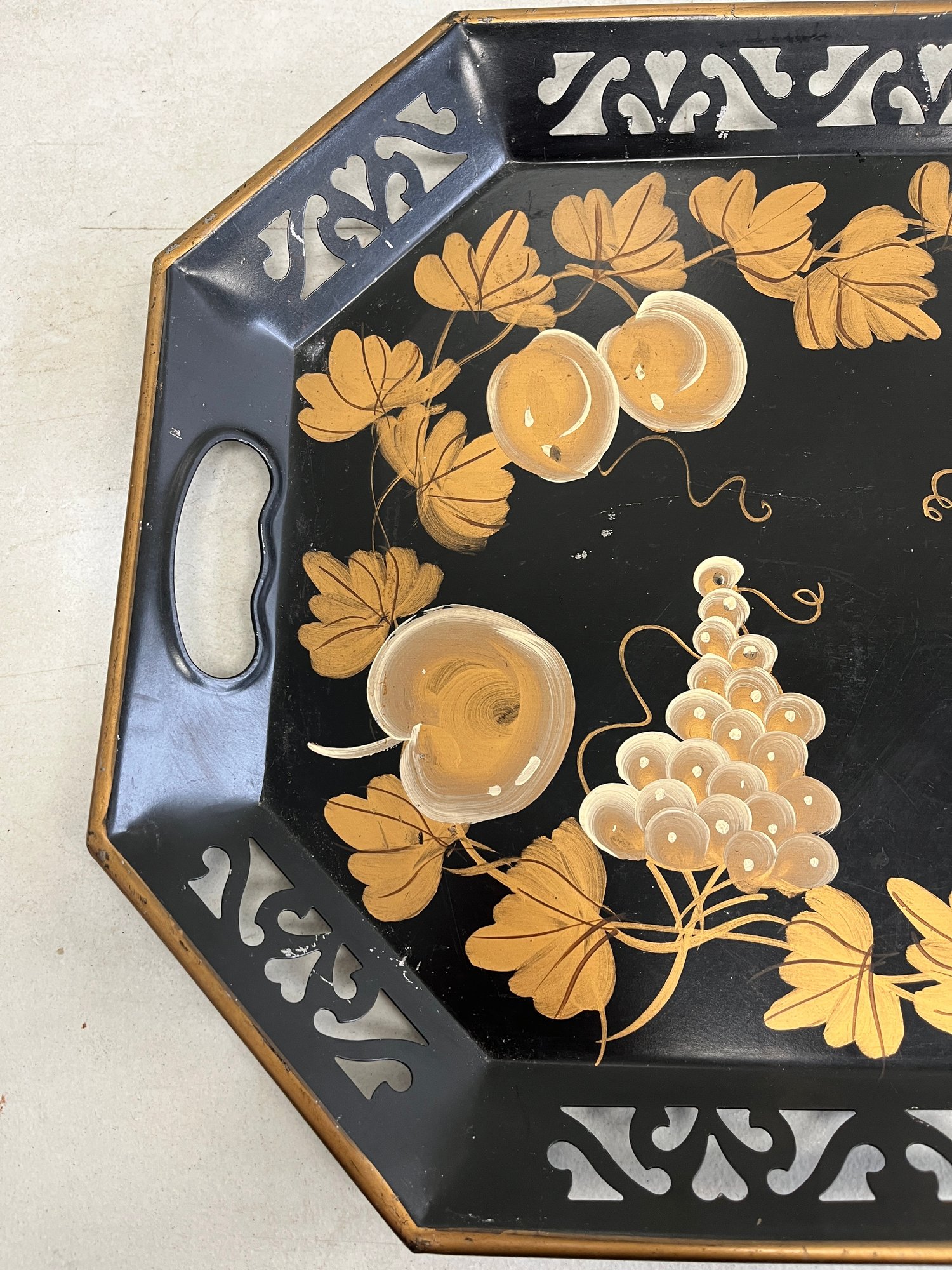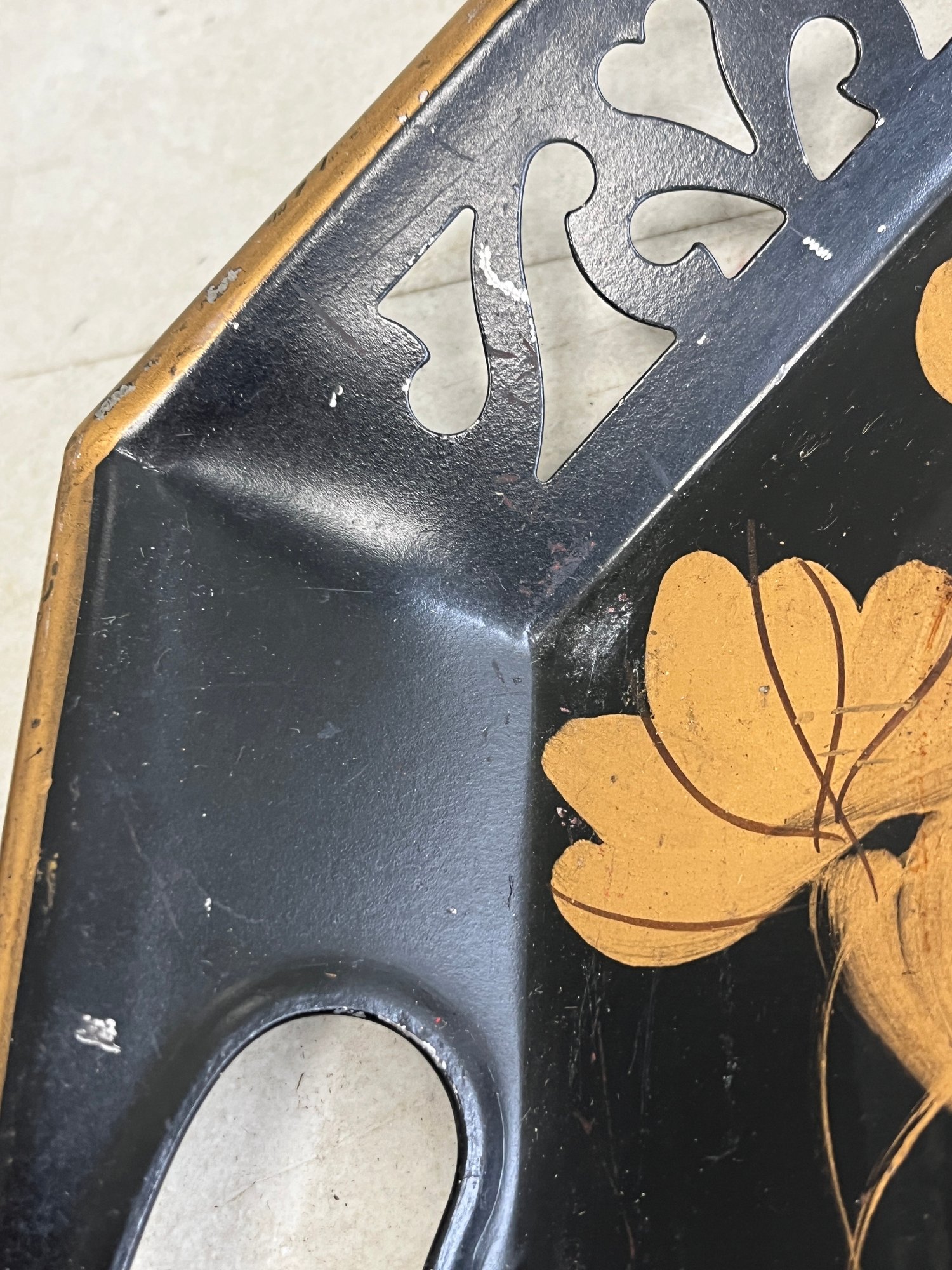 a vintage hand-painted toleware serving tray, a popular mid-20th-century decorative item. Toleware refers to lacquered and decorated tinware.