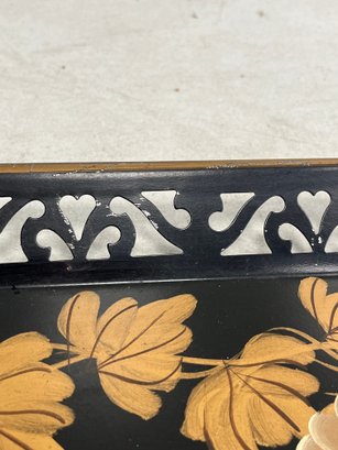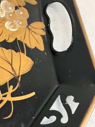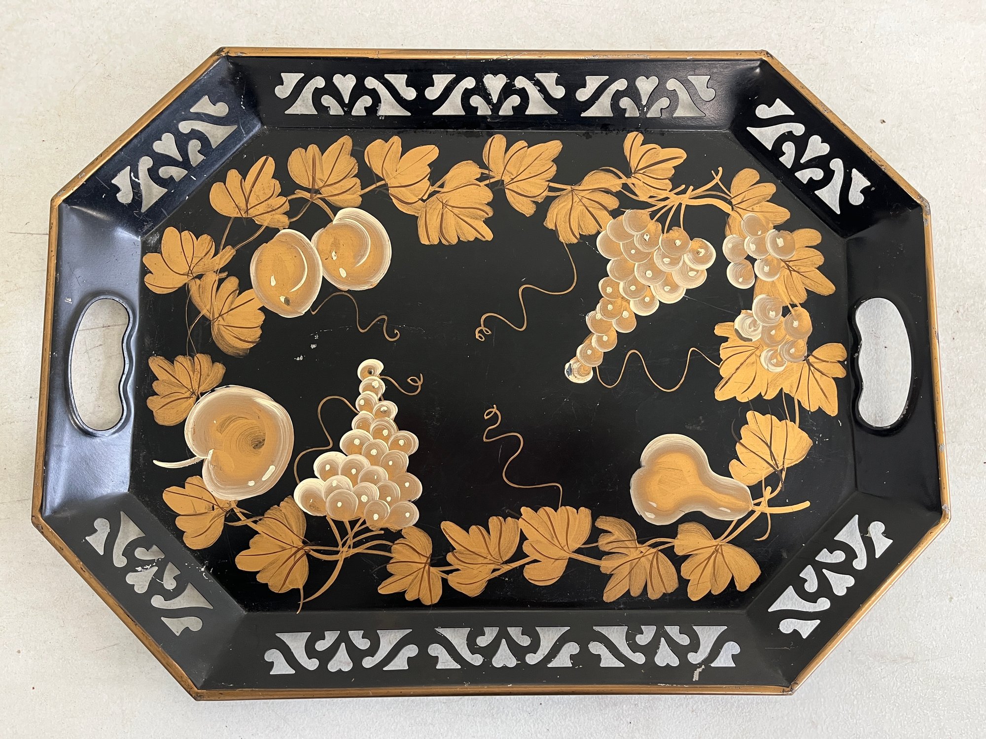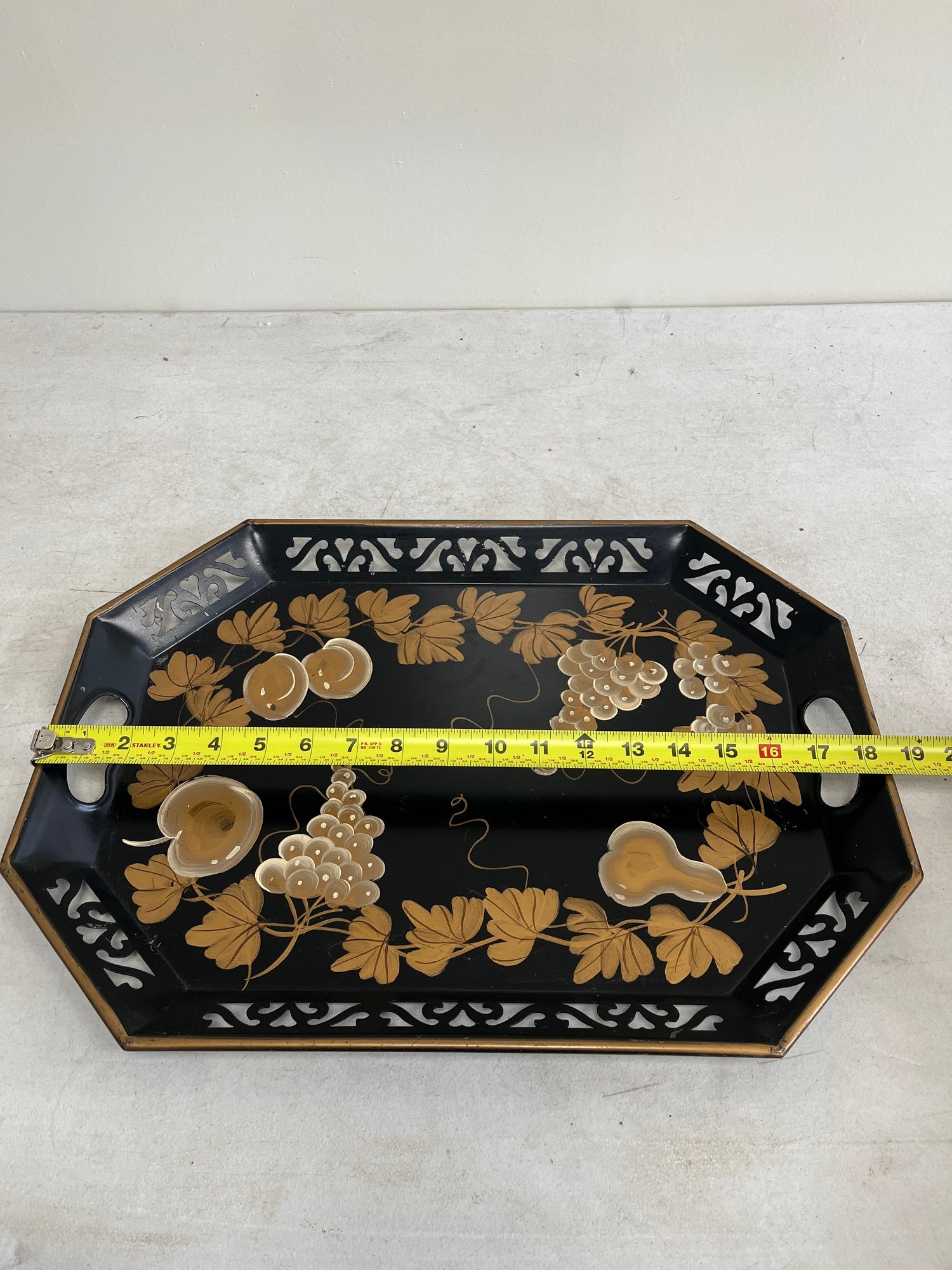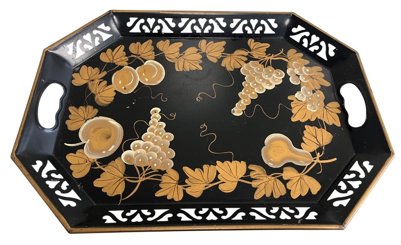 a vintage hand-painted toleware serving tray, a popular mid-20th-century decorative item. Toleware refers to lacquered and decorated tinware.