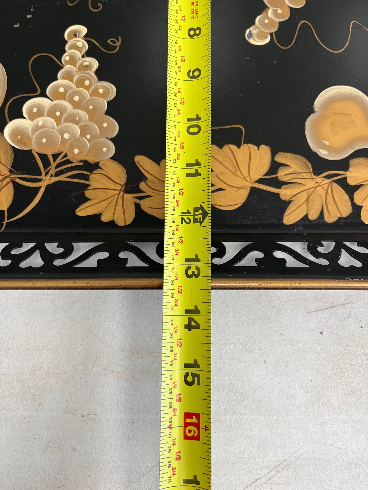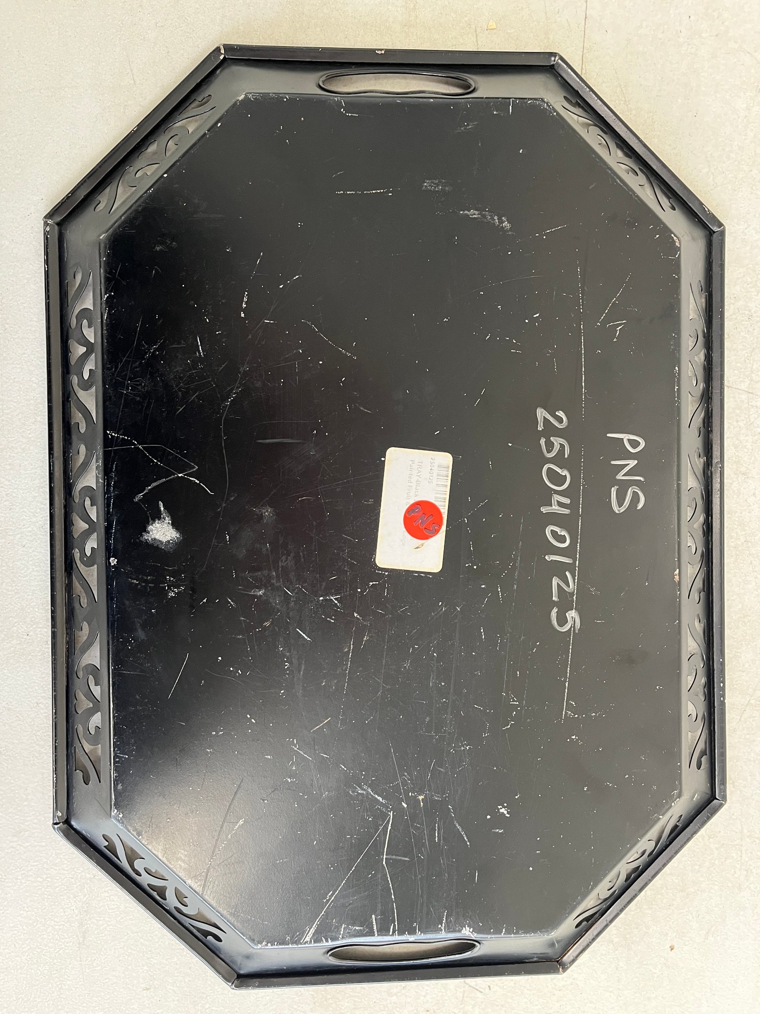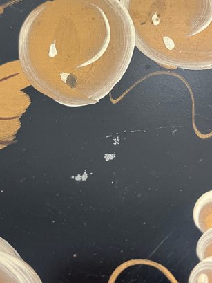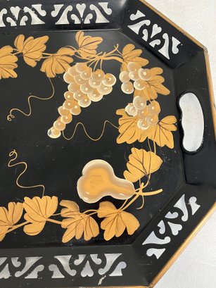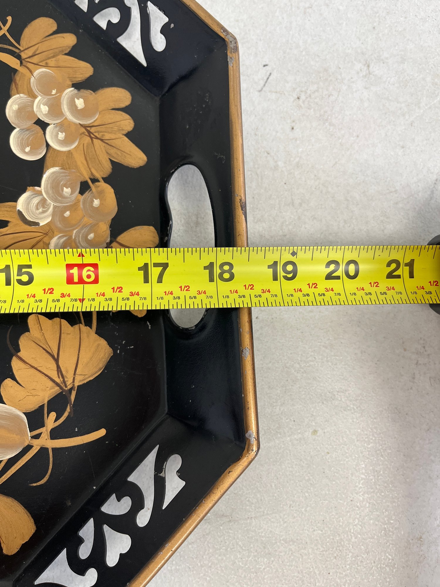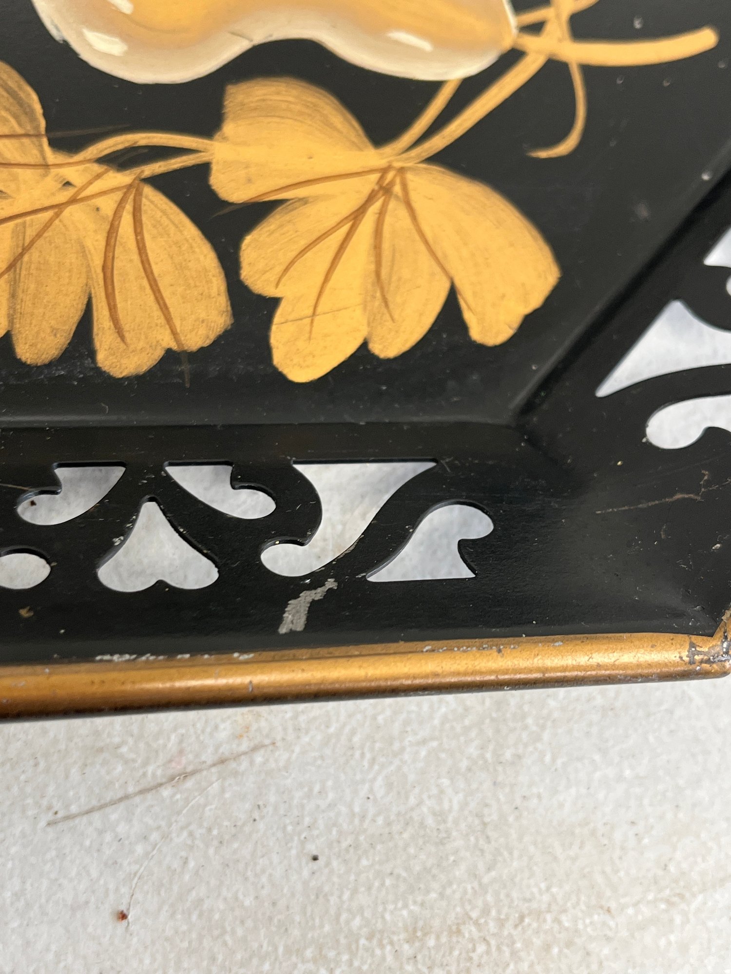 a vintage hand-painted toleware serving tray, a popular mid-20th-century decorative item. Toleware refers to lacquered and decorated tinware.