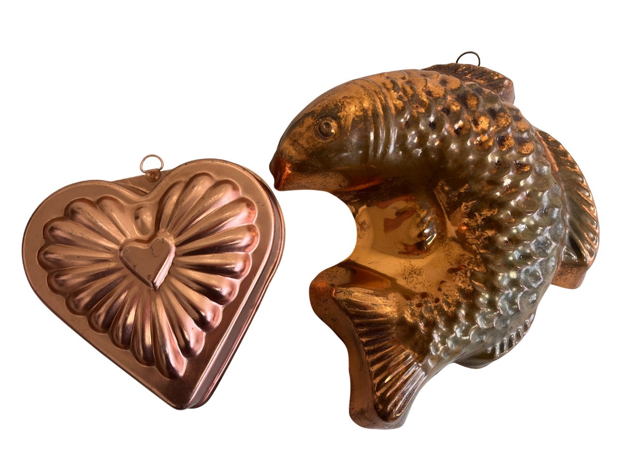 A charming pair of vintage molds, perfect for the discerning chef or collector looking to add rustic elegance to their kitchen decor. Ideal for creating aspics, gelatin desserts, small cakes, or terrines, they also serve as popular farmhouse or cottagecore wall art, adding a warm, coppery glow to any space.