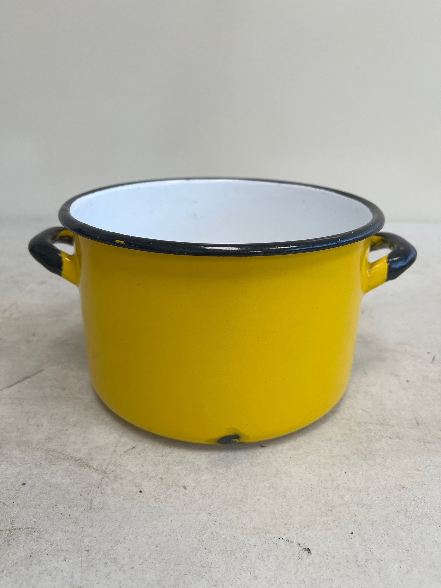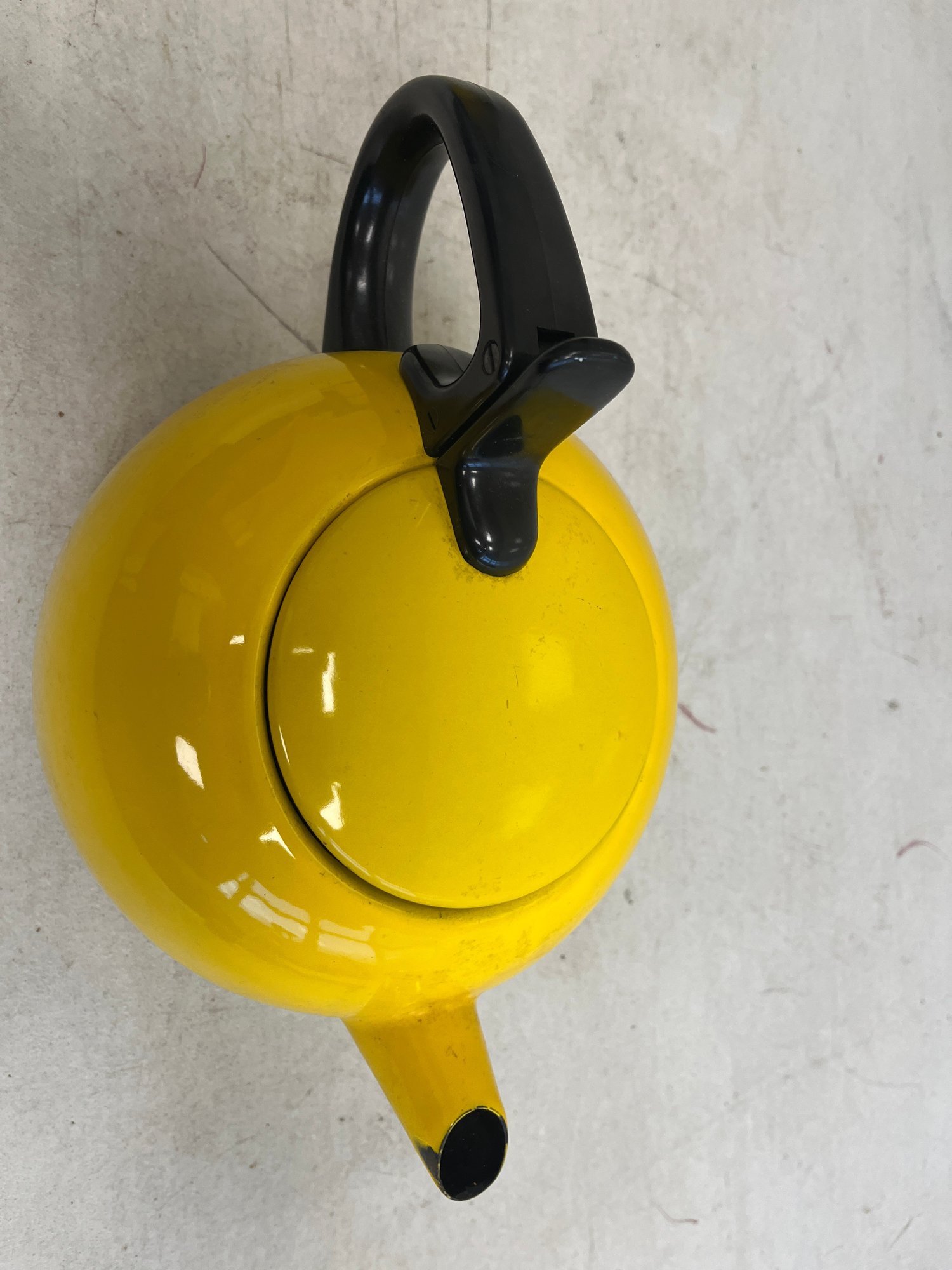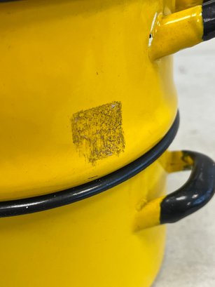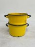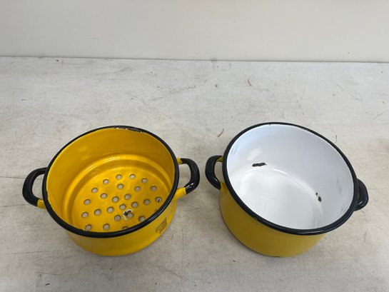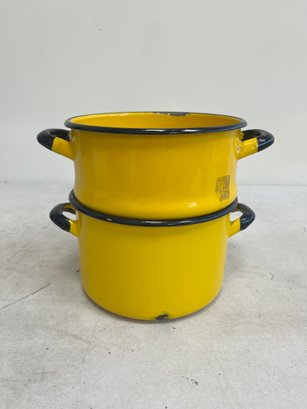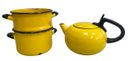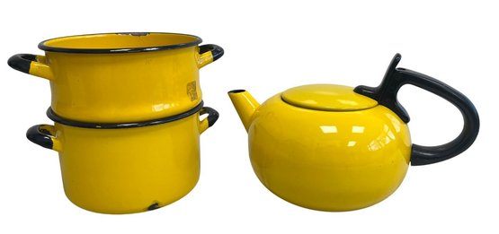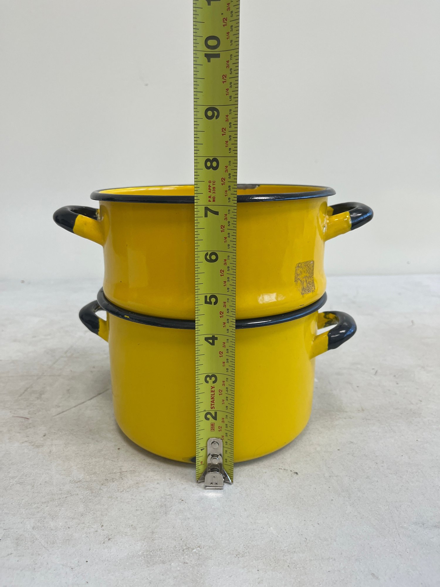 Add a pop of vibrant, retro color and functional style to your kitchen with this vintage Huta Silesia enamelware stacking steamer and Japanese "bubble" kettle. This type of enamelware was popular due to its durability, light weight, and ease of cleaning compared to other options of its era.