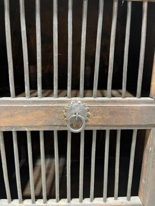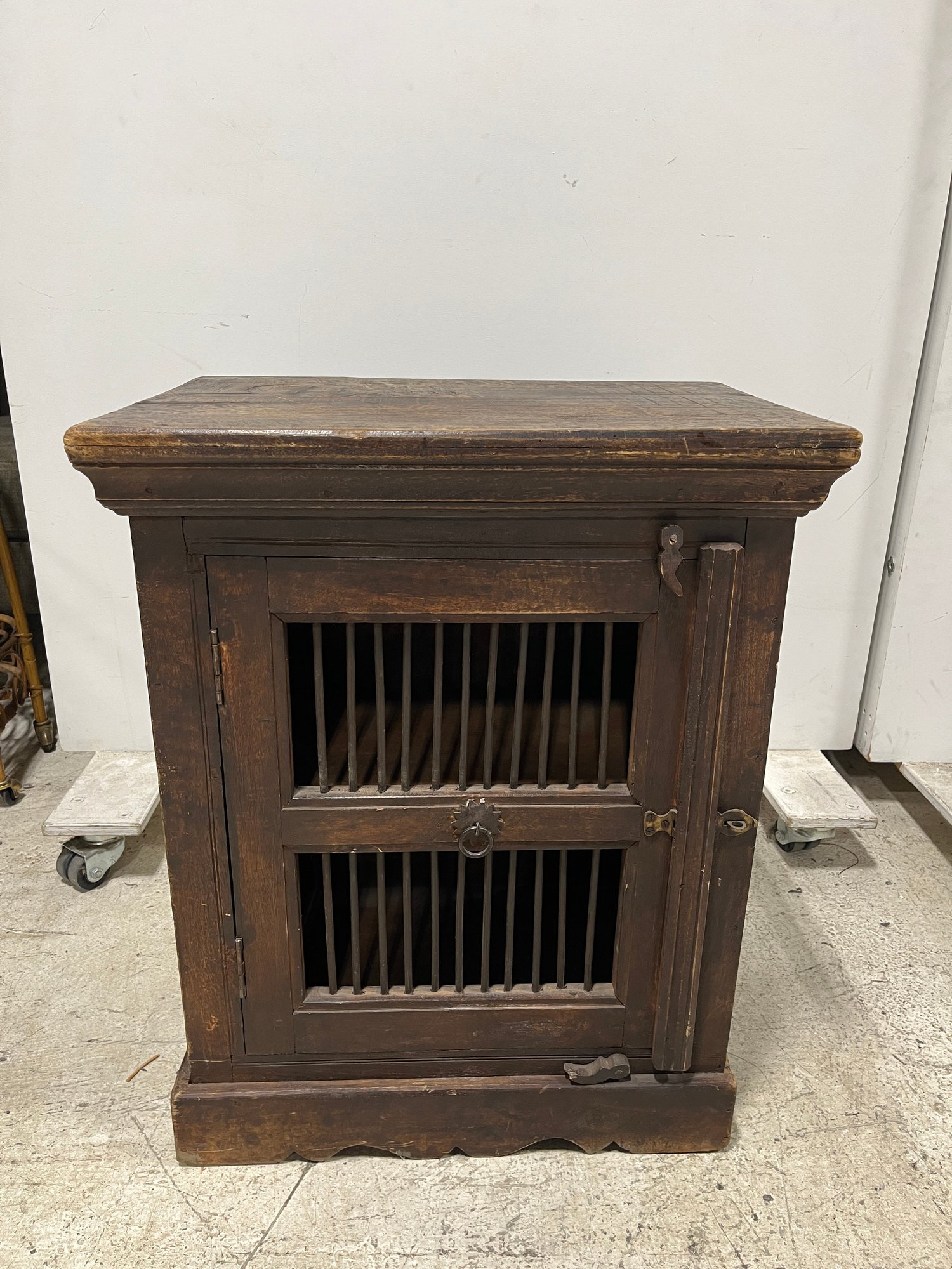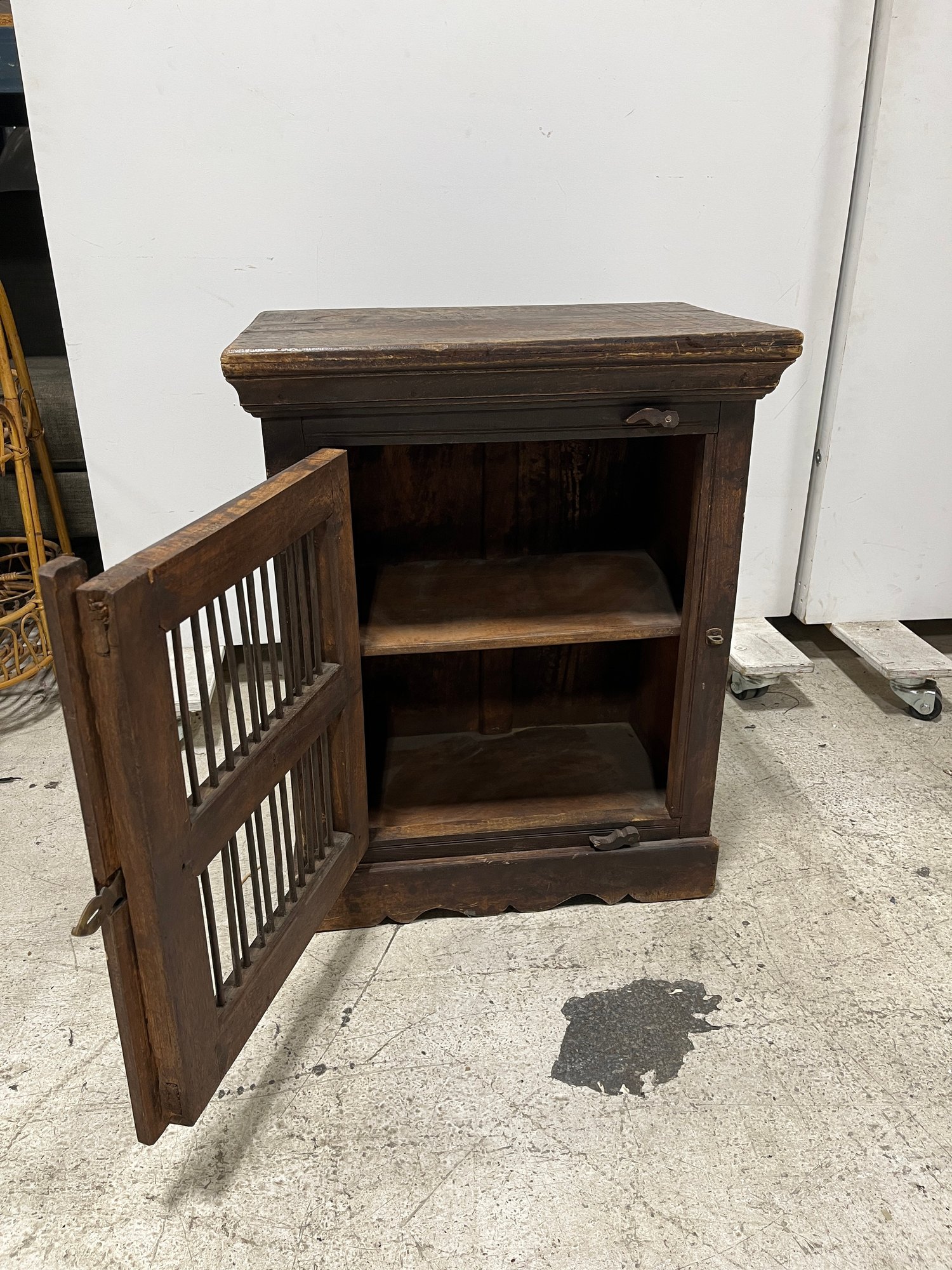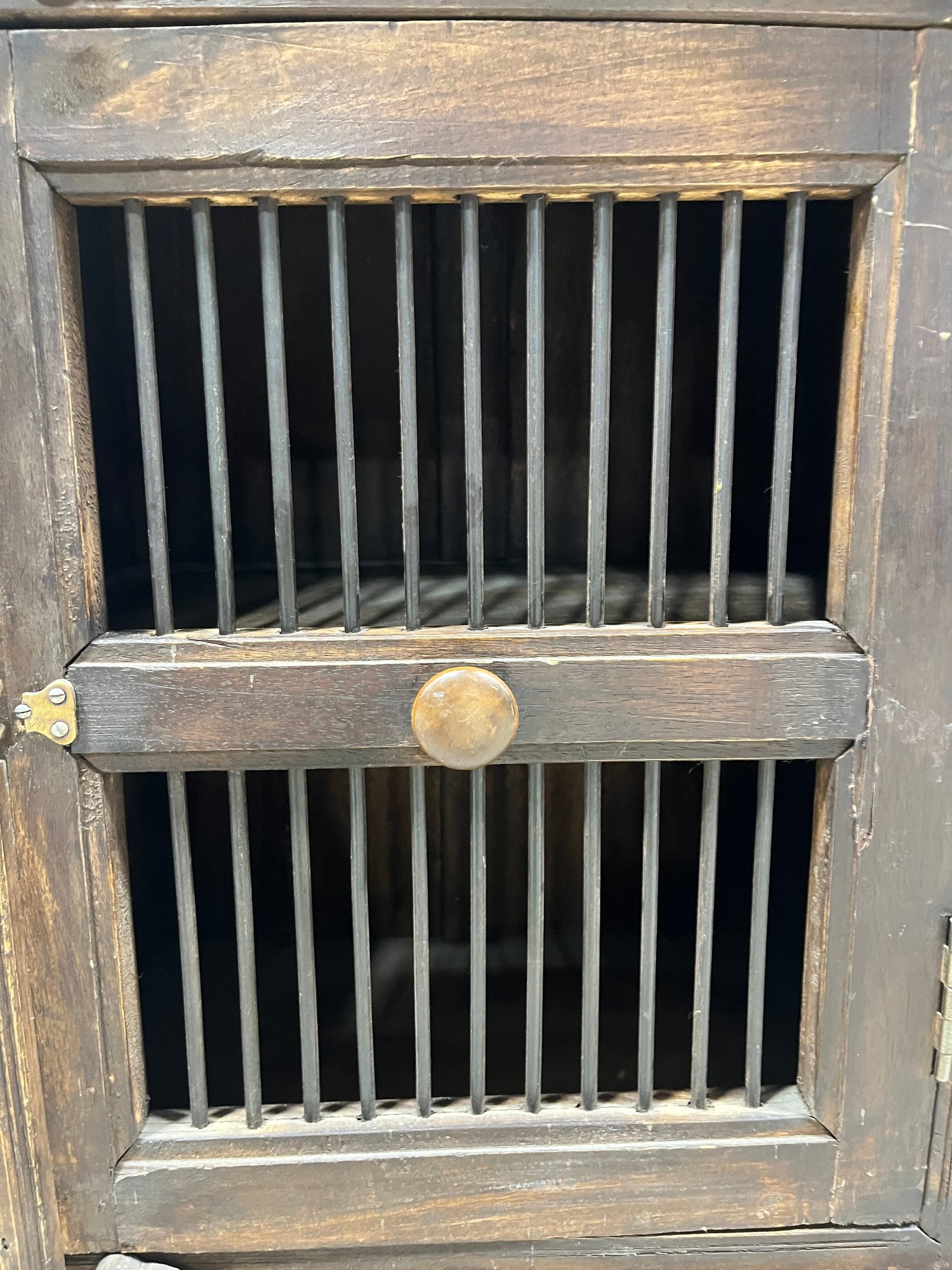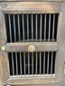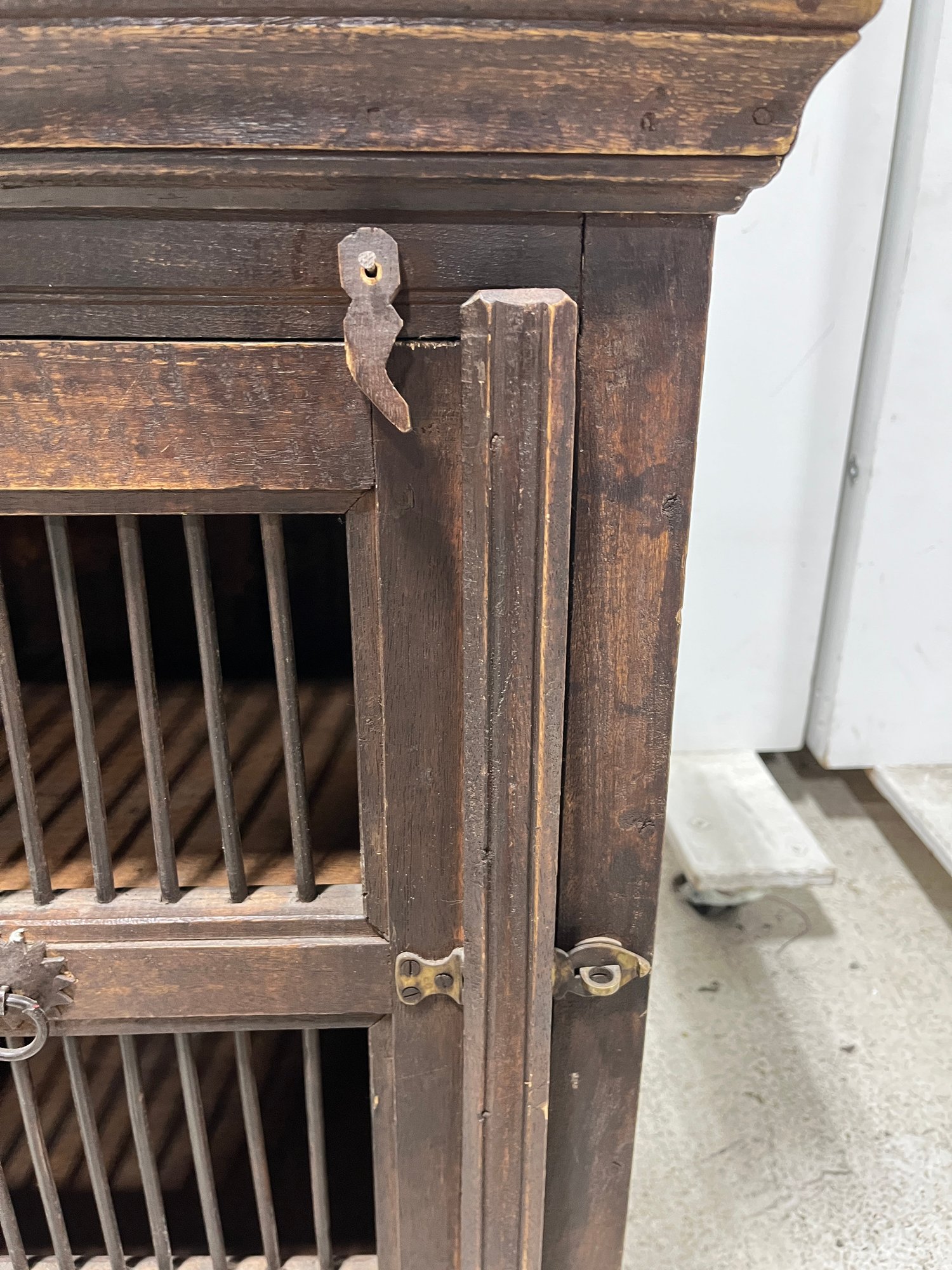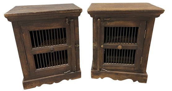 Embrace the timeless allure of rustic craftsmanship with this exceptional pair of vintage-inspired side cabinets. Handcrafted with meticulous attention to detail, these pieces serve as both functional storage and striking statement accents for any curated interior. The pieces feature a unique "caged" or slatted door design with vertical wooden balusters, offering a glimpse of the interior while maintaining privacy. Please note, the pieces are not identical as they have different hardware.