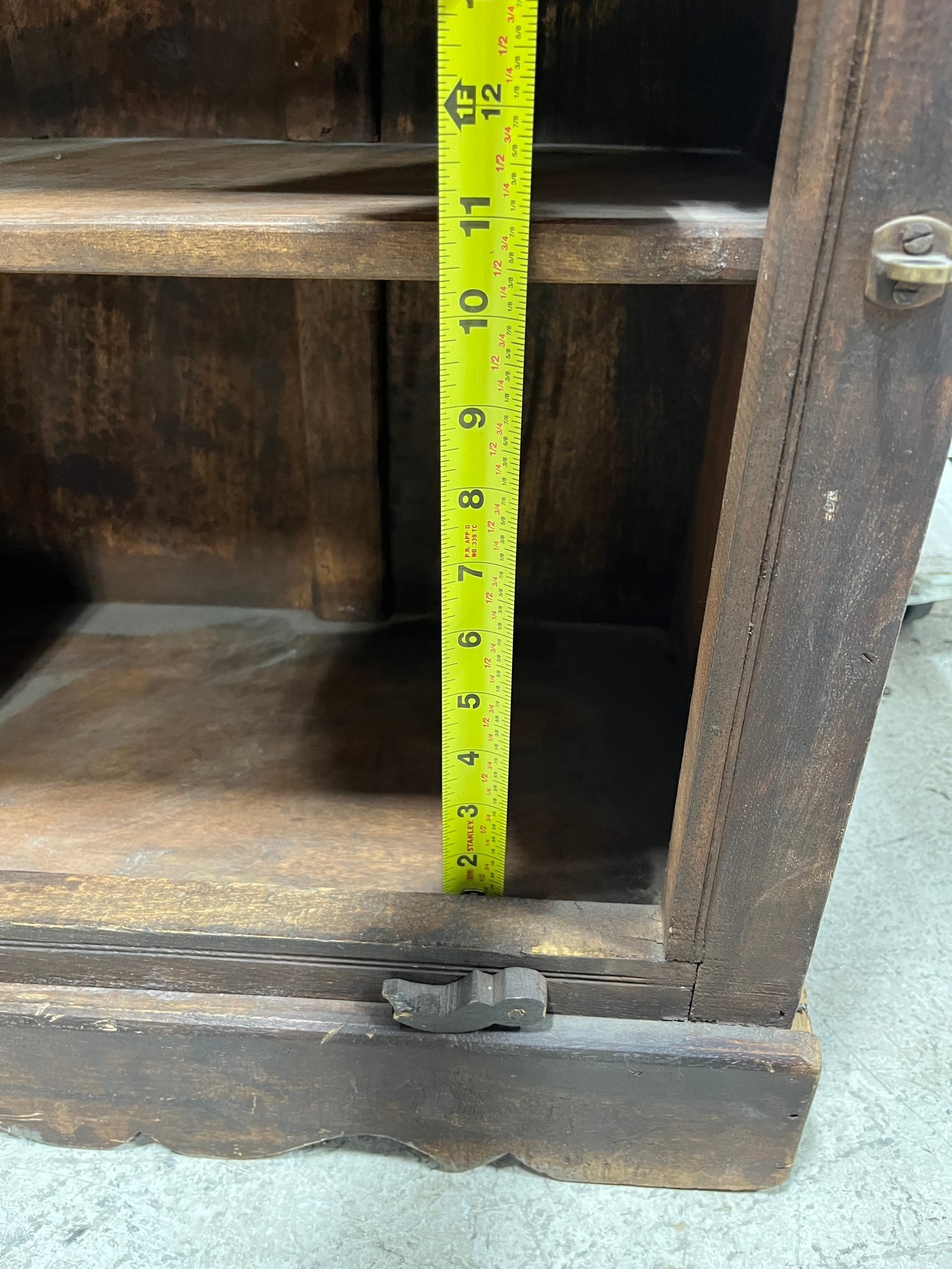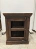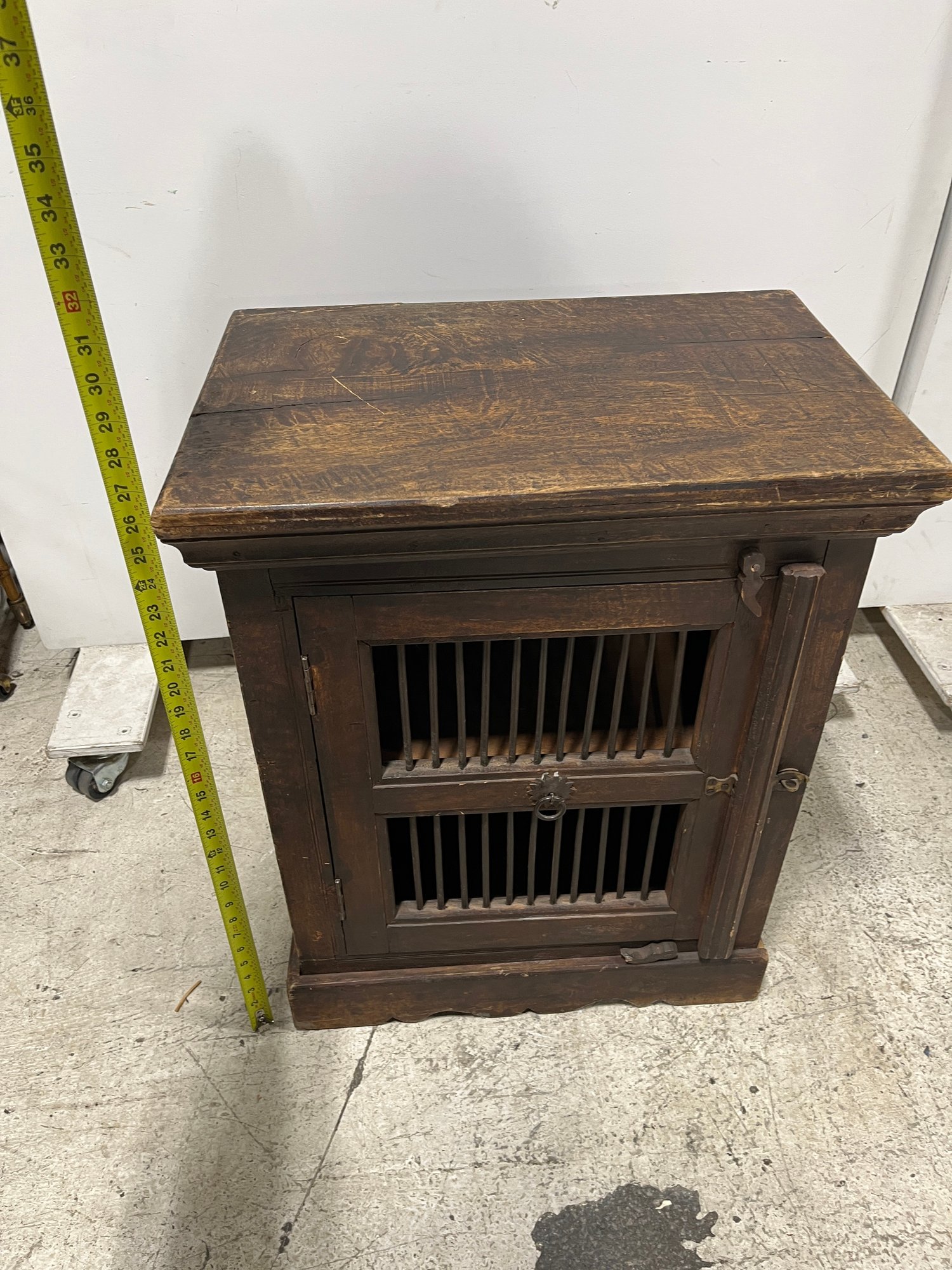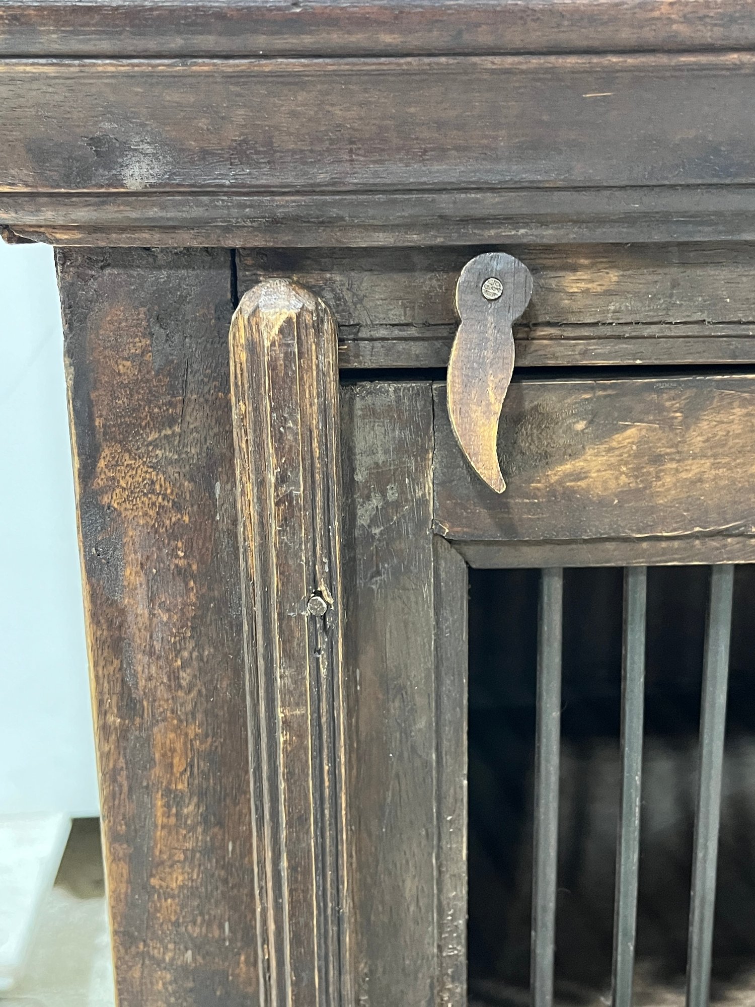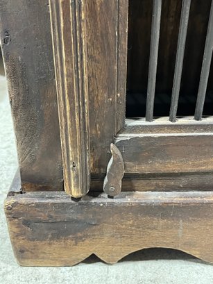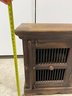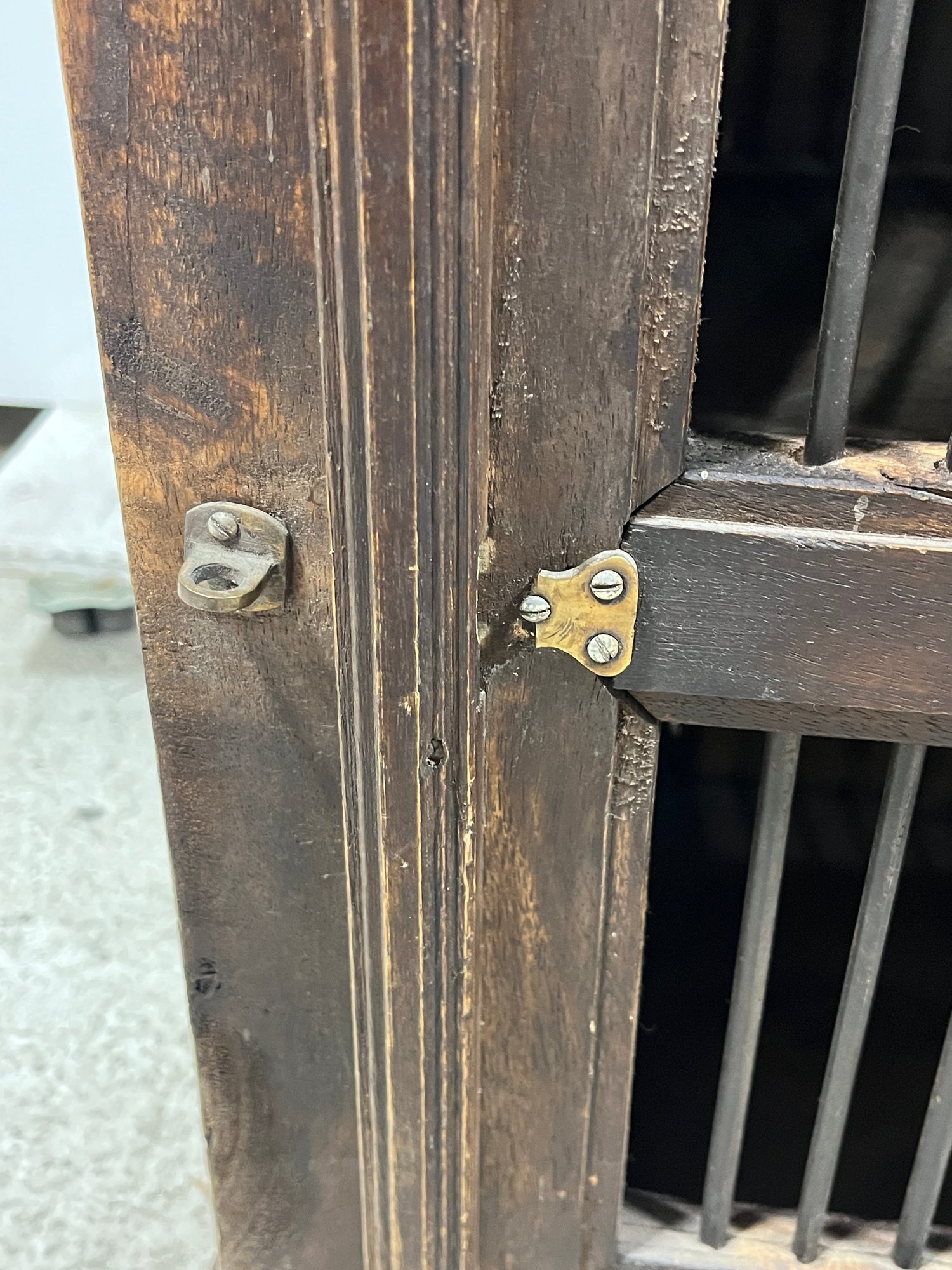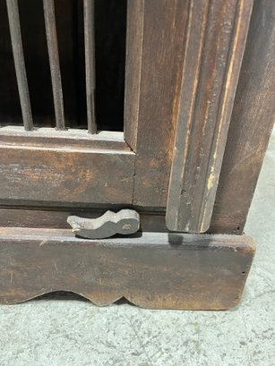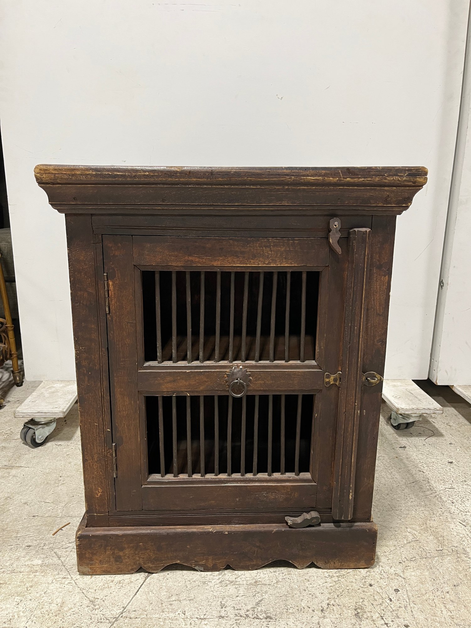 Embrace the timeless allure of rustic craftsmanship with this exceptional pair of vintage-inspired side cabinets. Handcrafted with meticulous attention to detail, these pieces serve as both functional storage and striking statement accents for any curated interior. The pieces feature a unique "caged" or slatted door design with vertical wooden balusters, offering a glimpse of the interior while maintaining privacy. Please note, the pieces are not identical as they have different hardware.