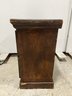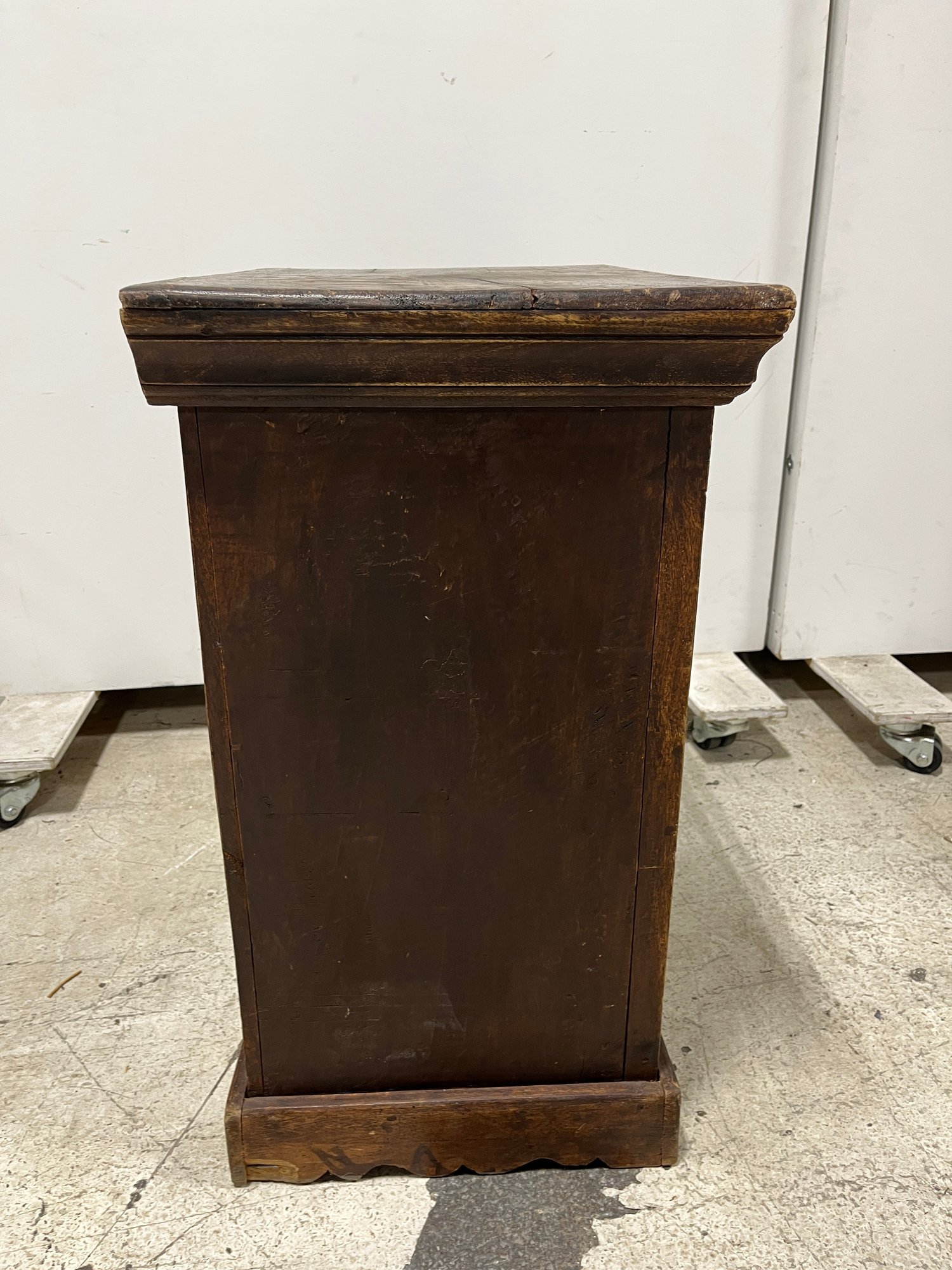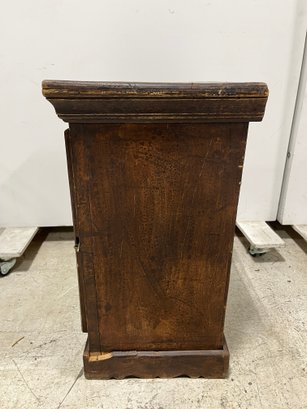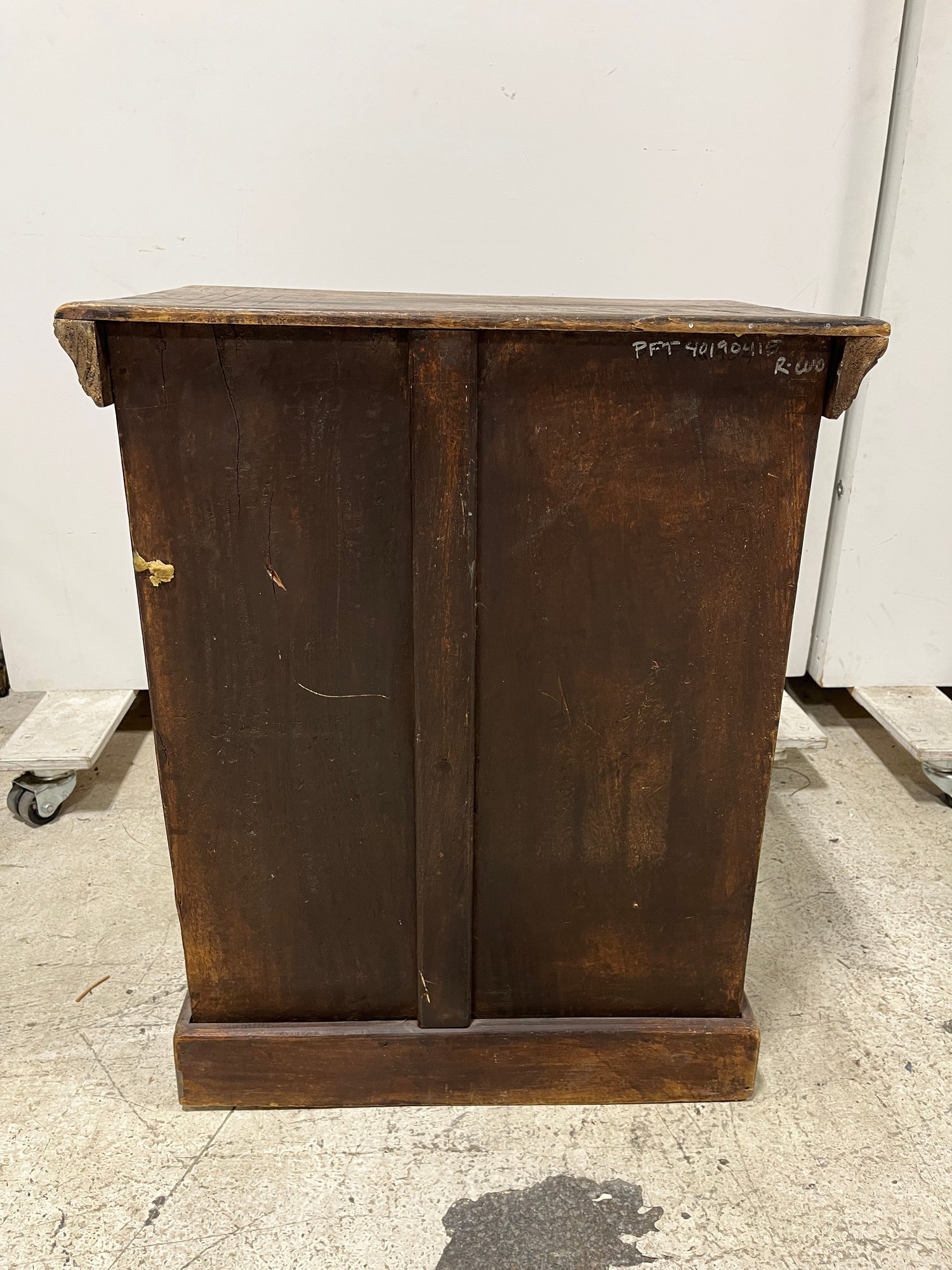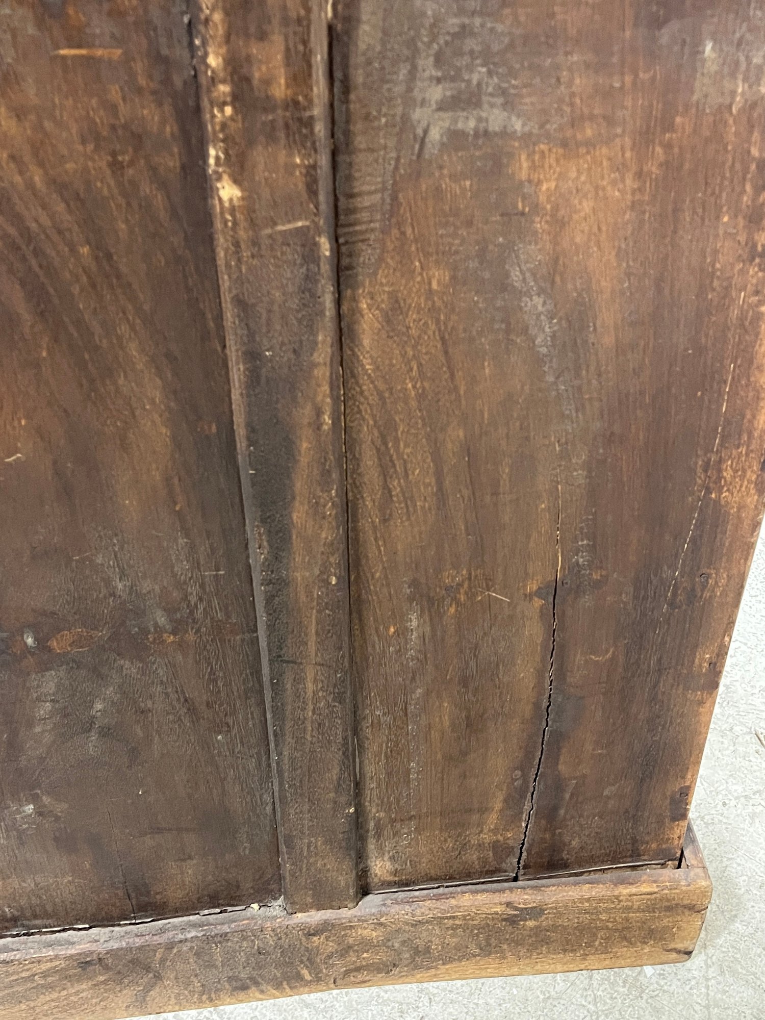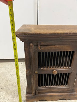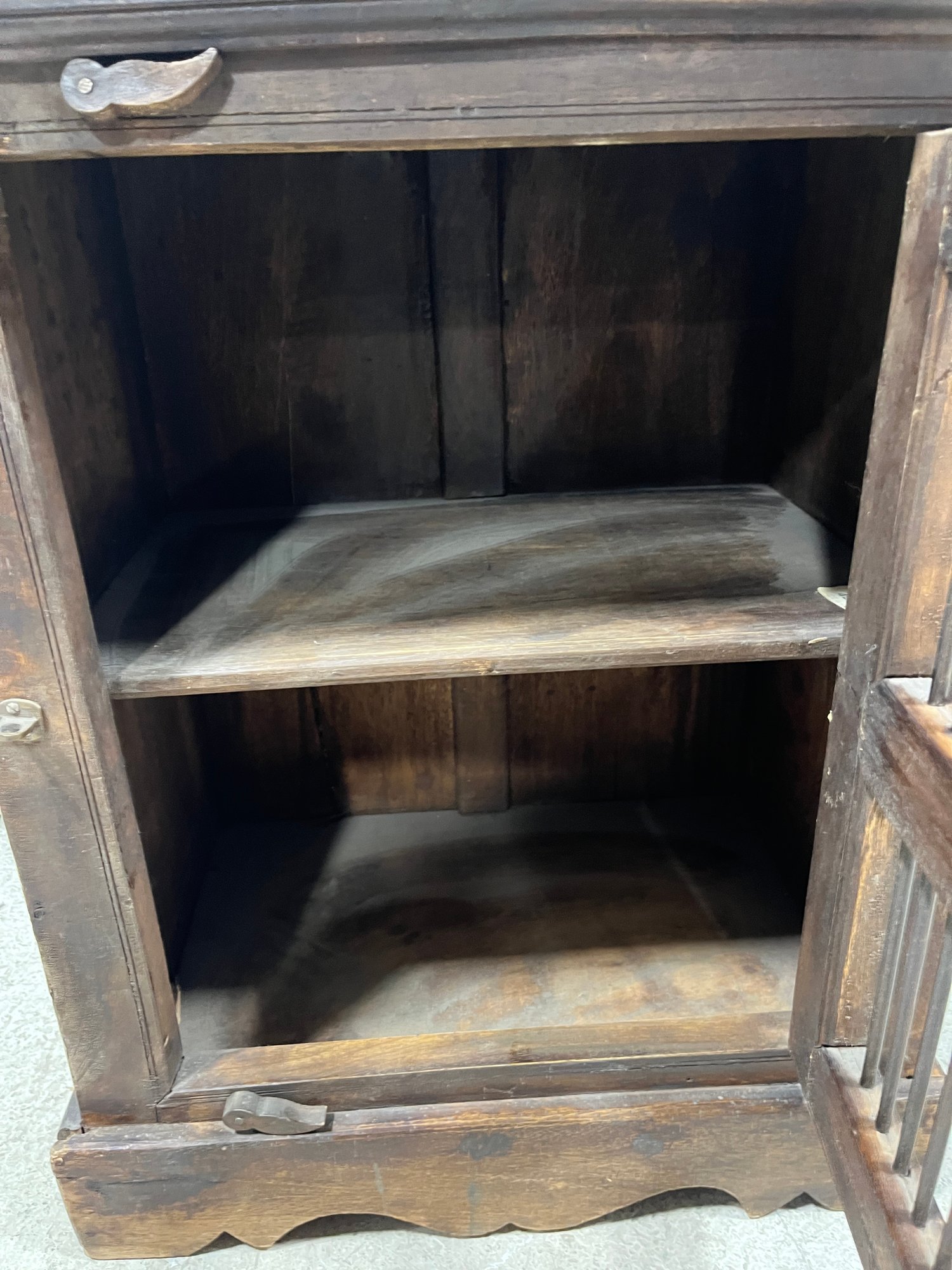 Embrace the timeless allure of rustic craftsmanship with this exceptional pair of vintage-inspired side cabinets. Handcrafted with meticulous attention to detail, these pieces serve as both functional storage and striking statement accents for any curated interior. The pieces feature a unique "caged" or slatted door design with vertical wooden balusters, offering a glimpse of the interior while maintaining privacy. Please note, the pieces are not identical as they have different hardware.