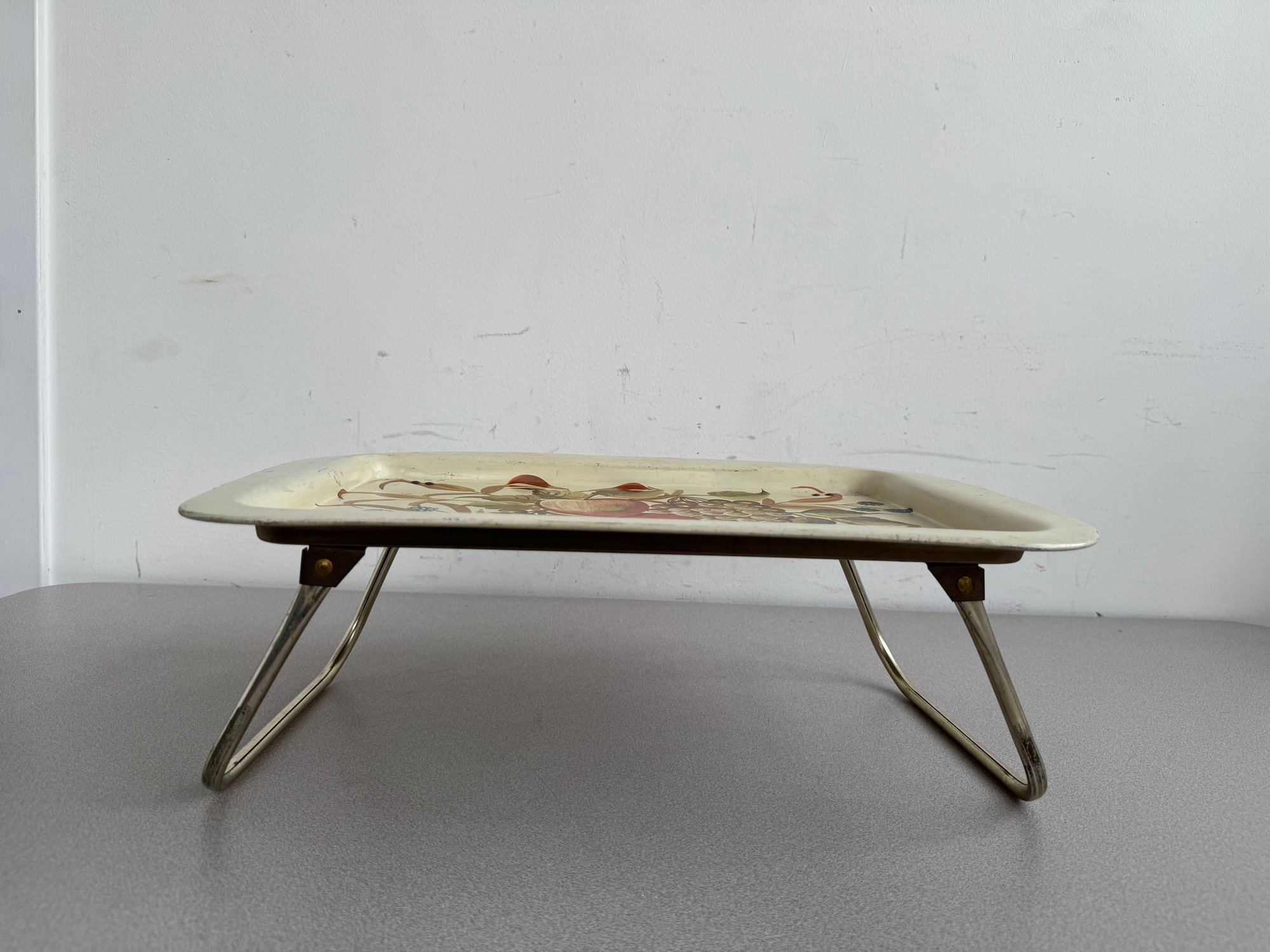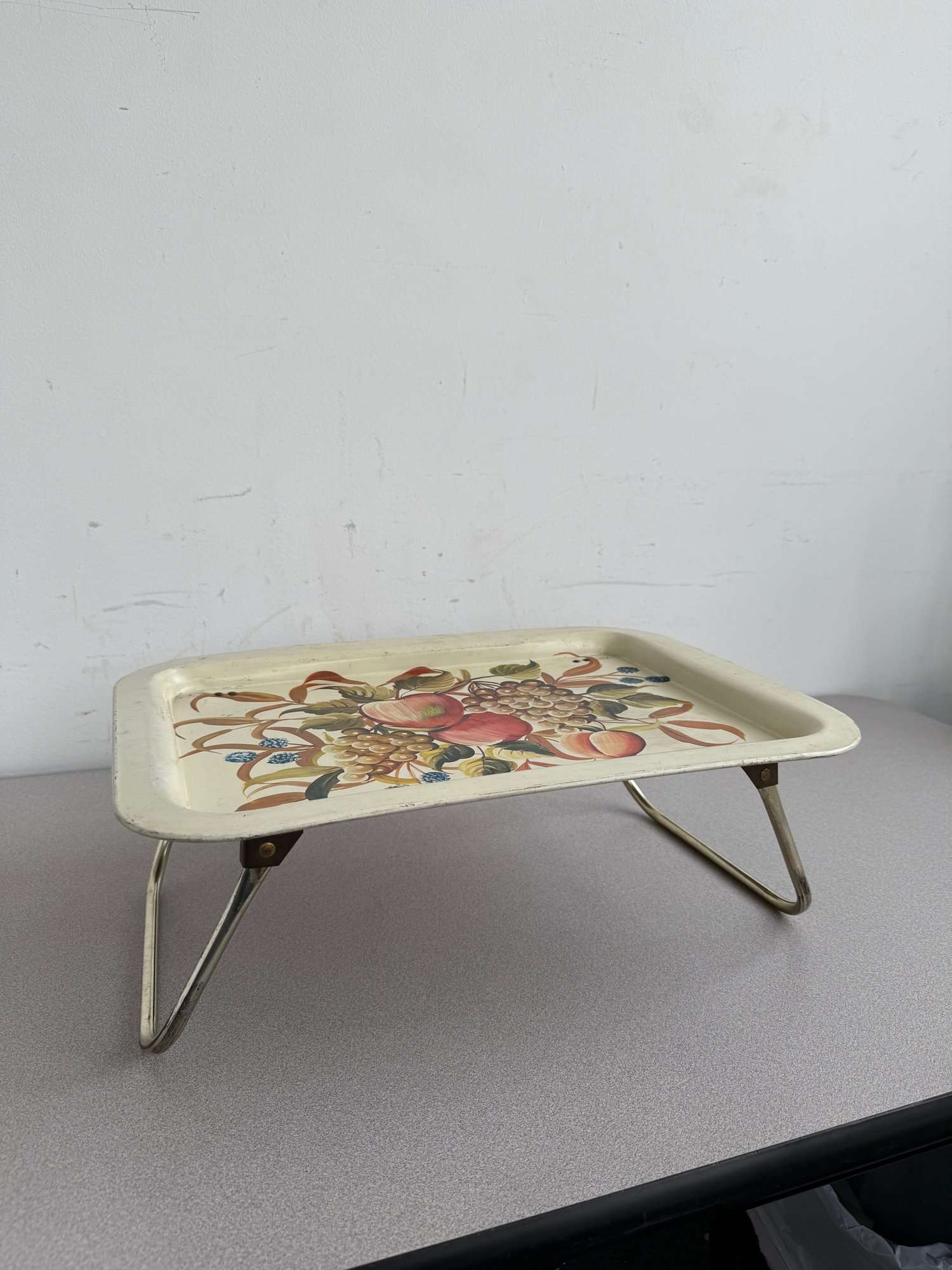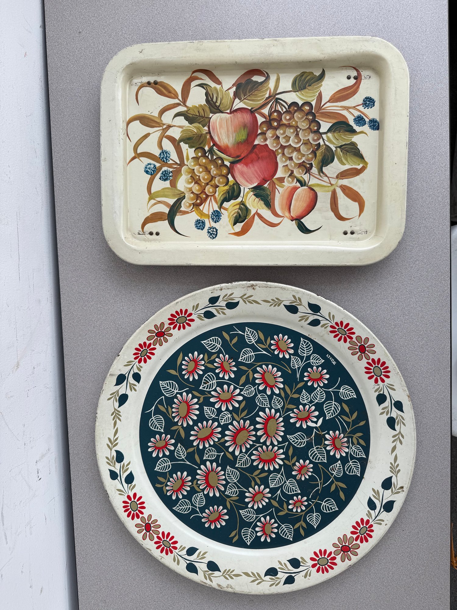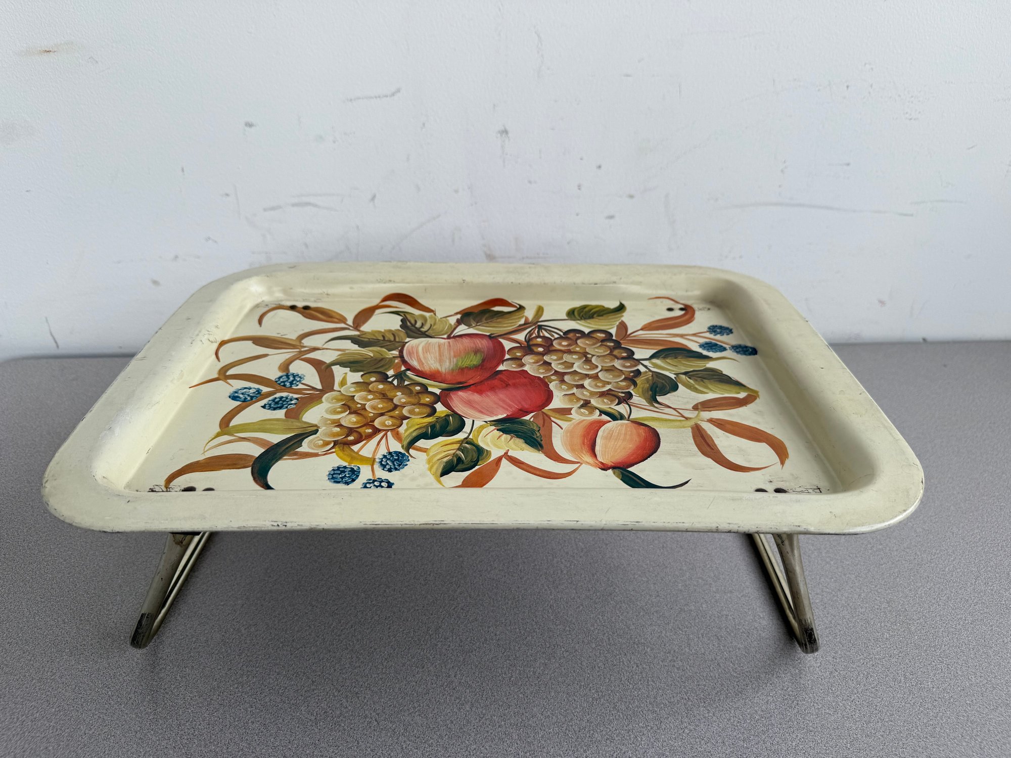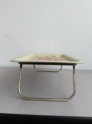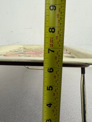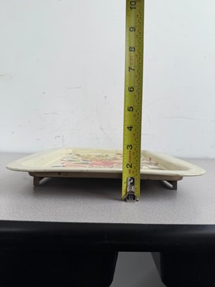 A charming pair of vintage, hand-painted metal serving trays, showcasing distinct American folk art styles popular during the mid-20th century. These pieces are ideal for decorative display or functional use, reflecting the nostalgic appeal of mid-century Americana decor. The square tray features foldable legs, which can serve as a TV or bed tray.