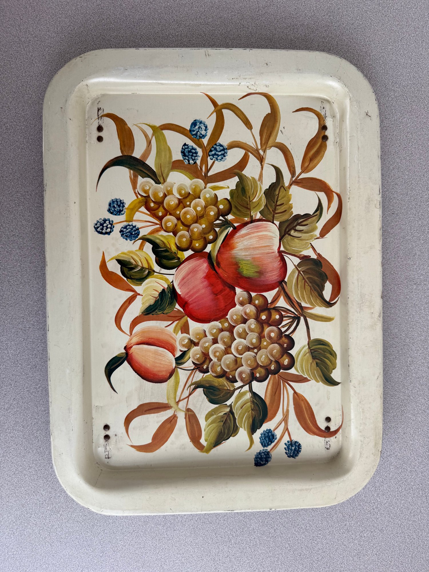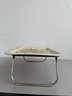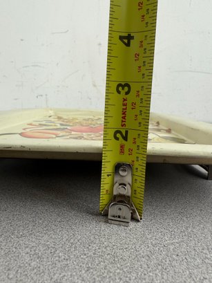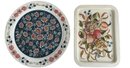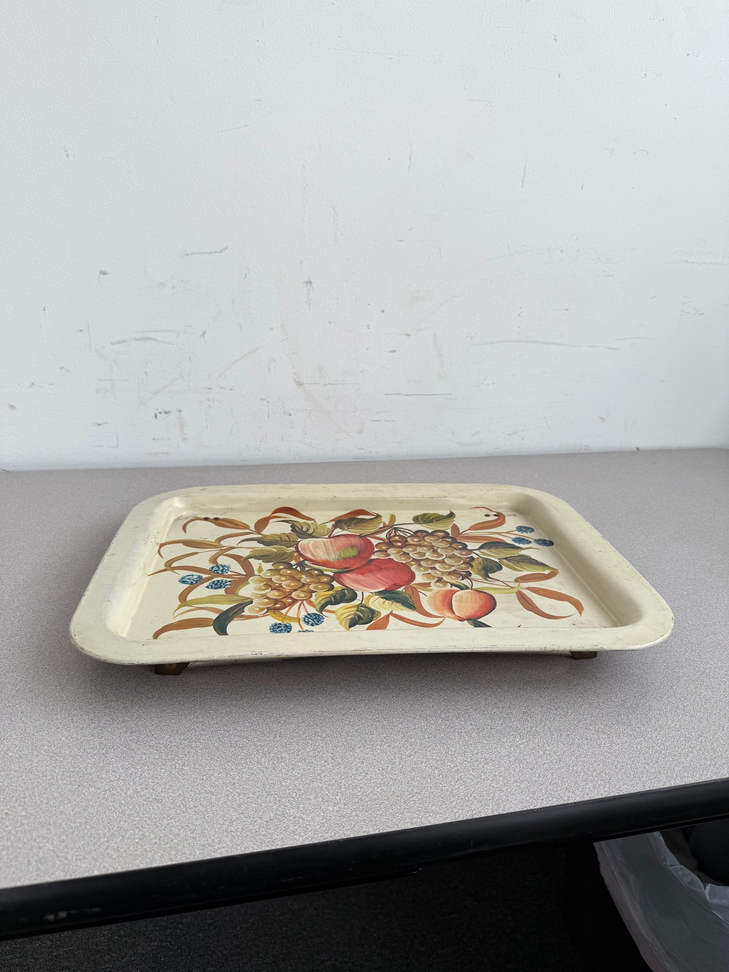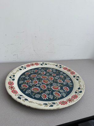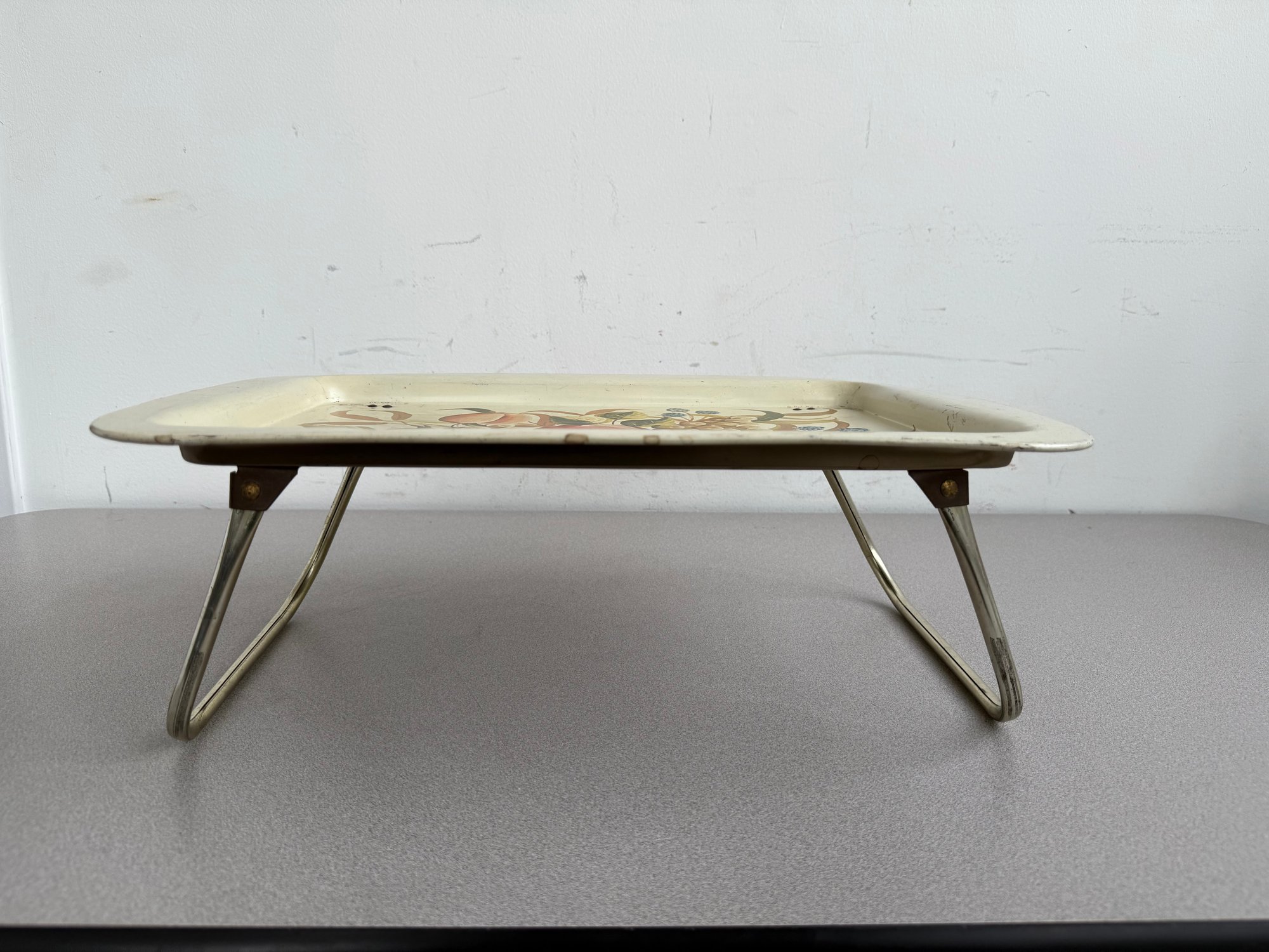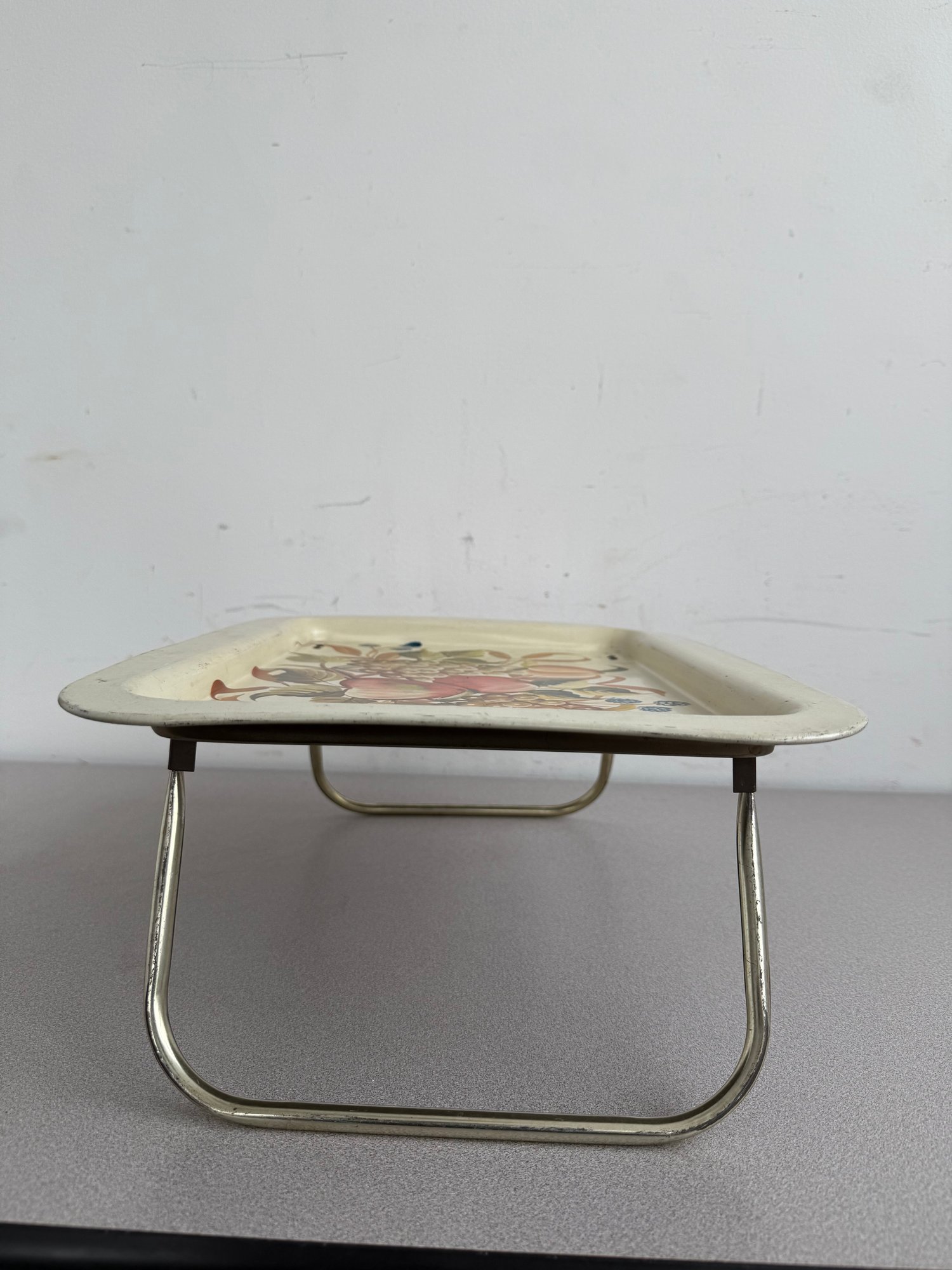 A charming pair of vintage, hand-painted metal serving trays, showcasing distinct American folk art styles popular during the mid-20th century. These pieces are ideal for decorative display or functional use, reflecting the nostalgic appeal of mid-century Americana decor. The square tray features foldable legs, which can serve as a TV or bed tray.