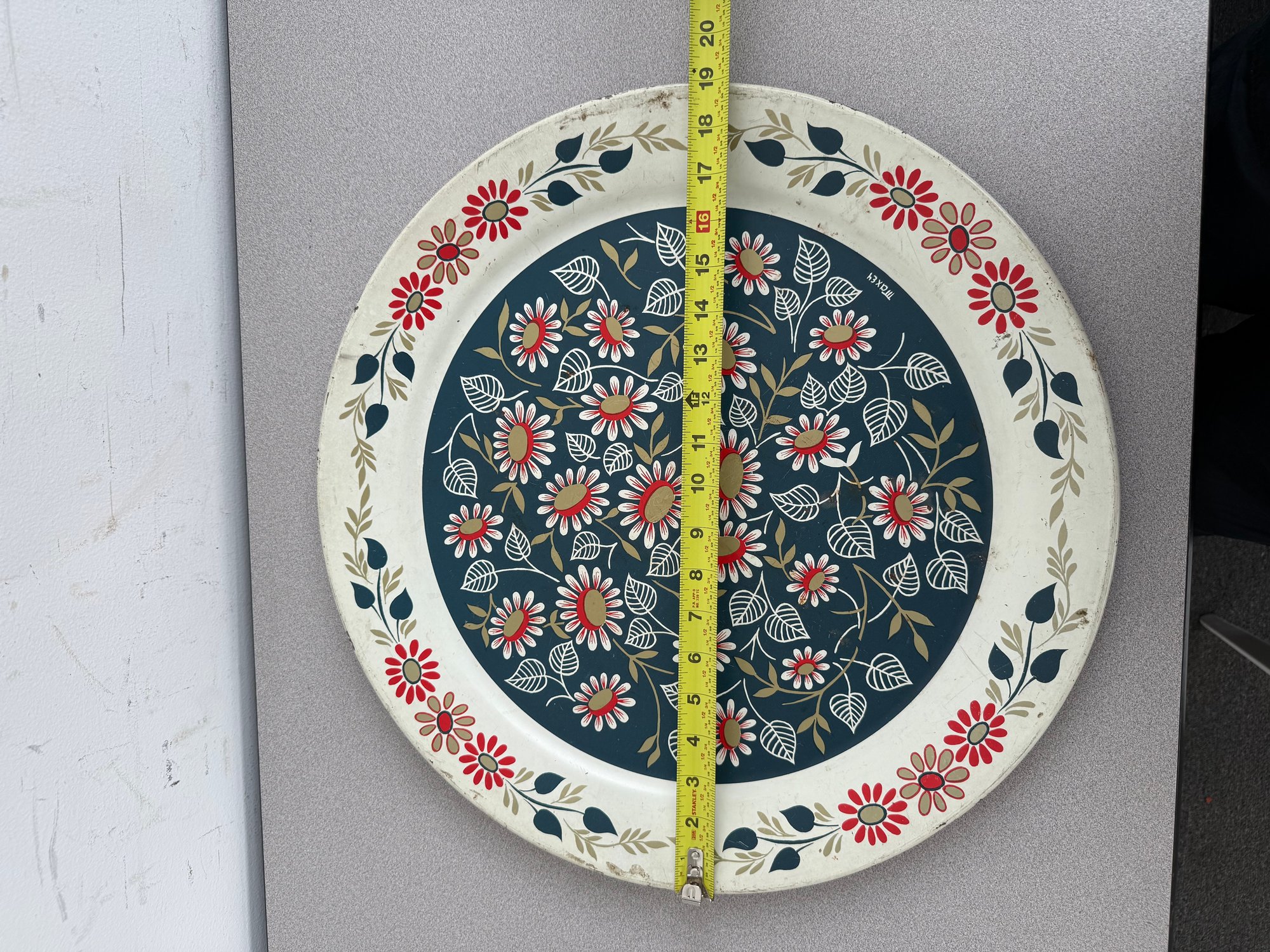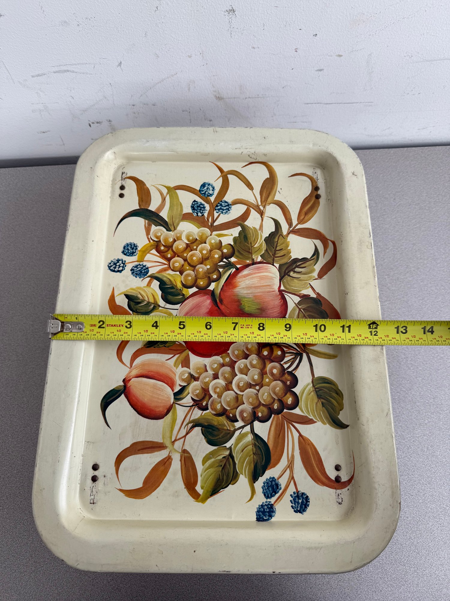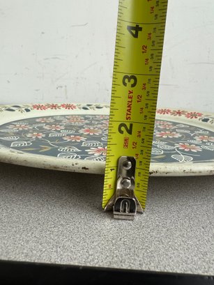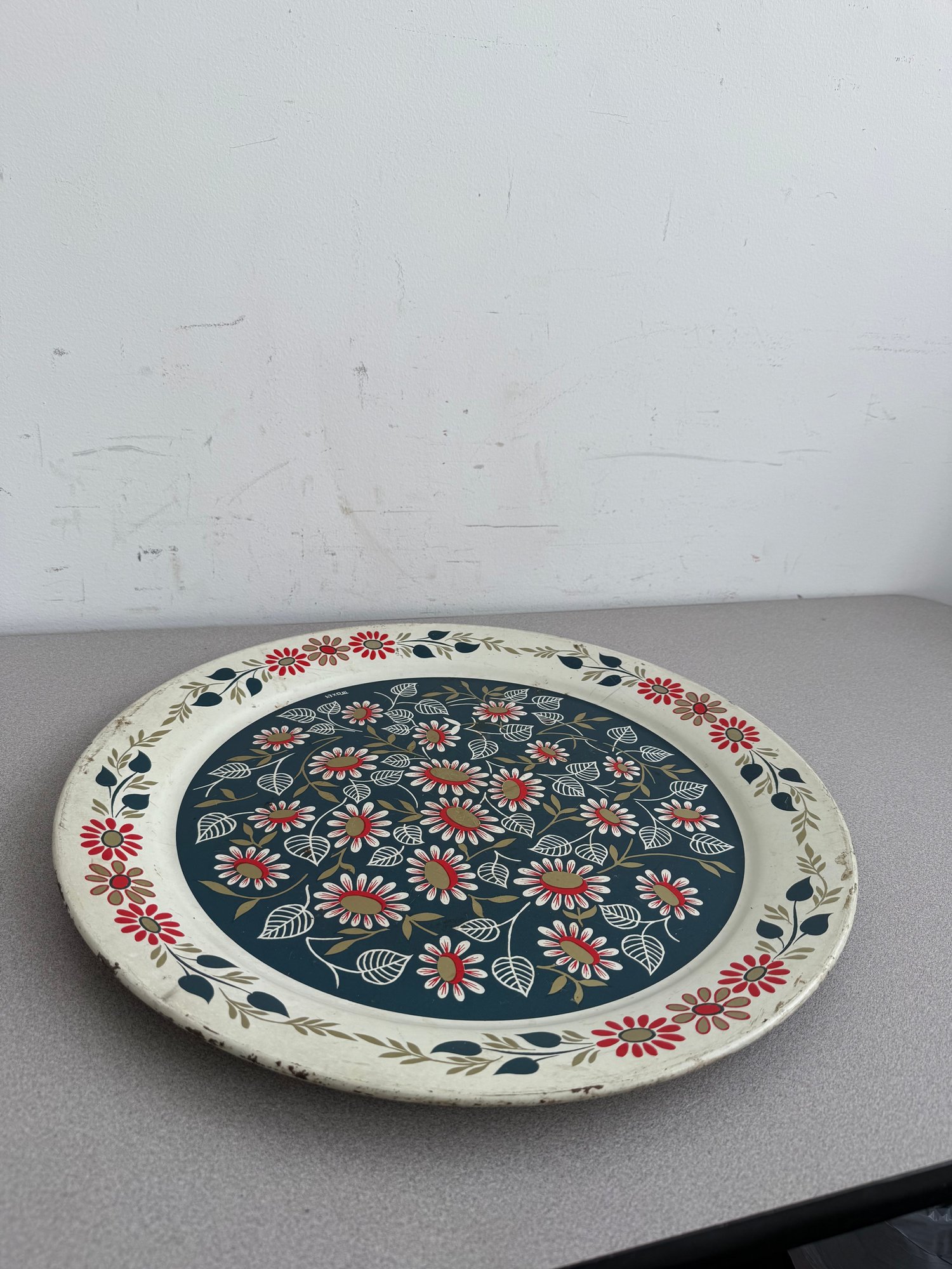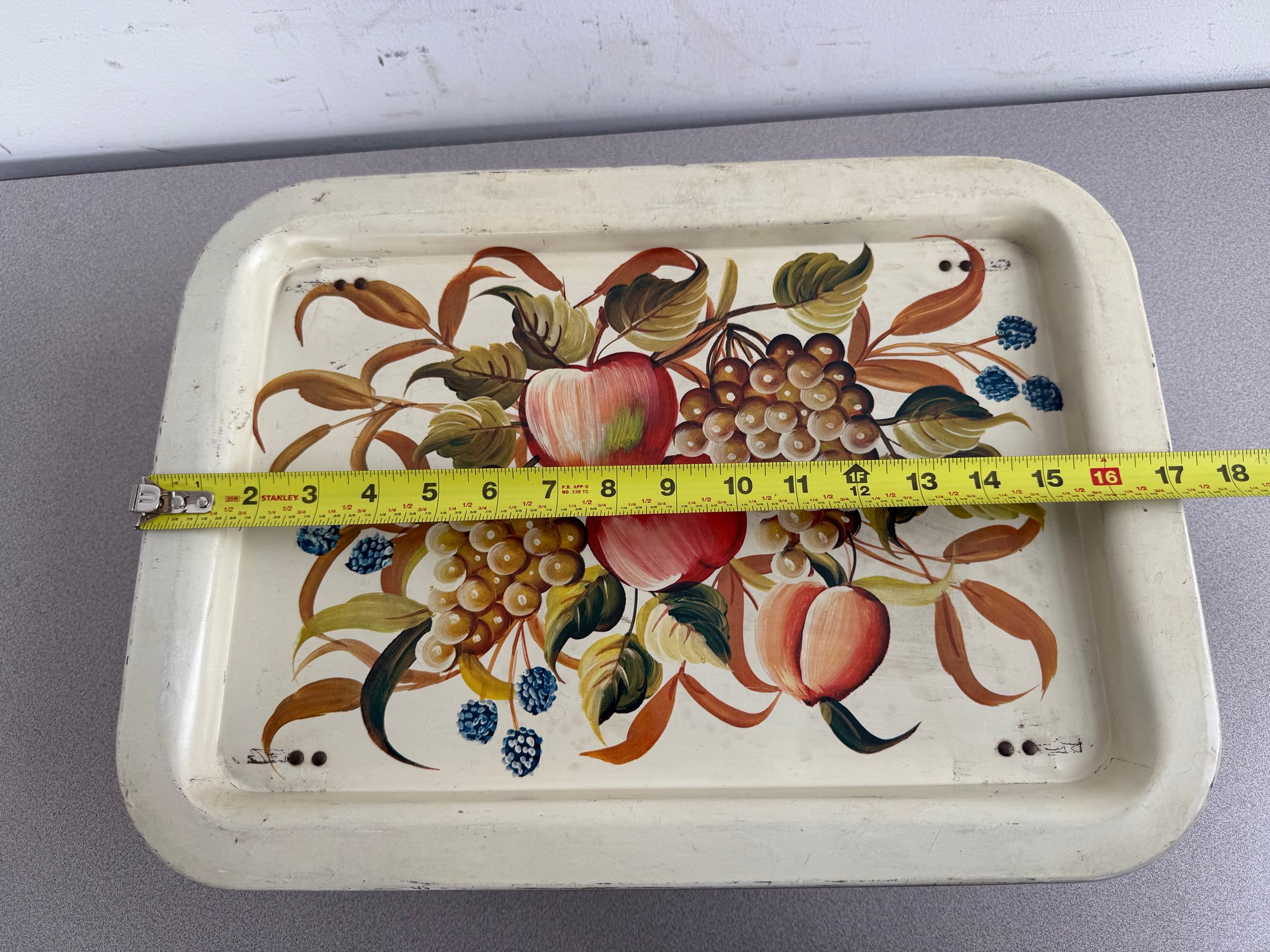 A charming pair of vintage, hand-painted metal serving trays, showcasing distinct American folk art styles popular during the mid-20th century. These pieces are ideal for decorative display or functional use, reflecting the nostalgic appeal of mid-century Americana decor. The square tray features foldable legs, which can serve as a TV or bed tray.