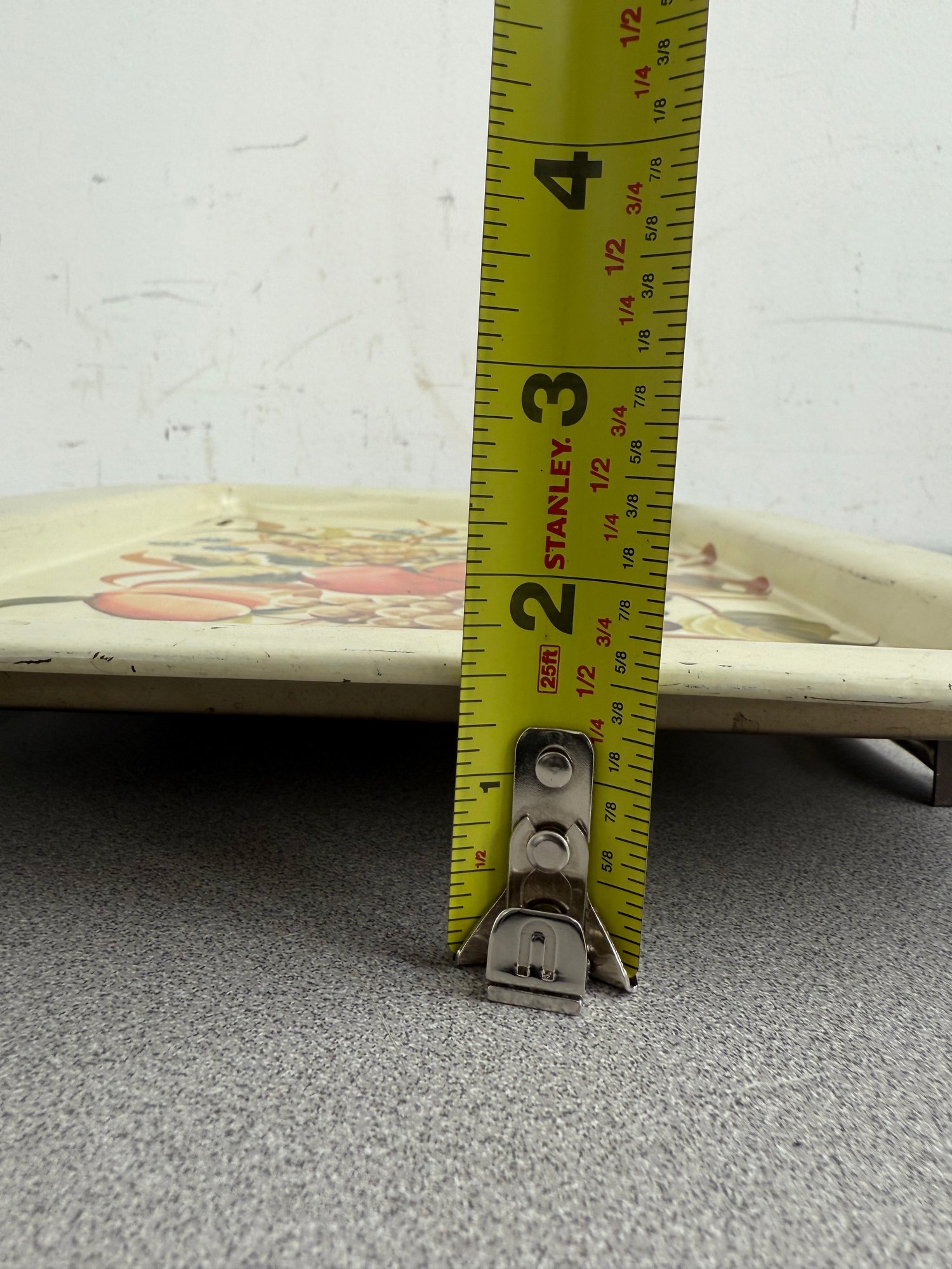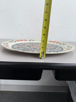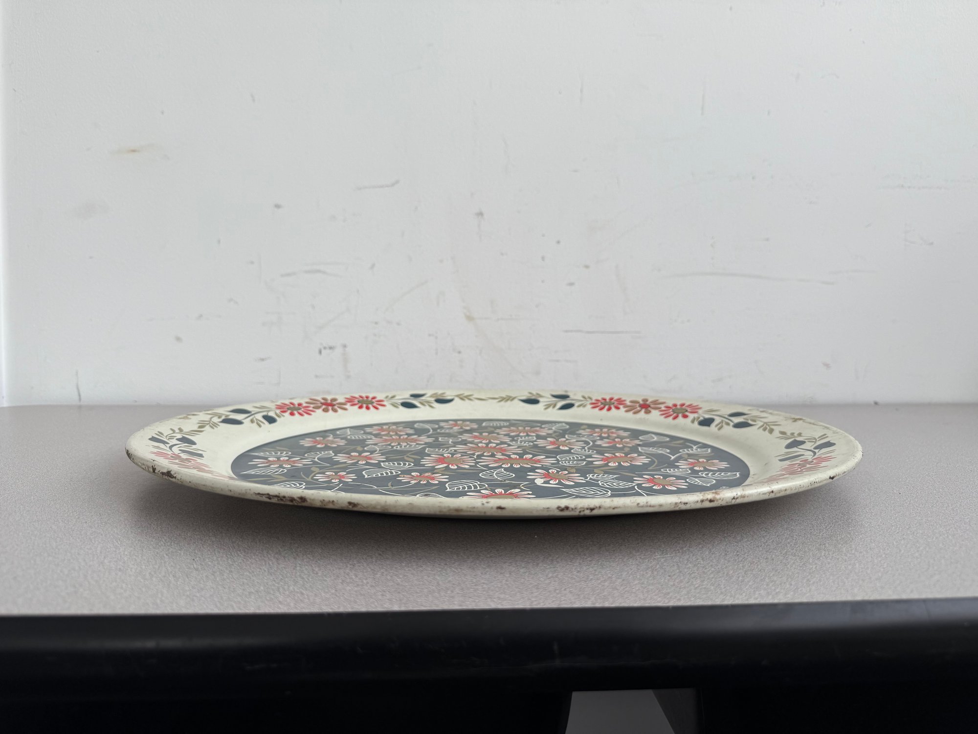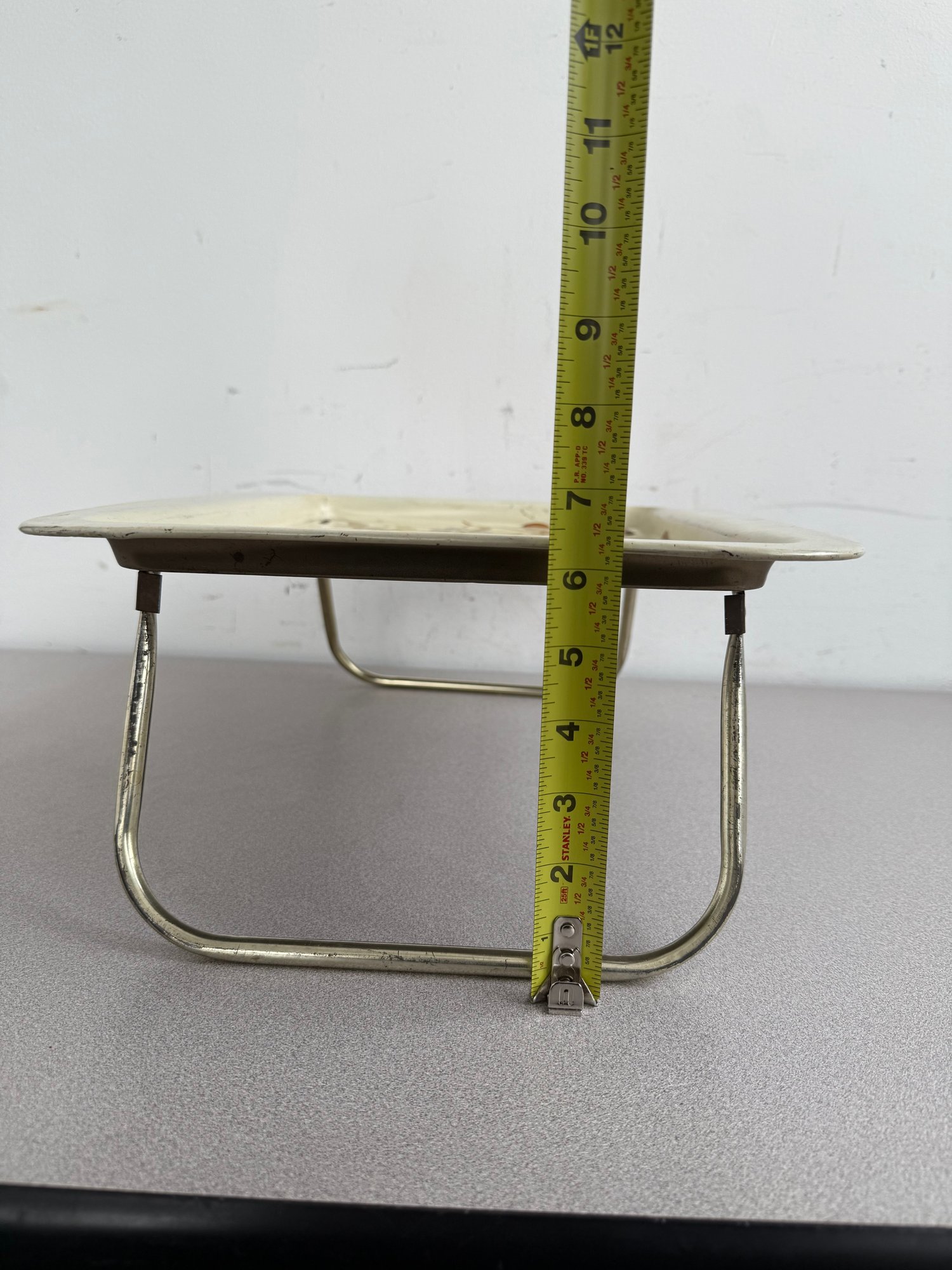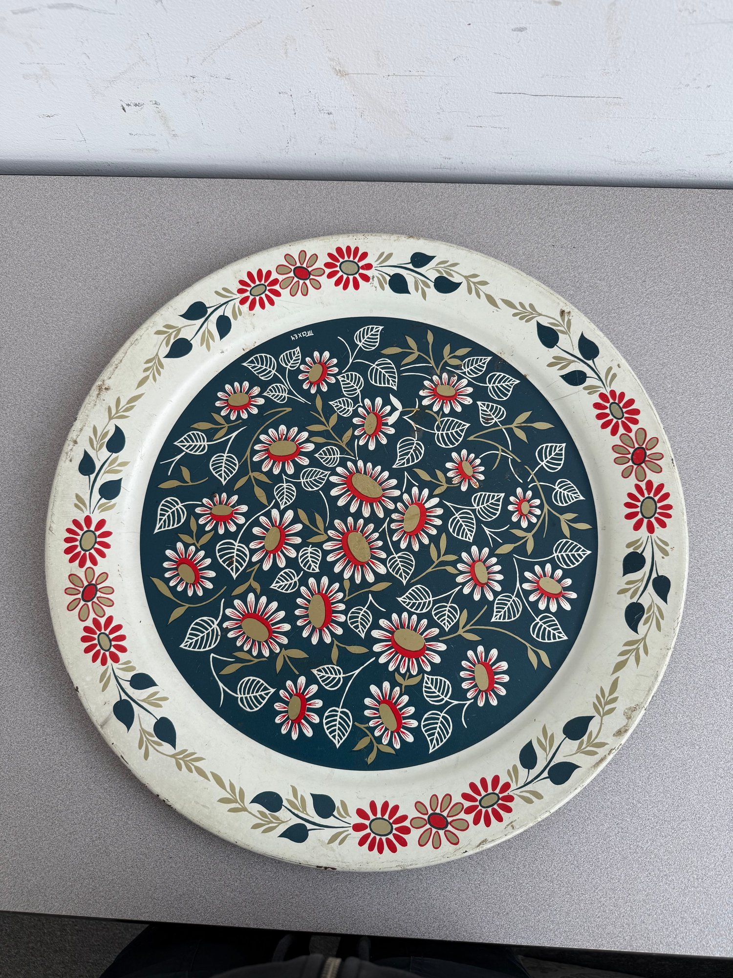 A charming pair of vintage, hand-painted metal serving trays, showcasing distinct American folk art styles popular during the mid-20th century. These pieces are ideal for decorative display or functional use, reflecting the nostalgic appeal of mid-century Americana decor. The square tray features foldable legs, which can serve as a TV or bed tray.