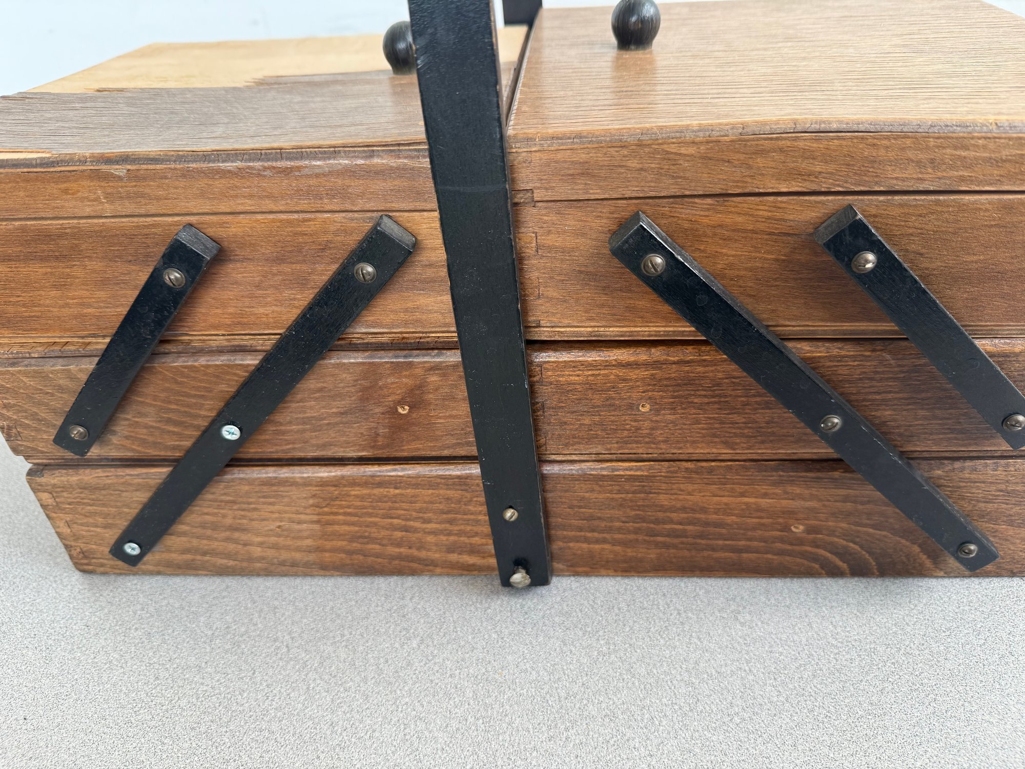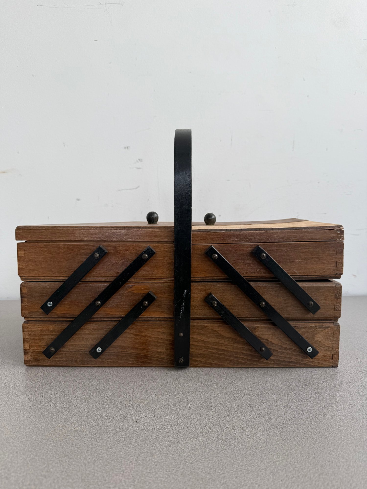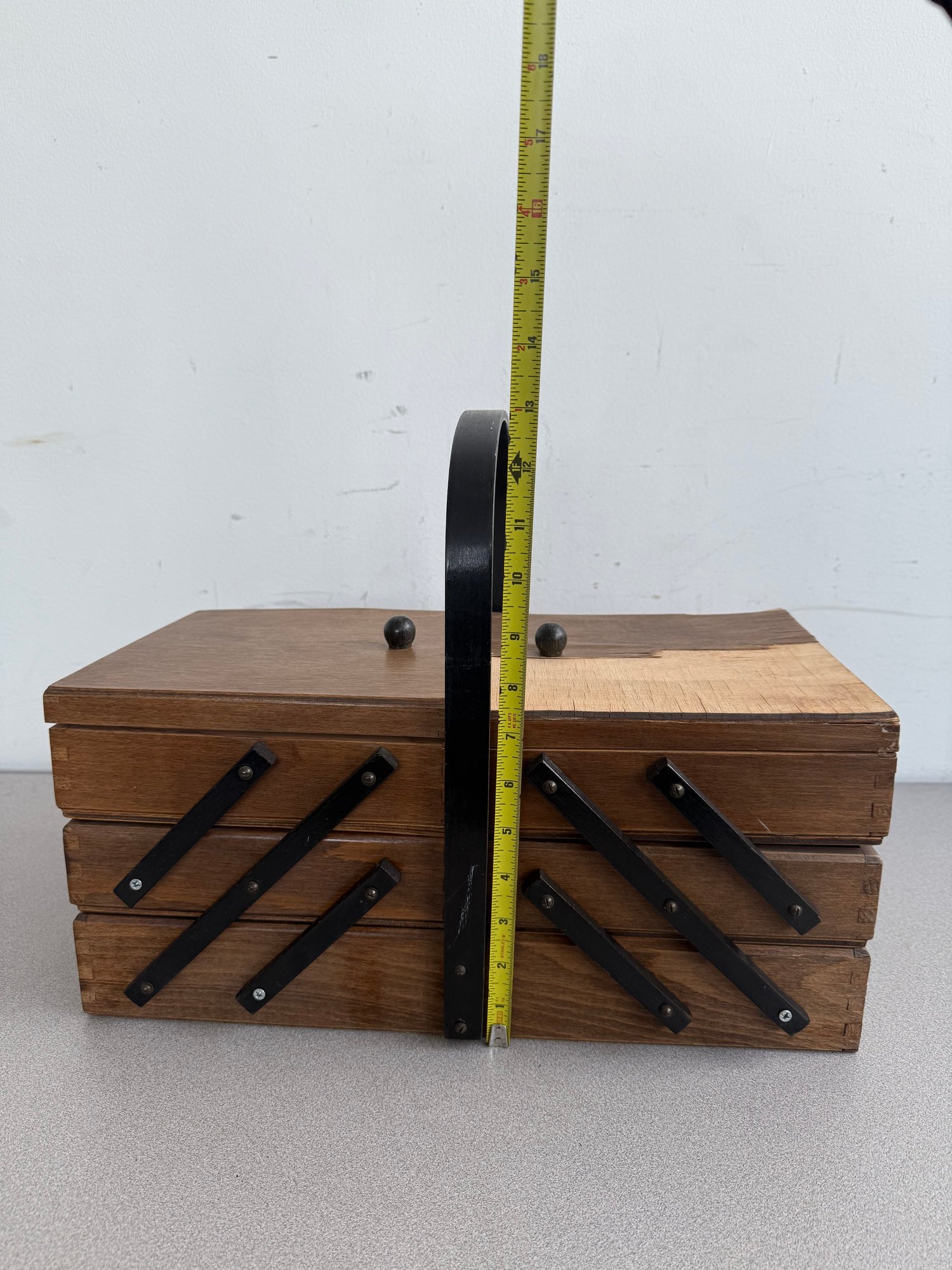This classic is a prime example of mid-century functional design, often referred to as an accordion or concertina sewing box. Combining retro aesthetics with practical utility, it remains a sought-after piece for craft enthusiasts and vintage collectors alike.