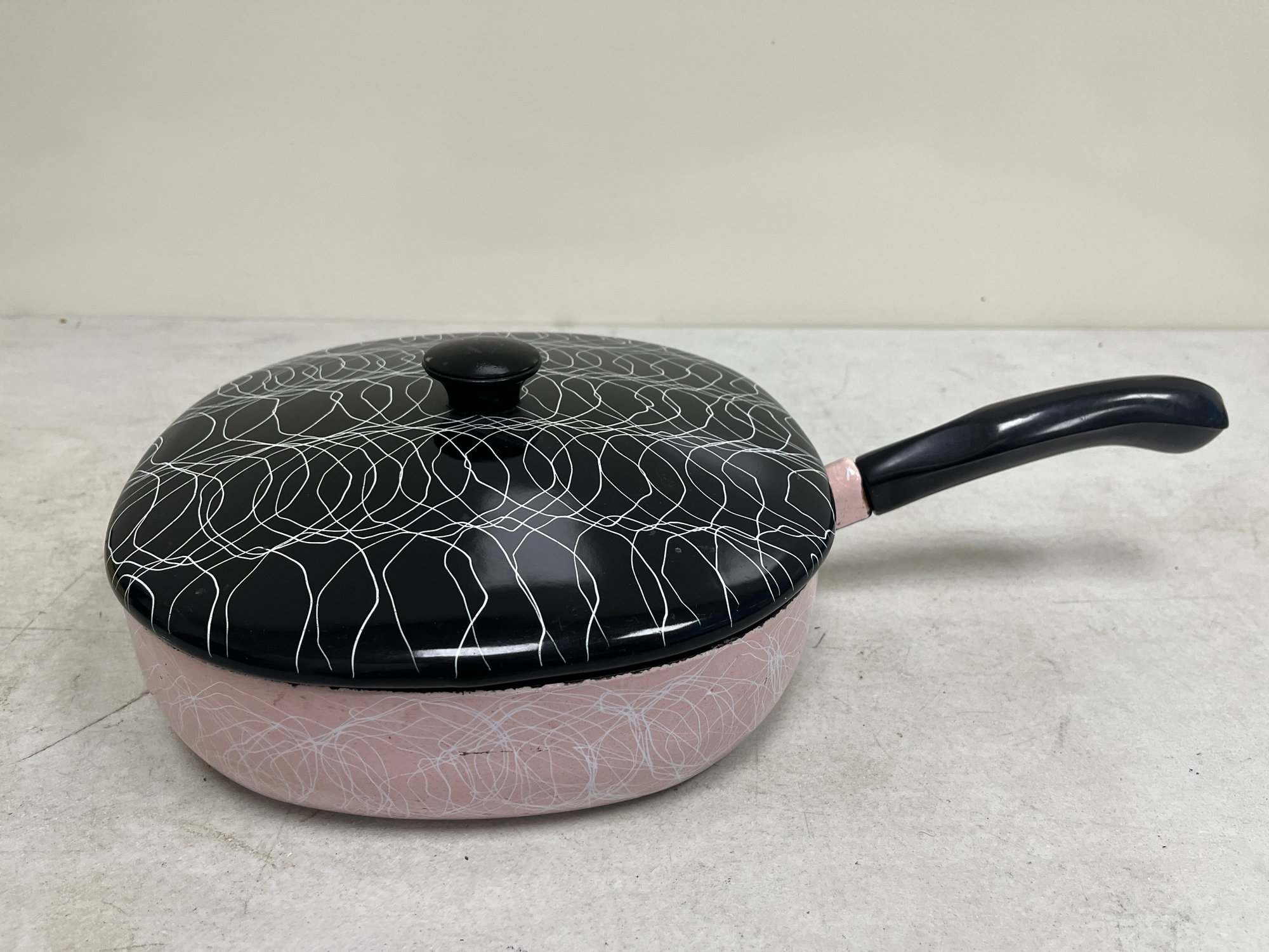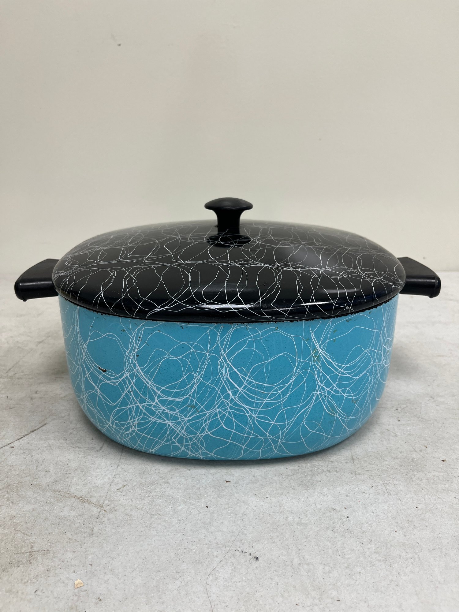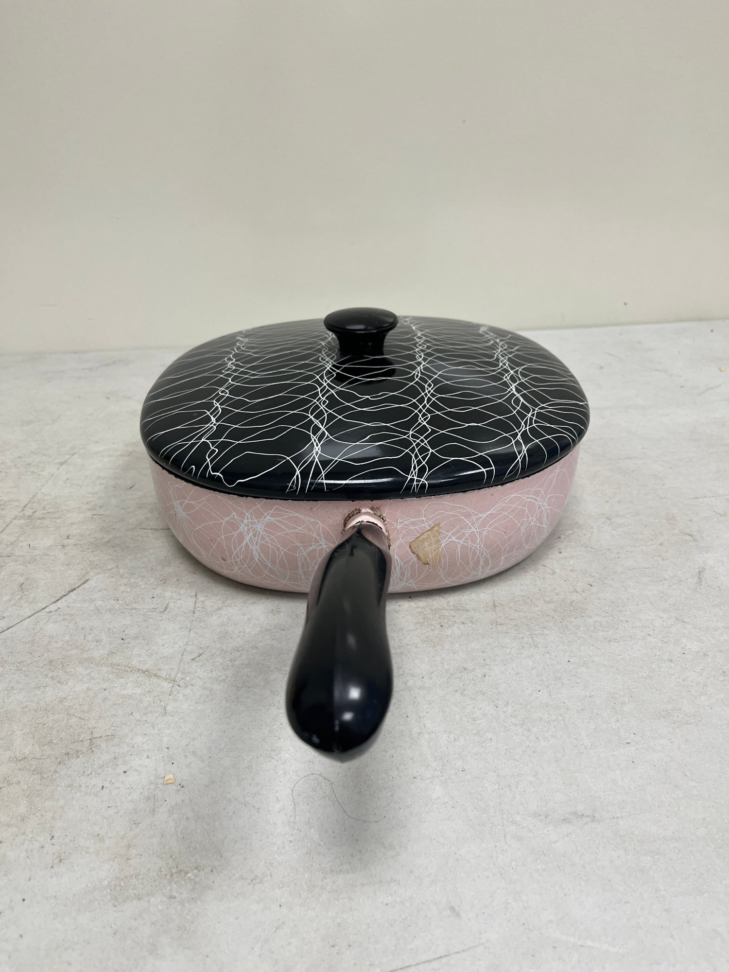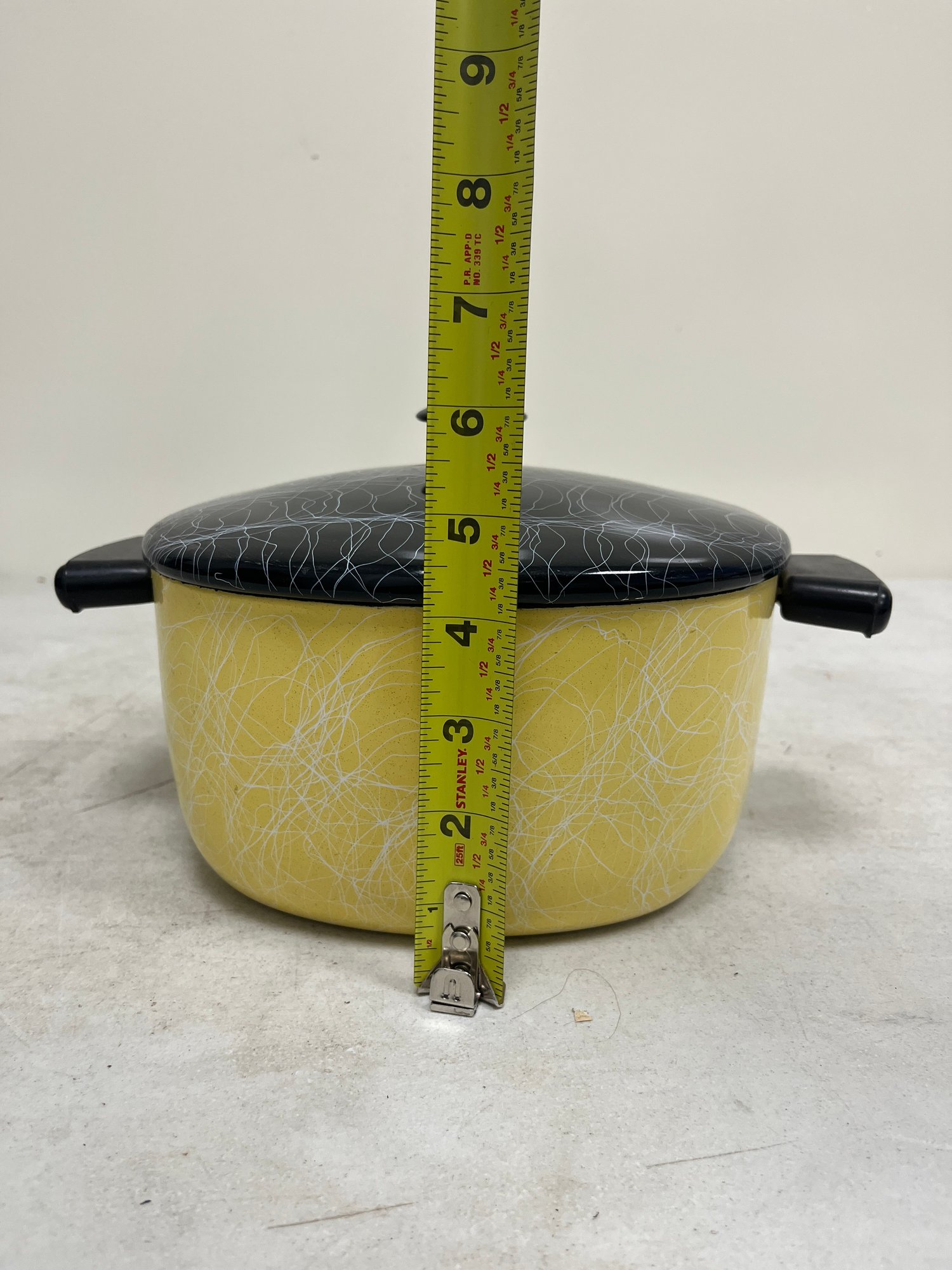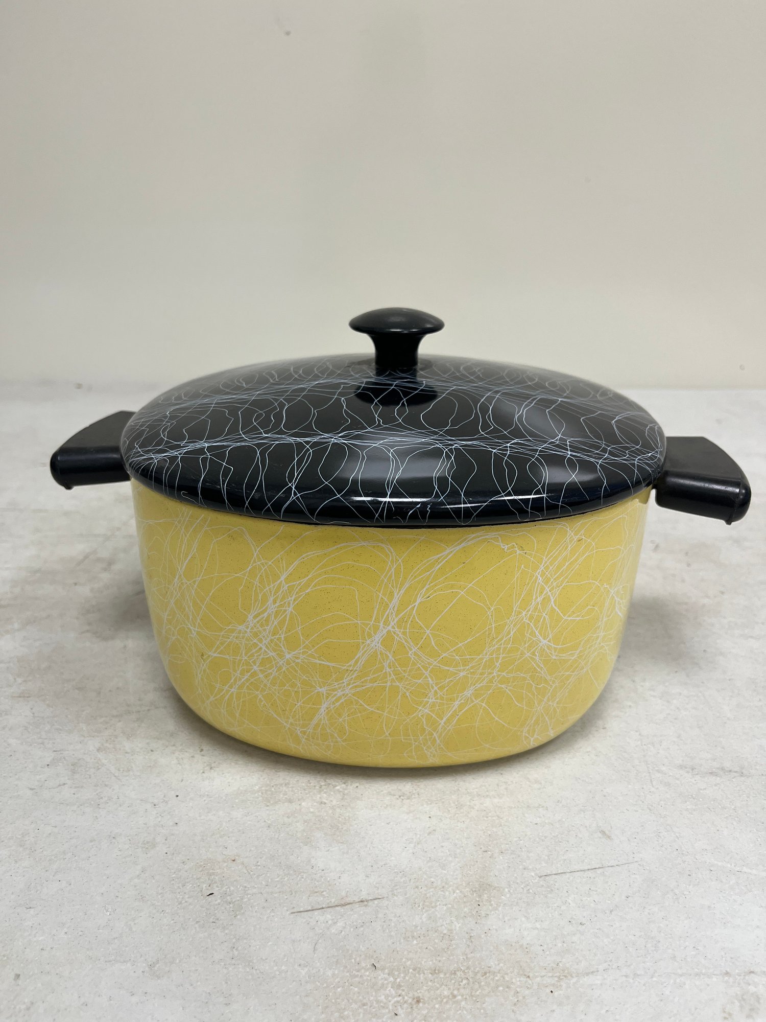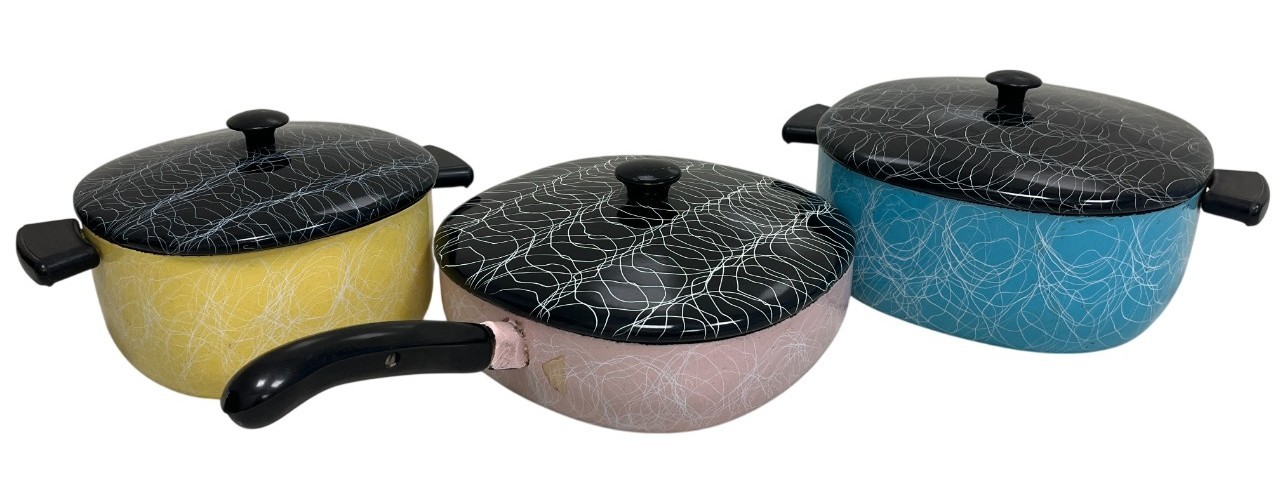 A delightful example of quintessential mid-century modern kitchenware. This rare collection from the 1950s brings the atomic era's charm and style directly to your kitchen. Each pot boasts a vibrant, high-gloss enamel finish, decorated with the signature abstract white "spaghetti" or "drizzle" pattern that makes this line instantly recognizable. The set features striking color combinations: a cheerful lemon yellow, a soft vintage pink, and a bold robin's egg blue, all complemented by matching black lids featuring the same iconic white pattern. This kitschy, fun design adds a touch of nostalgia to any retro kitchen. This lot includes (2) large pots and (1) frying pan.