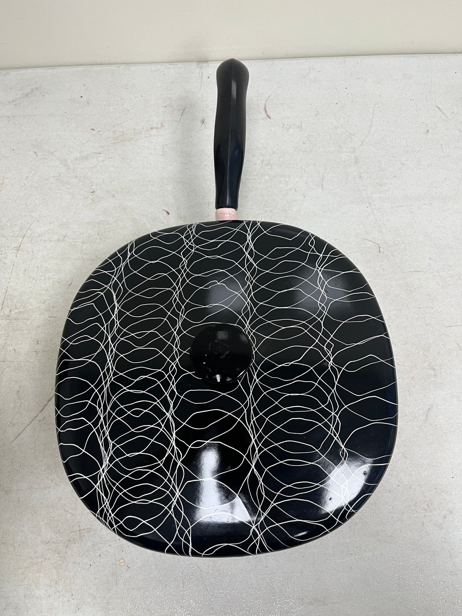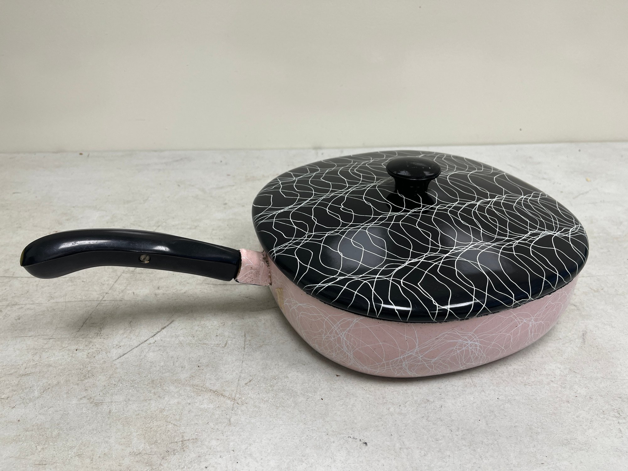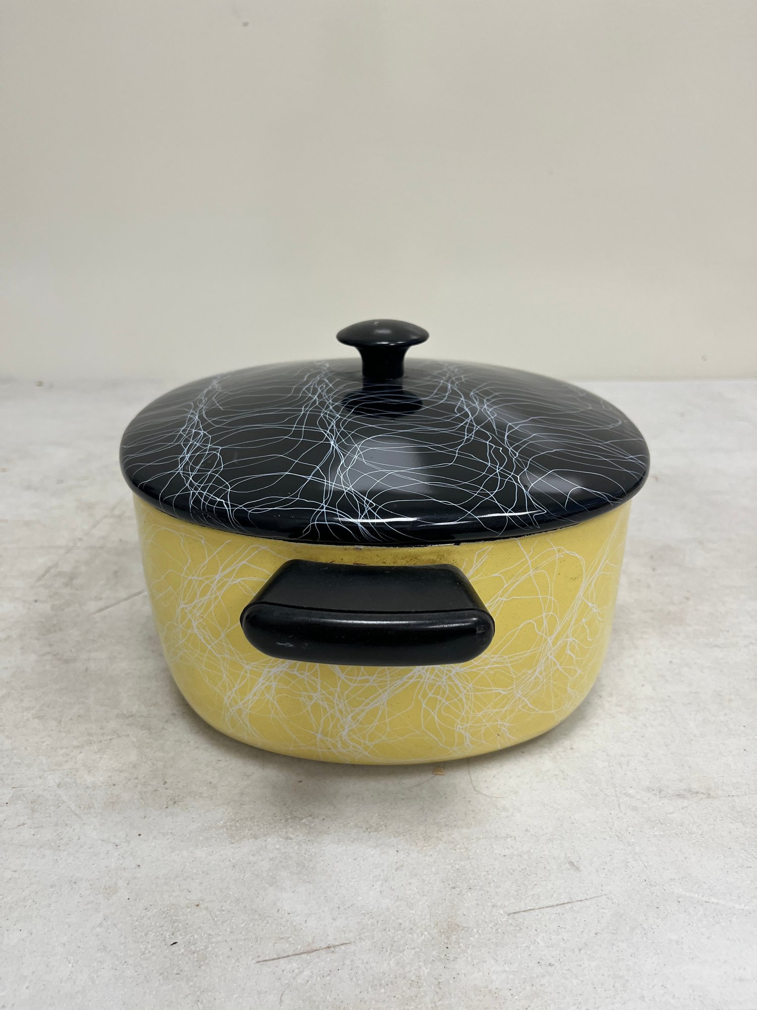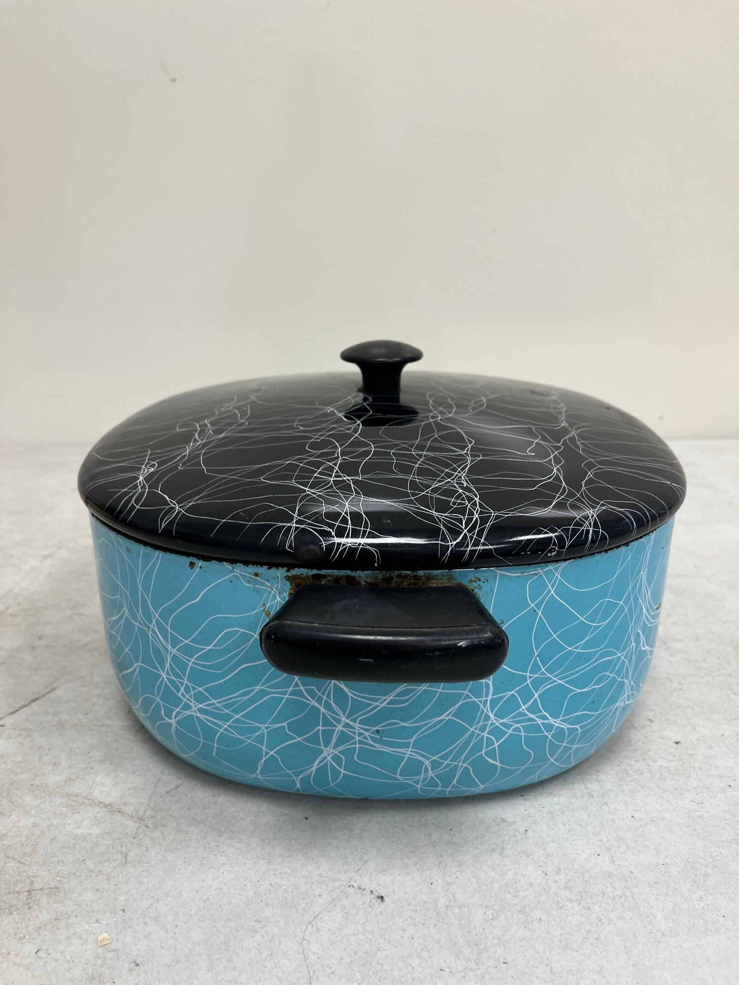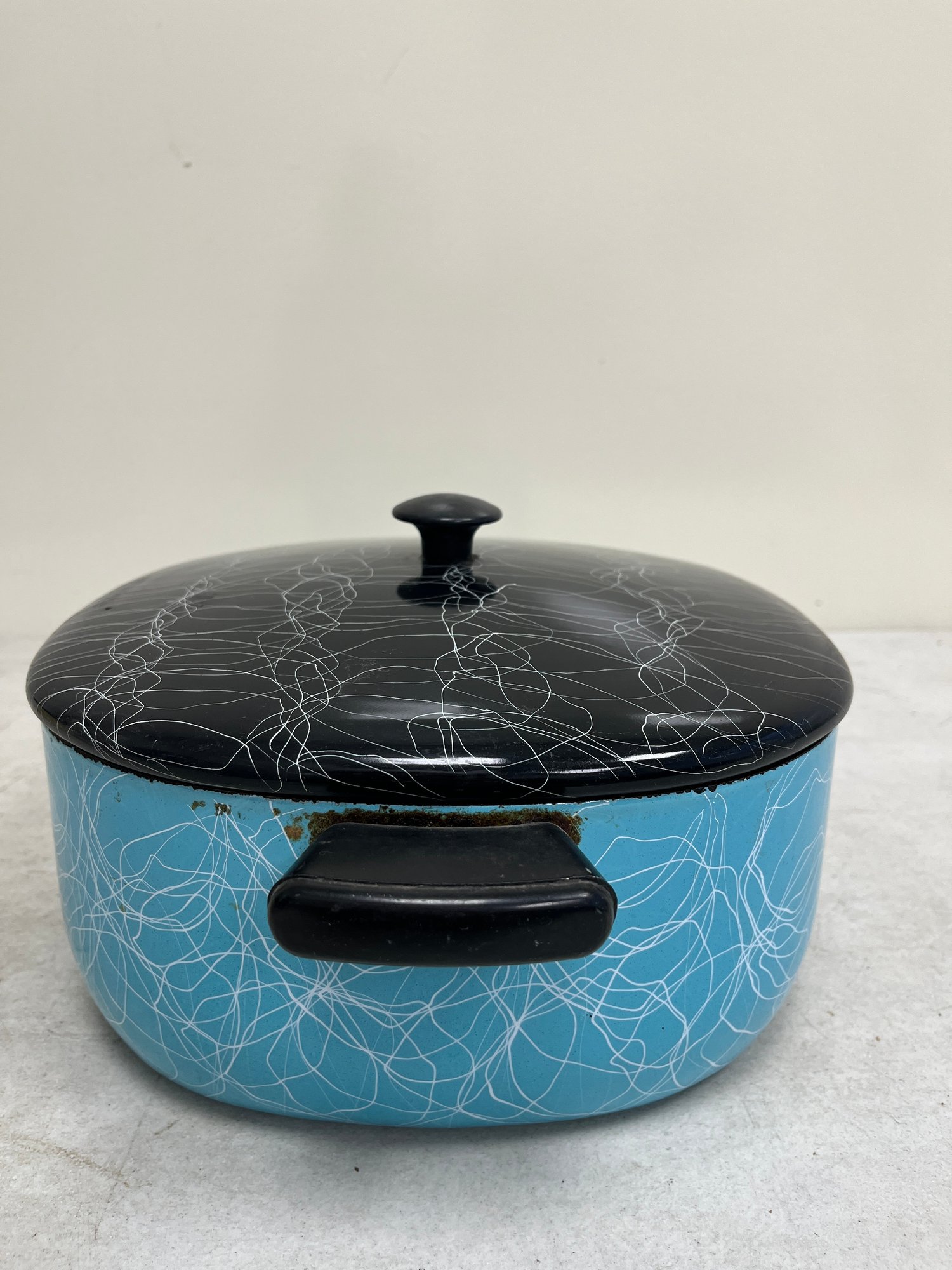 A delightful example of quintessential mid-century modern kitchenware. This rare collection from the 1950s brings the atomic era's charm and style directly to your kitchen. Each pot boasts a vibrant, high-gloss enamel finish, decorated with the signature abstract white "spaghetti" or "drizzle" pattern that makes this line instantly recognizable. The set features striking color combinations: a cheerful lemon yellow, a soft vintage pink, and a bold robin's egg blue, all complemented by matching black lids featuring the same iconic white pattern. This kitschy, fun design adds a touch of nostalgia to any retro kitchen. This lot includes (2) large pots and (1) frying pan.