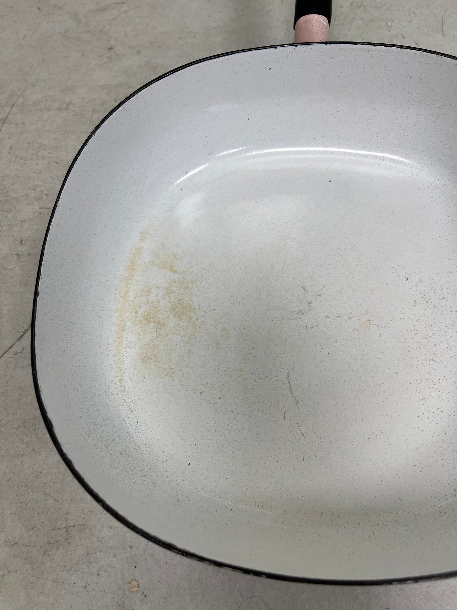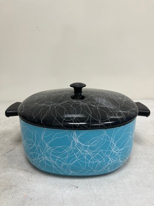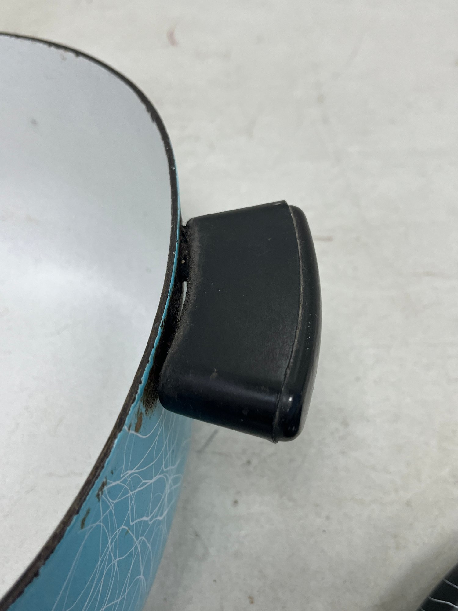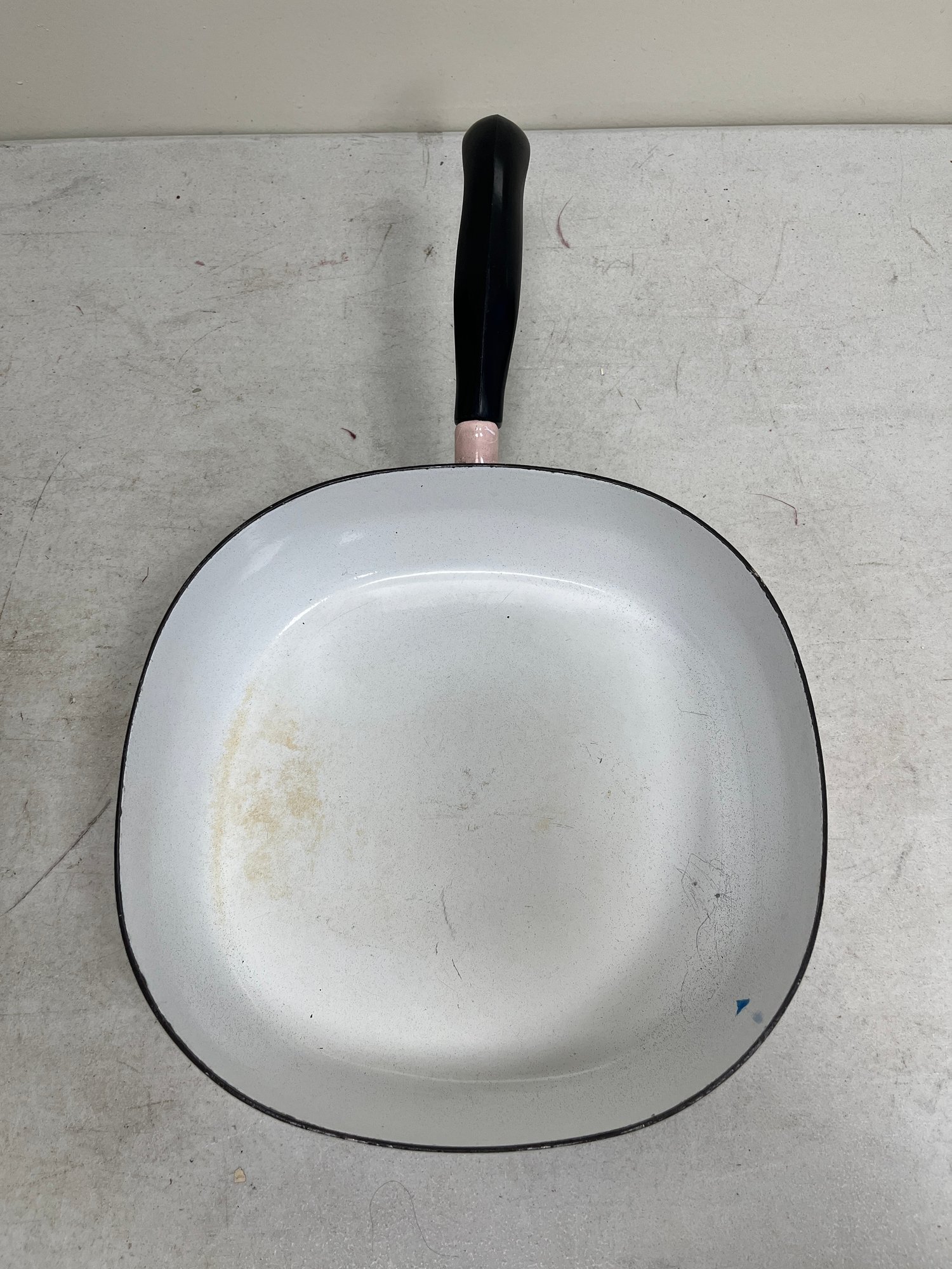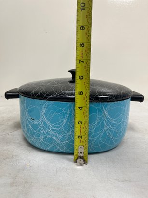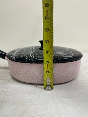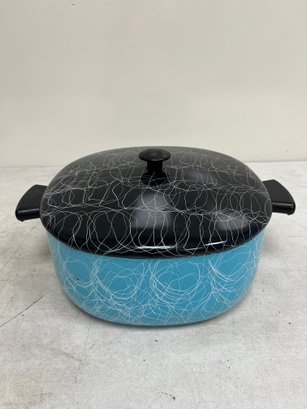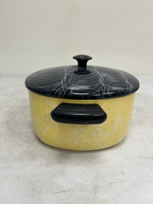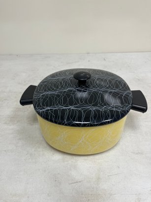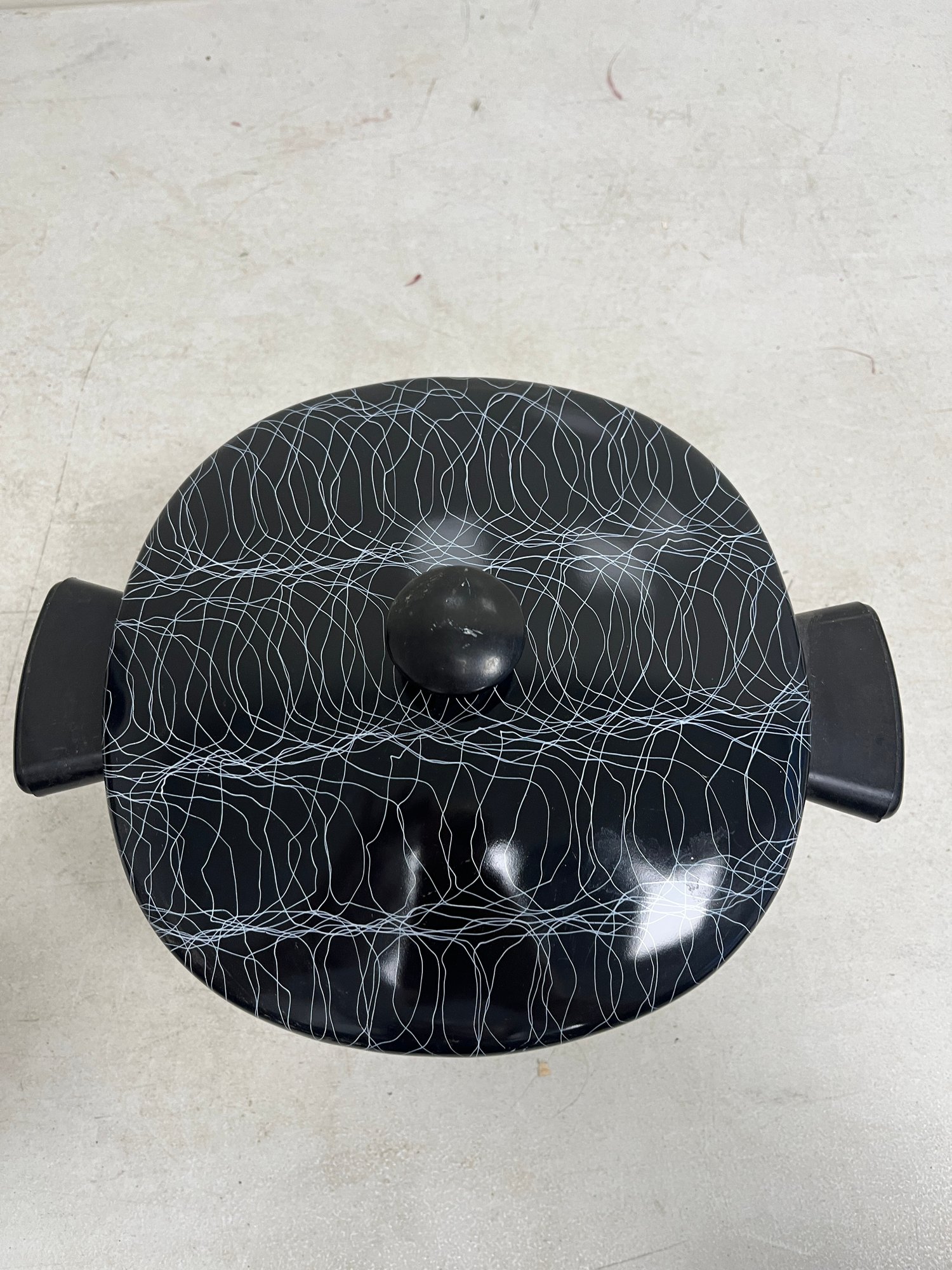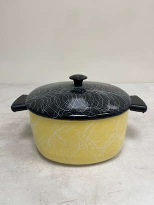 A delightful example of quintessential mid-century modern kitchenware. This rare collection from the 1950s brings the atomic era's charm and style directly to your kitchen. Each pot boasts a vibrant, high-gloss enamel finish, decorated with the signature abstract white "spaghetti" or "drizzle" pattern that makes this line instantly recognizable. The set features striking color combinations: a cheerful lemon yellow, a soft vintage pink, and a bold robin's egg blue, all complemented by matching black lids featuring the same iconic white pattern. This kitschy, fun design adds a touch of nostalgia to any retro kitchen. This lot includes (2) large pots and (1) frying pan.