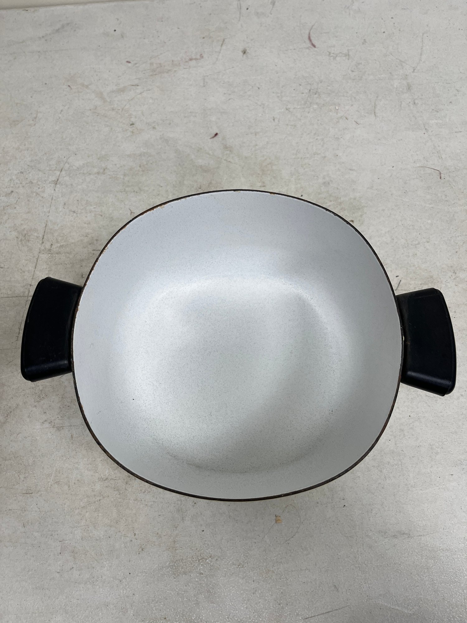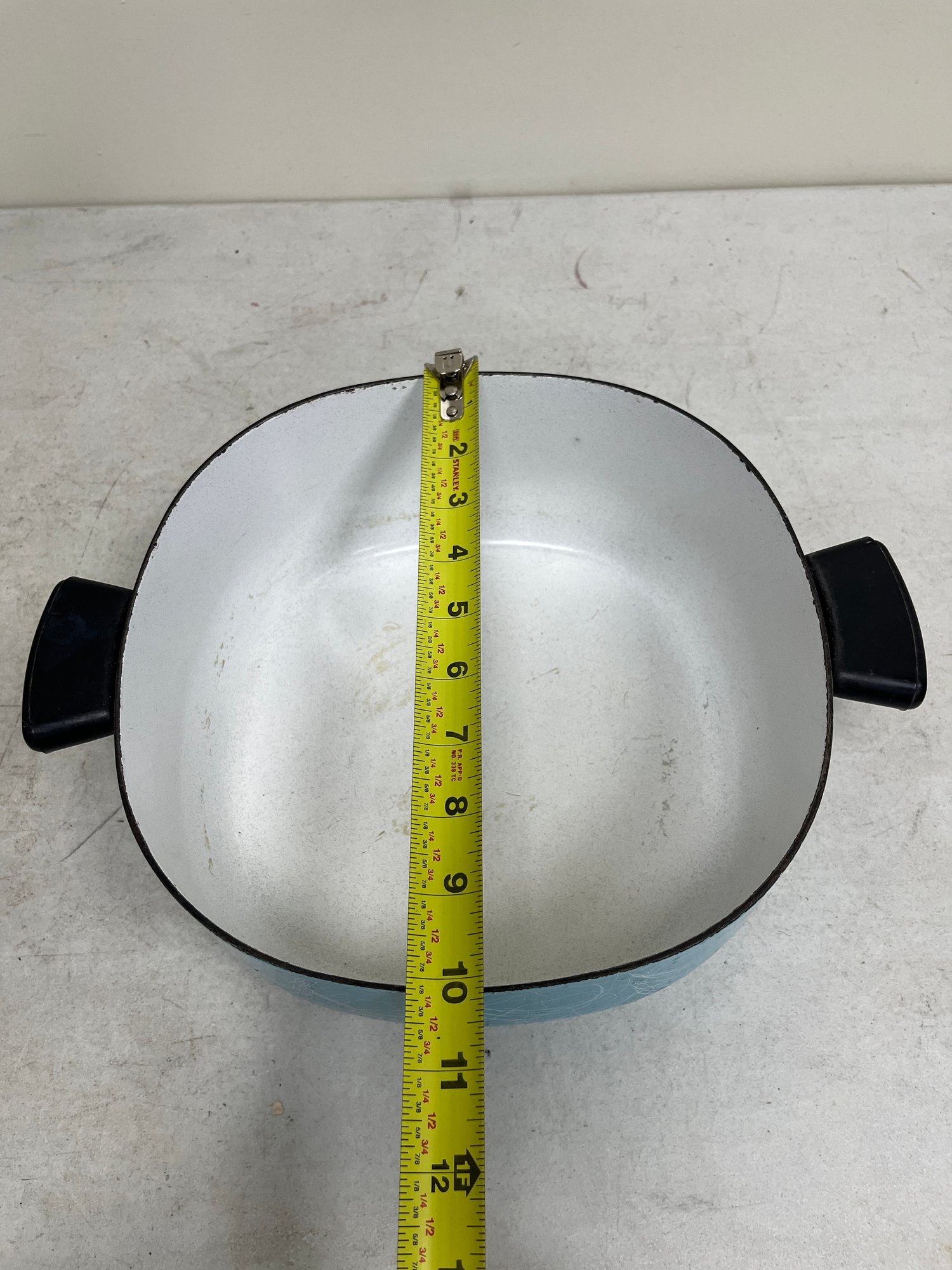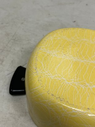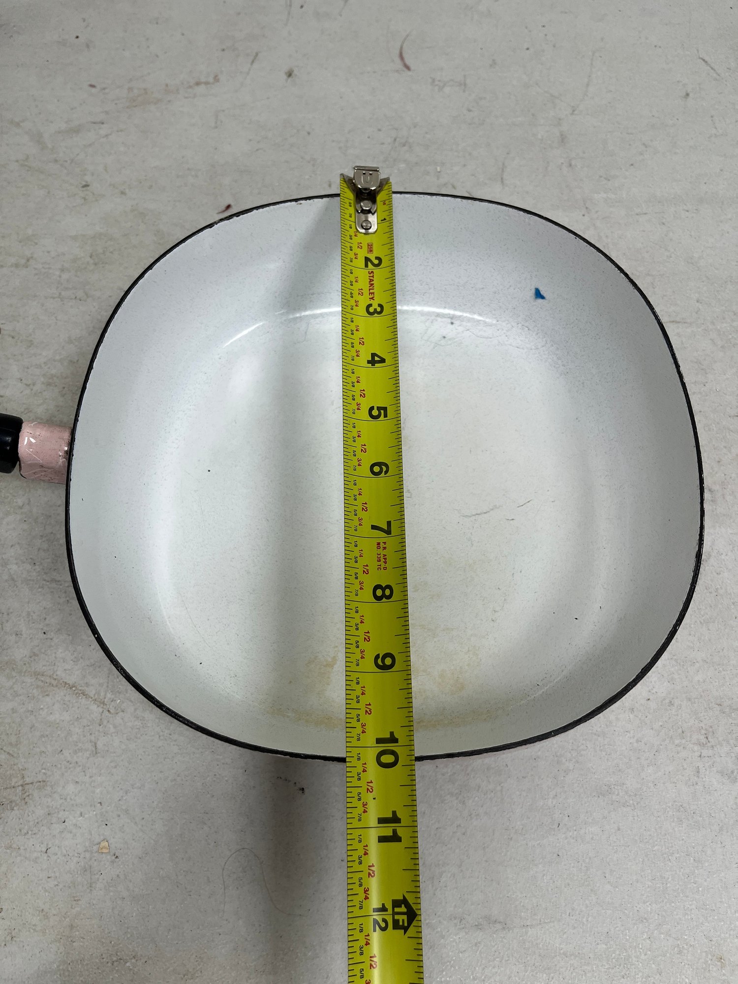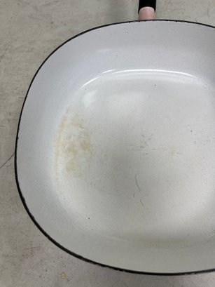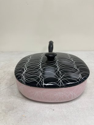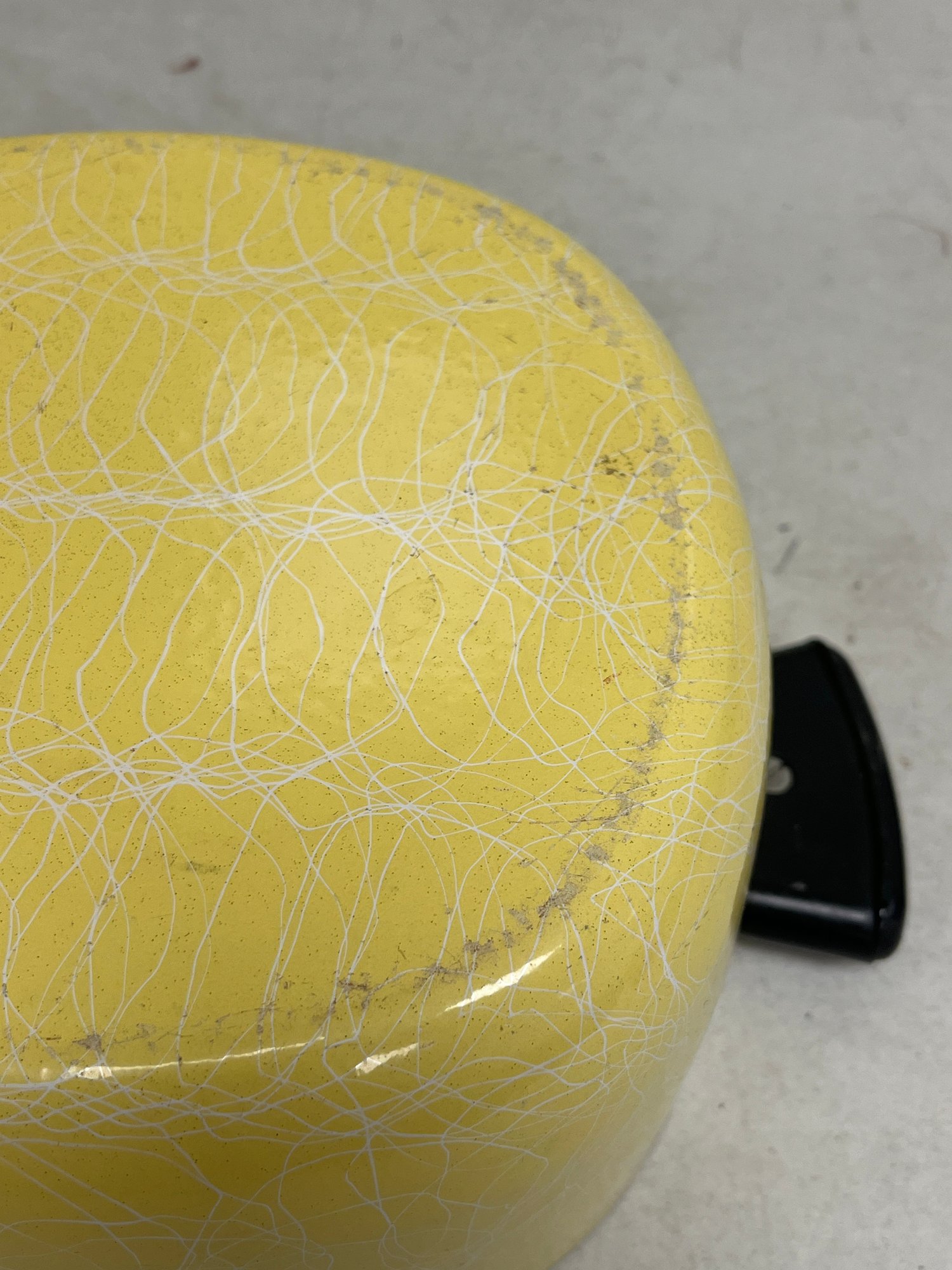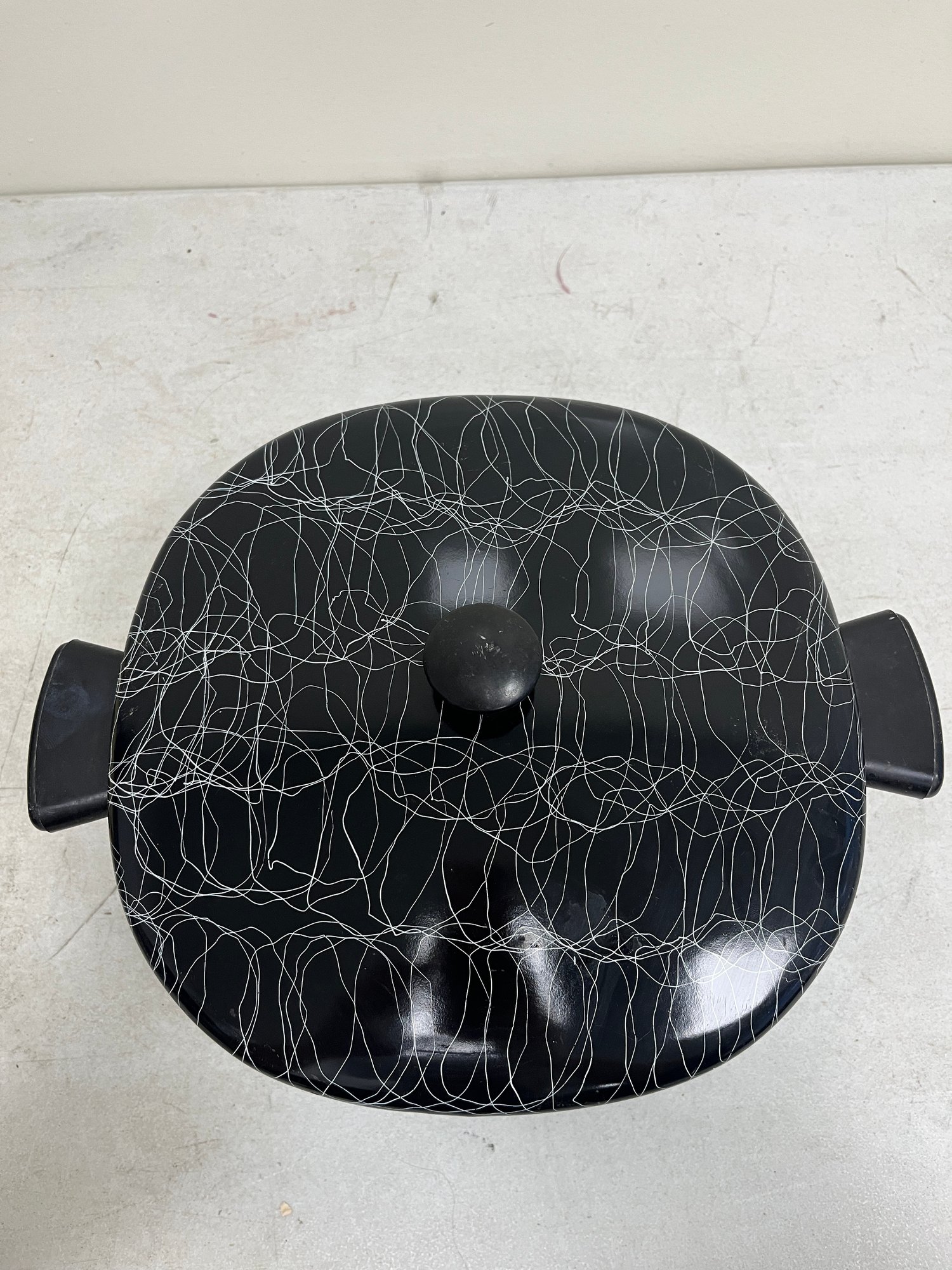 A delightful example of quintessential mid-century modern kitchenware. This rare collection from the 1950s brings the atomic era's charm and style directly to your kitchen. Each pot boasts a vibrant, high-gloss enamel finish, decorated with the signature abstract white "spaghetti" or "drizzle" pattern that makes this line instantly recognizable. The set features striking color combinations: a cheerful lemon yellow, a soft vintage pink, and a bold robin's egg blue, all complemented by matching black lids featuring the same iconic white pattern. This kitschy, fun design adds a touch of nostalgia to any retro kitchen. This lot includes (2) large pots and (1) frying pan.