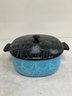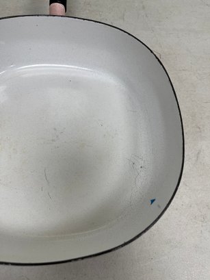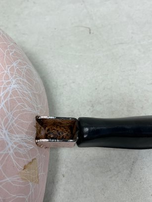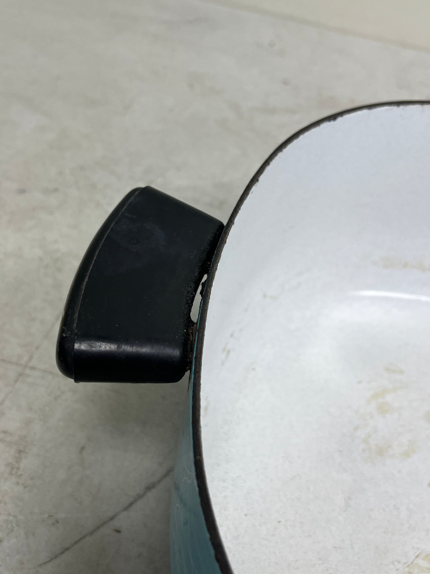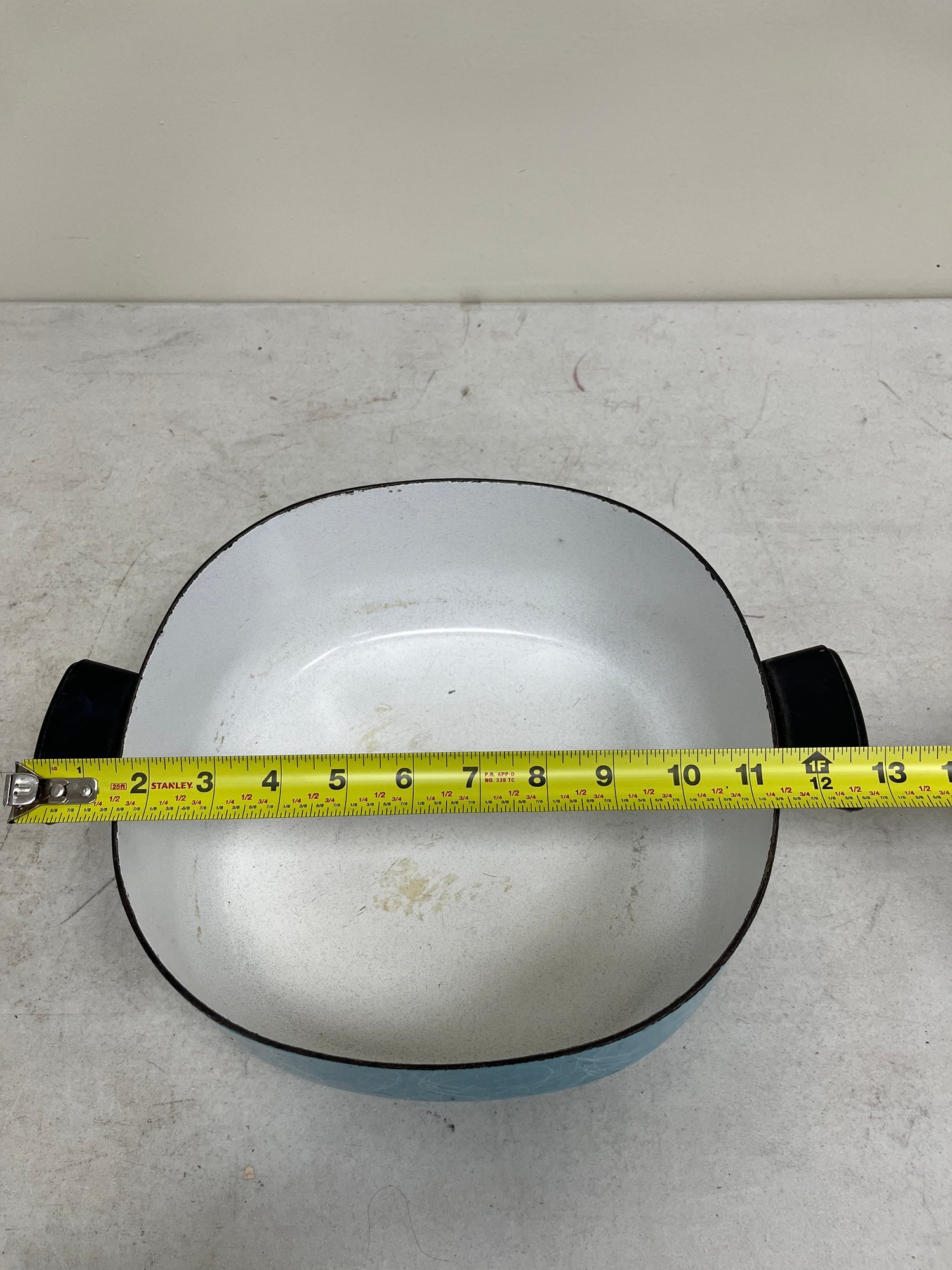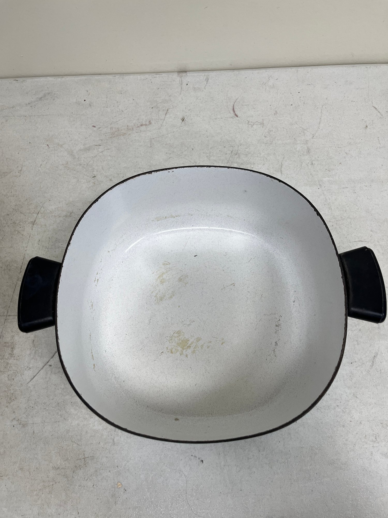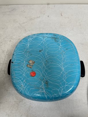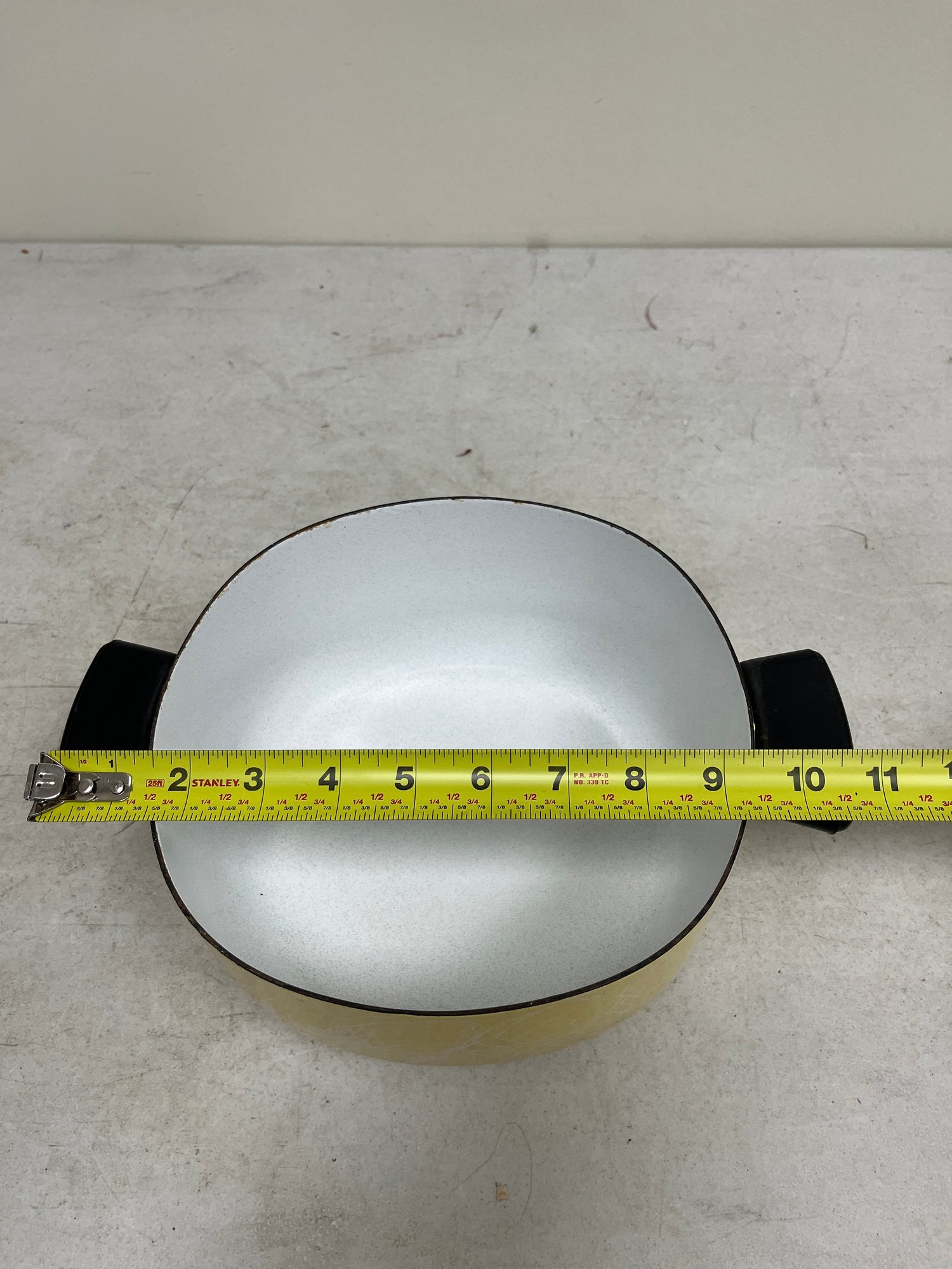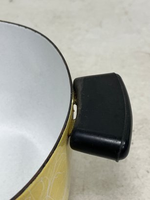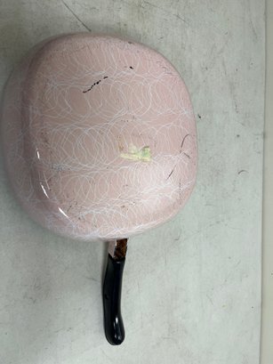 A delightful example of quintessential mid-century modern kitchenware. This rare collection from the 1950s brings the atomic era's charm and style directly to your kitchen. Each pot boasts a vibrant, high-gloss enamel finish, decorated with the signature abstract white "spaghetti" or "drizzle" pattern that makes this line instantly recognizable. The set features striking color combinations: a cheerful lemon yellow, a soft vintage pink, and a bold robin's egg blue, all complemented by matching black lids featuring the same iconic white pattern. This kitschy, fun design adds a touch of nostalgia to any retro kitchen. This lot includes (2) large pots and (1) frying pan.