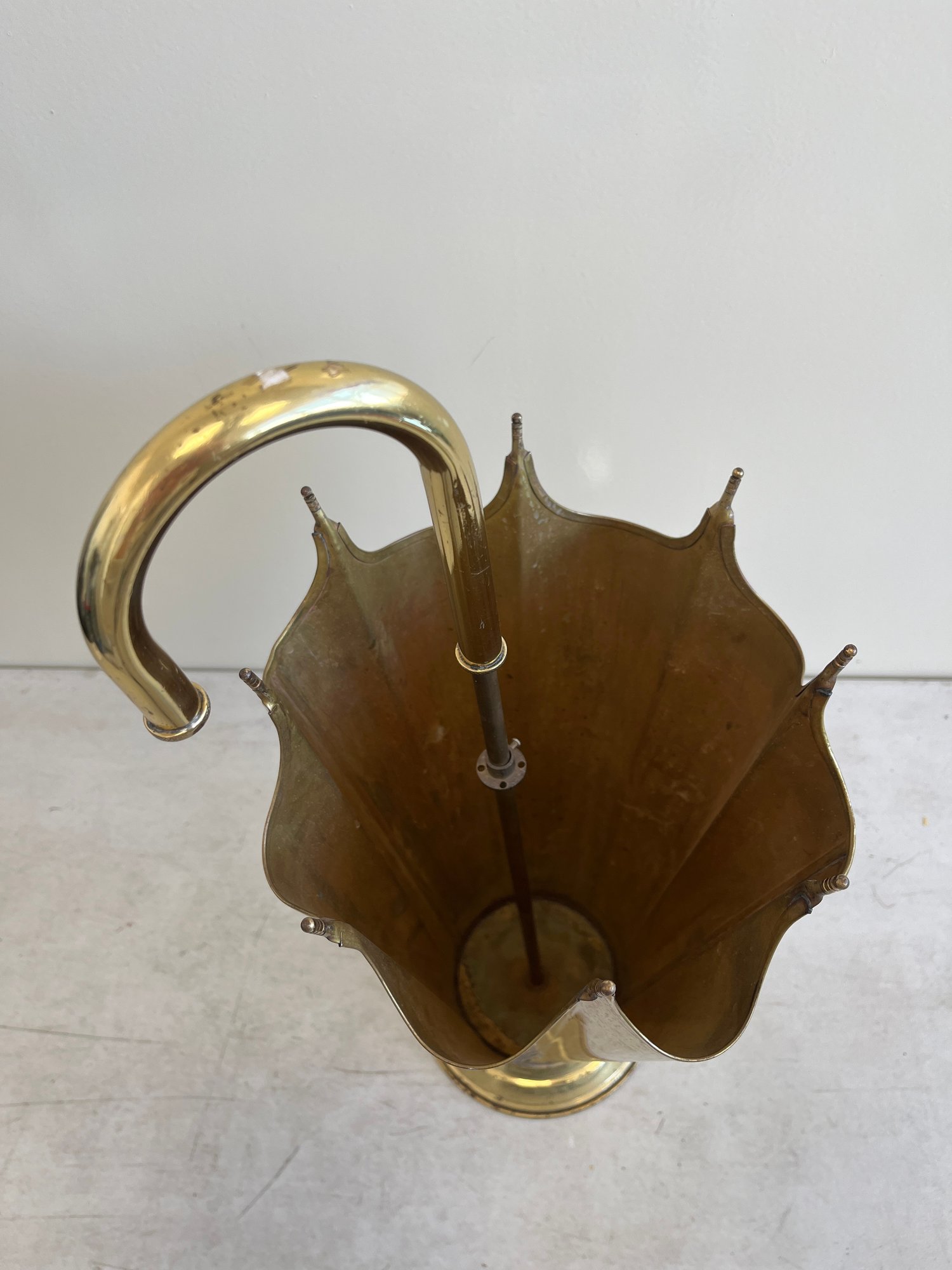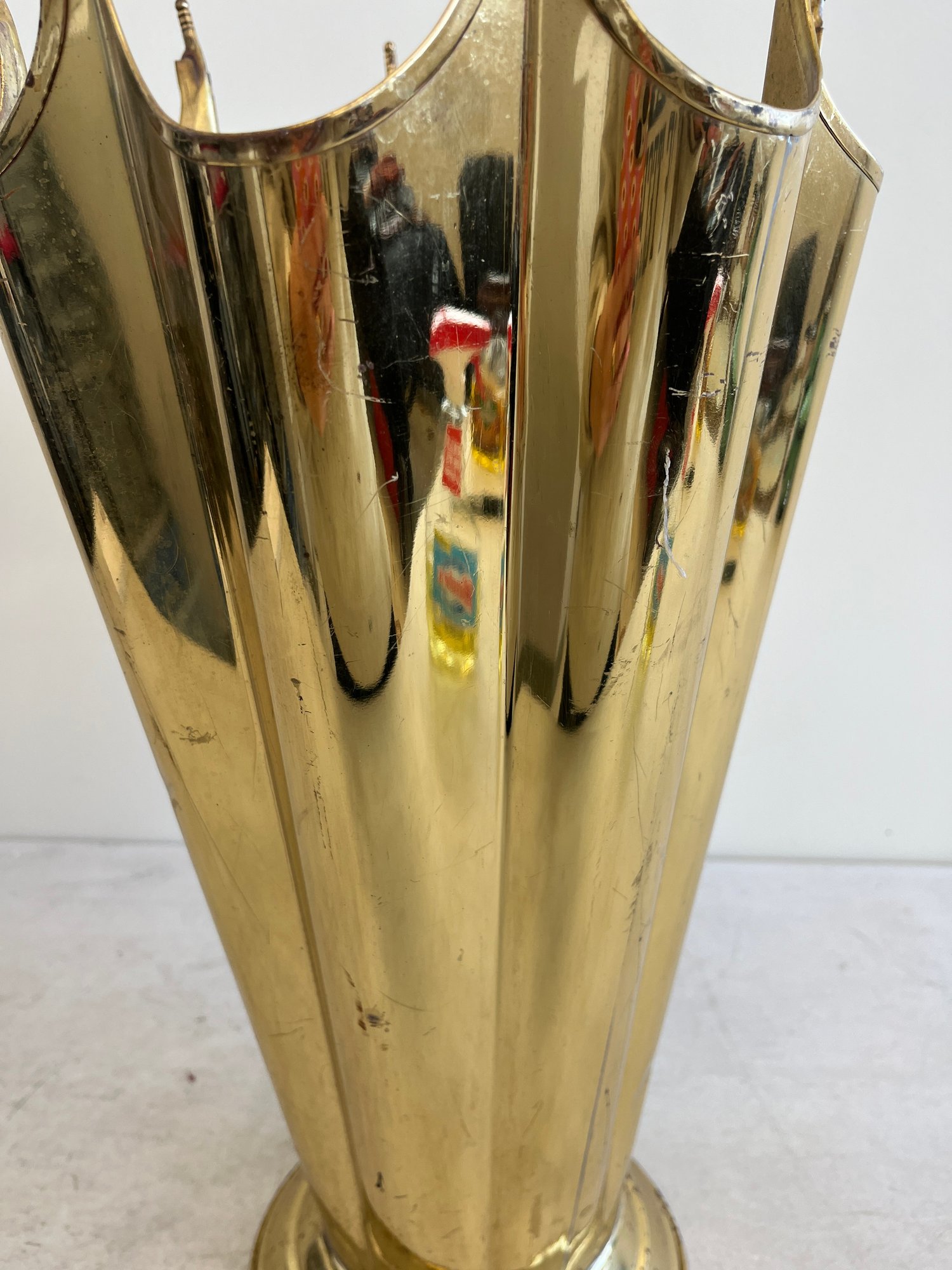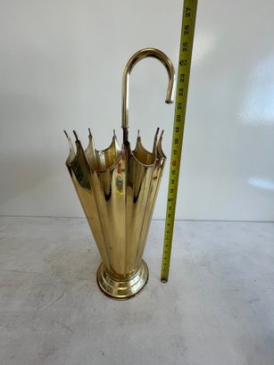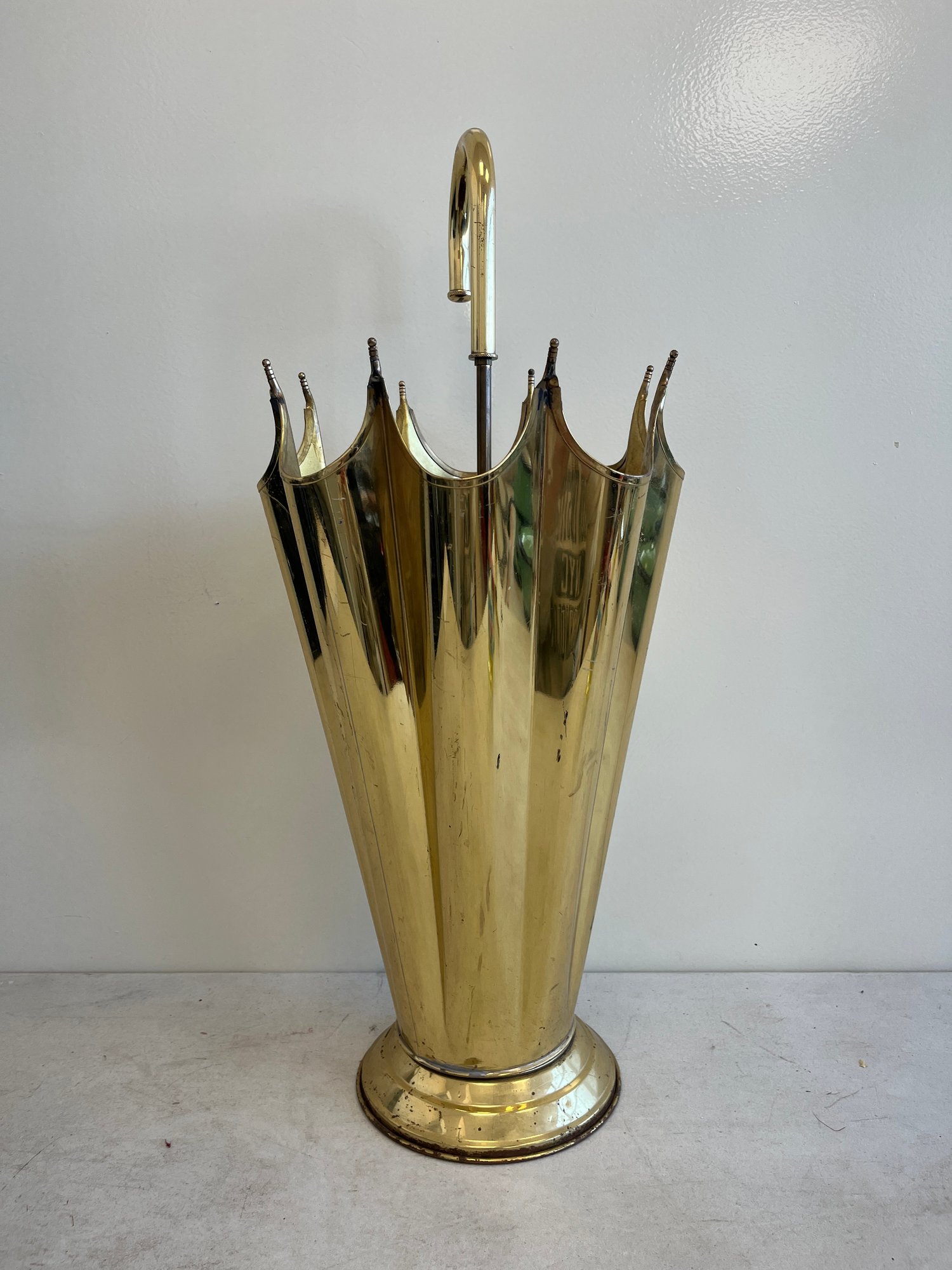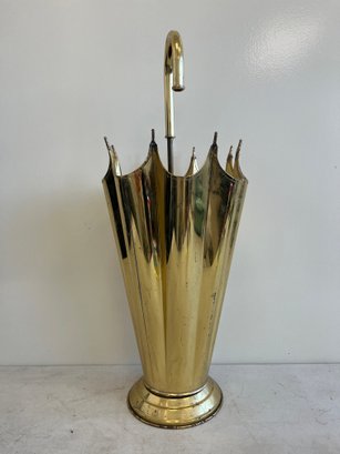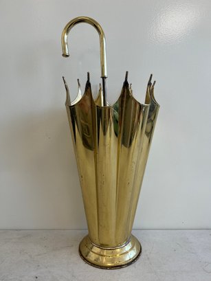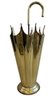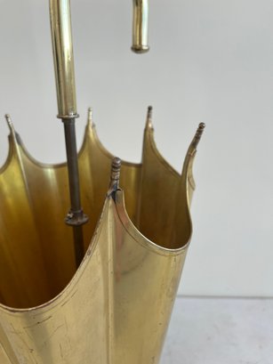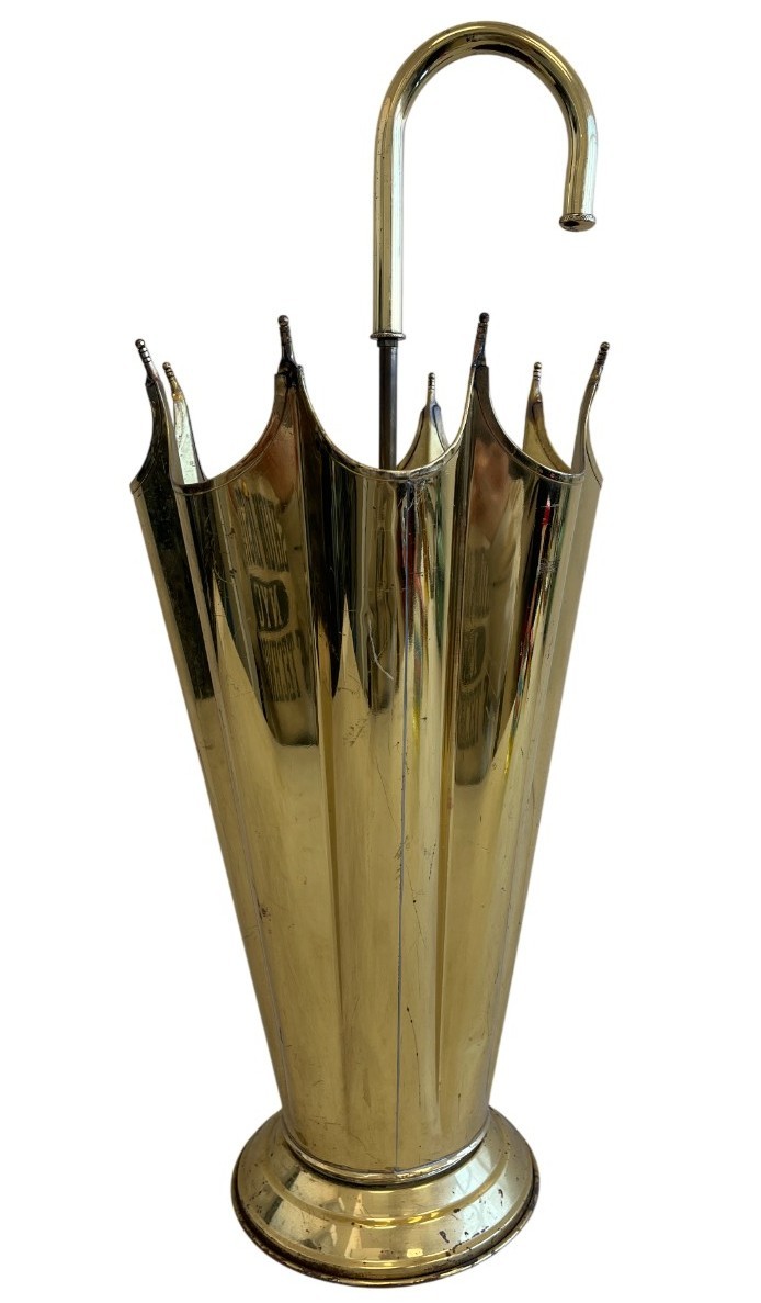 This elegant umbrella stand embodies the distinctive flair of the Mid-Century Modern and Hollywood Regency design eras. Designed to resemble an open umbrella canopy, it features a striking conical body with vertical fluting and a decorative, scalloped top rim.