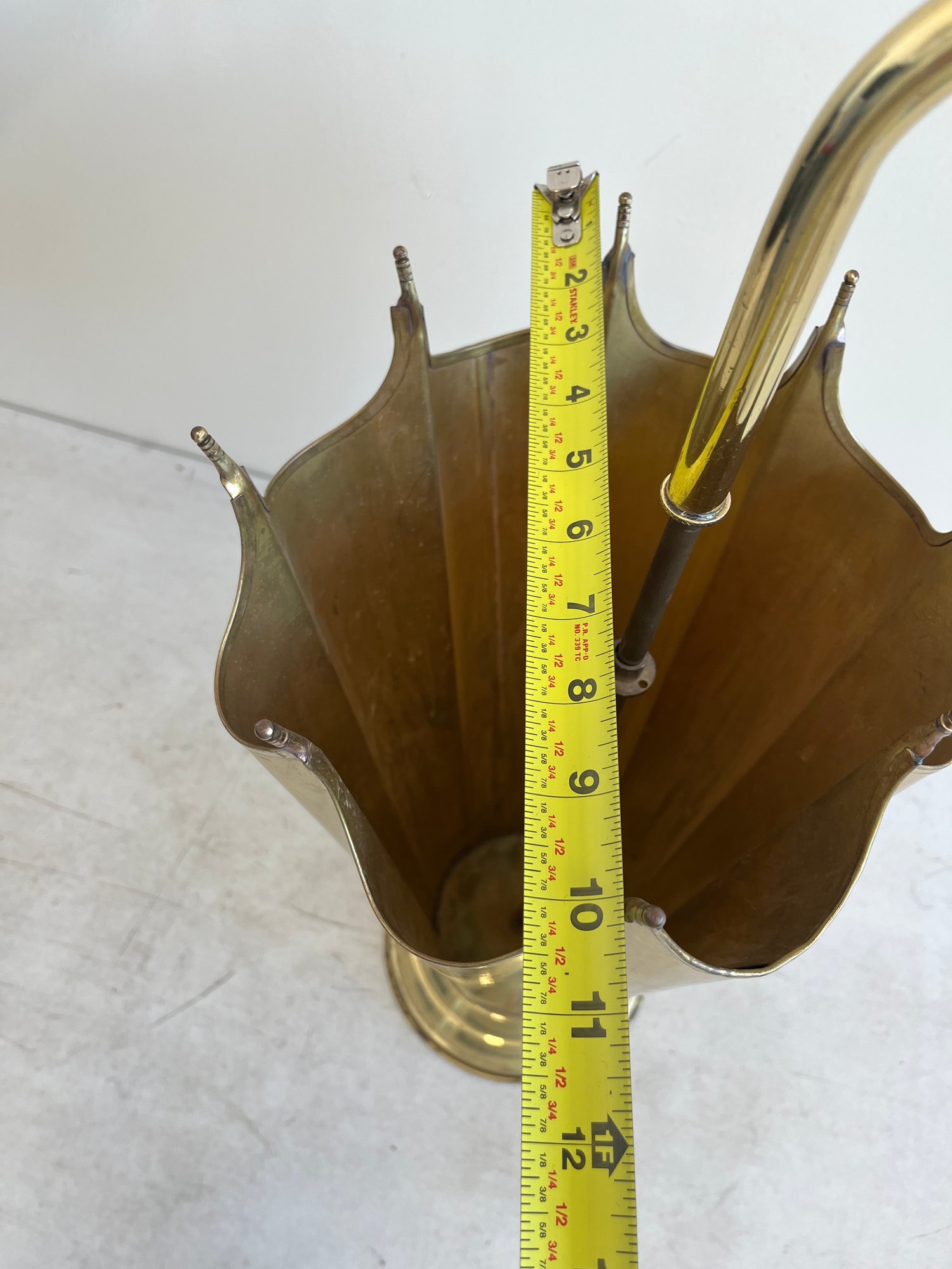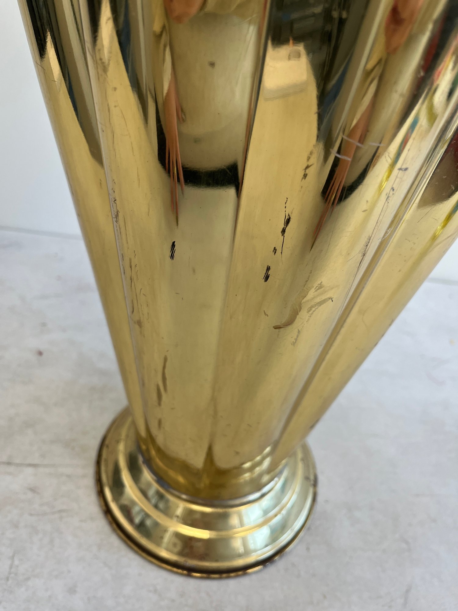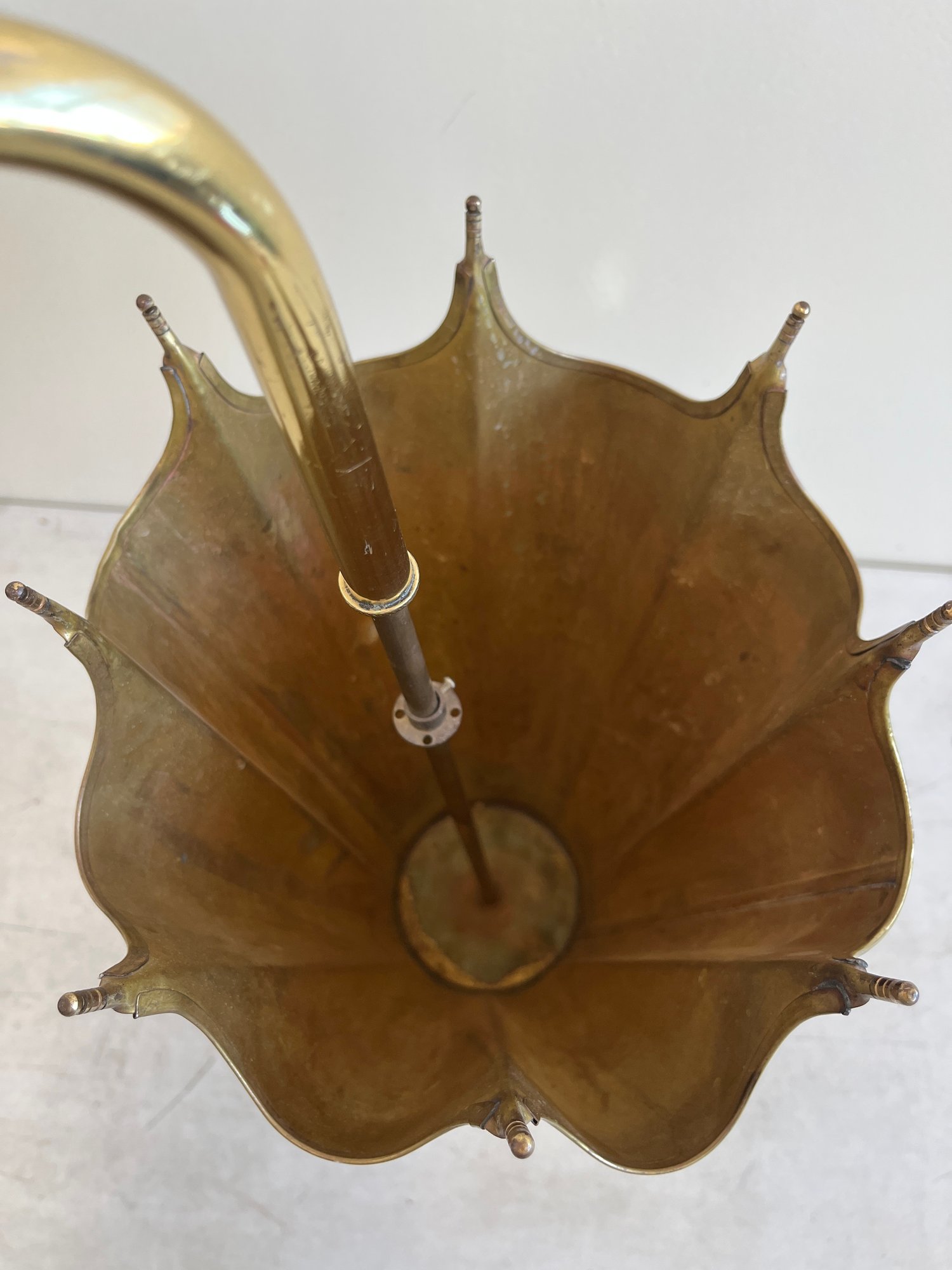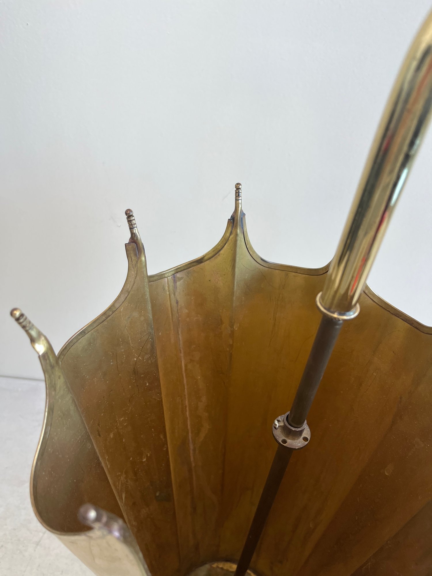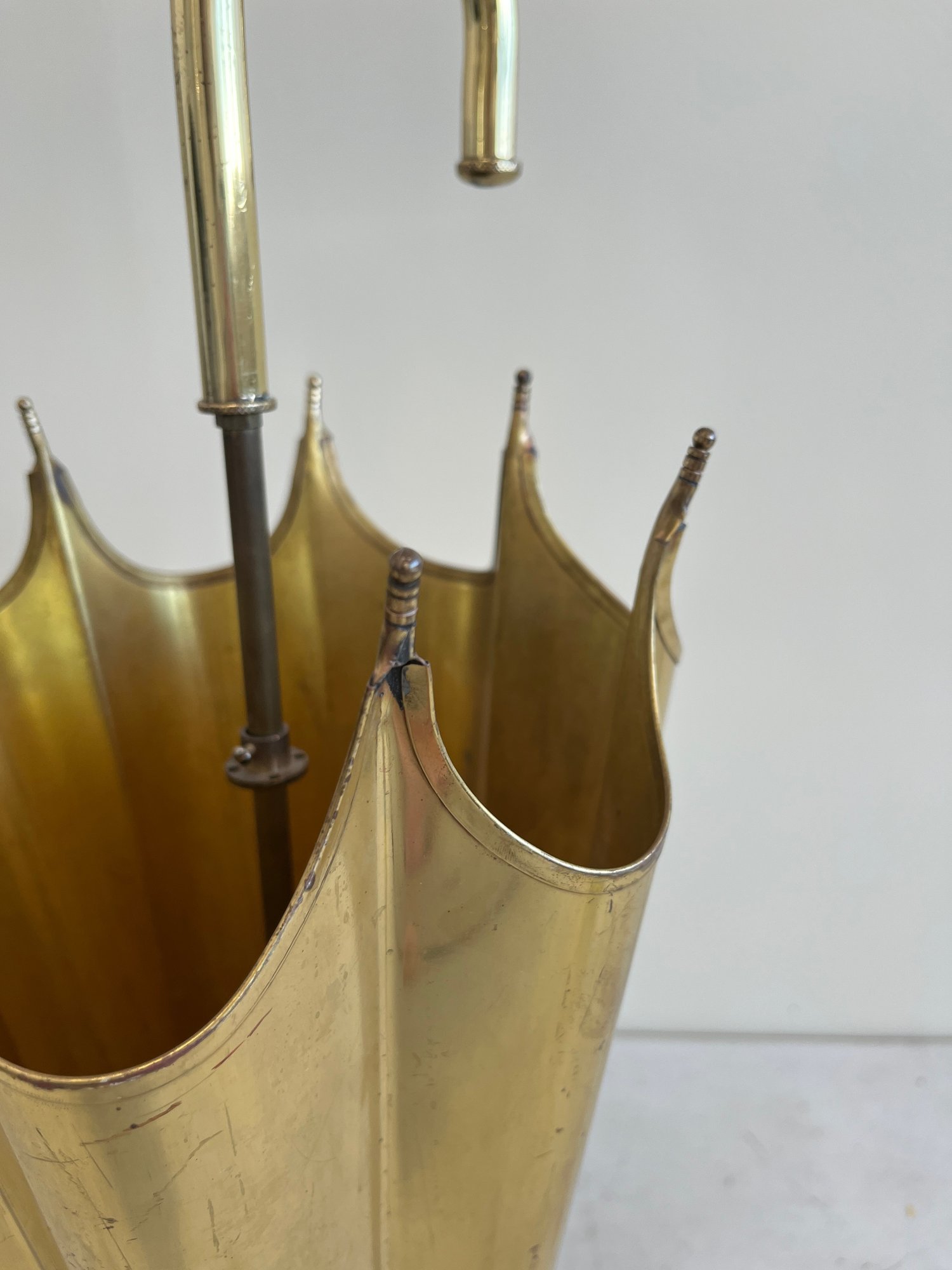 This elegant umbrella stand embodies the distinctive flair of the Mid-Century Modern and Hollywood Regency design eras. Designed to resemble an open umbrella canopy, it features a striking conical body with vertical fluting and a decorative, scalloped top rim.