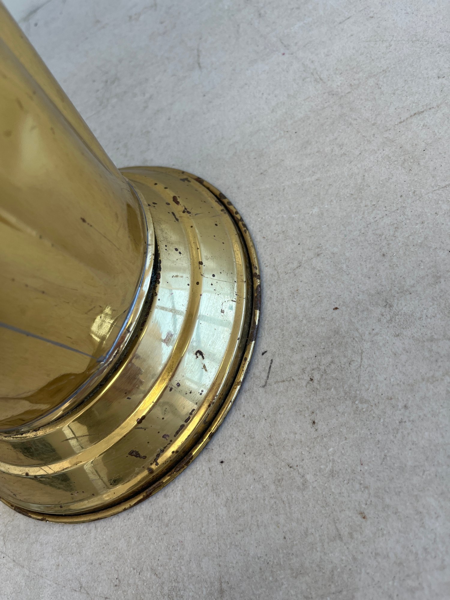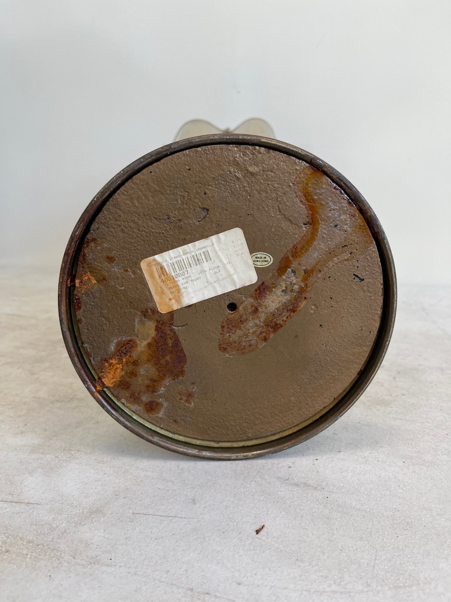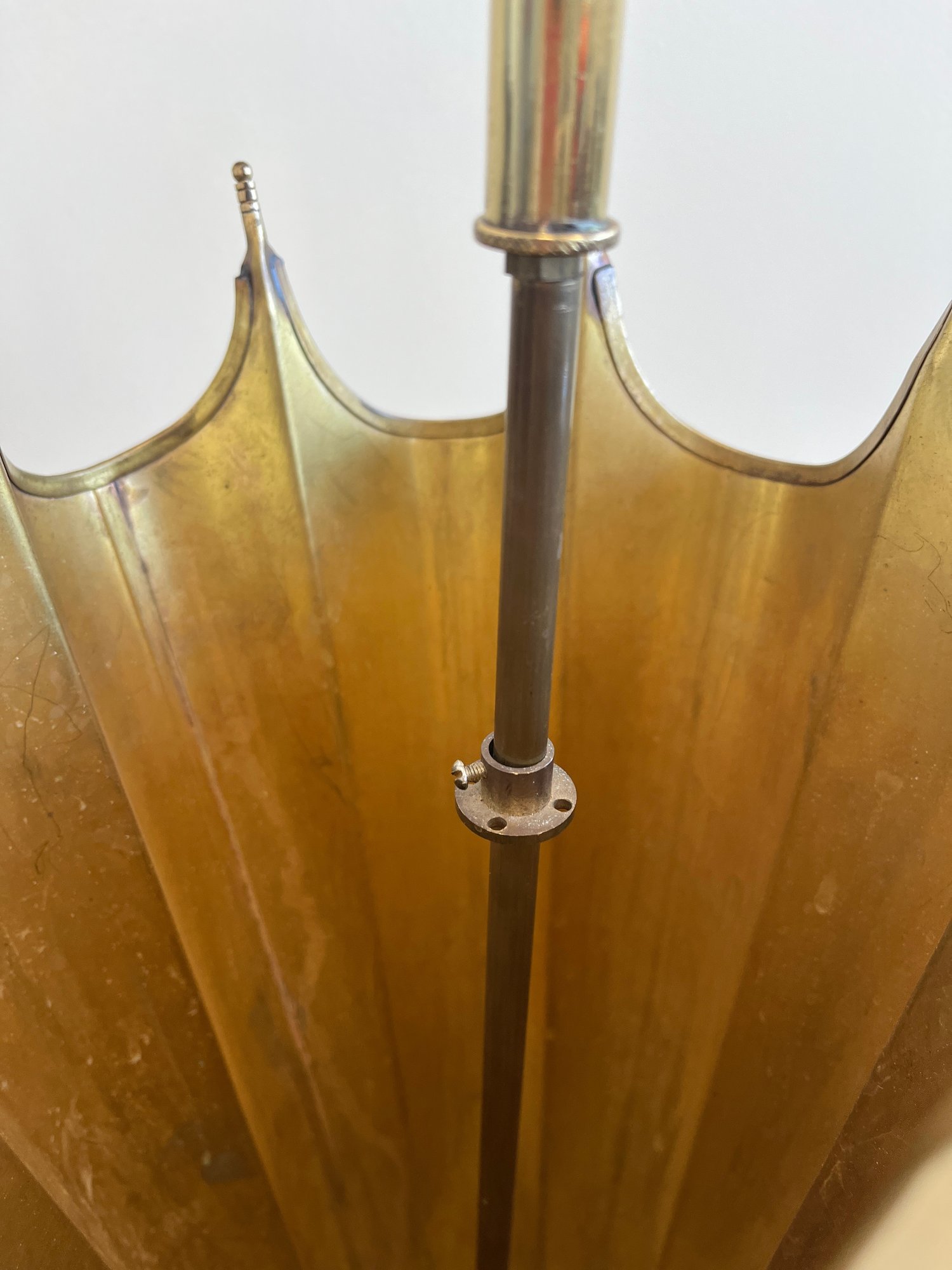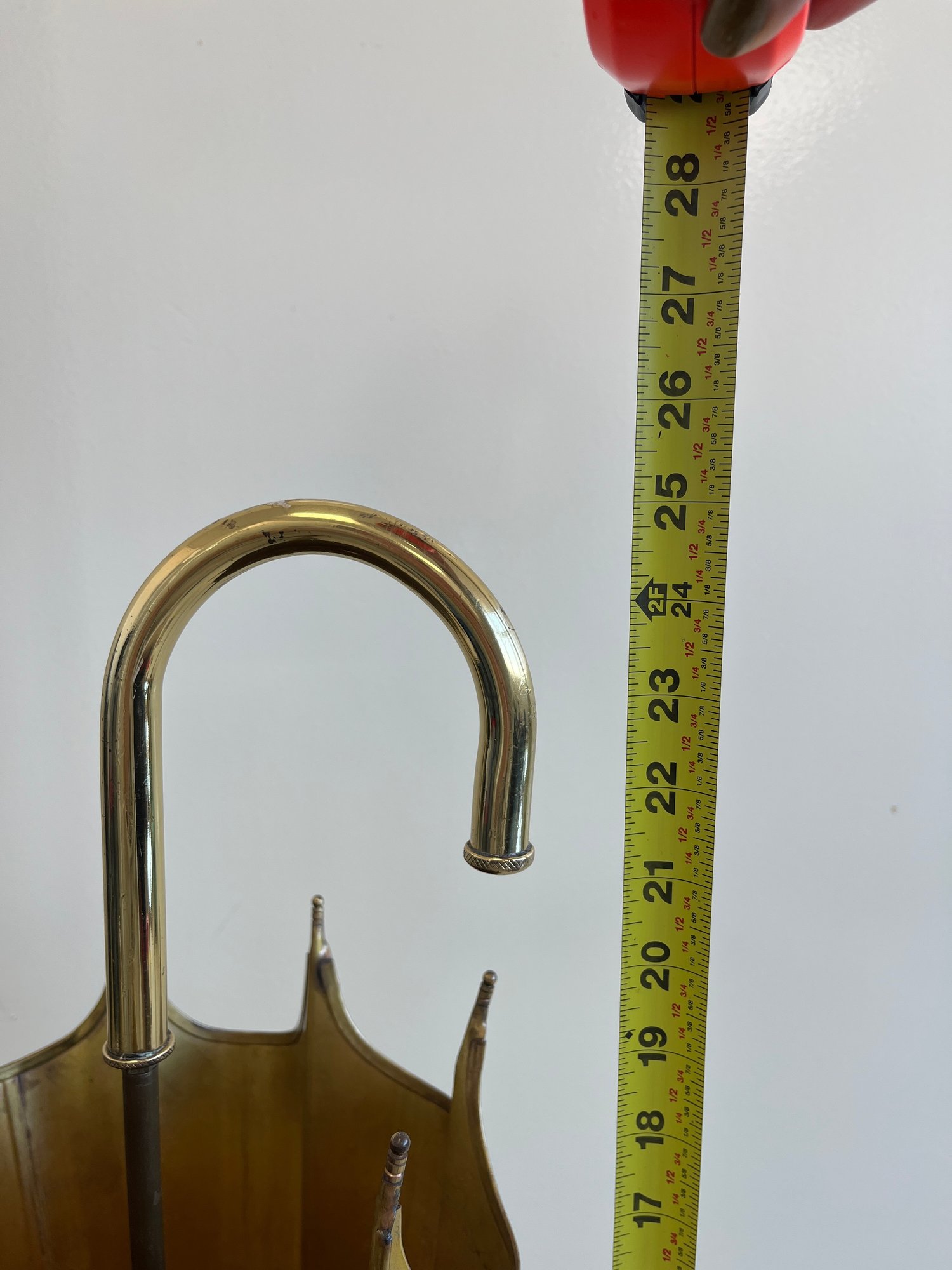 This elegant umbrella stand embodies the distinctive flair of the Mid-Century Modern and Hollywood Regency design eras. Designed to resemble an open umbrella canopy, it features a striking conical body with vertical fluting and a decorative, scalloped top rim.