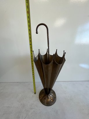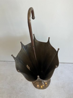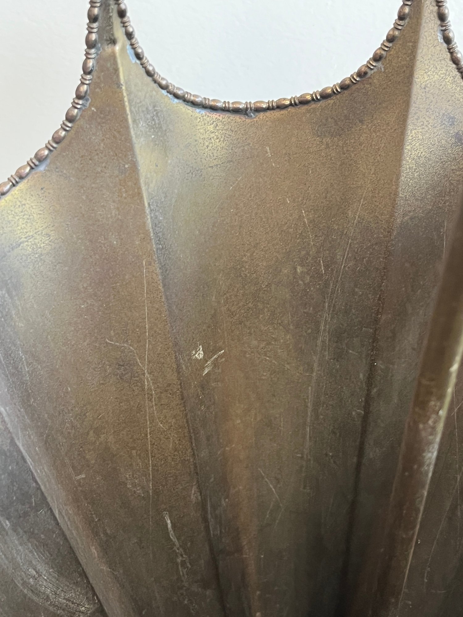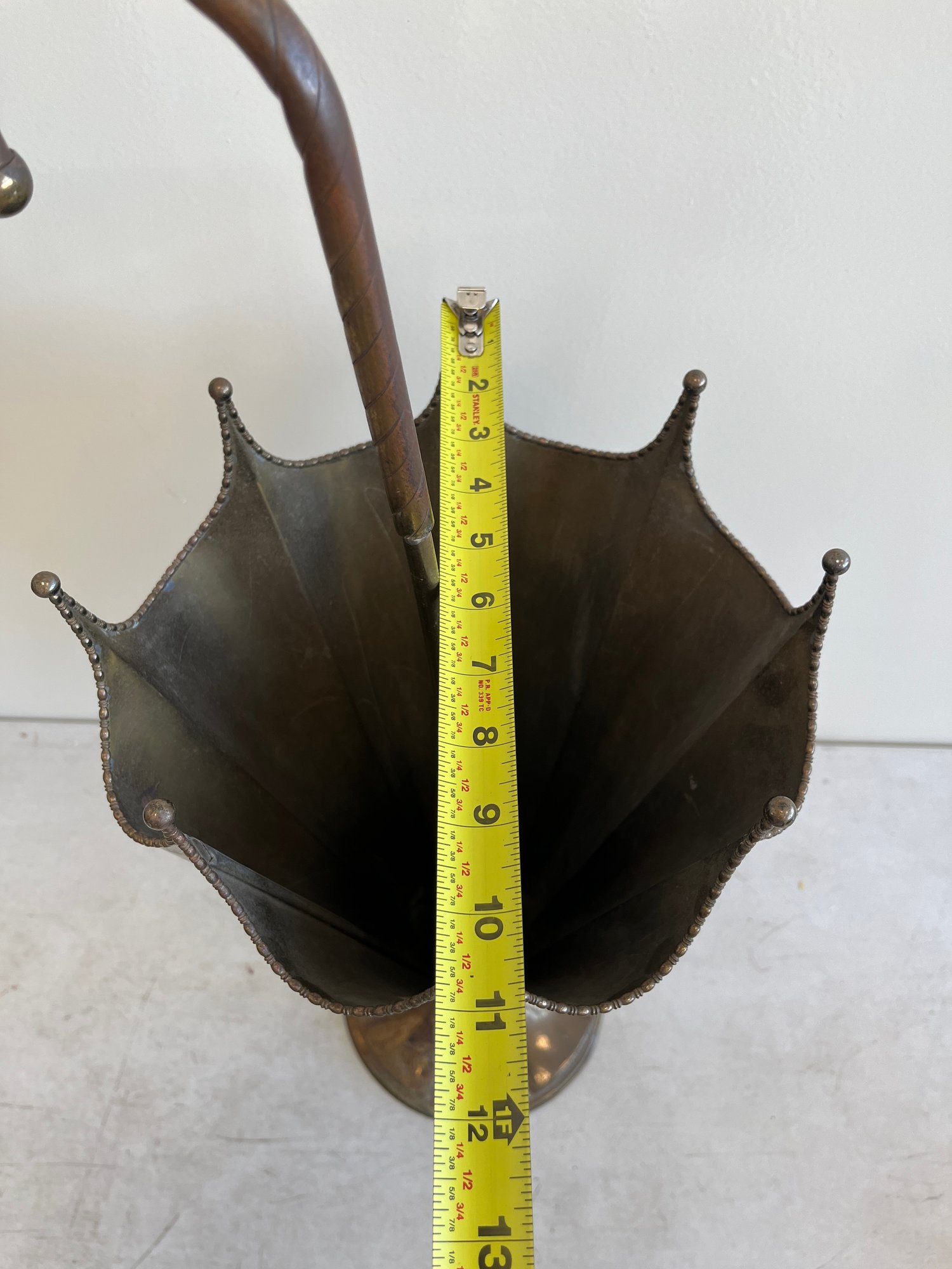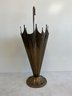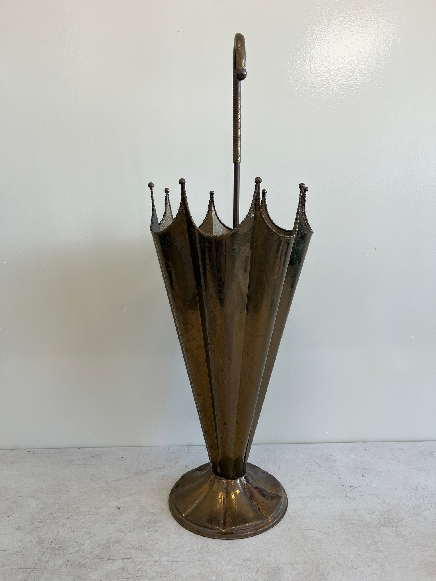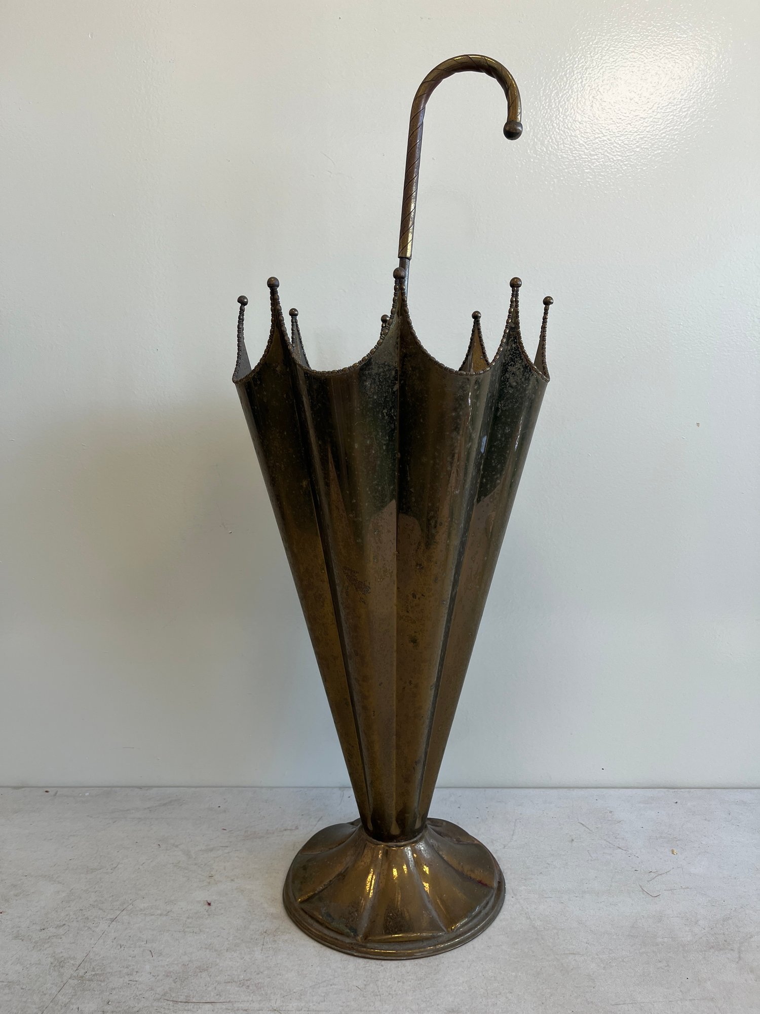 This elegant umbrella stand embodies the distinctive flair of the Mid-Century Modern and Hollywood Regency design eras. Designed to resemble an open umbrella canopy, it features a striking conical body with vertical fluting and a decorative, scalloped top rim.