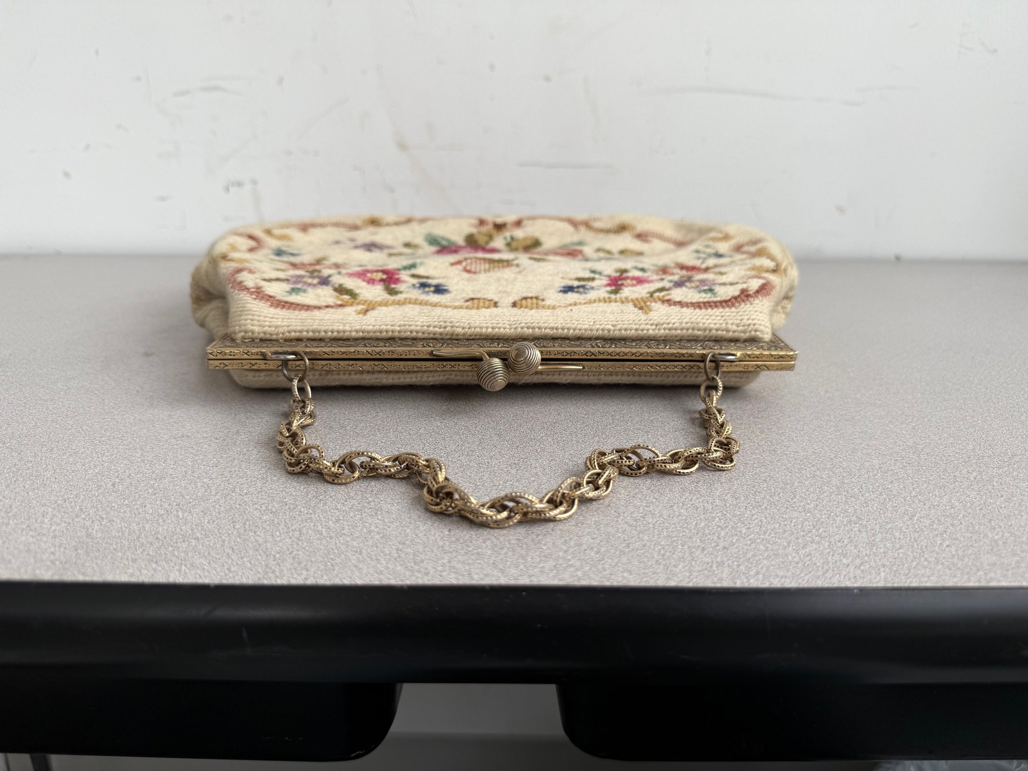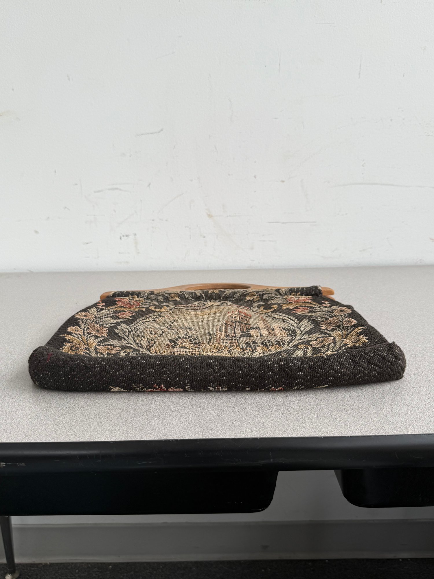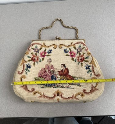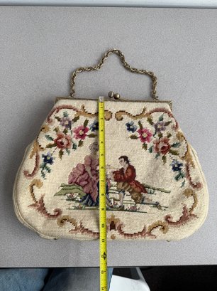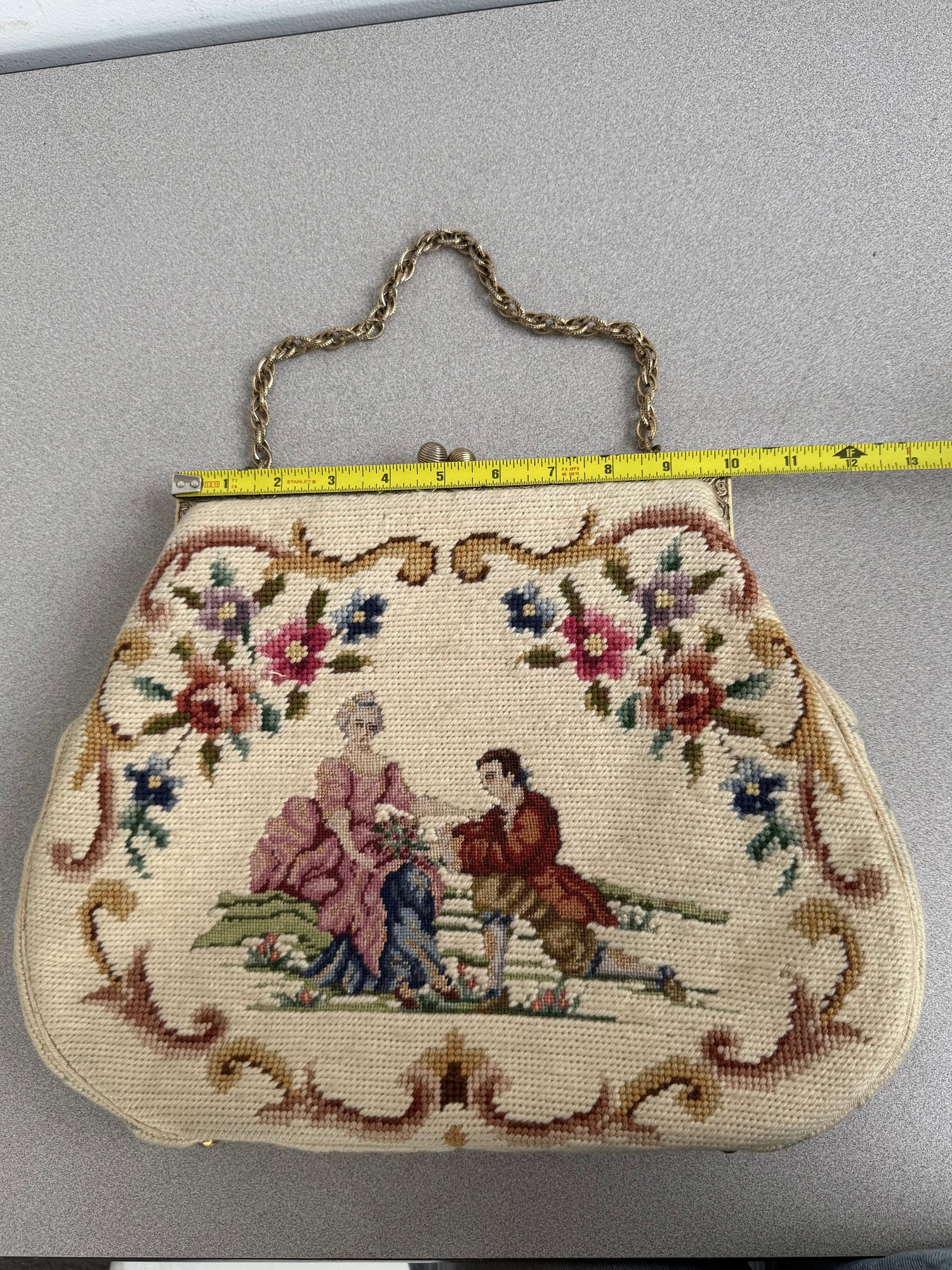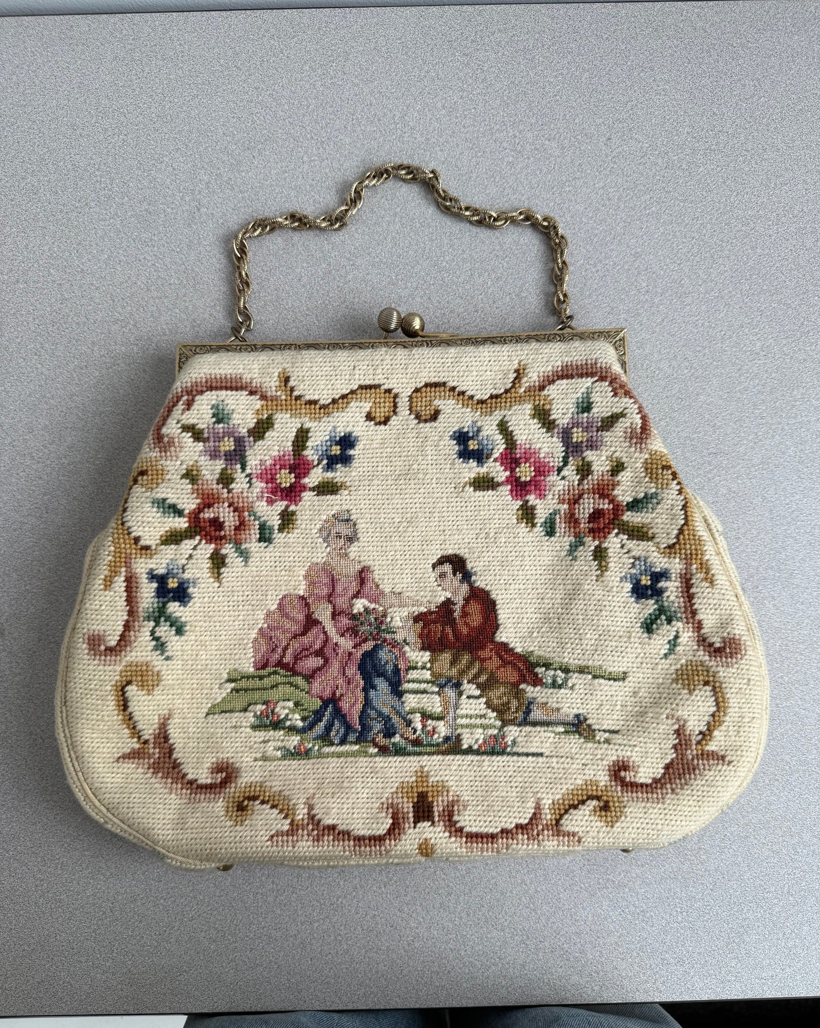 A charming collection featuring two distinct examples of vintage textile craftsmanship, ideal for the discerning collector of antique accessories. This lot includes one landscape-themed tapestry bag with a wooden handle and one romantic figural petit point purse with a metal frame and chain strap. Both pieces exhibit the intricate handiwork popular in the early to mid-20th century.