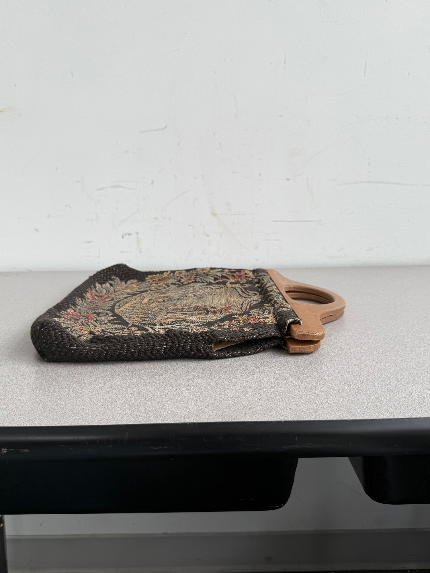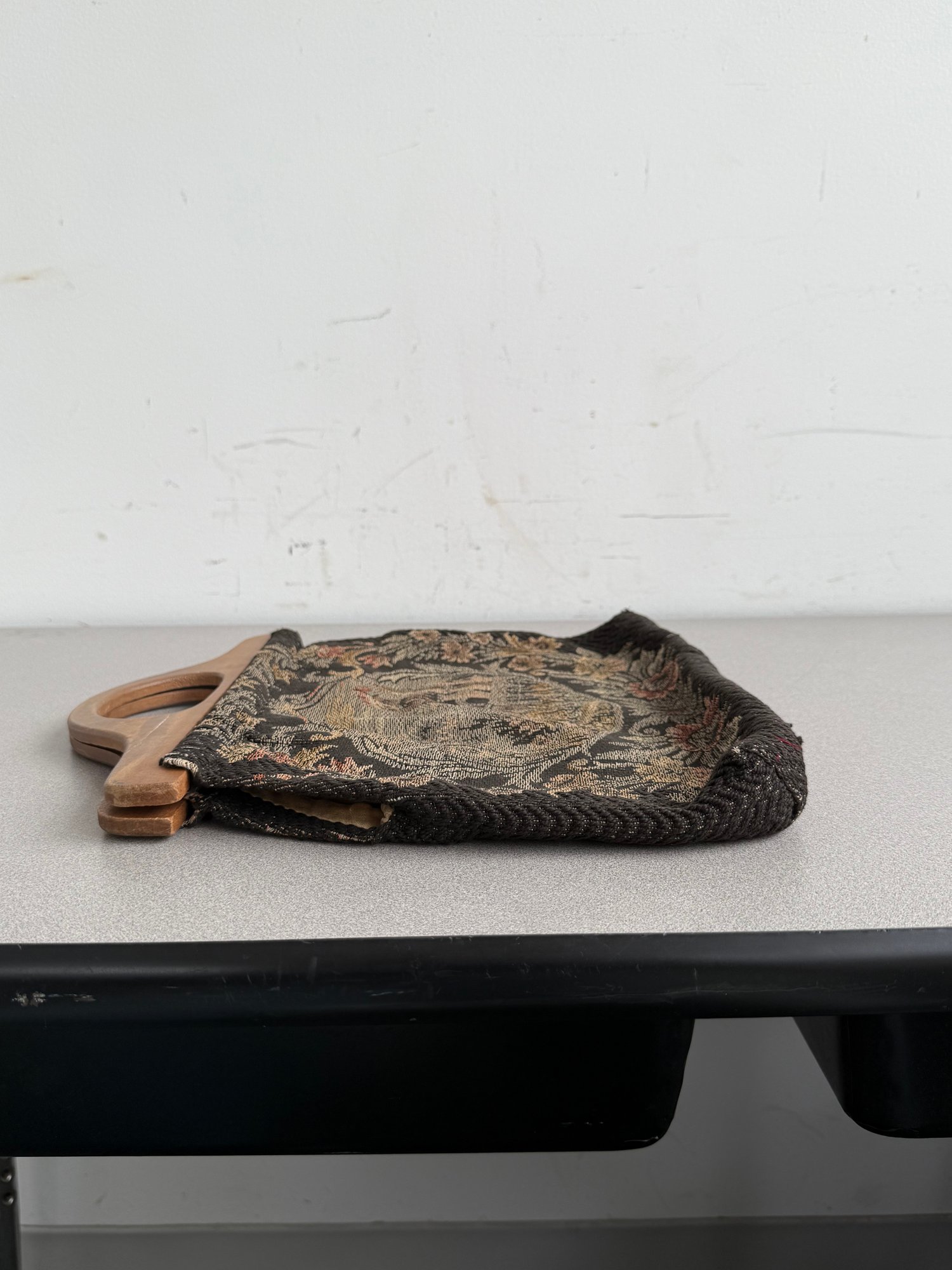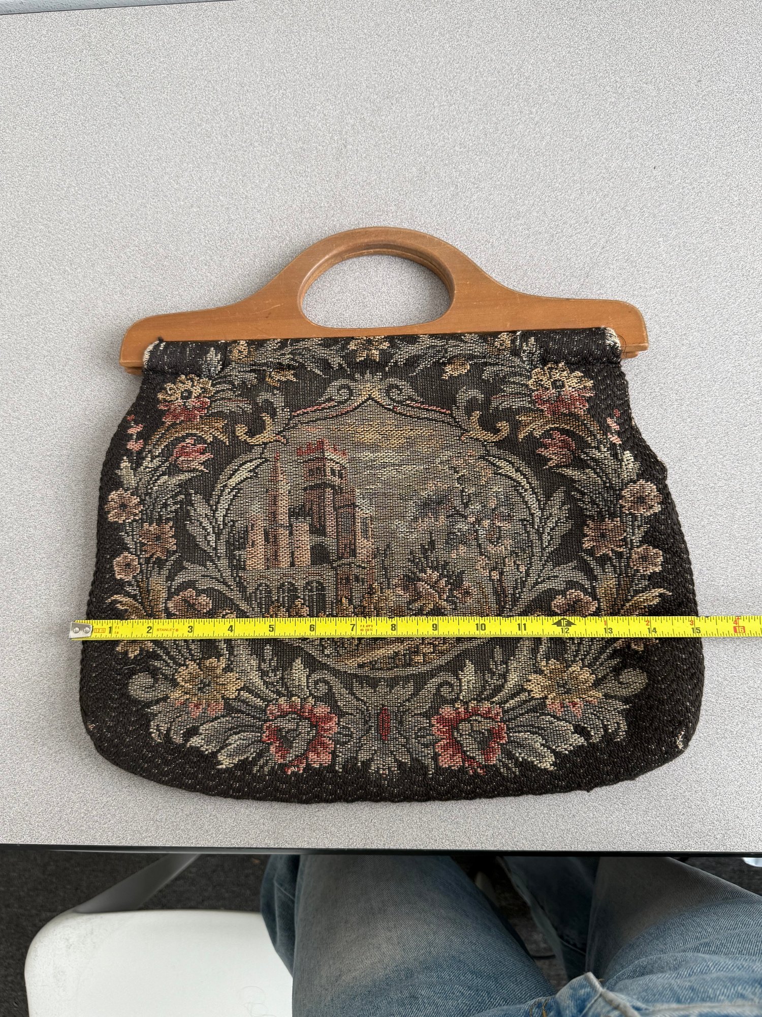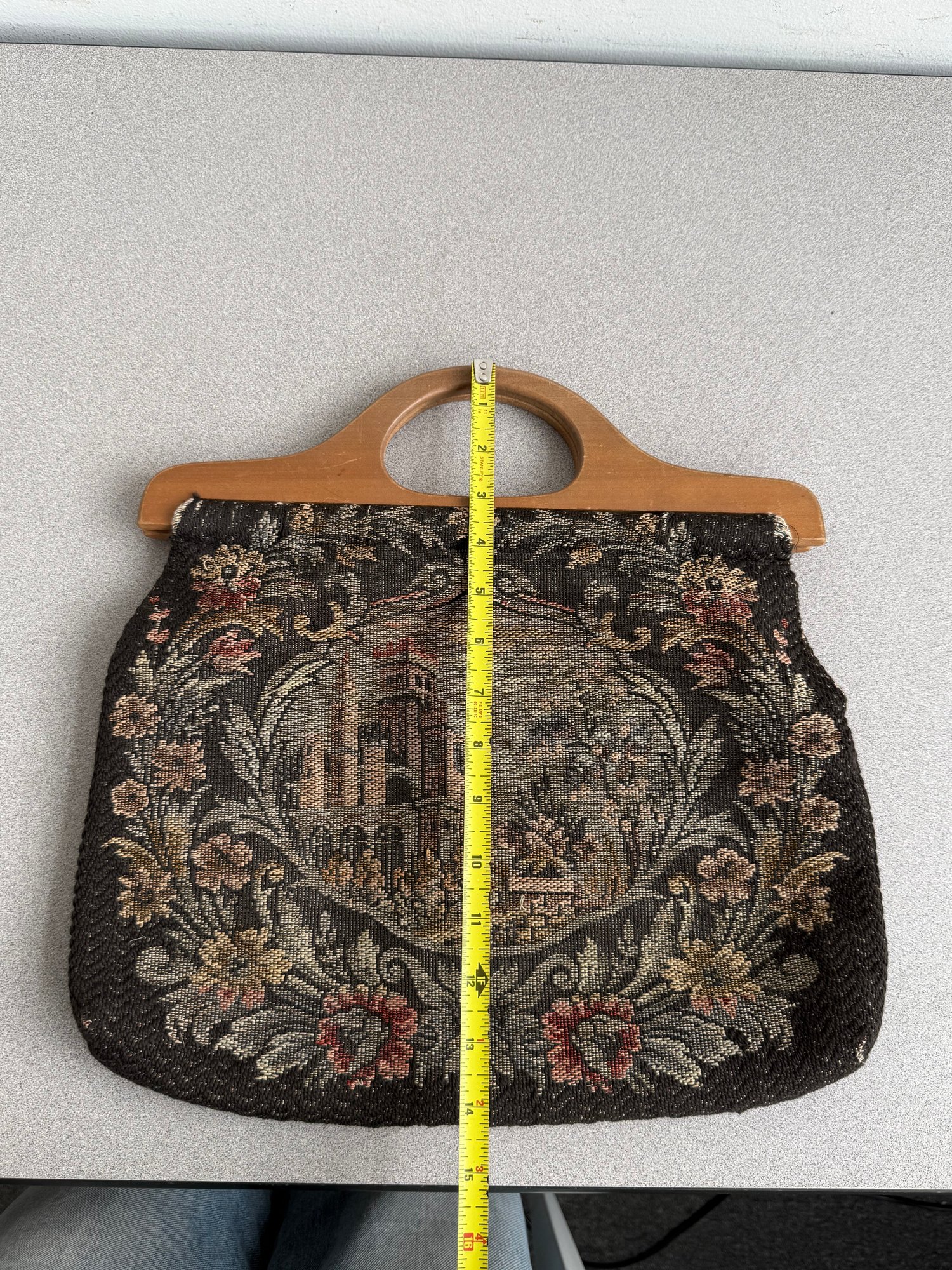A charming collection featuring two distinct examples of vintage textile craftsmanship, ideal for the discerning collector of antique accessories. This lot includes one landscape-themed tapestry bag with a wooden handle and one romantic figural petit point purse with a metal frame and chain strap. Both pieces exhibit the intricate handiwork popular in the early to mid-20th century.