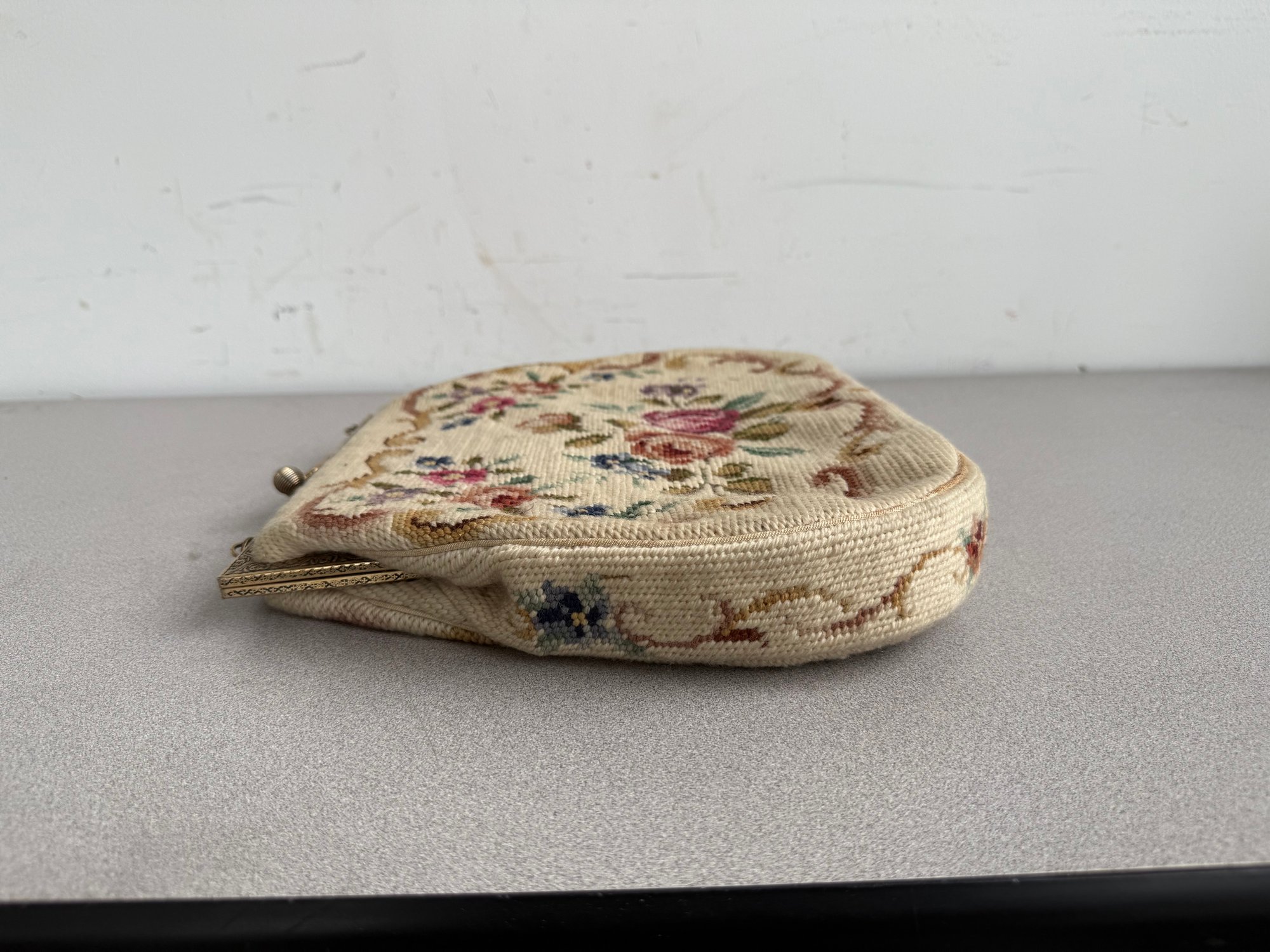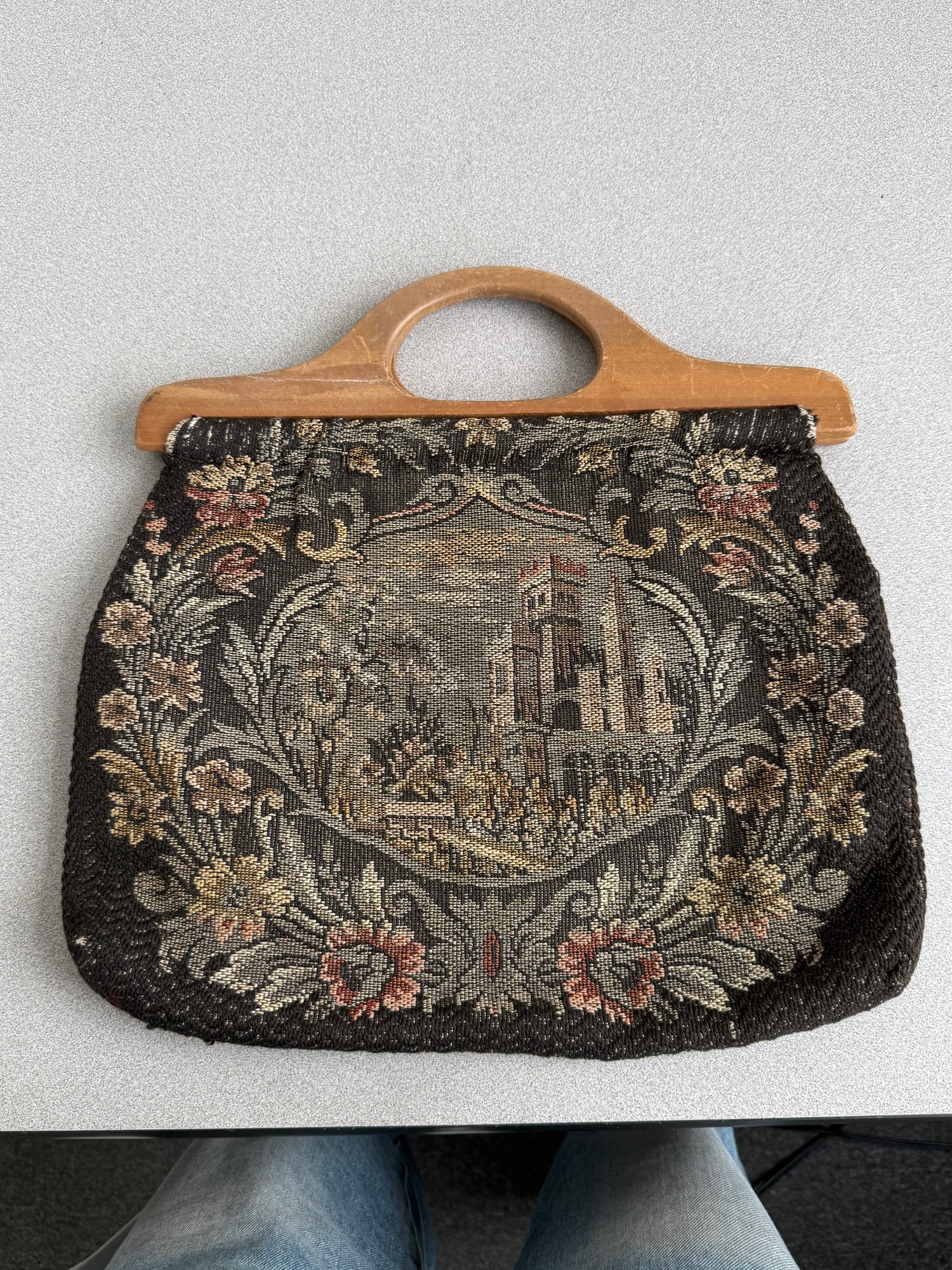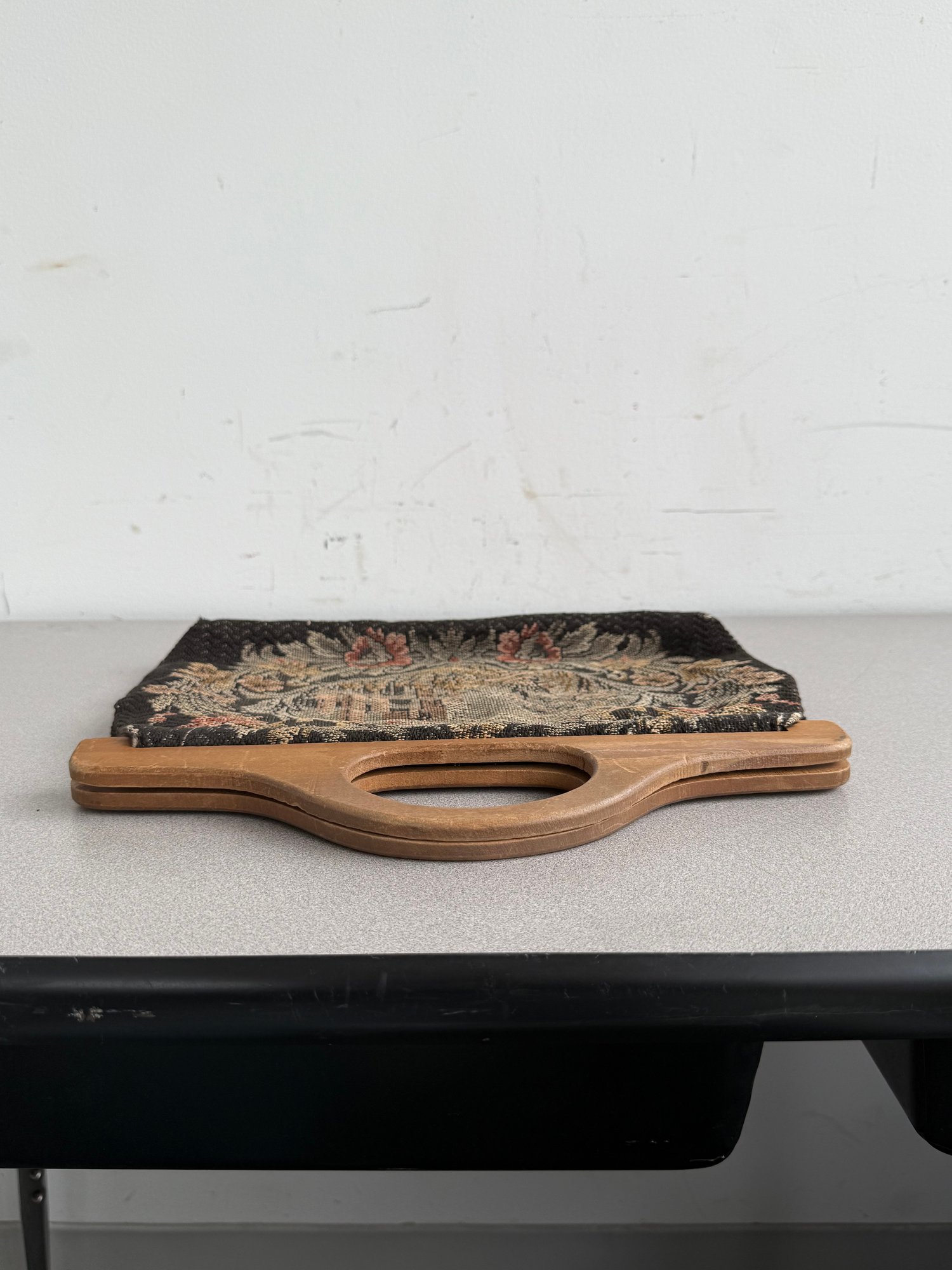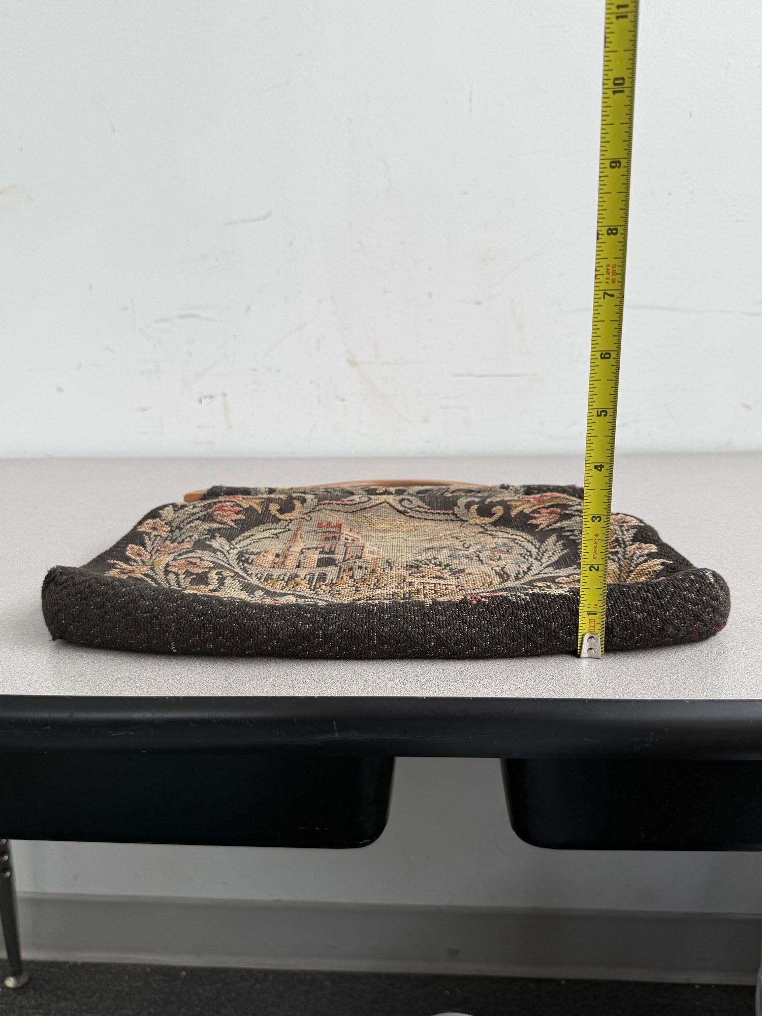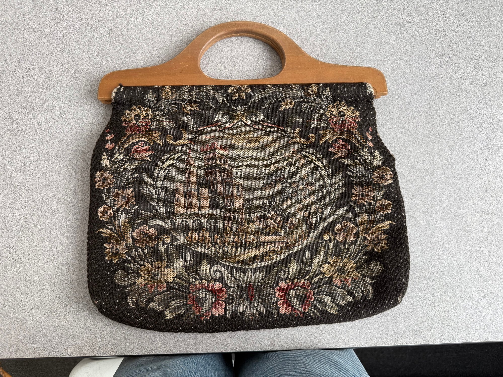A charming collection featuring two distinct examples of vintage textile craftsmanship, ideal for the discerning collector of antique accessories. This lot includes one landscape-themed tapestry bag with a wooden handle and one romantic figural petit point purse with a metal frame and chain strap. Both pieces exhibit the intricate handiwork popular in the early to mid-20th century.