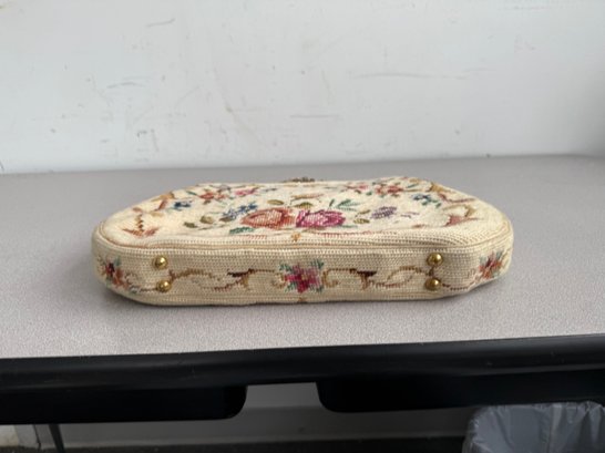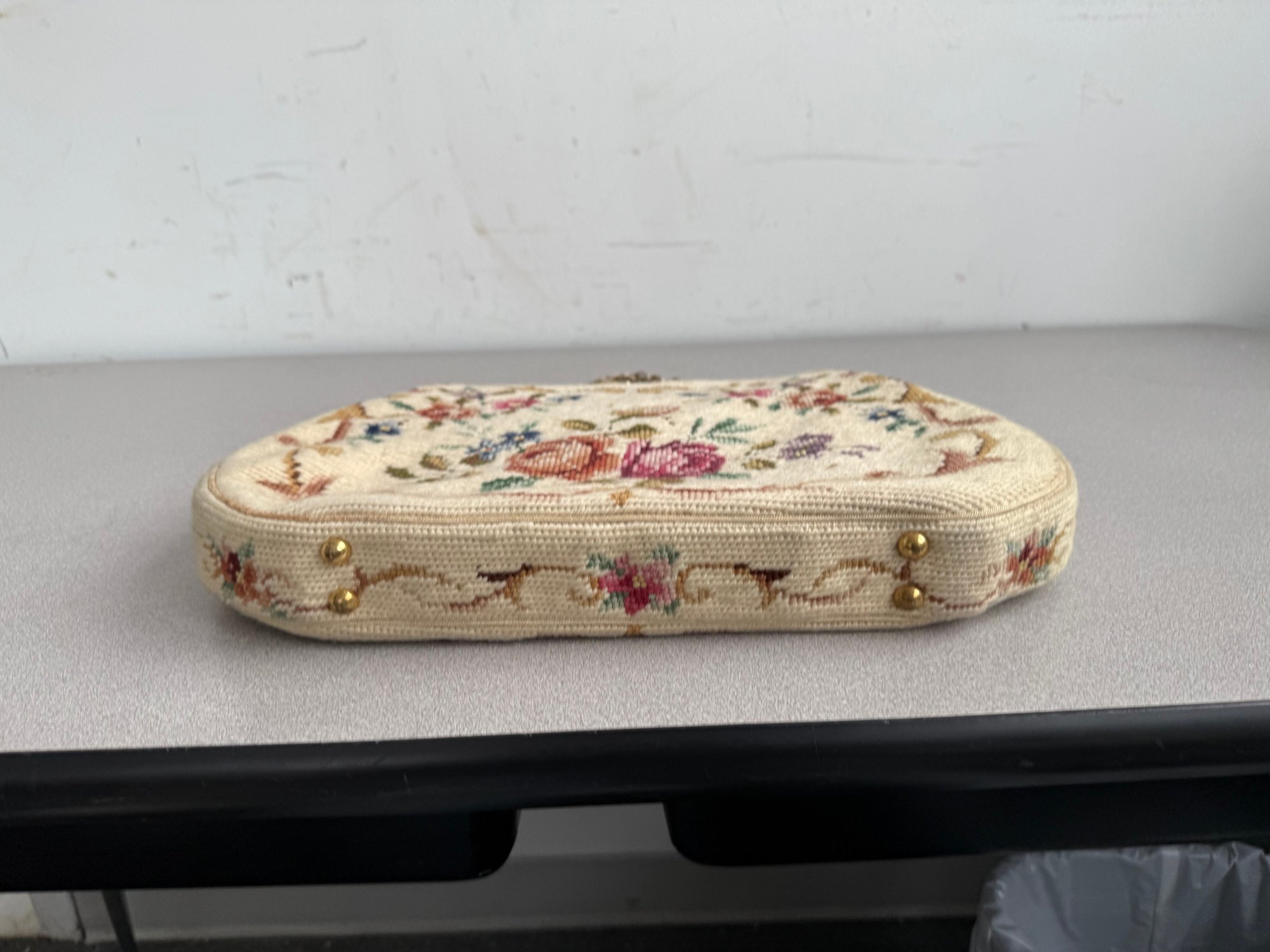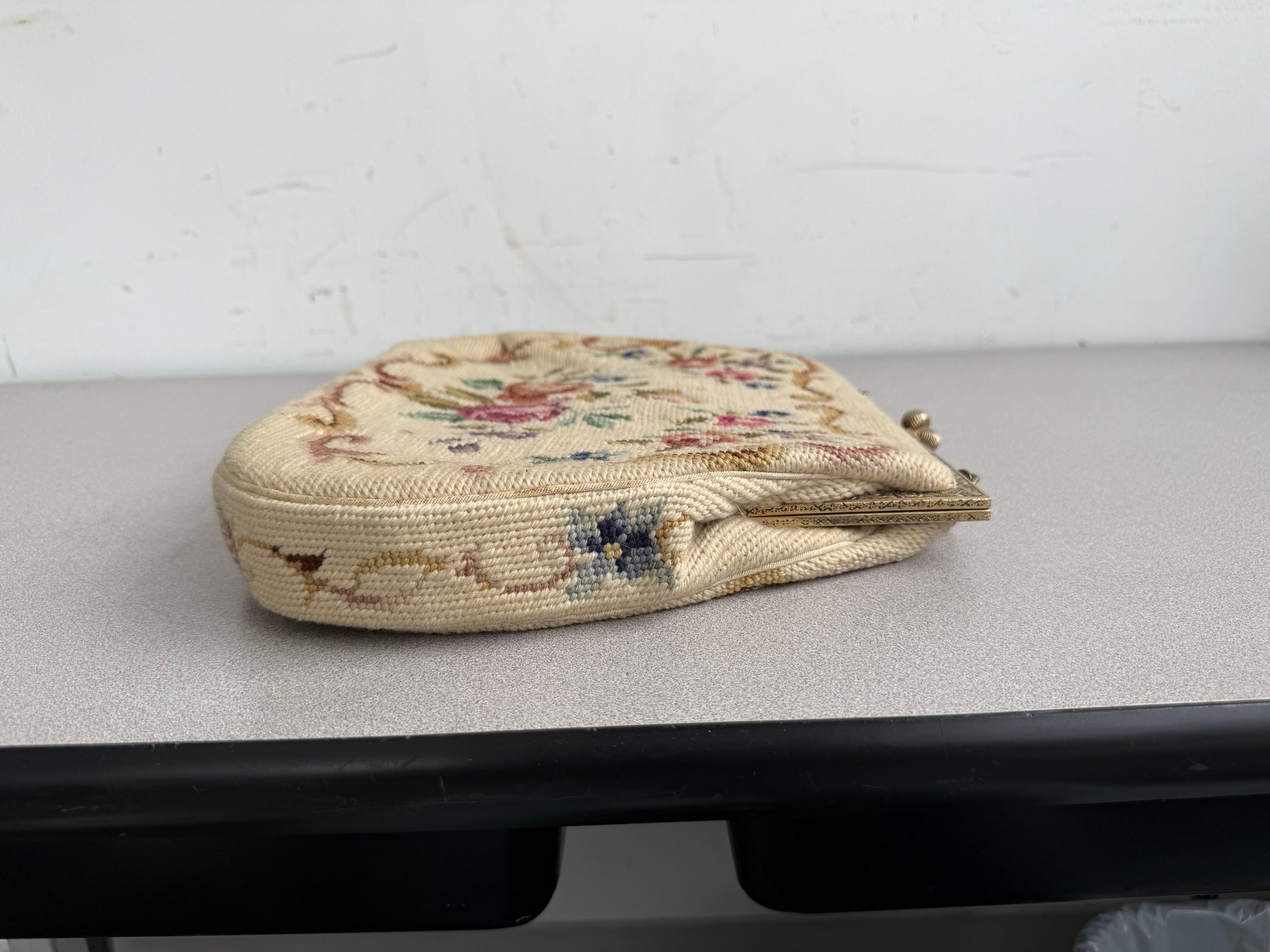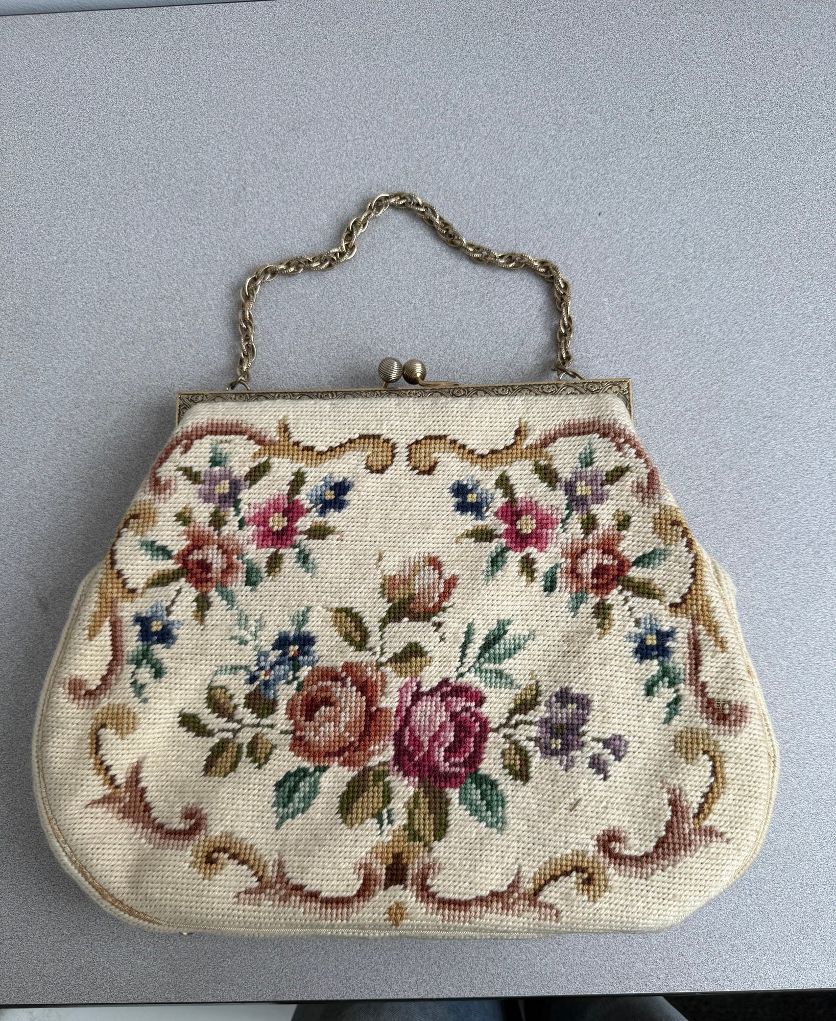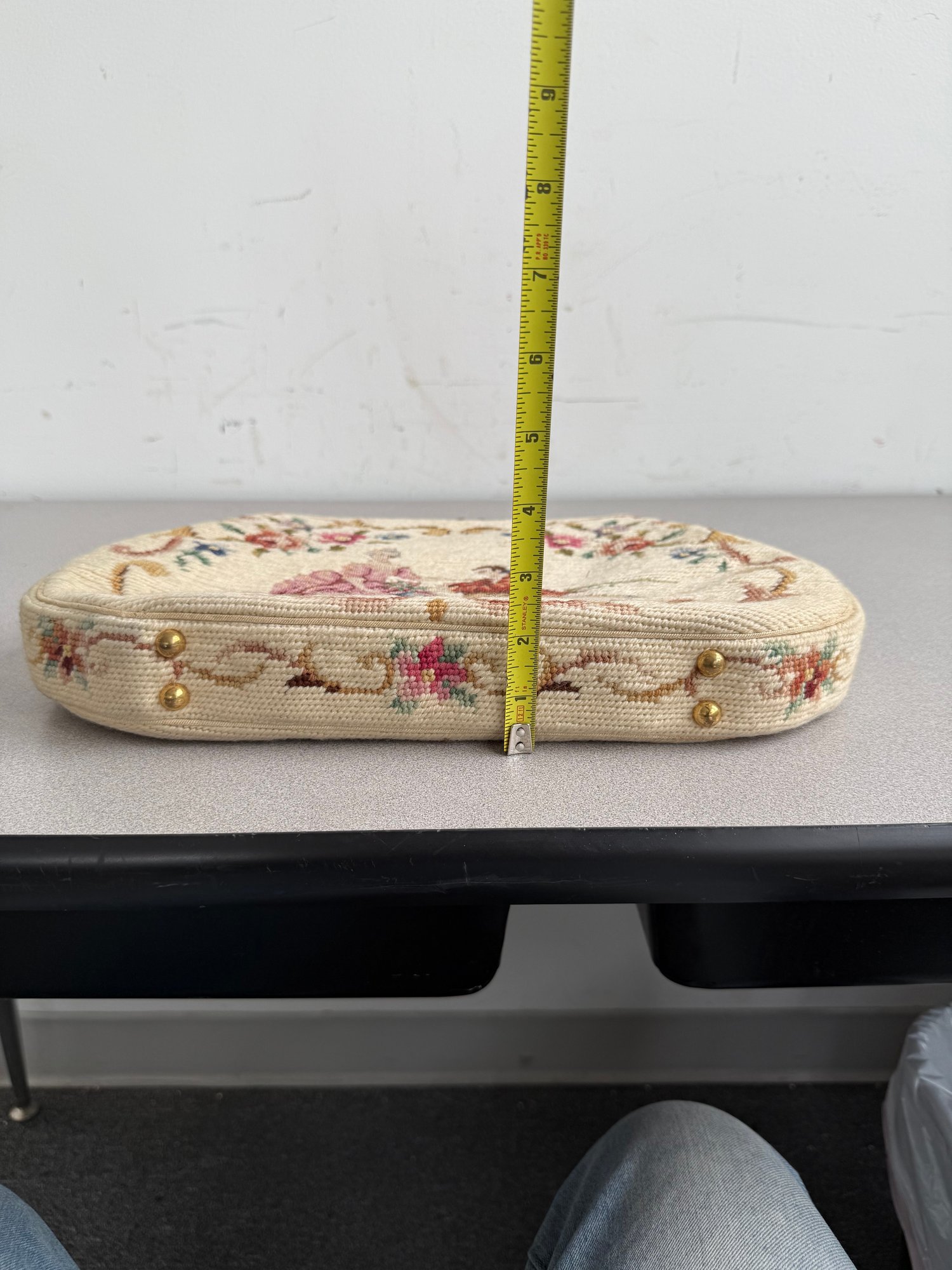 A charming collection featuring two distinct examples of vintage textile craftsmanship, ideal for the discerning collector of antique accessories. This lot includes one landscape-themed tapestry bag with a wooden handle and one romantic figural petit point purse with a metal frame and chain strap. Both pieces exhibit the intricate handiwork popular in the early to mid-20th century.