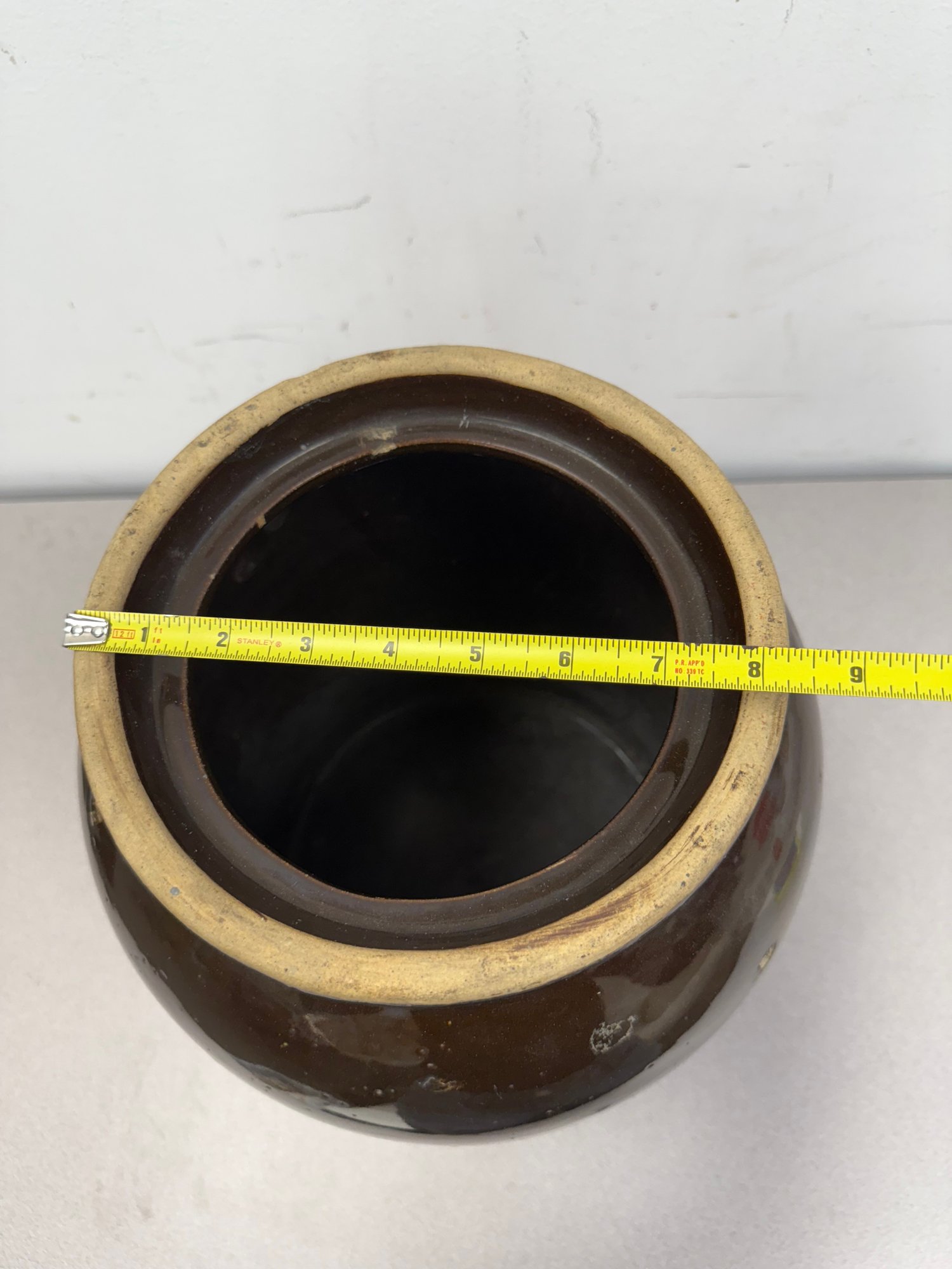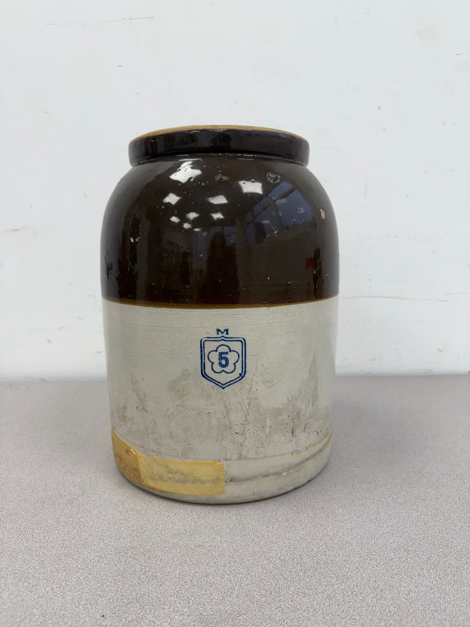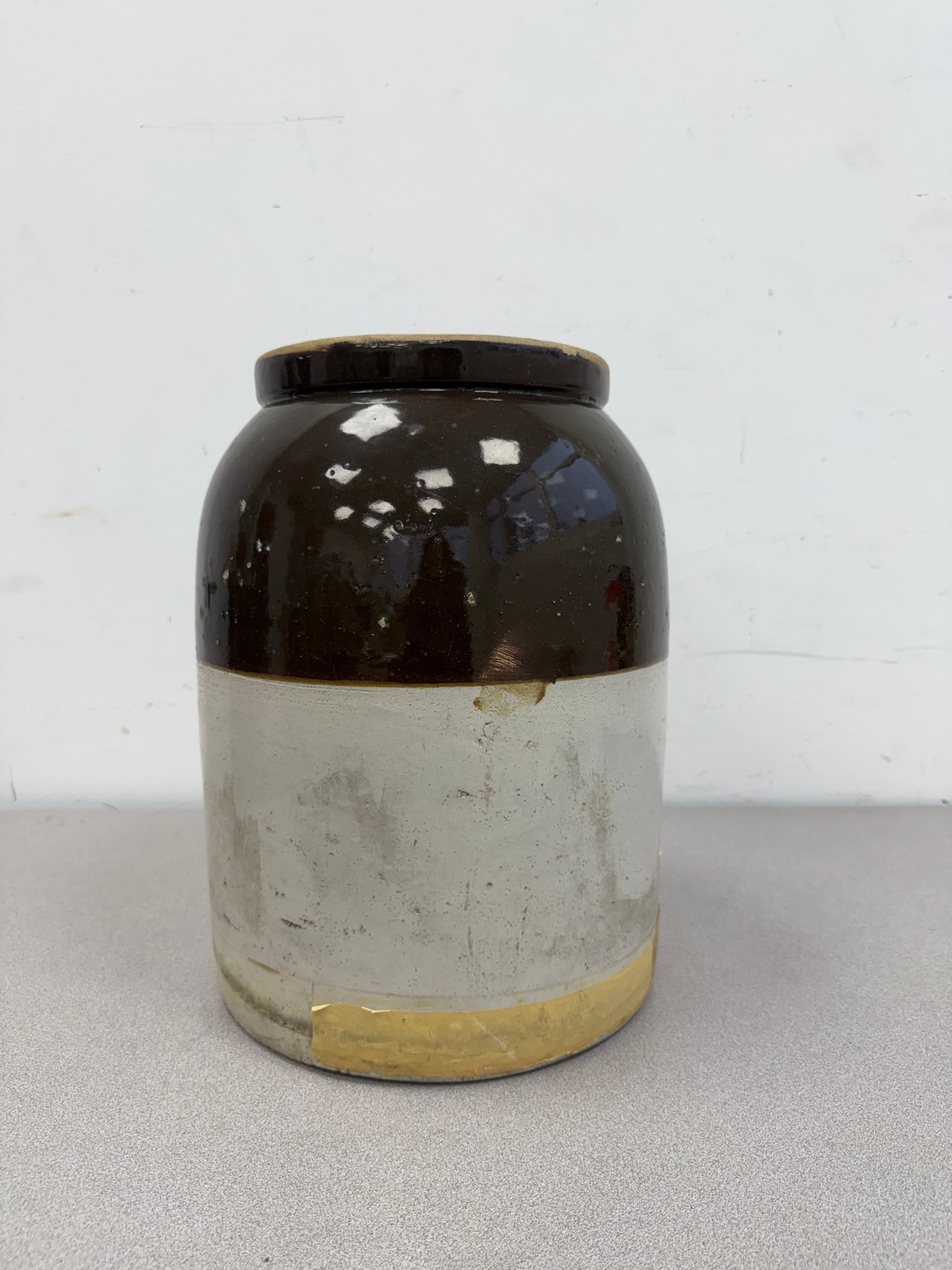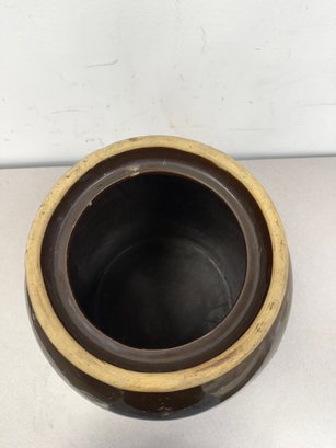 A vintage stoneware crock, featuring a classic two-tone glaze. The upper portion displays a rich, glossy Albany slip brown glaze, contrasting sharply with the natural, light-colored, utilitarian base. This piece is highly collectible and was likely manufactured prior to the widespread use of modern refrigeration.