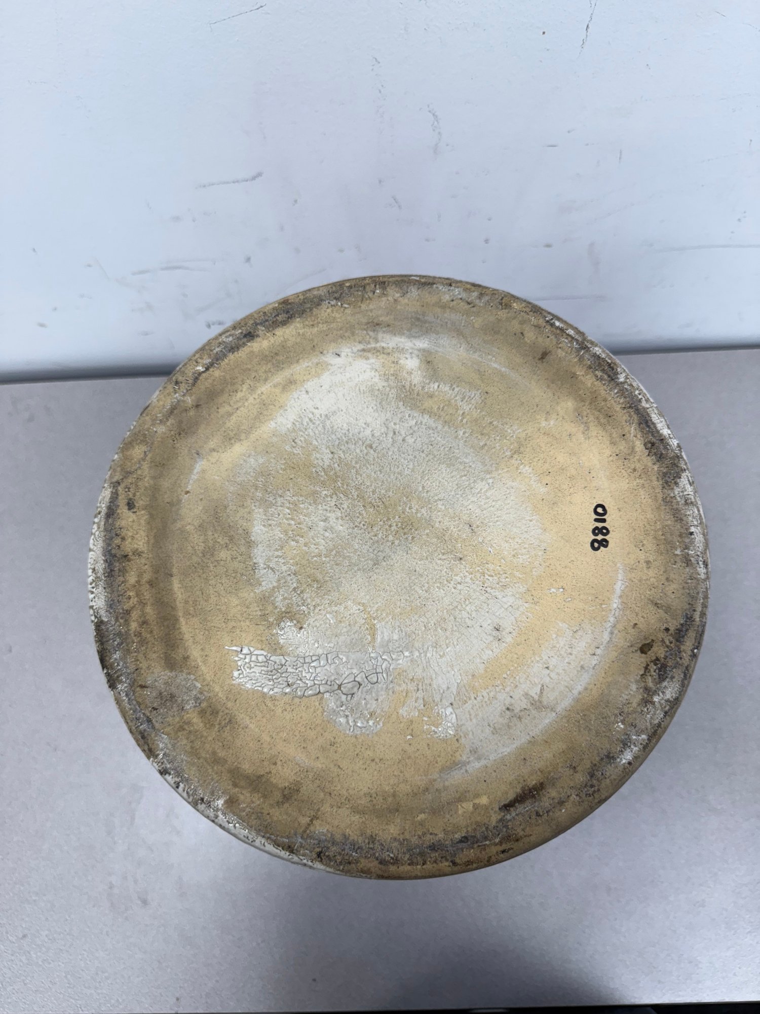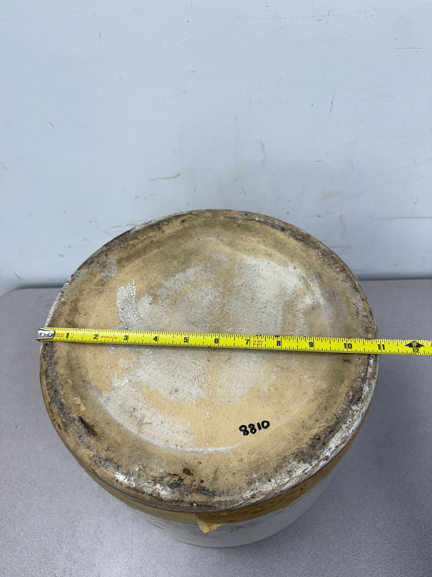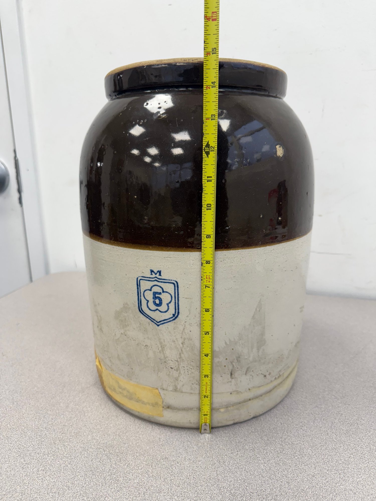 A vintage stoneware crock, featuring a classic two-tone glaze. The upper portion displays a rich, glossy Albany slip brown glaze, contrasting sharply with the natural, light-colored, utilitarian base. This piece is highly collectible and was likely manufactured prior to the widespread use of modern refrigeration.