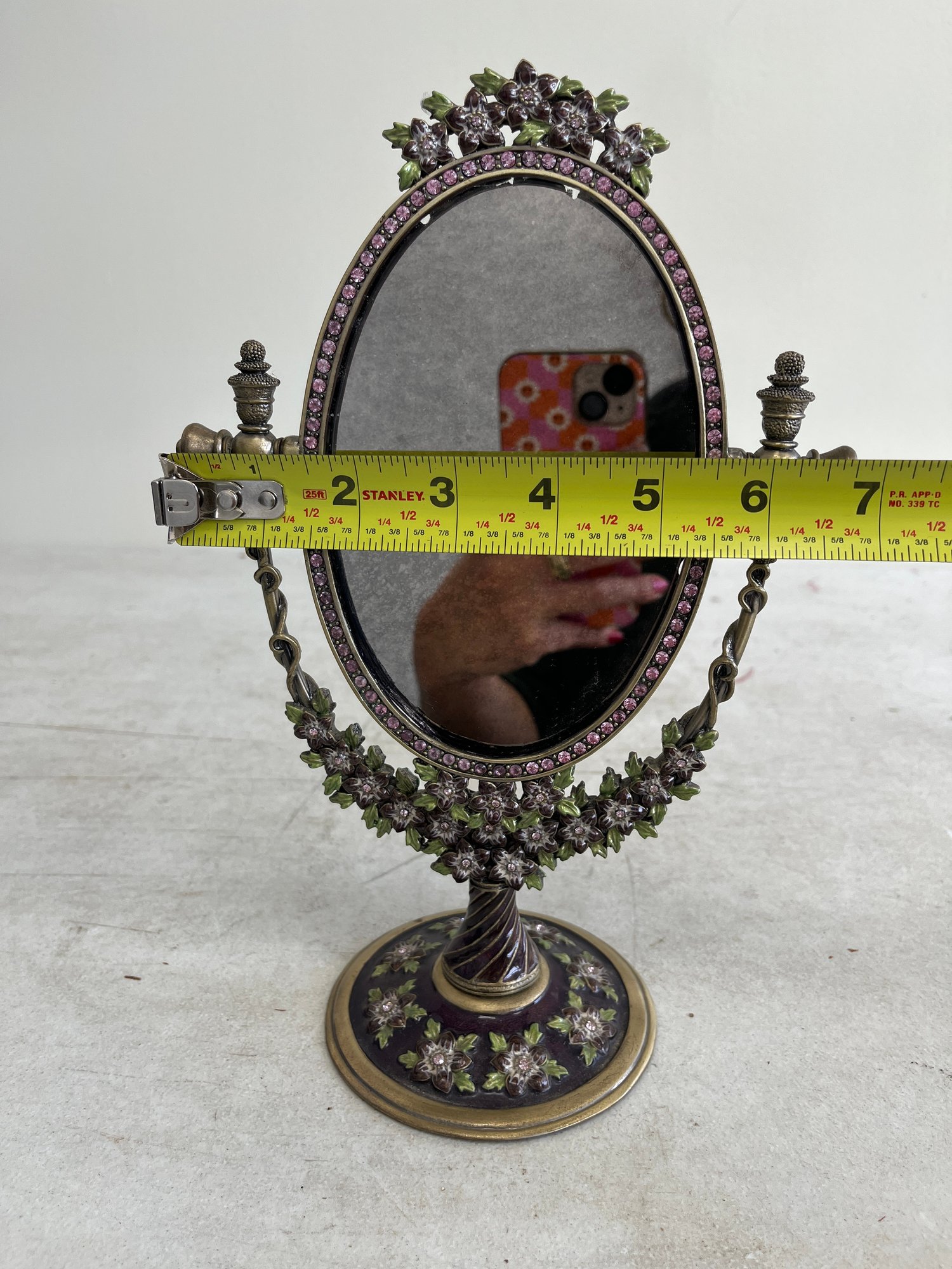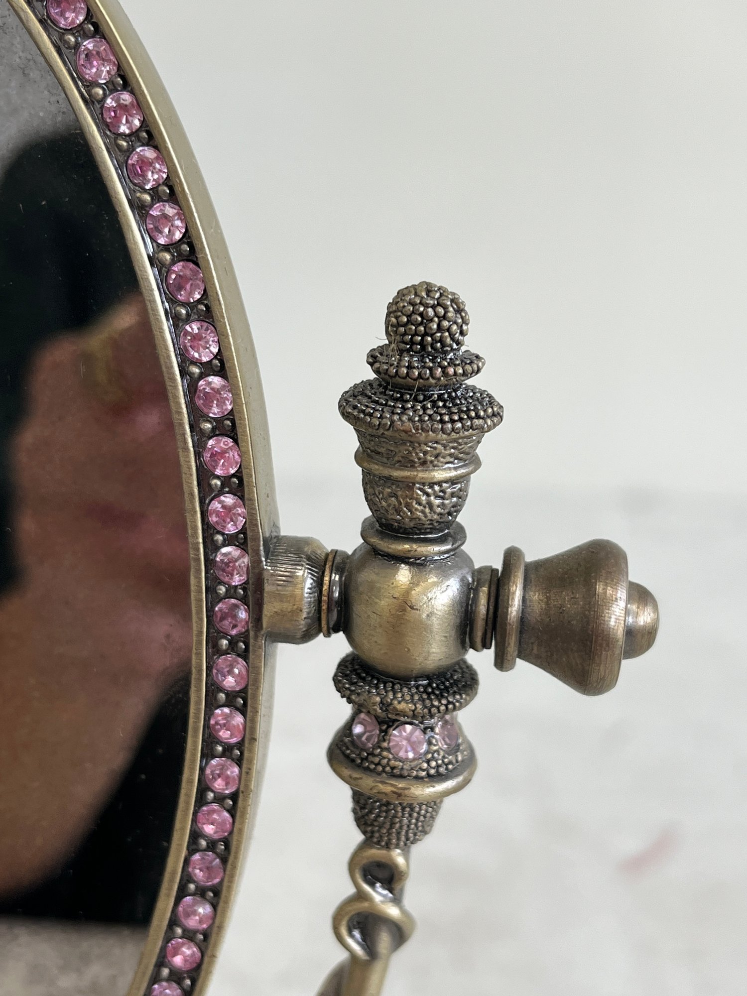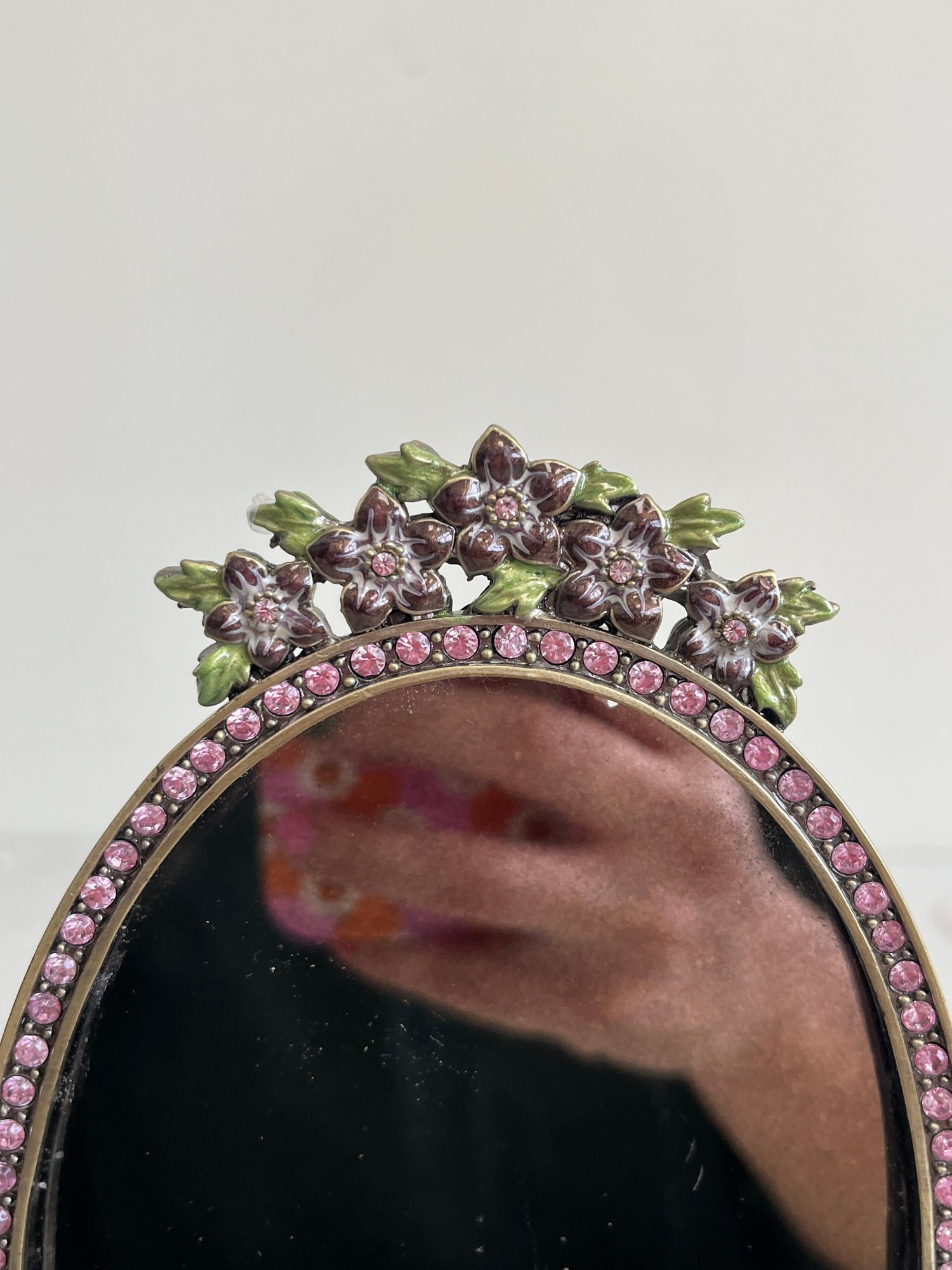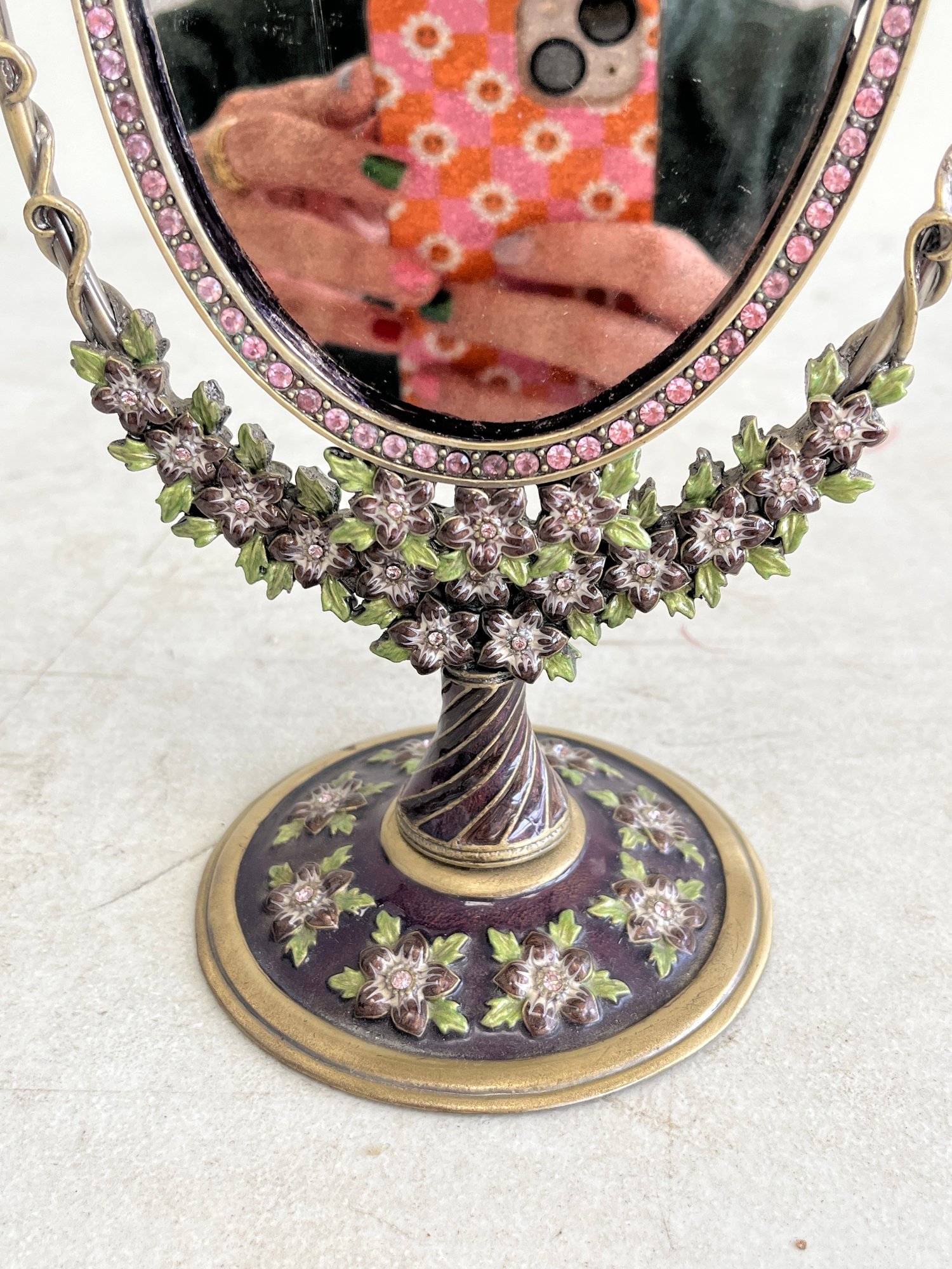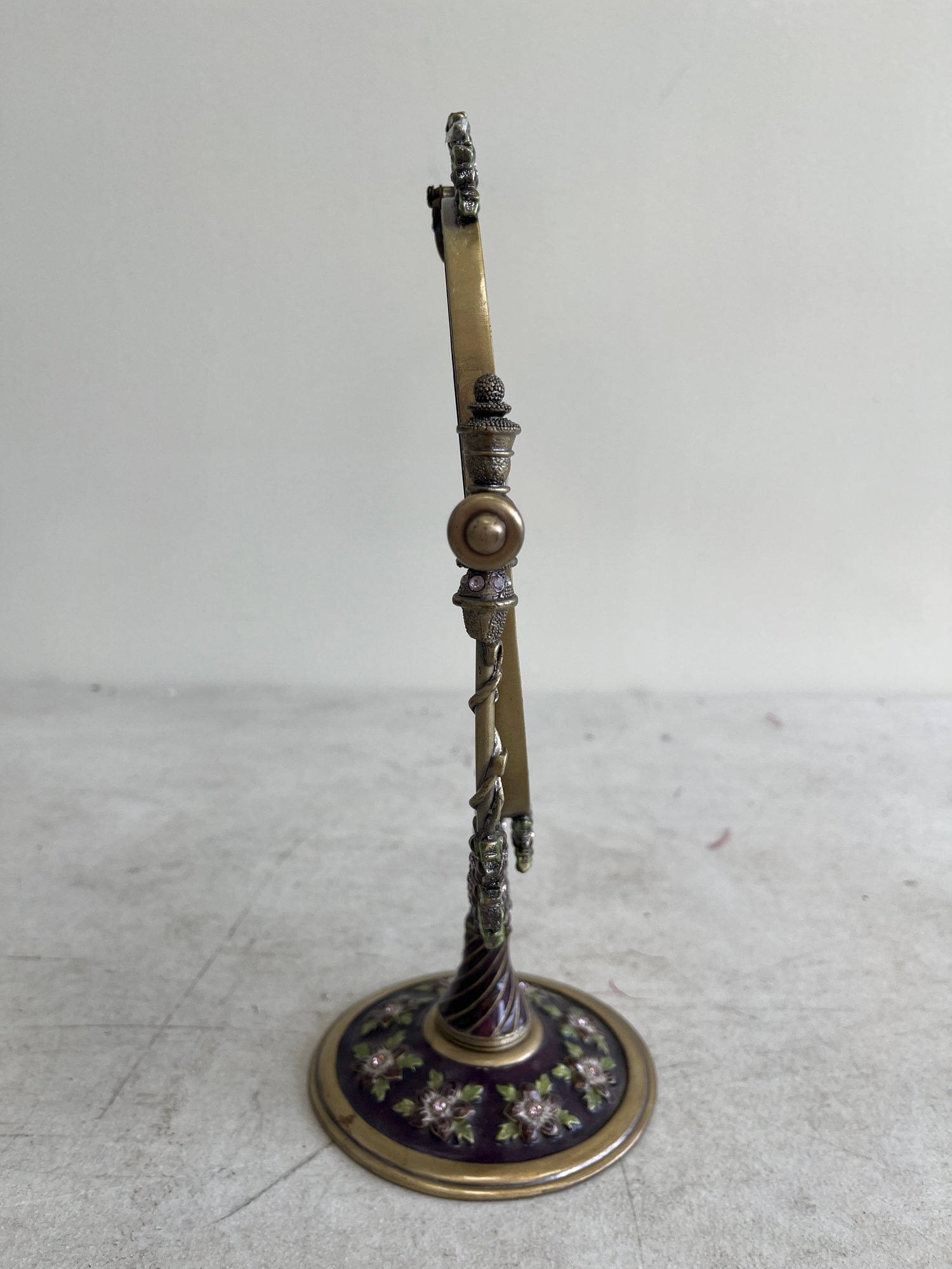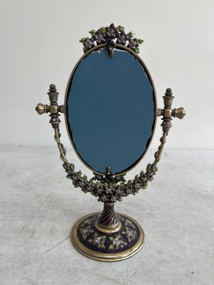 This piece offers a classic, decorative appeal, drawing inspiration from Art Nouveau or Victorian design aesthetics. It often complements vintage-themed decor in bedrooms, bathrooms, or dressing rooms. The mirror features an oval shape suspended in a sturdy metal frame, allowing it to swivel for adjustable viewing angles. The frame and base are intricately adorned with embossed floral patterns, painted in vibrant pink and green enamel and set with clear, inlaid crystals.
