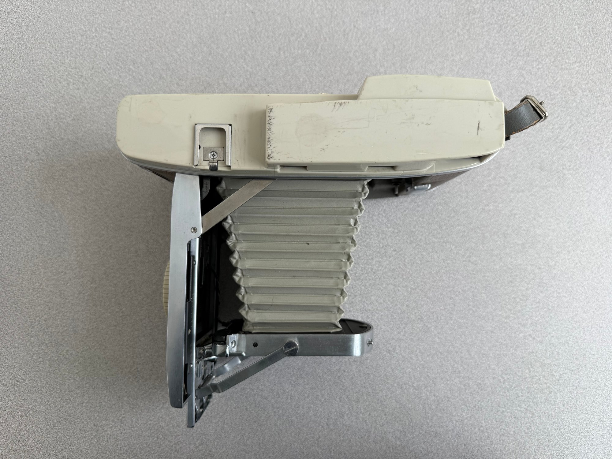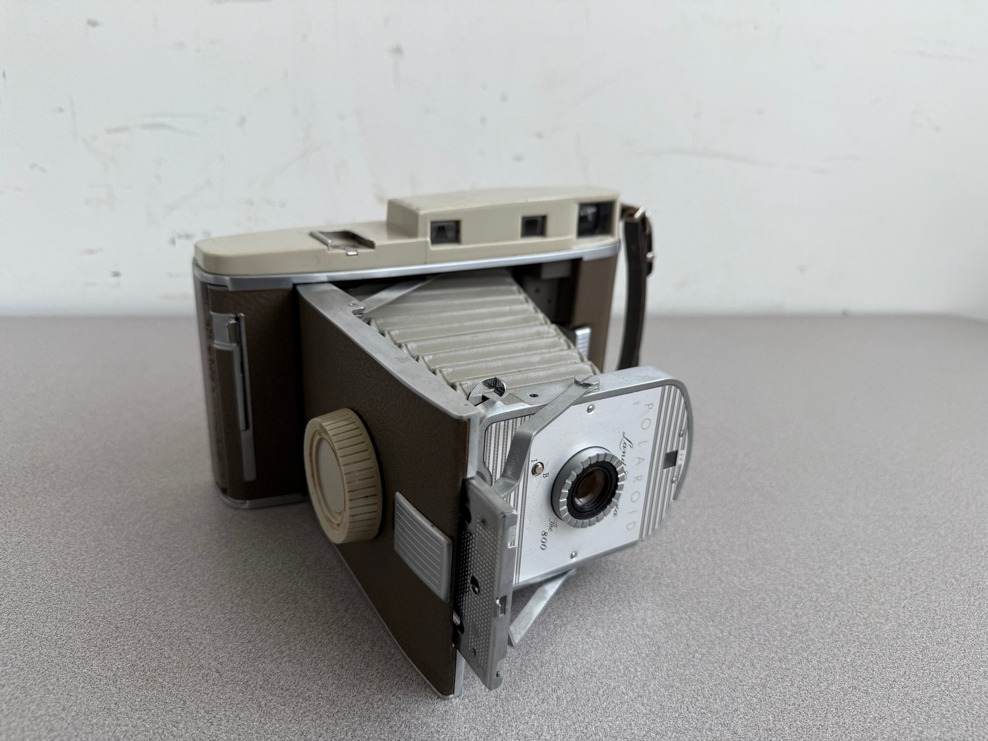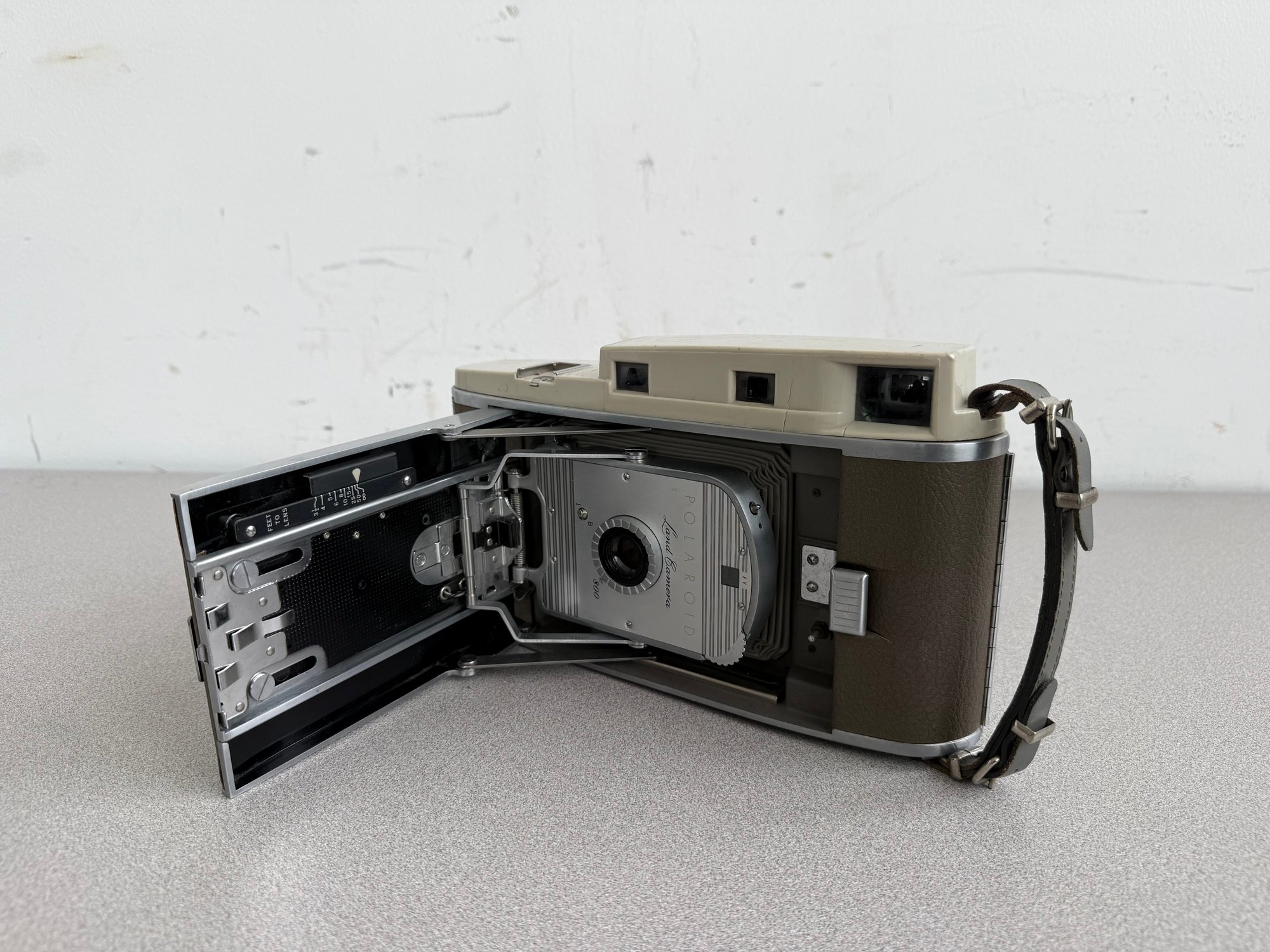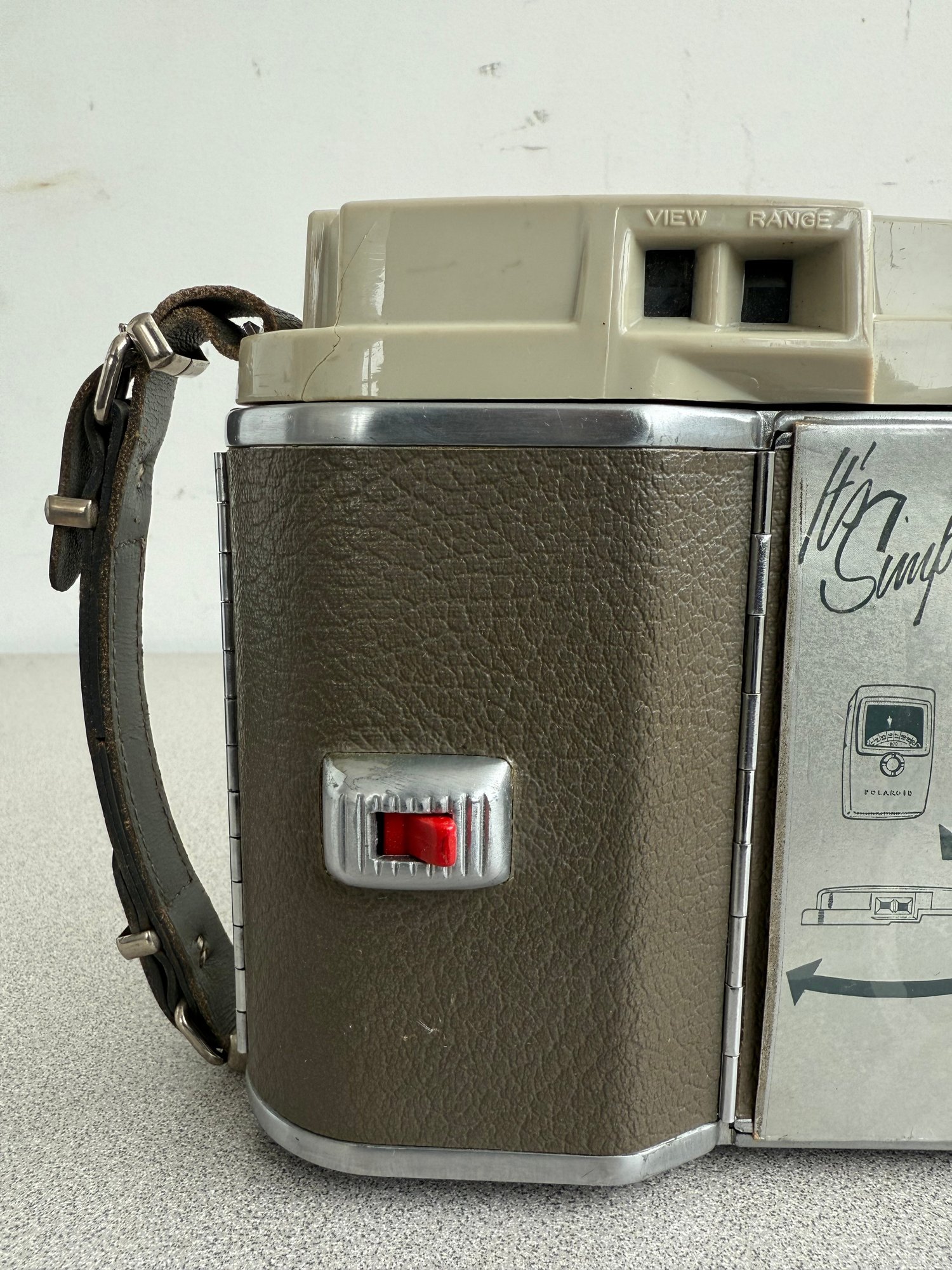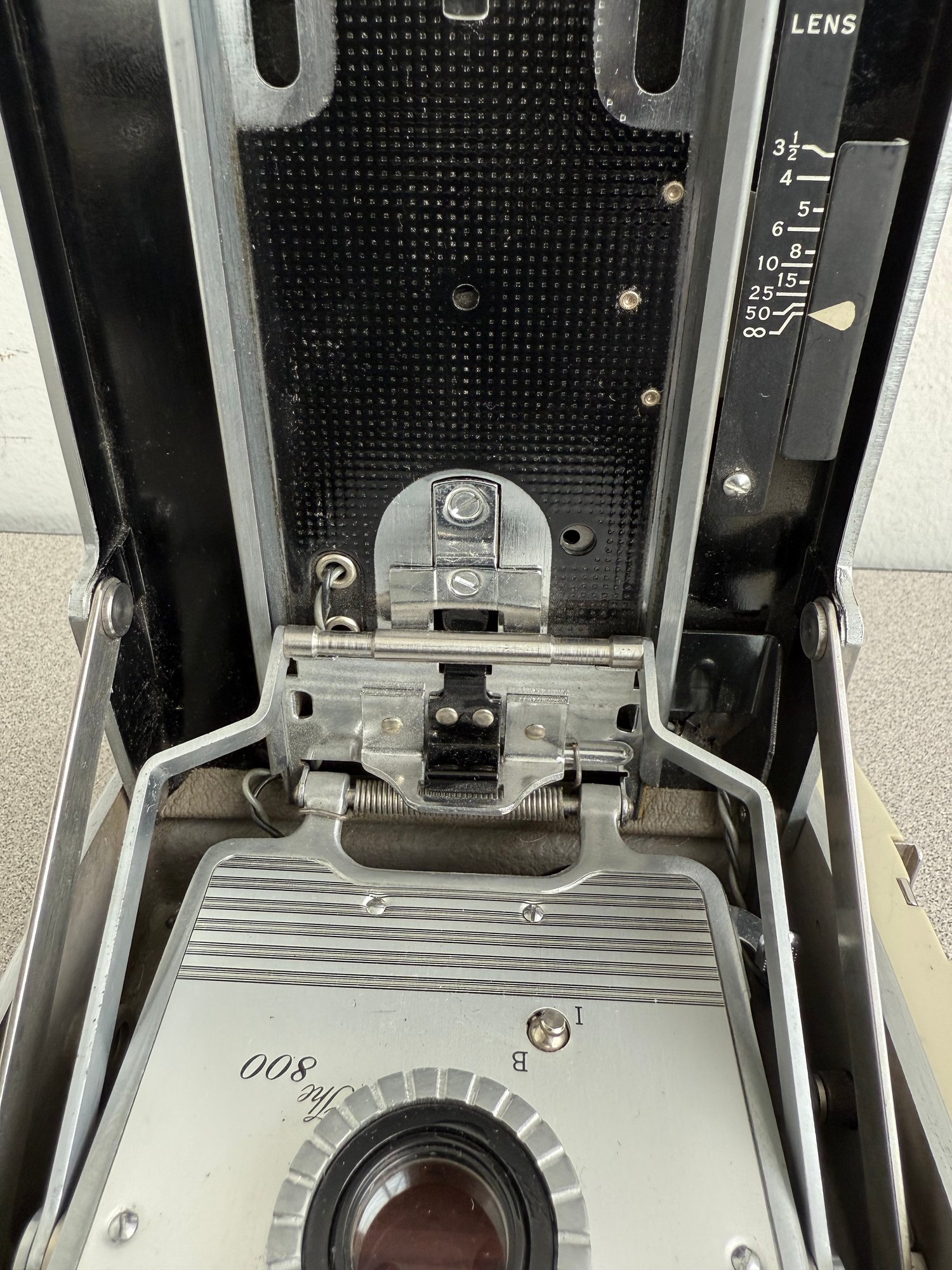 The Model 800 represents the pinnacle of mid-century innovation. Known for its robust construction and sophisticated gray-and-chrome aesthetic, this folding bellows camera was the "high-tech" essential of its era, allowing photographers to develop photos in seconds without a darkroom. This folding bellows camera features a sophisticated gray and chrome industrial design, a coupled rangefinder for precision focusing, and a durable die-cast aluminum body with a leather hand strap.