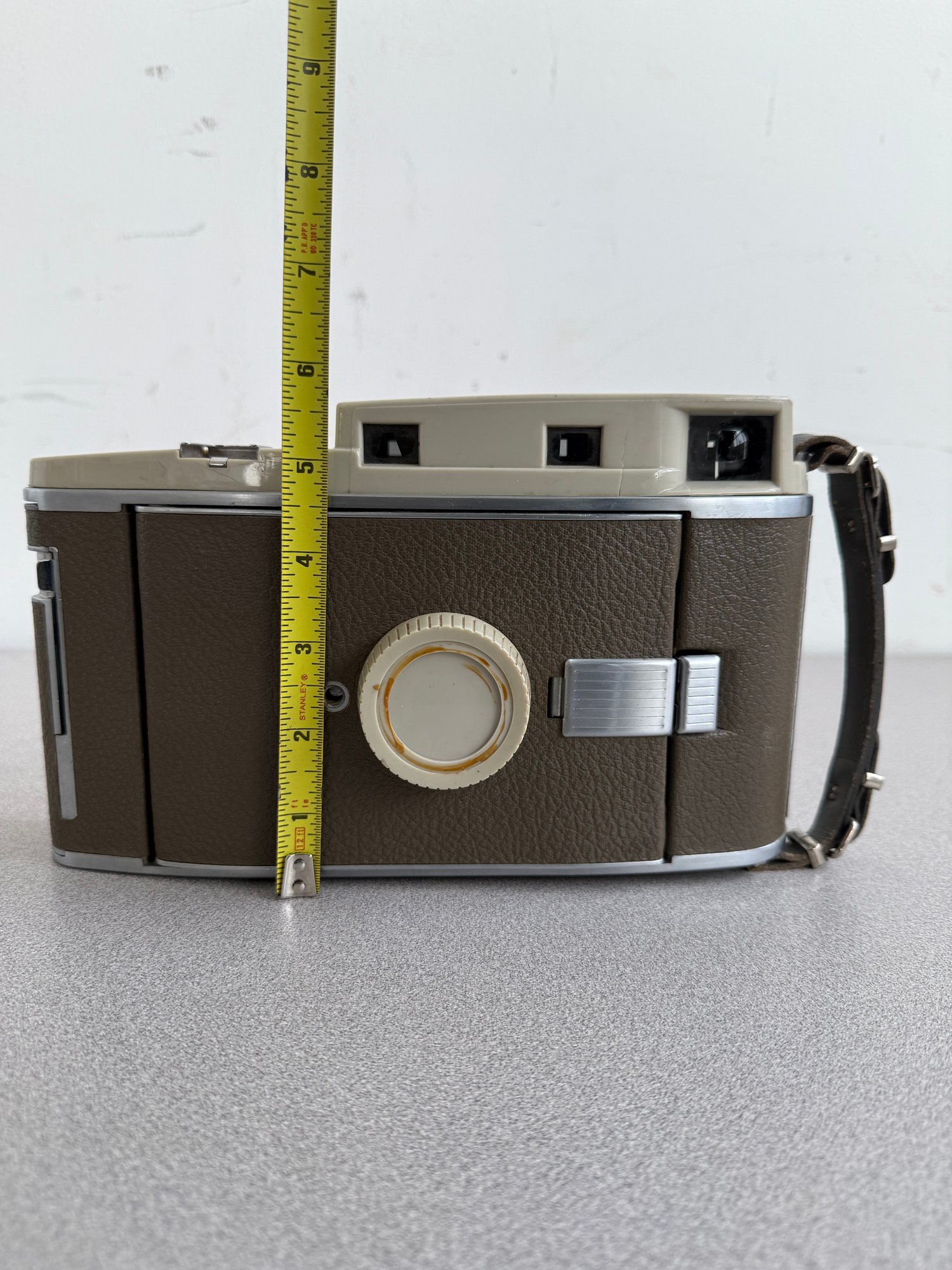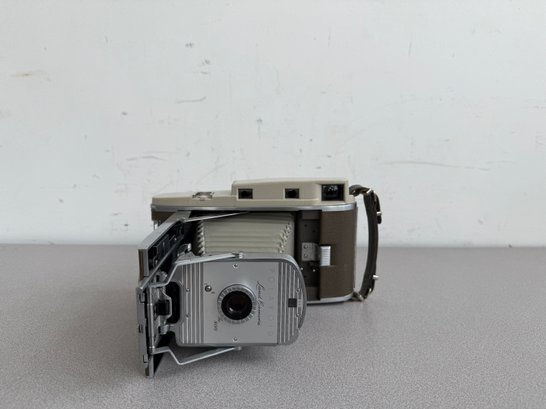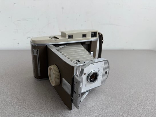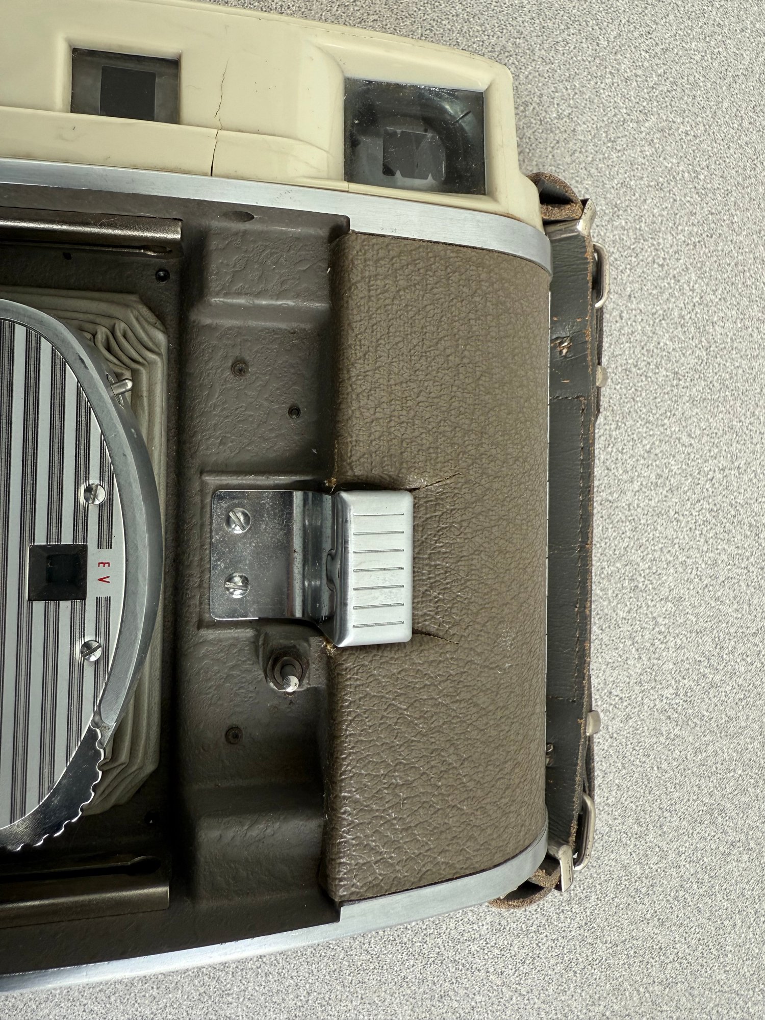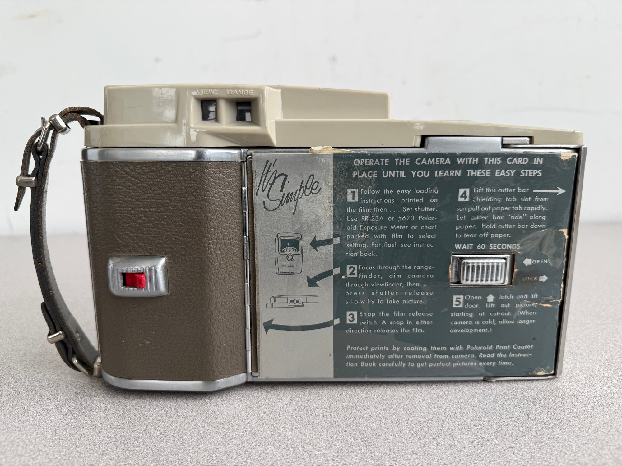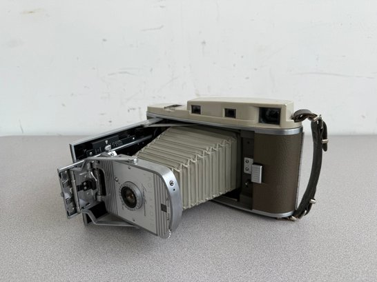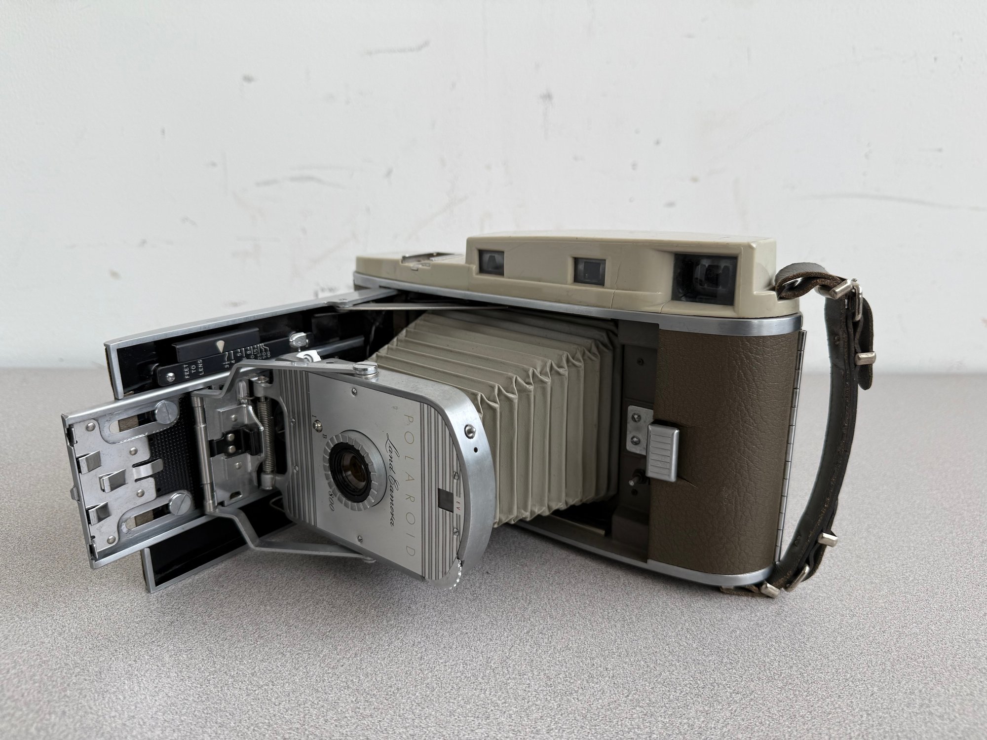The Model 800 represents the pinnacle of mid-century innovation. Known for its robust construction and sophisticated gray-and-chrome aesthetic, this folding bellows camera was the "high-tech" essential of its era, allowing photographers to develop photos in seconds without a darkroom. This folding bellows camera features a sophisticated gray and chrome industrial design, a coupled rangefinder for precision focusing, and a durable die-cast aluminum body with a leather hand strap.