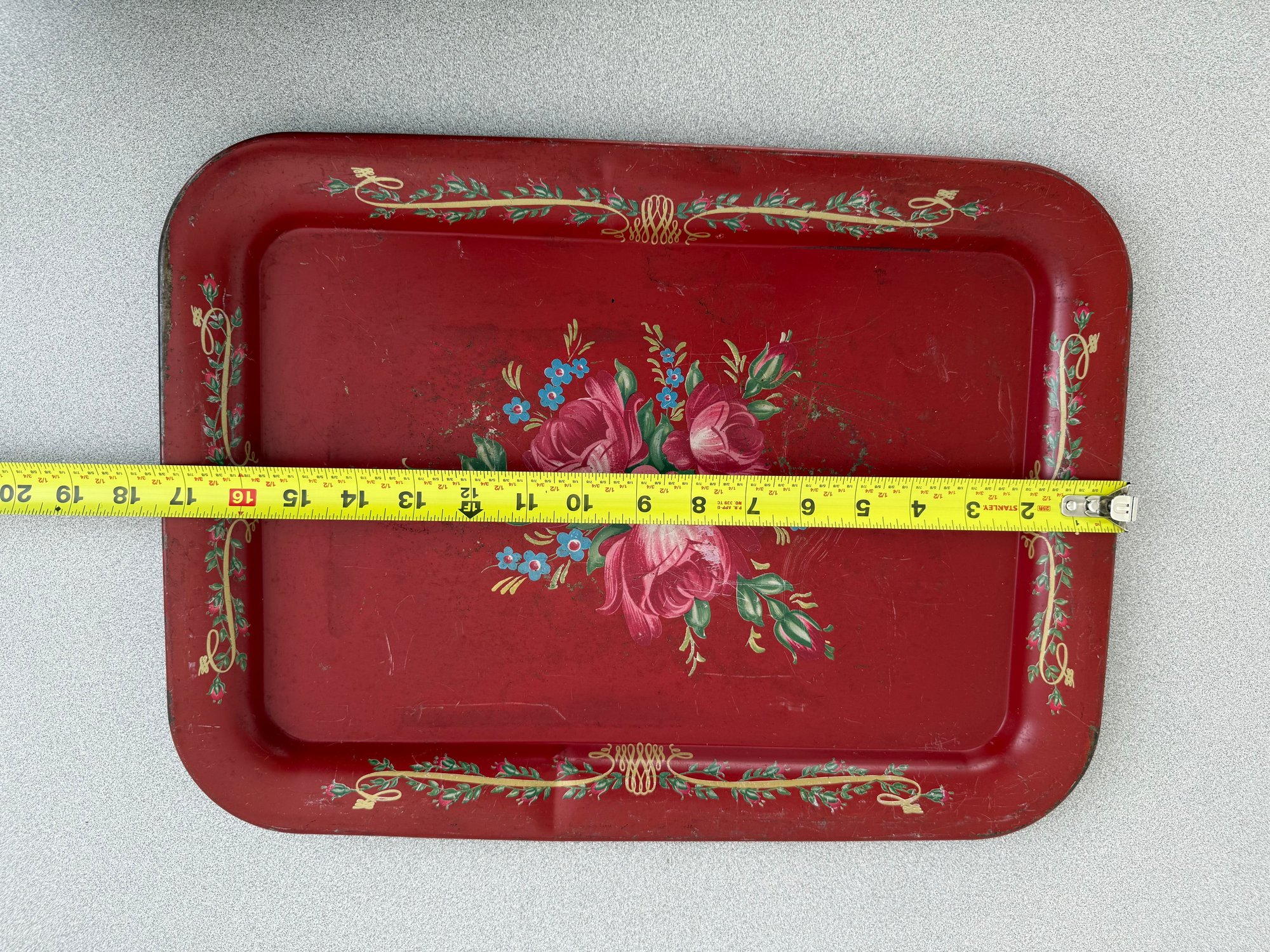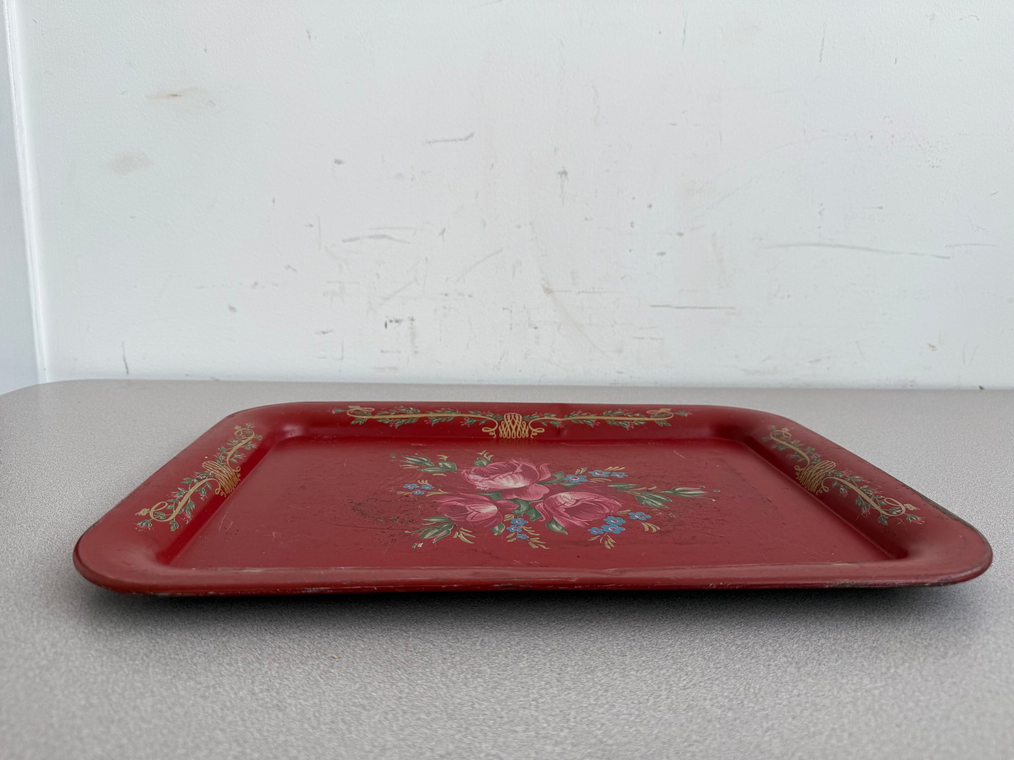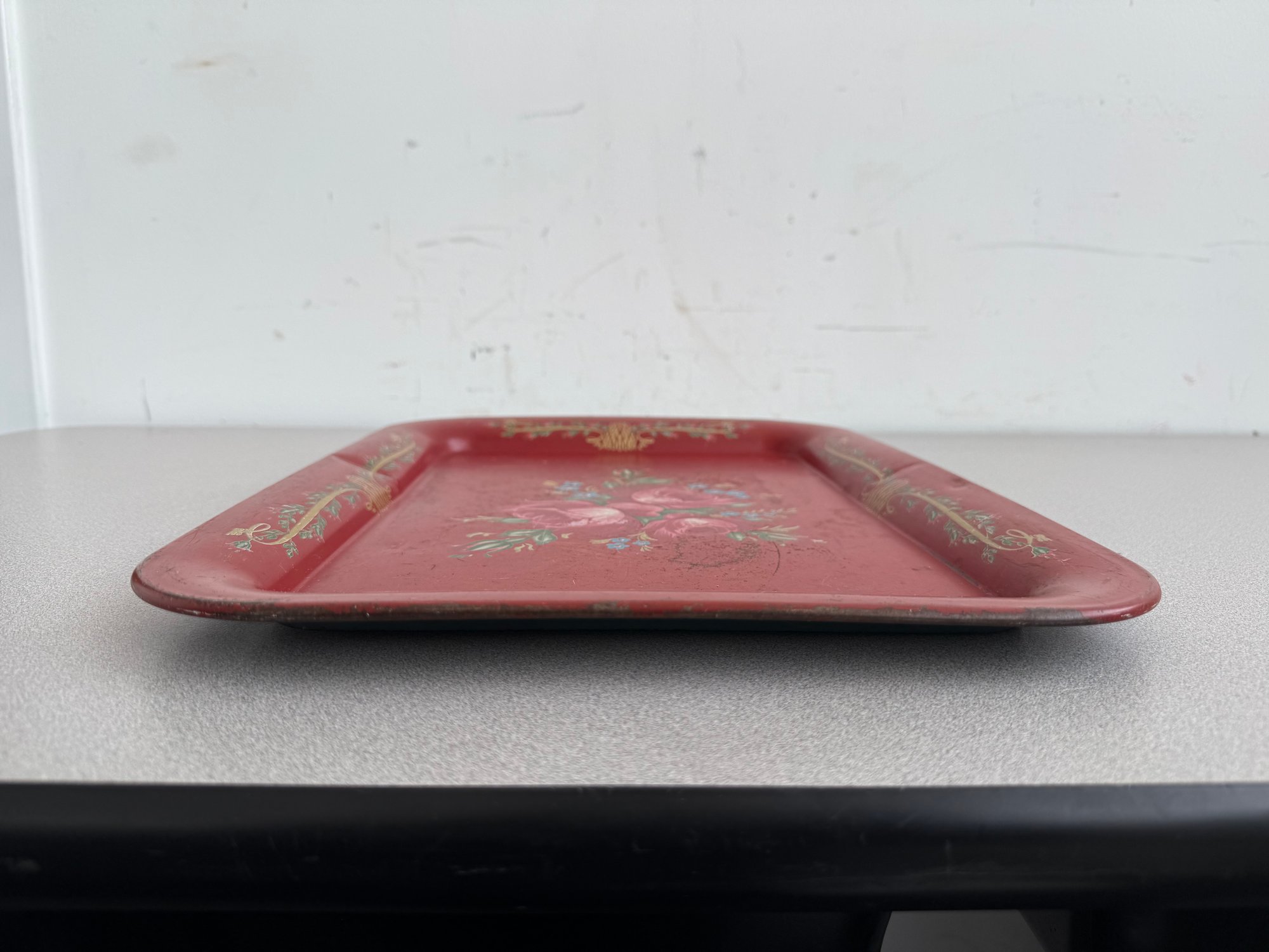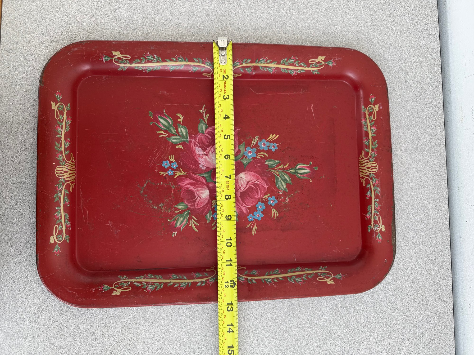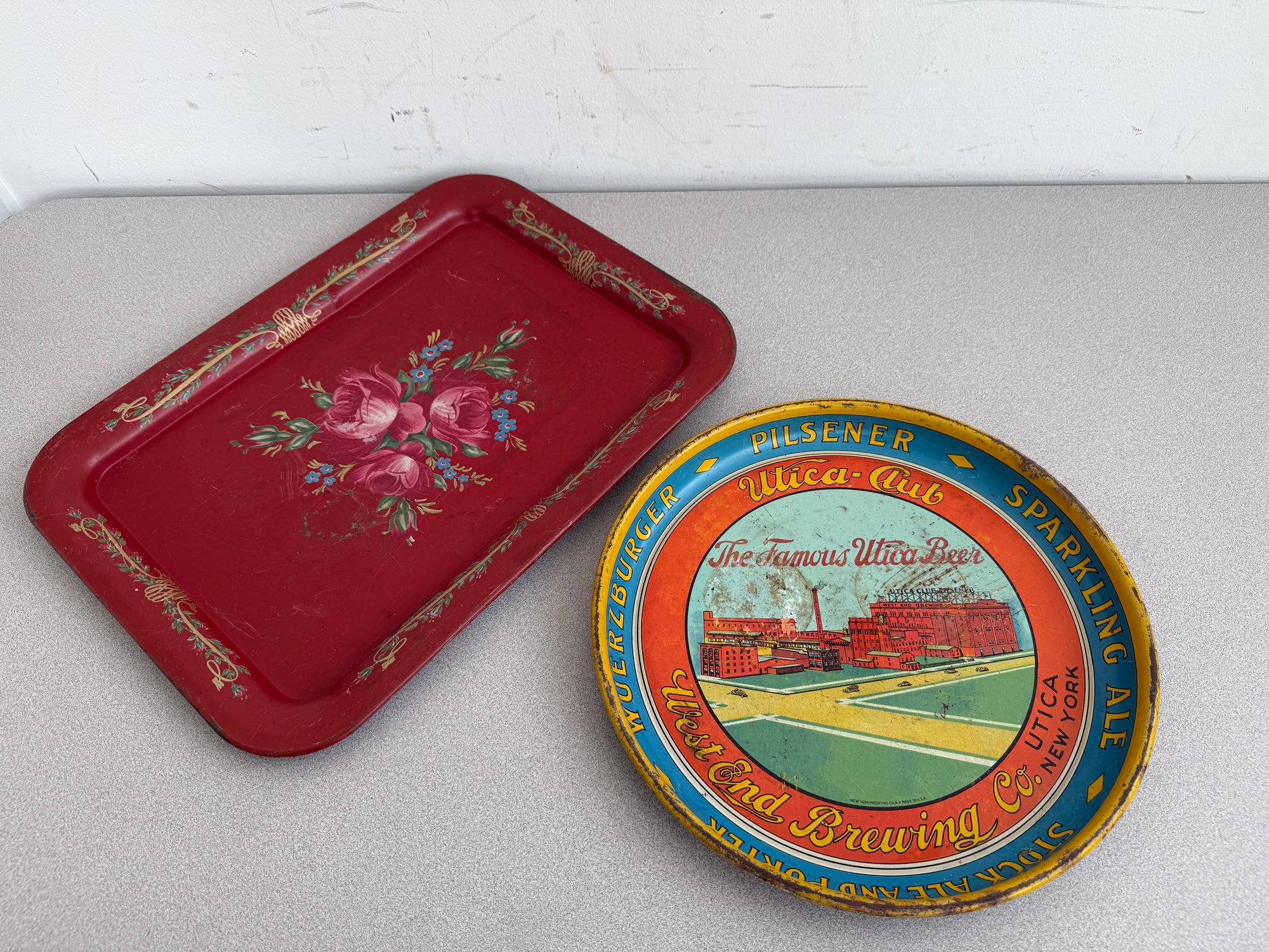 This unique lot features two distinct examples of vintage metalware: one decorative tole serving tray and one historical brewery advertising tray. Both pieces offer functional charm and collectible appeal.