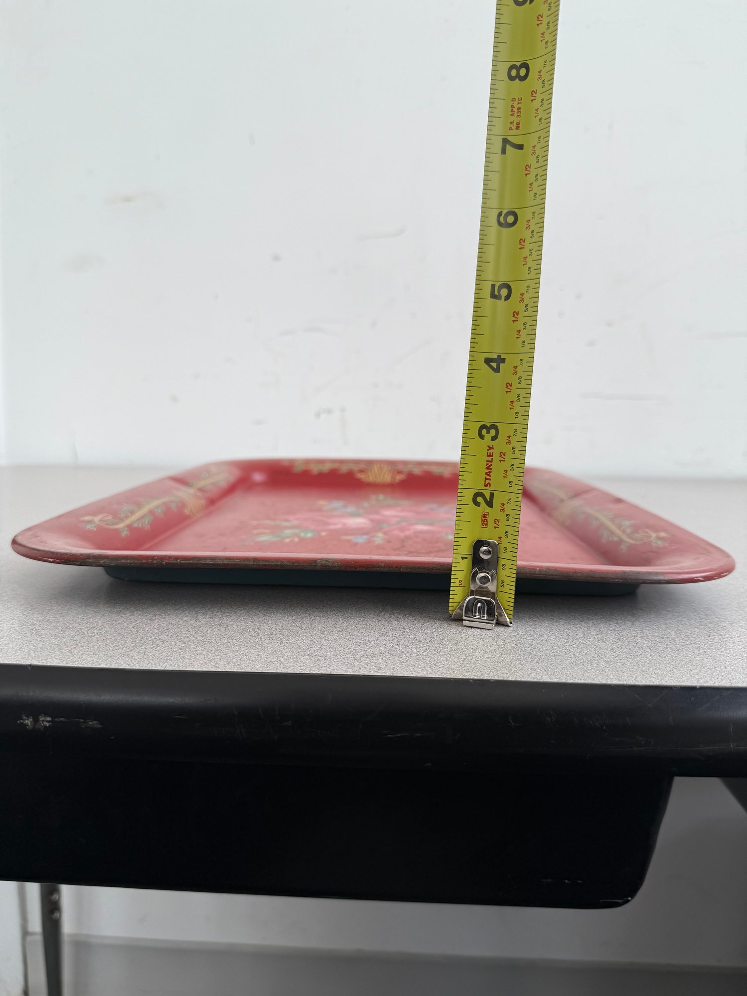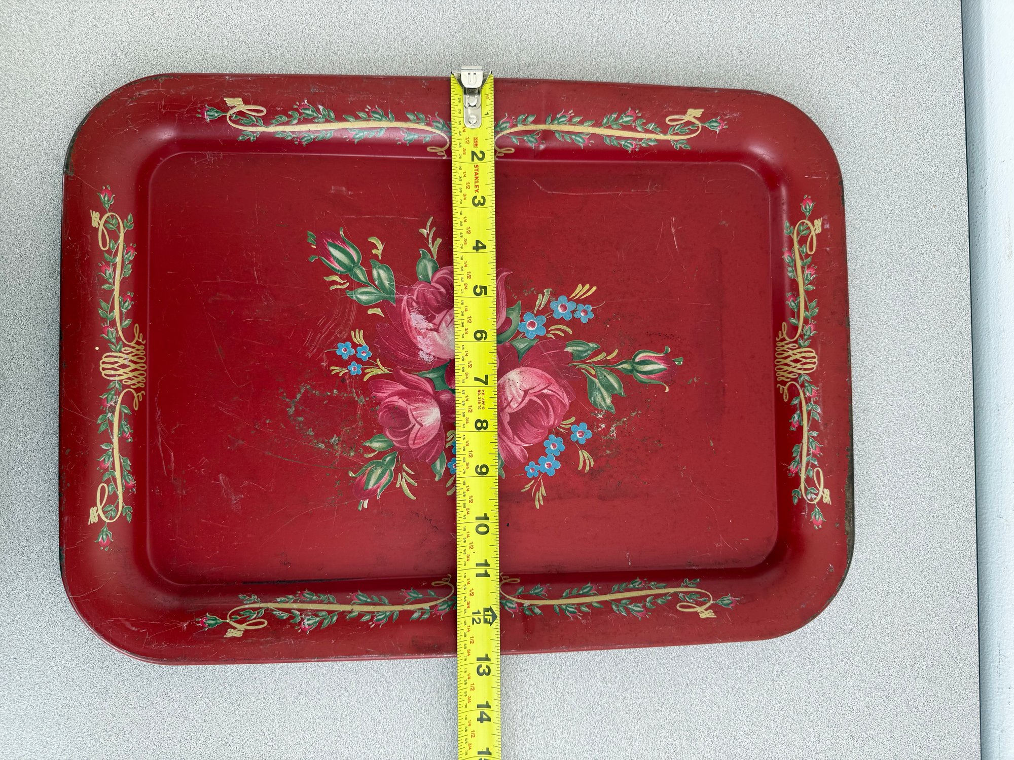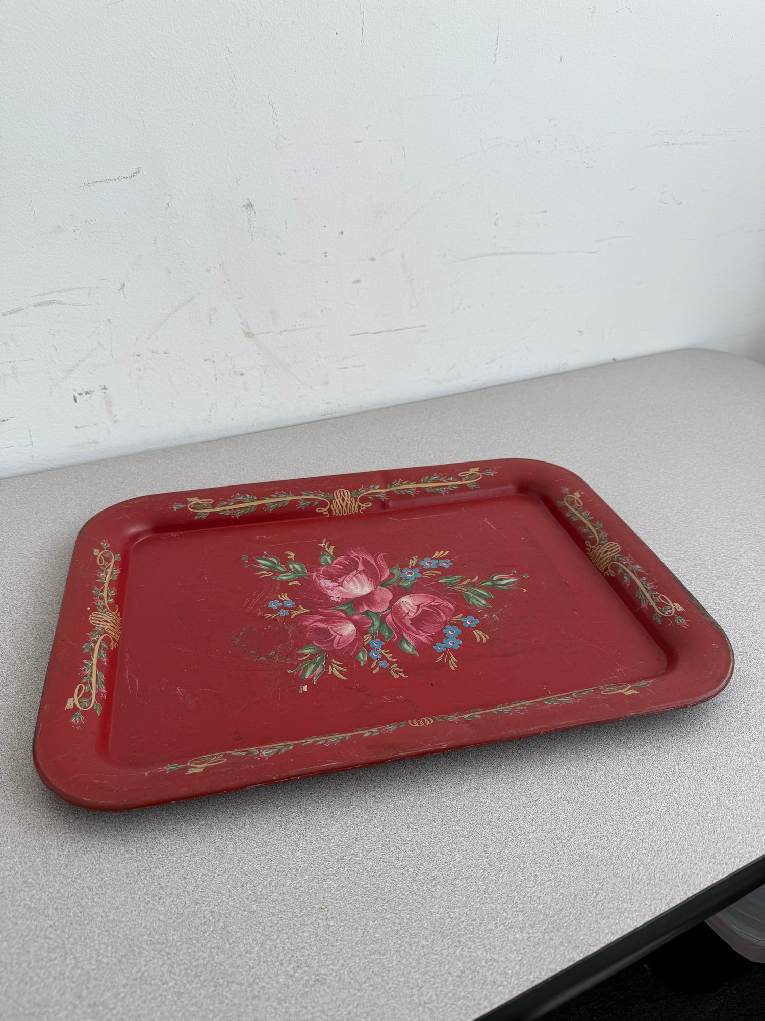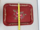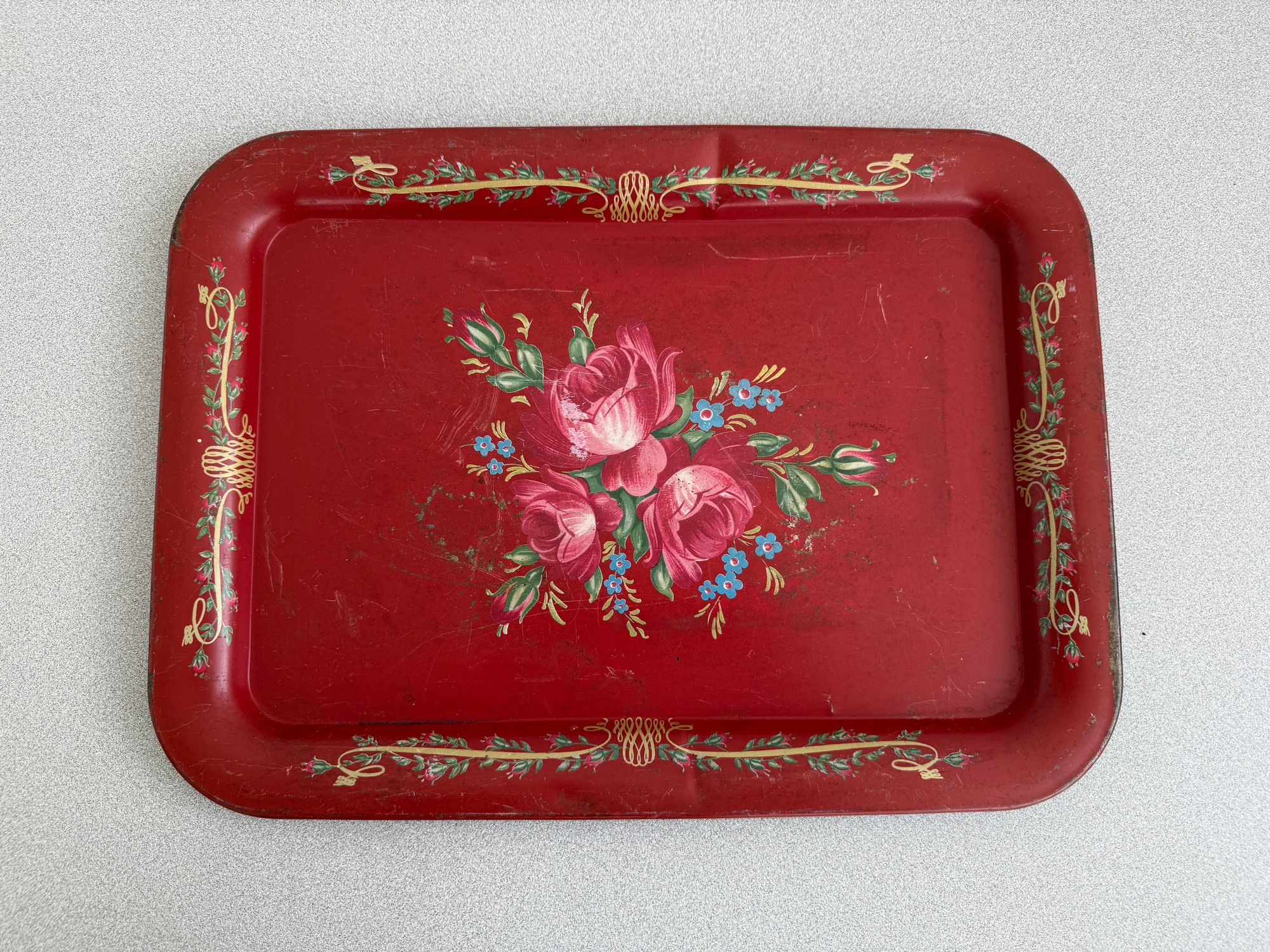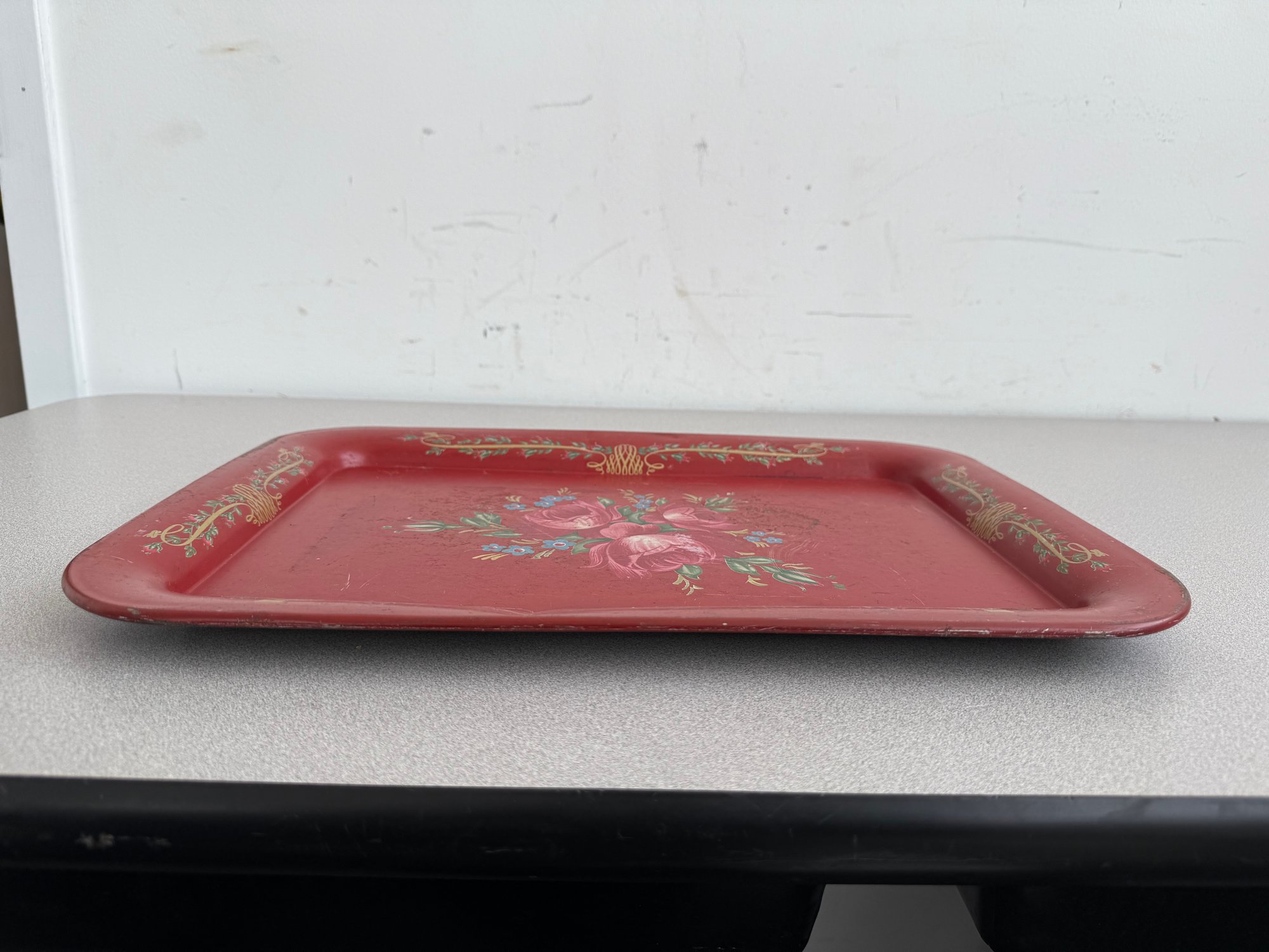 This unique lot features two distinct examples of vintage metalware: one decorative tole serving tray and one historical brewery advertising tray. Both pieces offer functional charm and collectible appeal.
