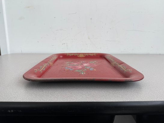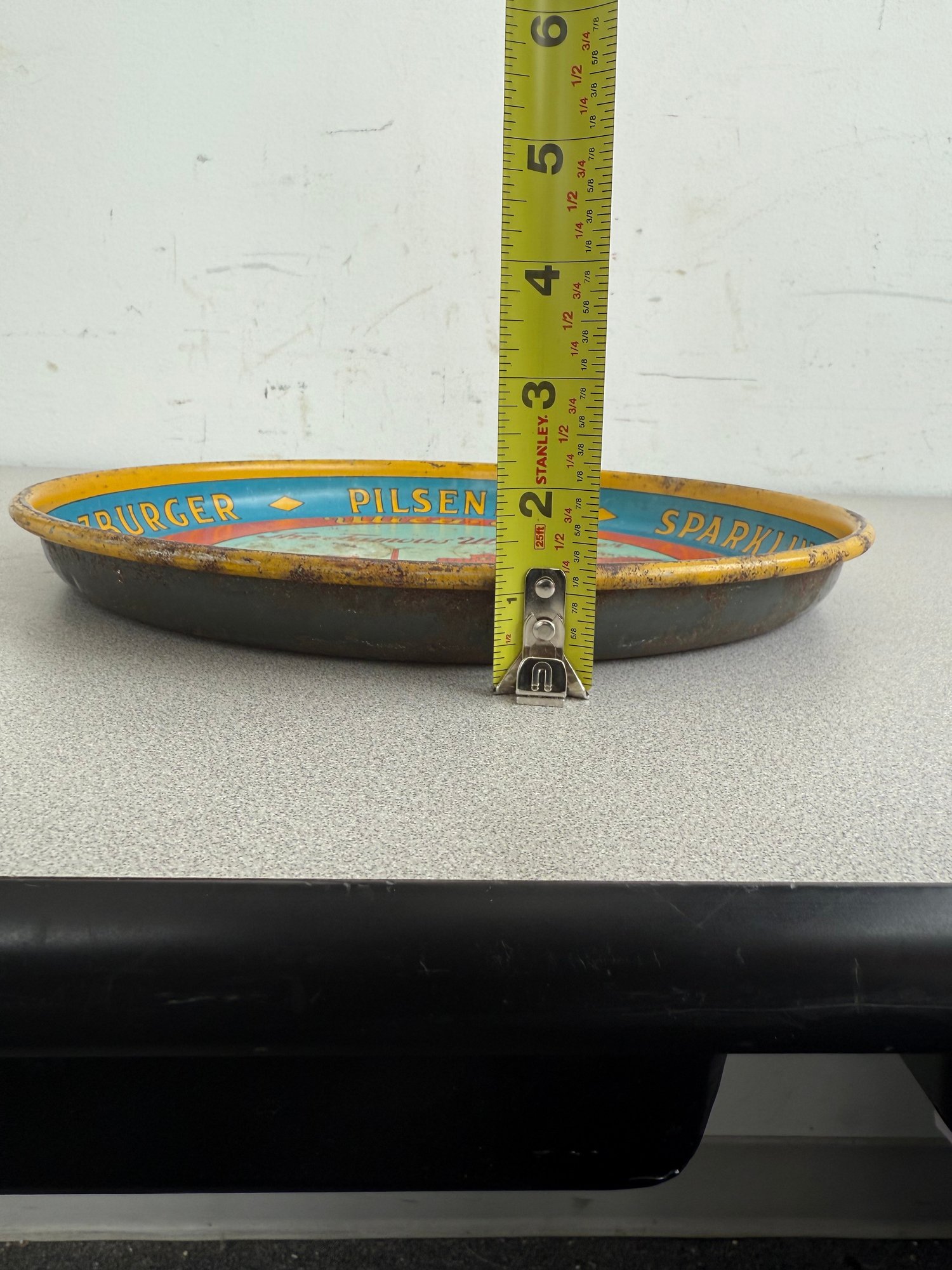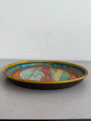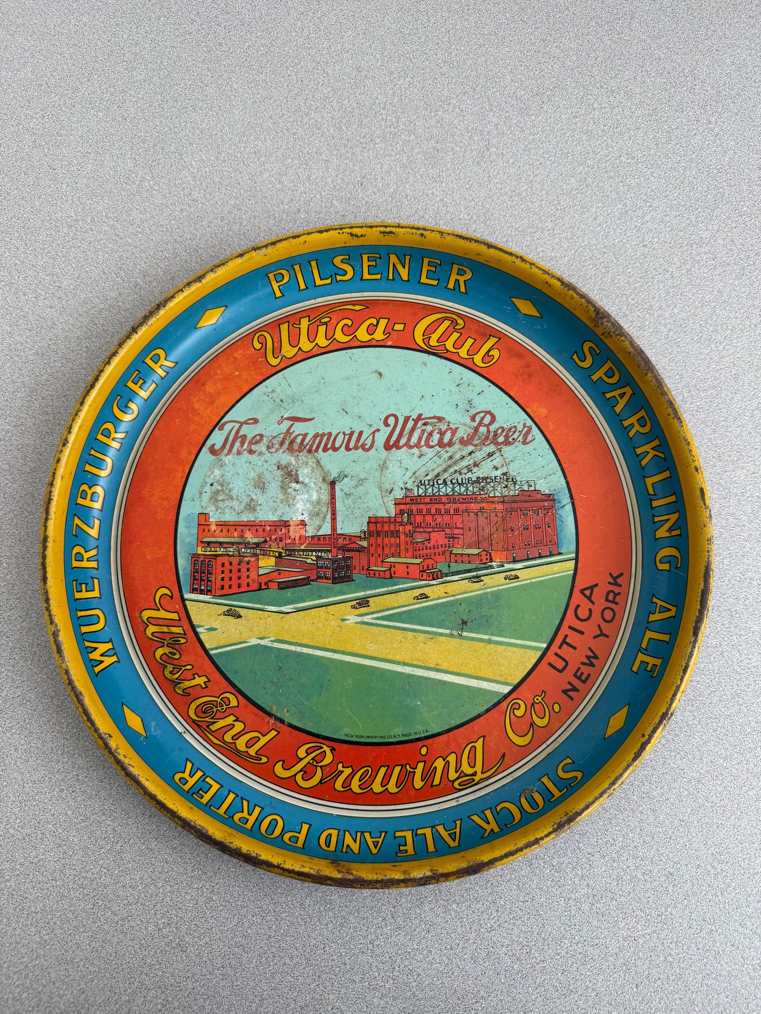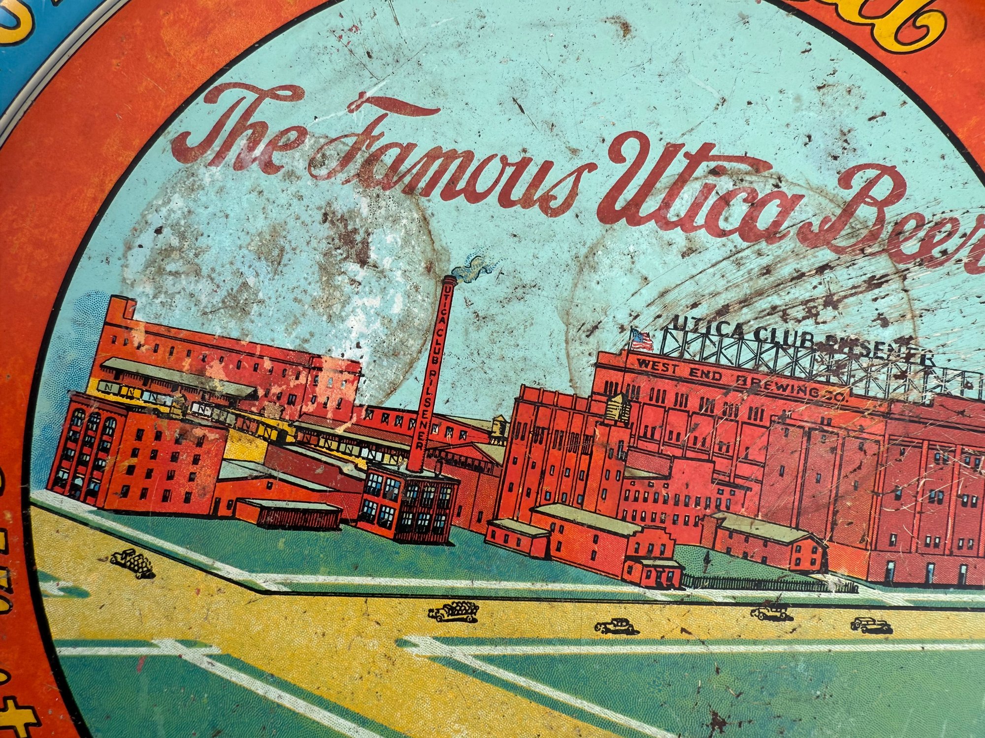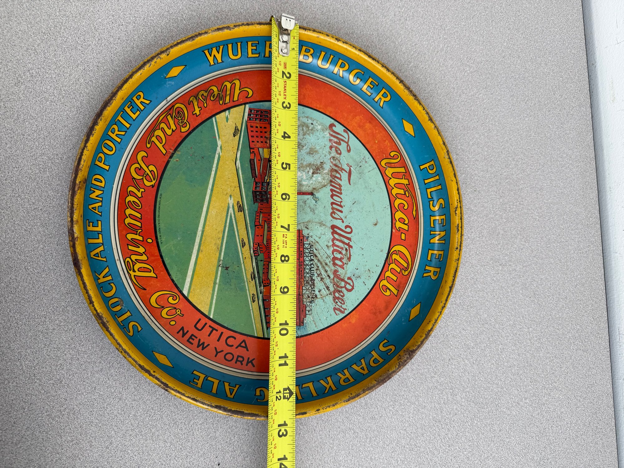 This unique lot features two distinct examples of vintage metalware: one decorative tole serving tray and one historical brewery advertising tray. Both pieces offer functional charm and collectible appeal.