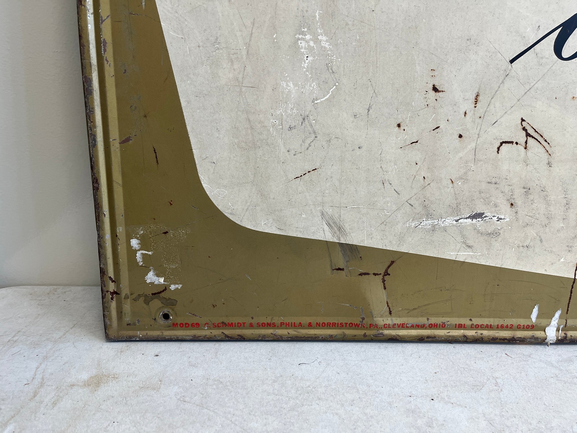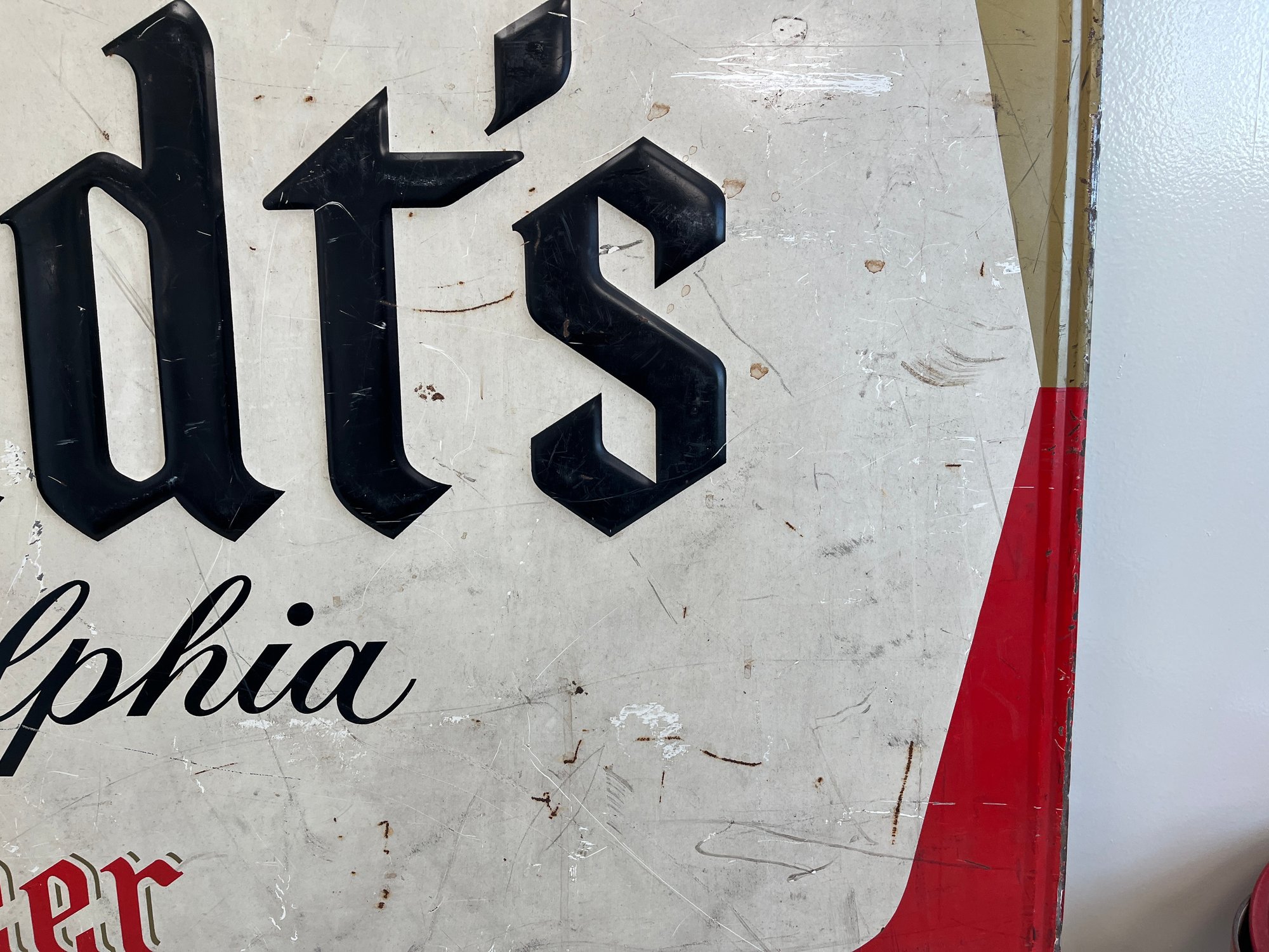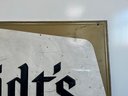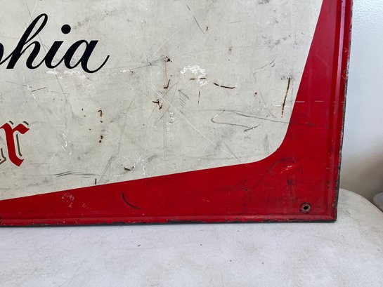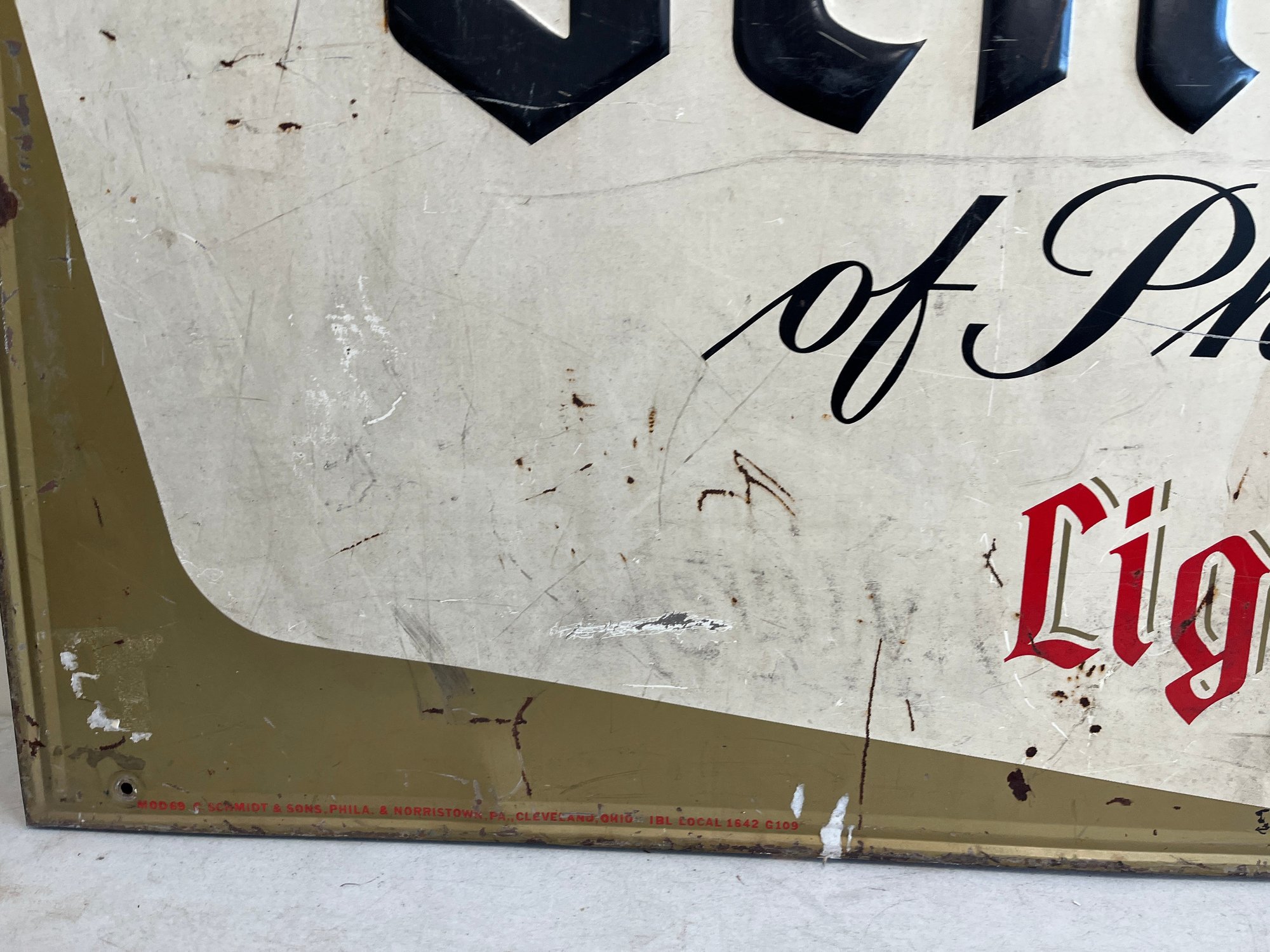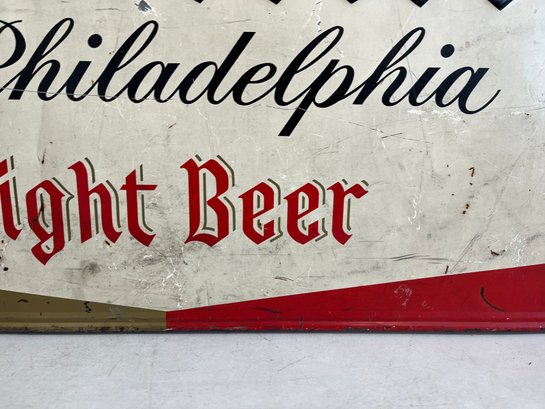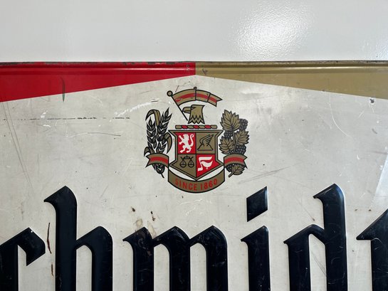 This vintage advertisement represents a classic piece of Mid-Century breweriana for Schmidt's of Philadelphia Light Beer, a brand that was once synonymous with Philadelphia’s rich brewing culture. Produced by C. Schmidt & Sons, a brewery founded by Christian Schmidt in 1860, this sign reflects a period when the company was the city's largest brewer, eventually peaking as the ninth-largest in the U.S. during the late 1970s. The design features the official Schmidt's Coat of Arms alongside a distinctive tri-tone color palette of vibrant red, antique gold, and stark white. Rendered in a bold, black Gothic-style Blackletter font, this type of signage was typically lithographed on heavy-gauge steel or aluminum.