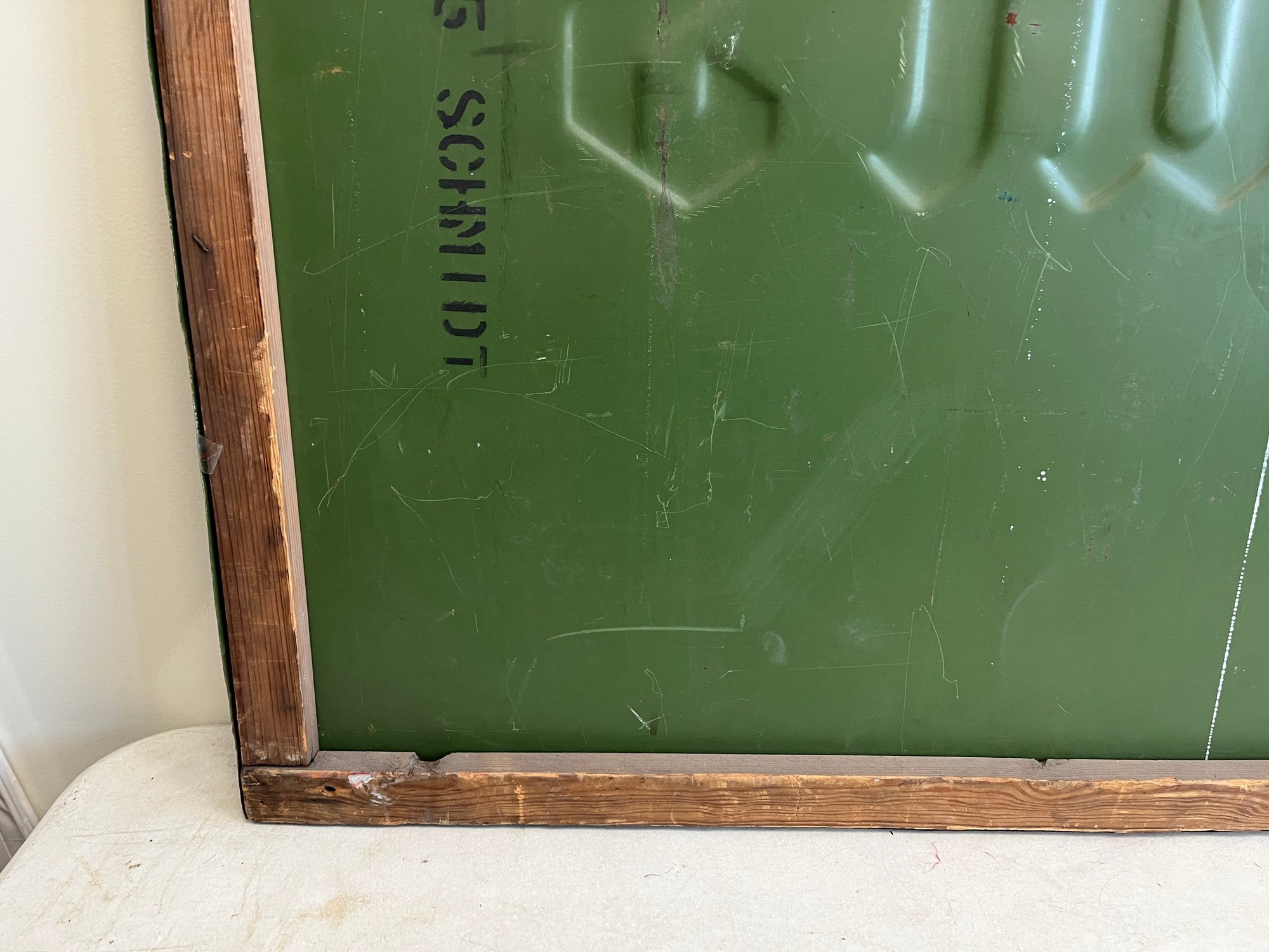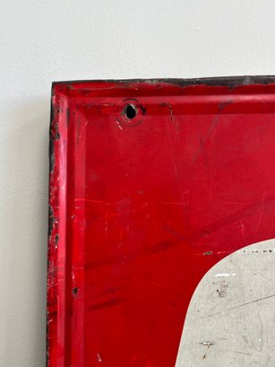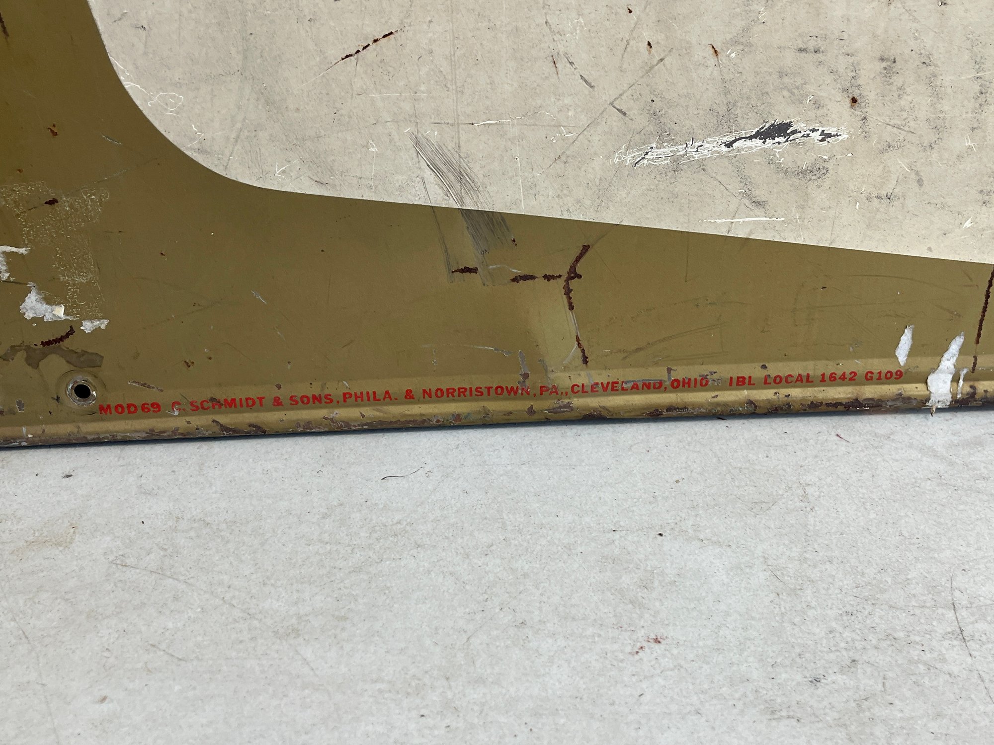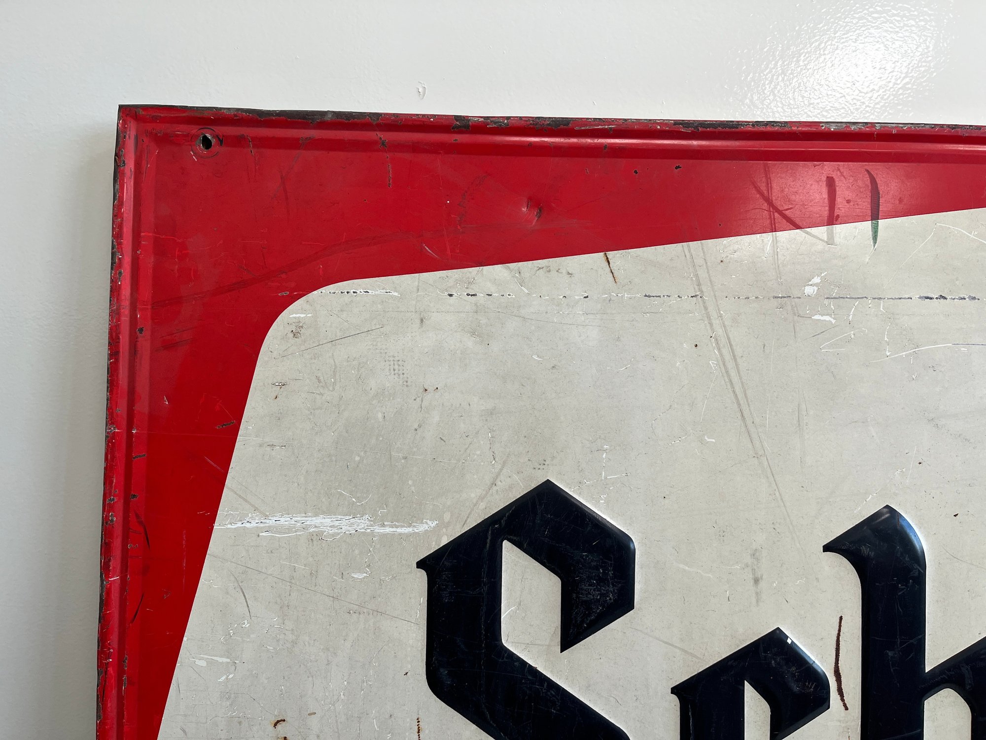 This vintage advertisement represents a classic piece of Mid-Century breweriana for Schmidt's of Philadelphia Light Beer, a brand that was once synonymous with Philadelphia’s rich brewing culture. Produced by C. Schmidt & Sons, a brewery founded by Christian Schmidt in 1860, this sign reflects a period when the company was the city's largest brewer, eventually peaking as the ninth-largest in the U.S. during the late 1970s. The design features the official Schmidt's Coat of Arms alongside a distinctive tri-tone color palette of vibrant red, antique gold, and stark white. Rendered in a bold, black Gothic-style Blackletter font, this type of signage was typically lithographed on heavy-gauge steel or aluminum.