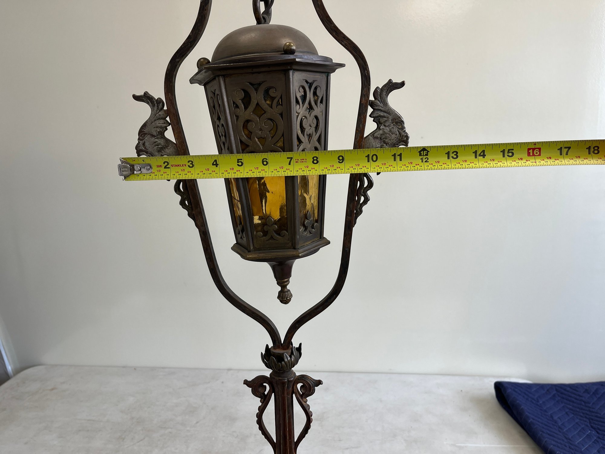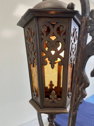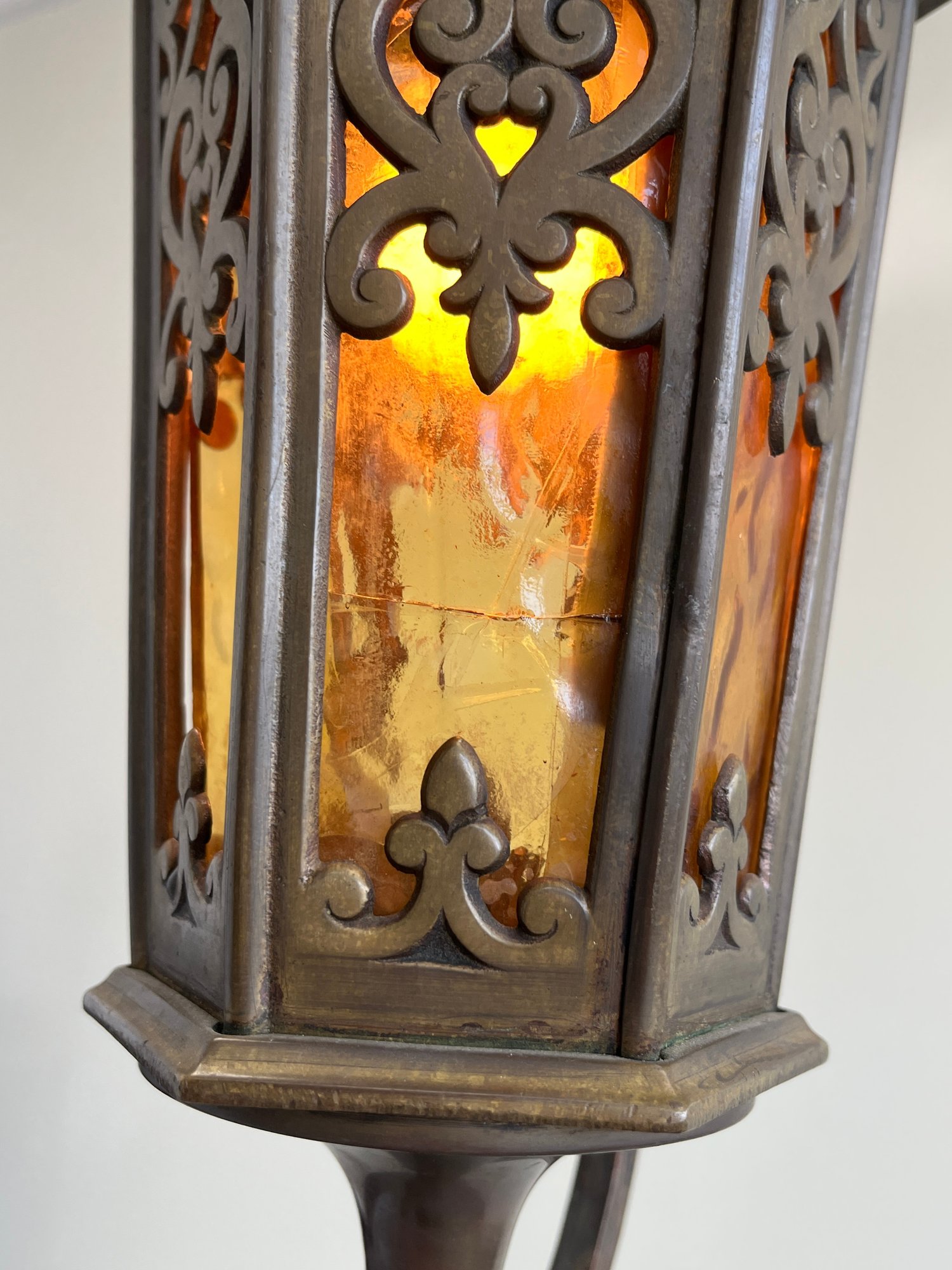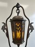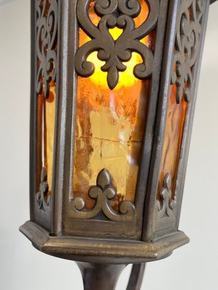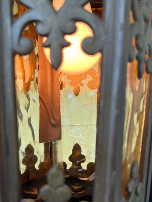Add a touch of Old World mystery to your space with this masterfully crafted Spanish Revival lantern. This piece blends rugged Mediterranean ironwork with the warm, moody glow of mid-century cathedral glass.