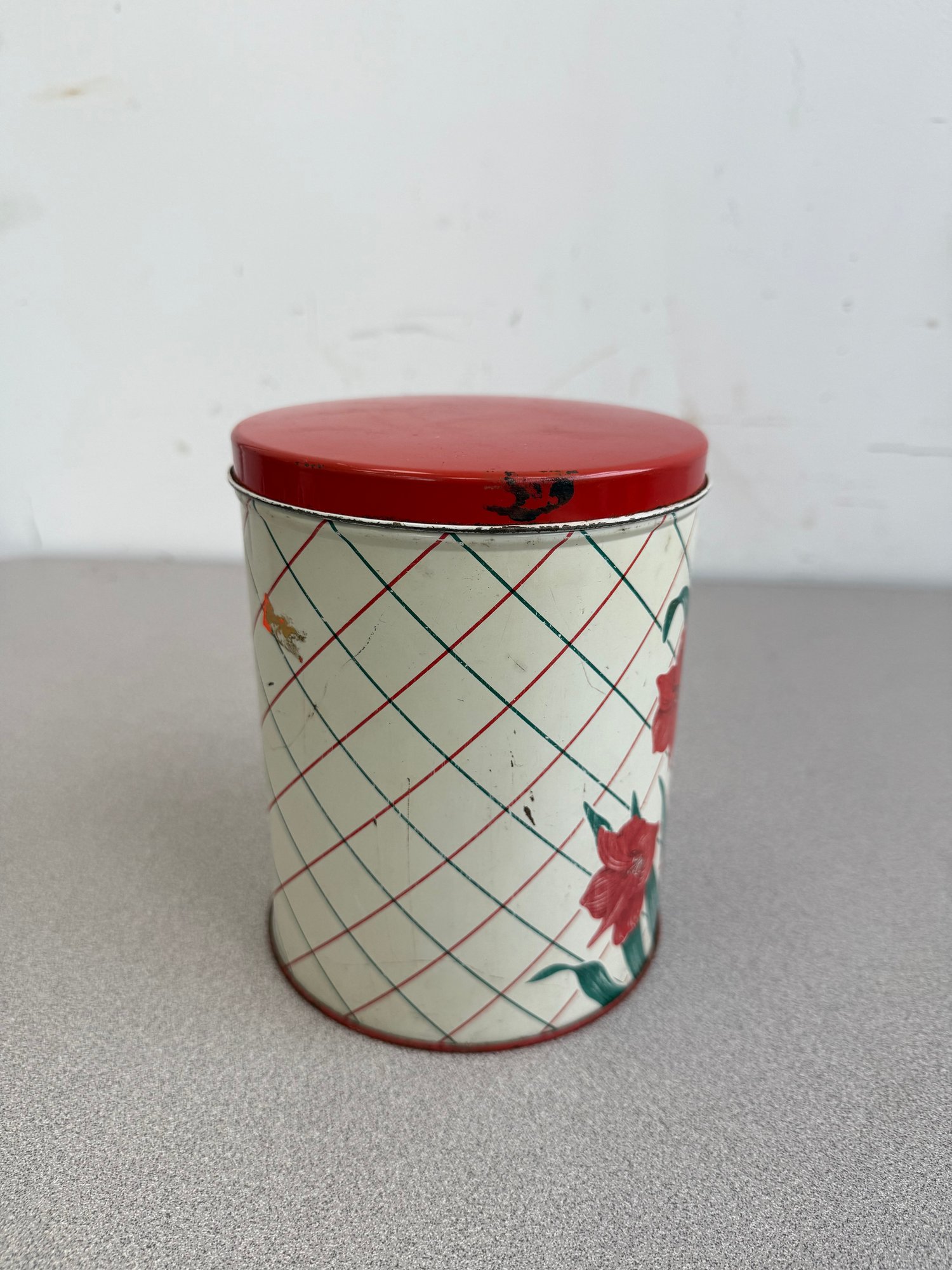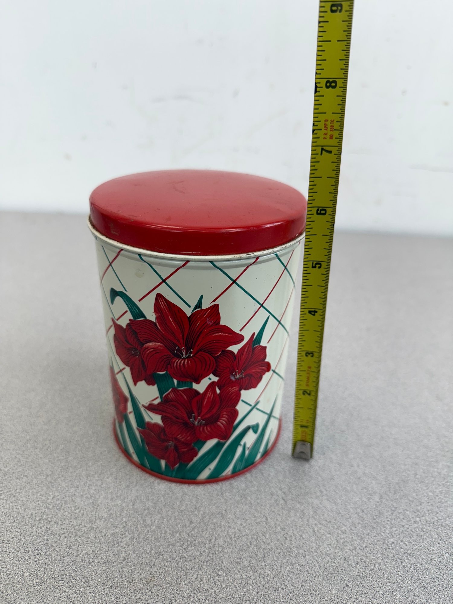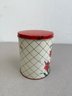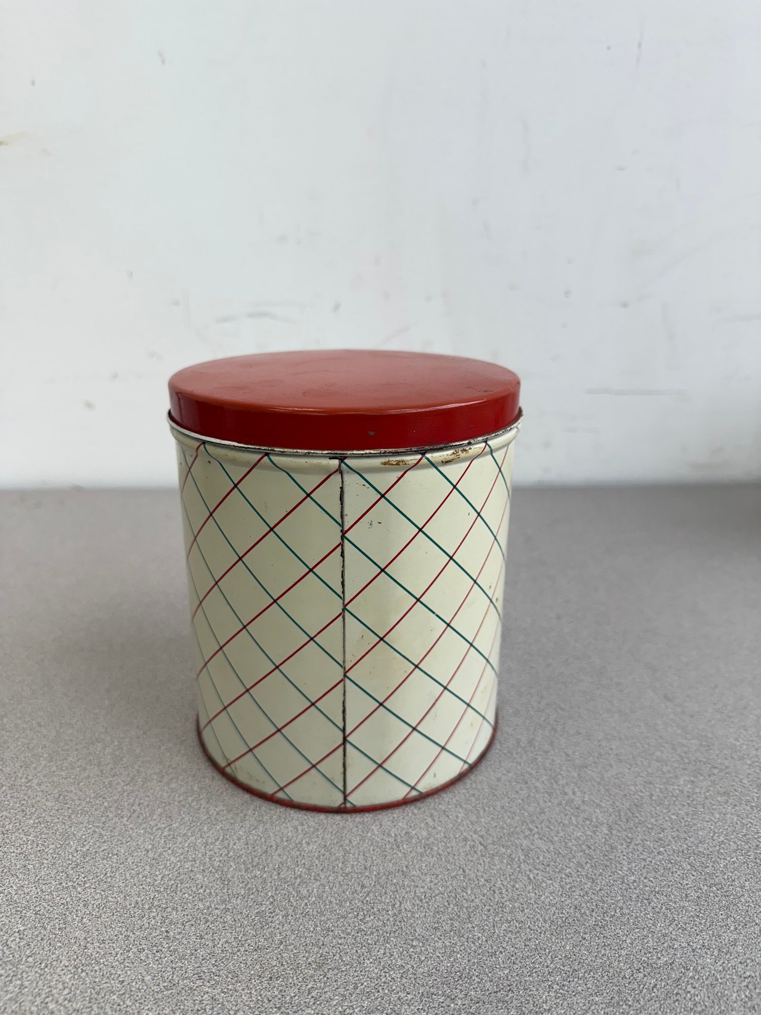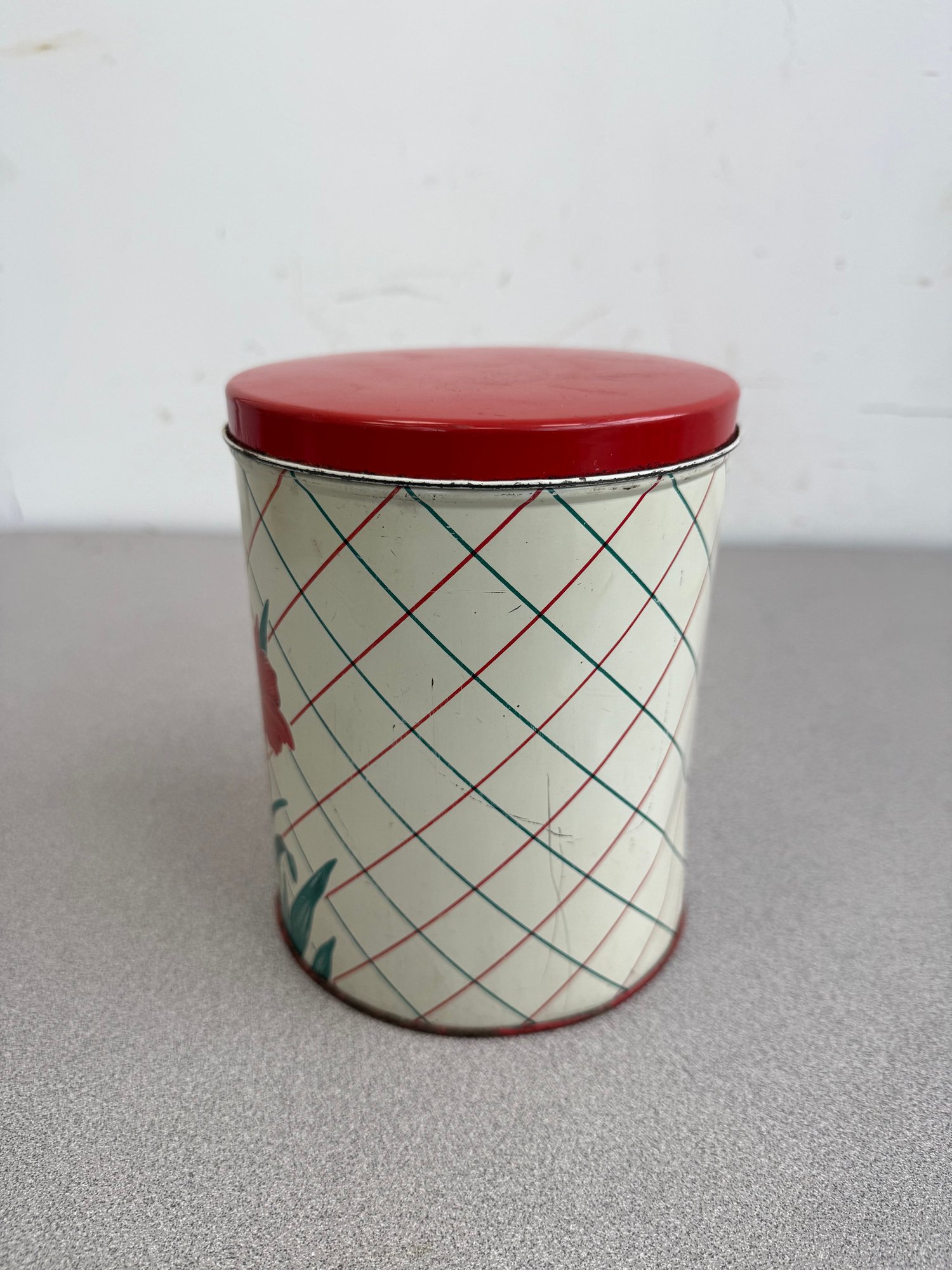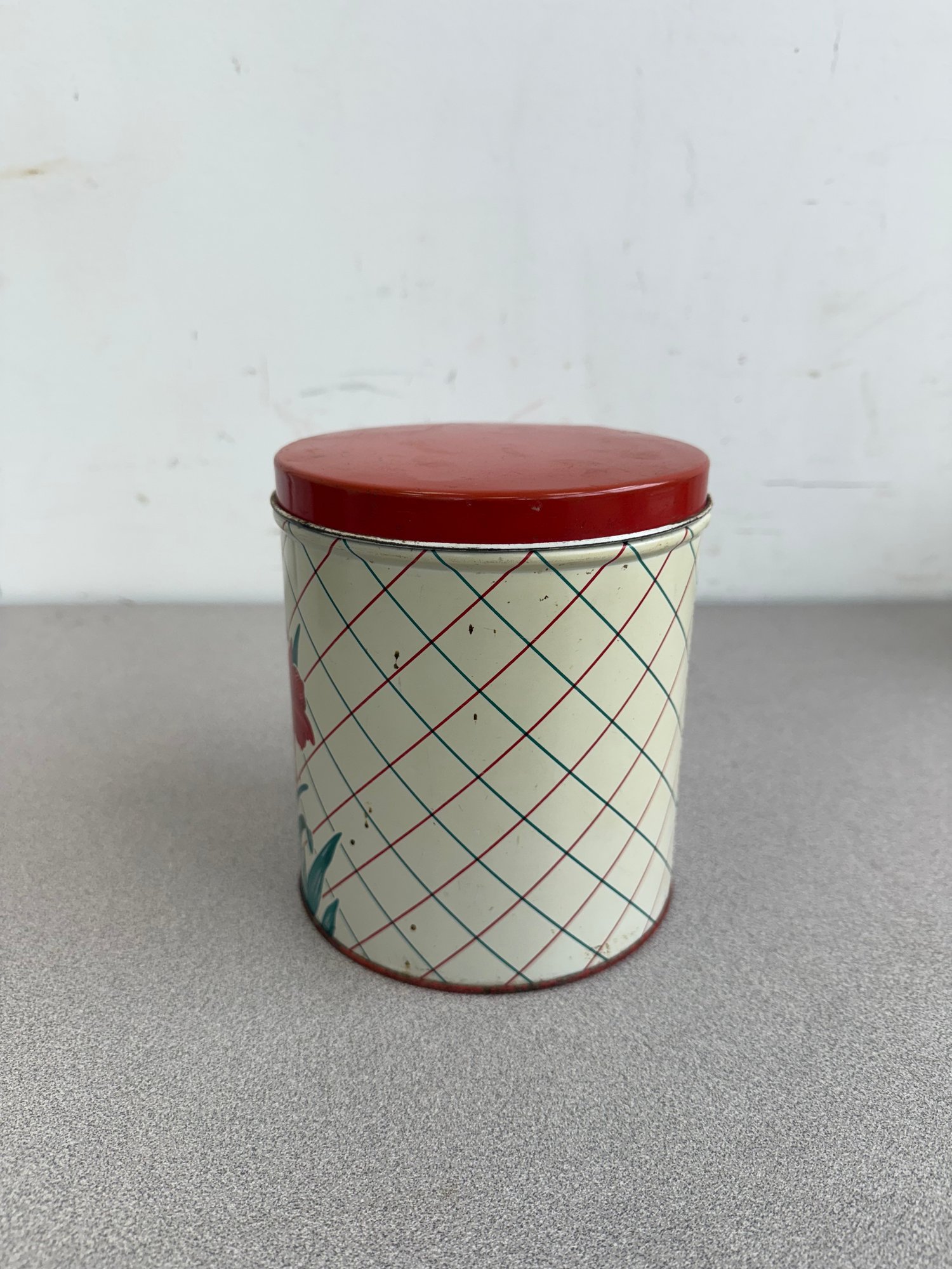 A charming set of three vintage metal kitchen canisters, perfect for adding a touch of retro charm to any kitchen decor. This set features a classic design from the mid-20th century.