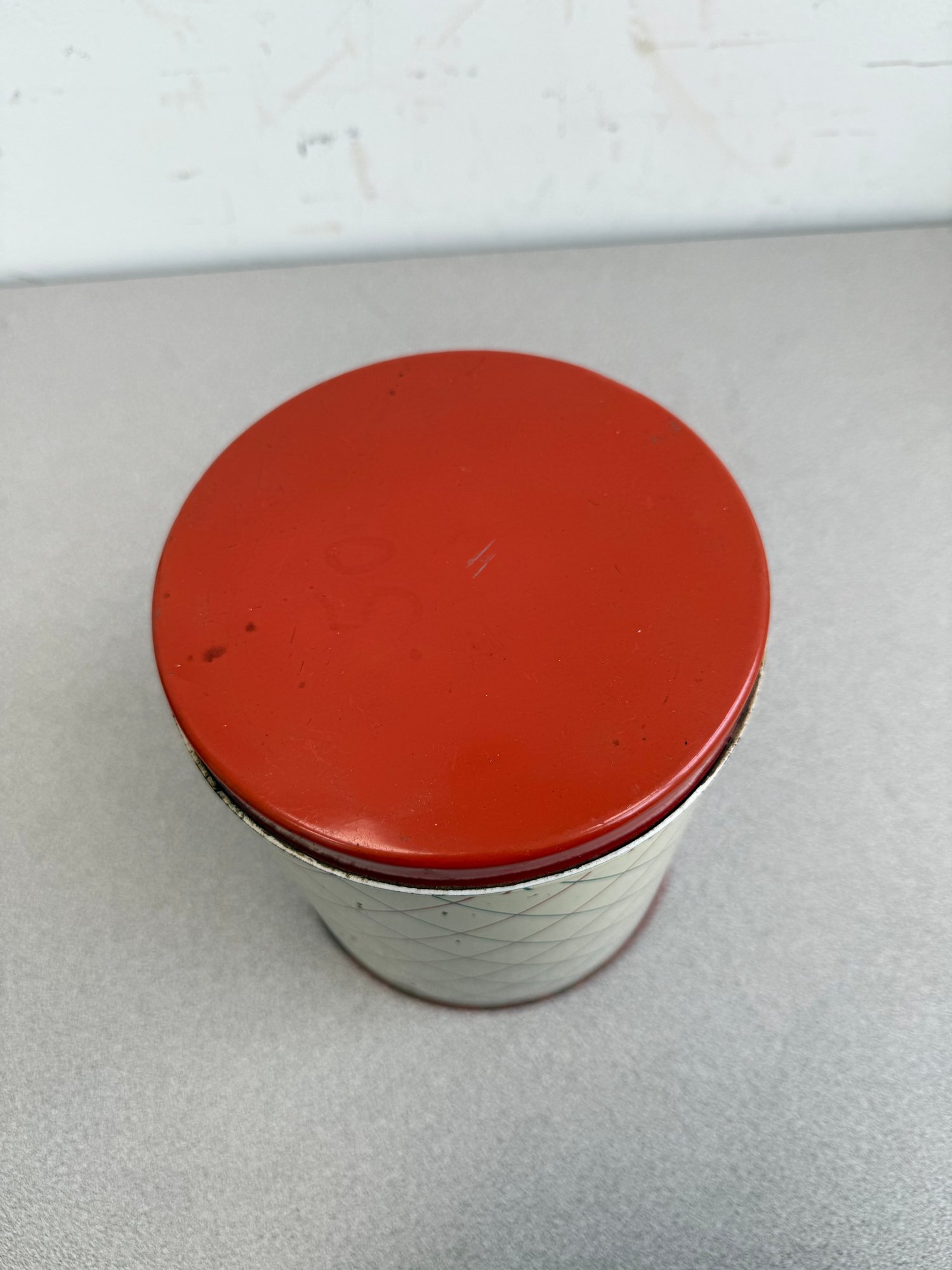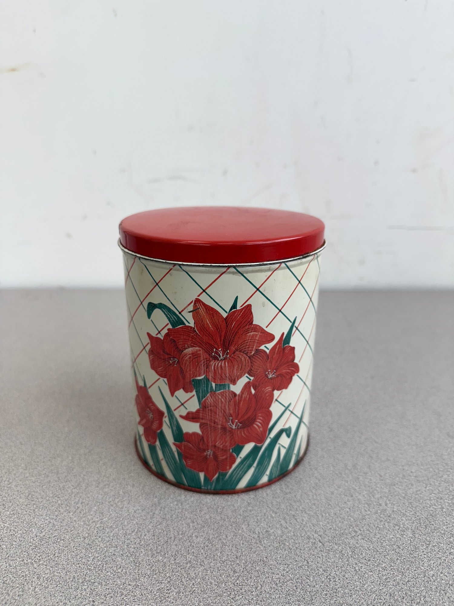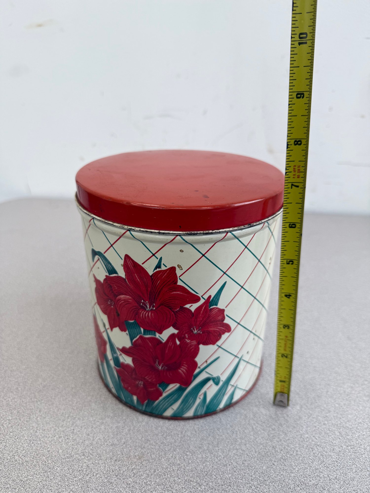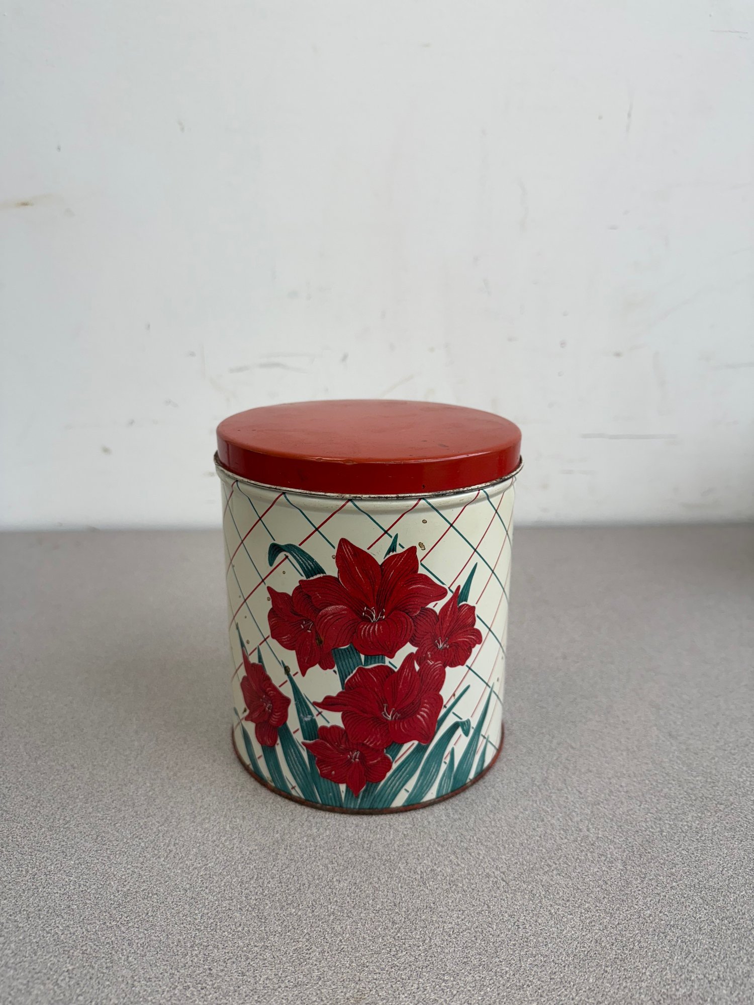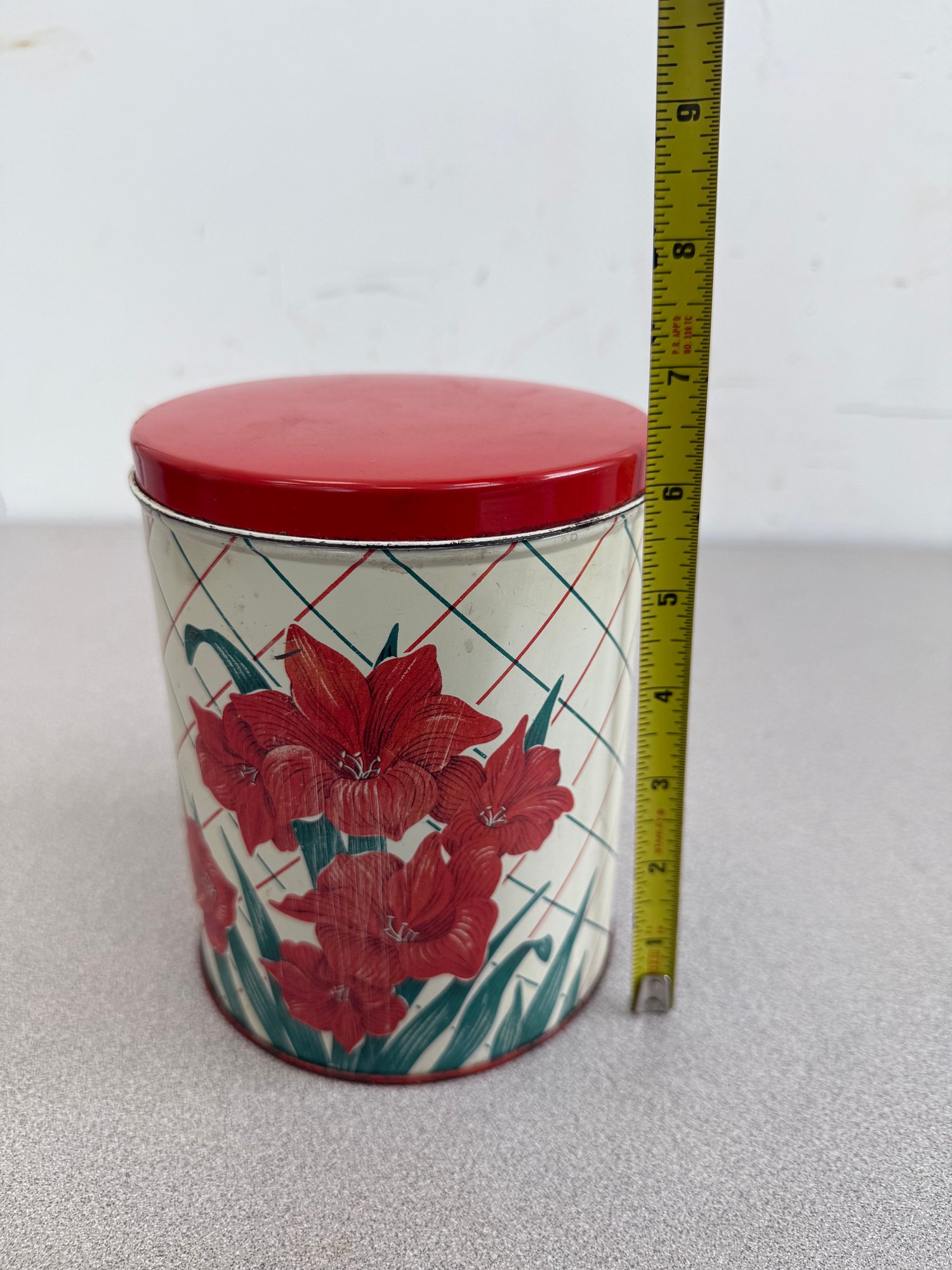 A charming set of three vintage metal kitchen canisters, perfect for adding a touch of retro charm to any kitchen decor. This set features a classic design from the mid-20th century.