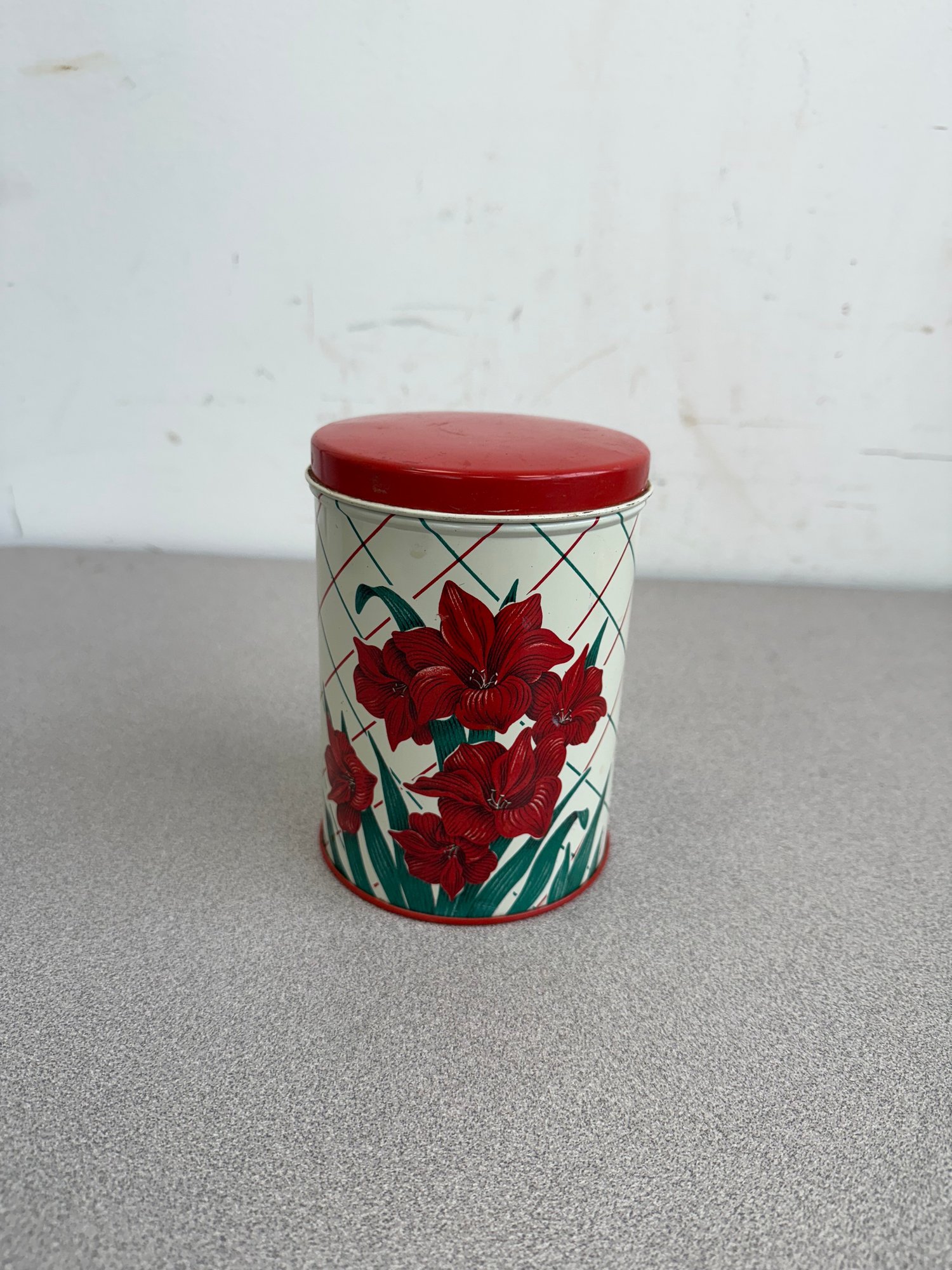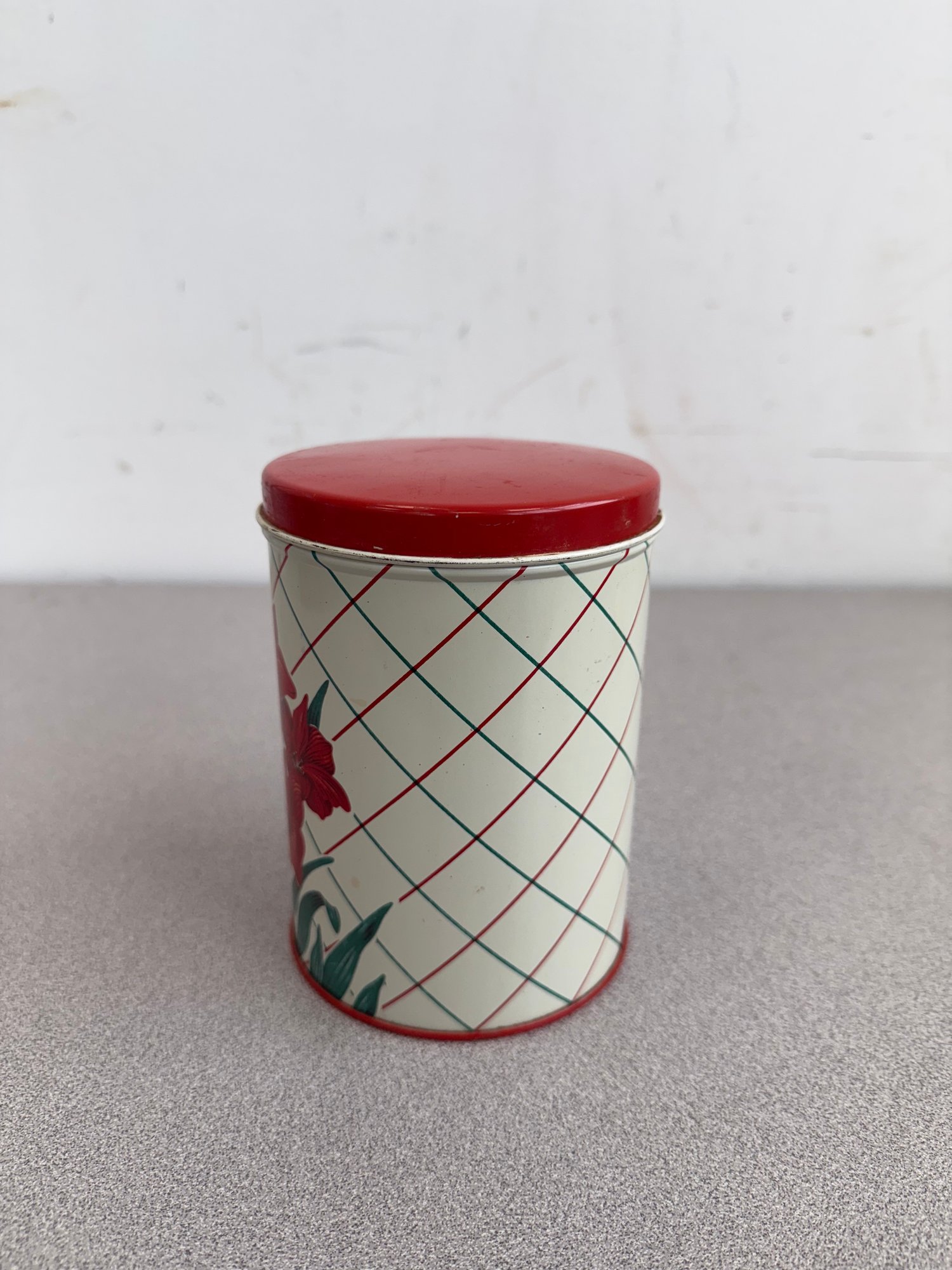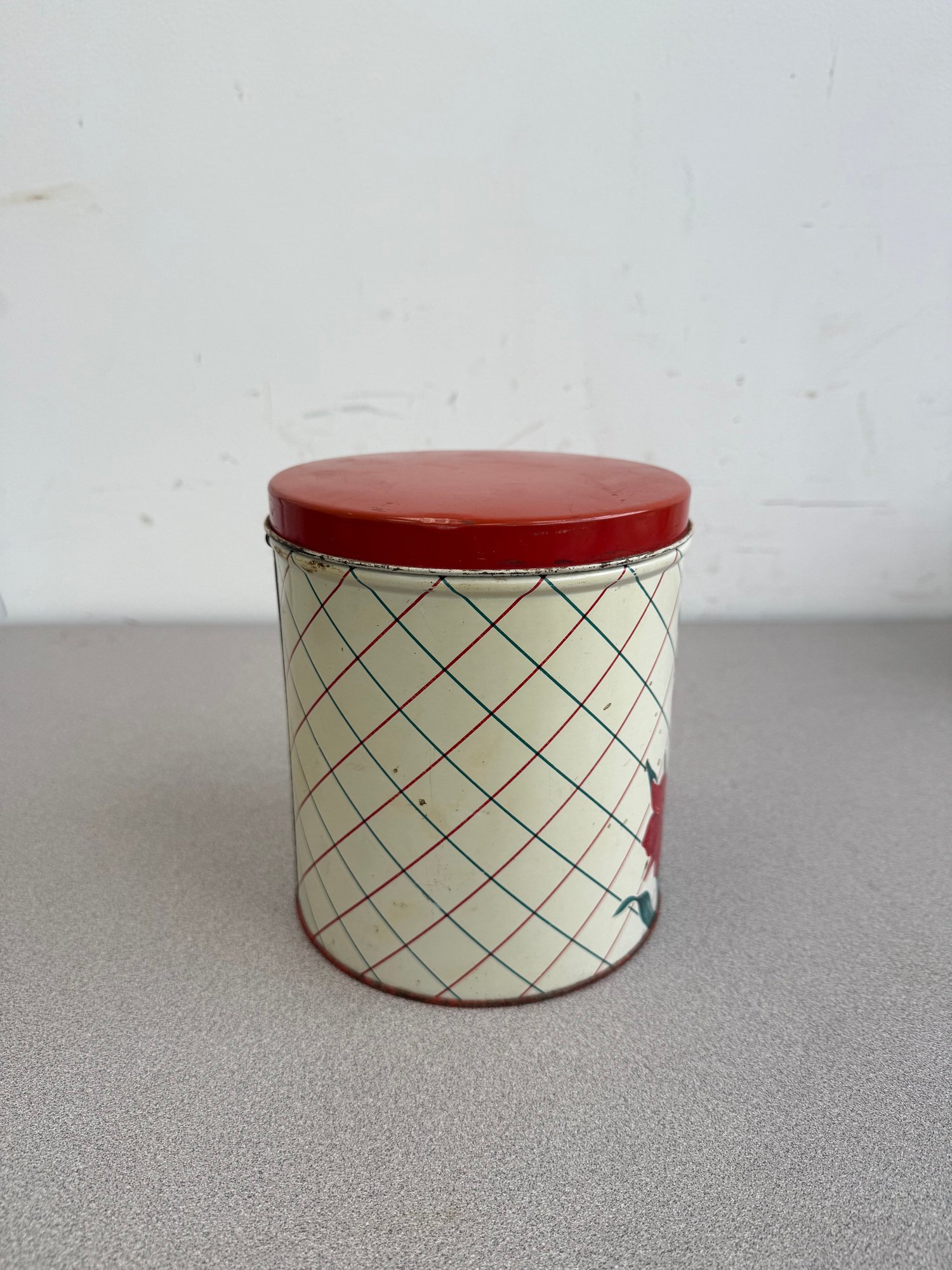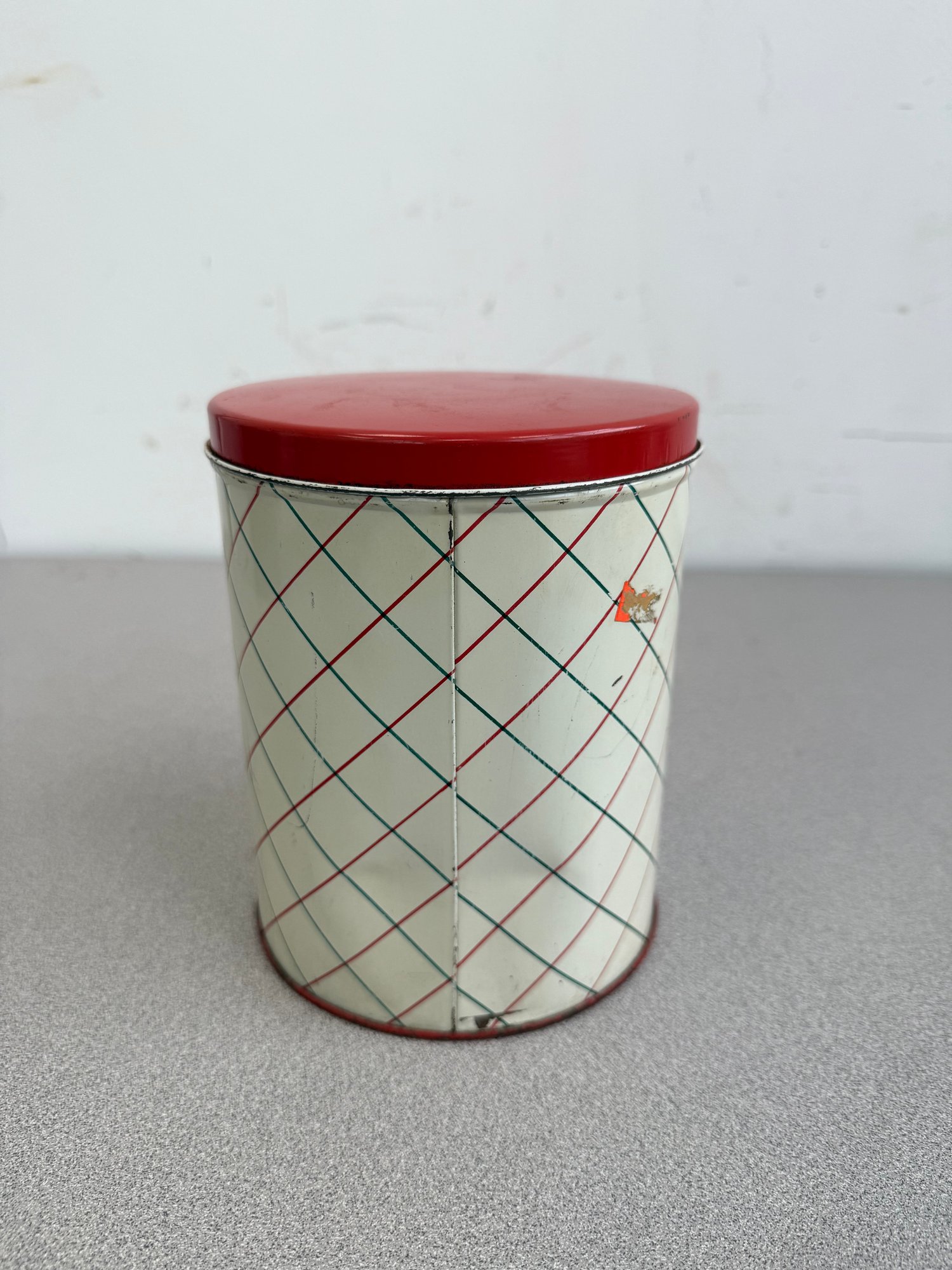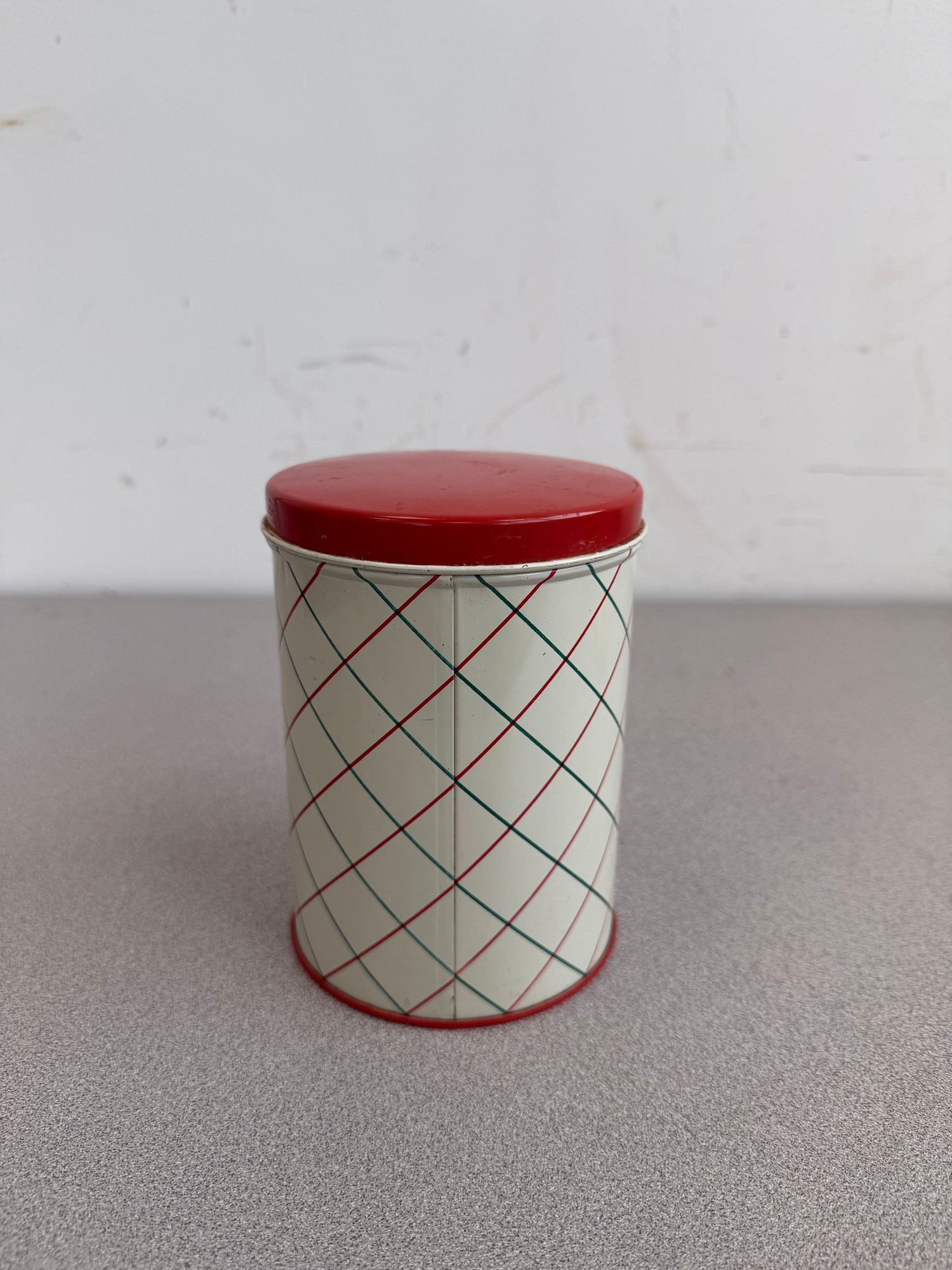 A charming set of three vintage metal kitchen canisters, perfect for adding a touch of retro charm to any kitchen decor. This set features a classic design from the mid-20th century.