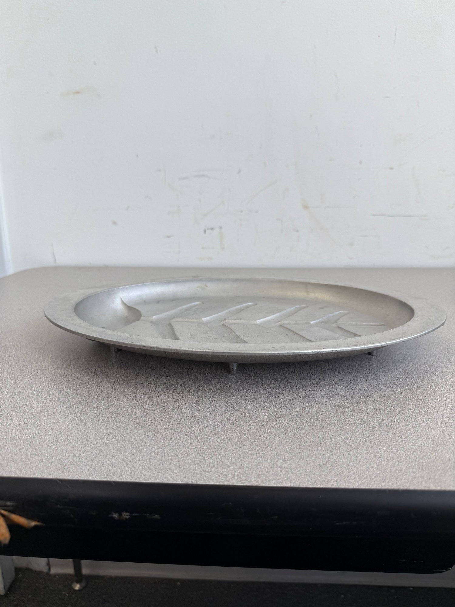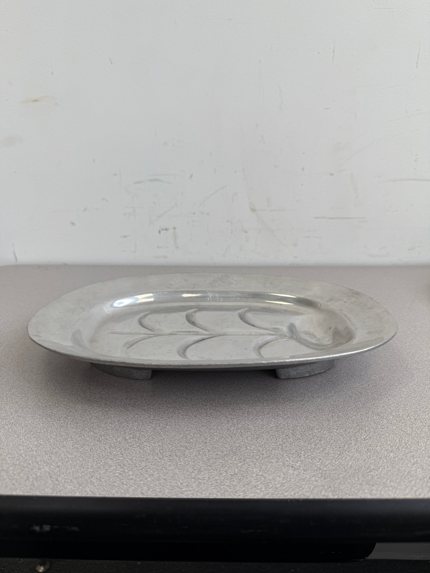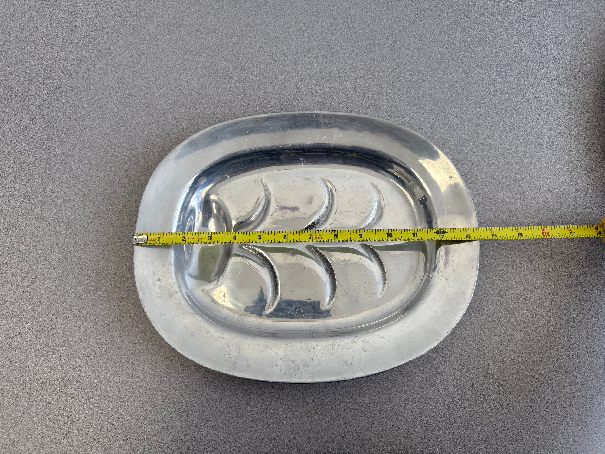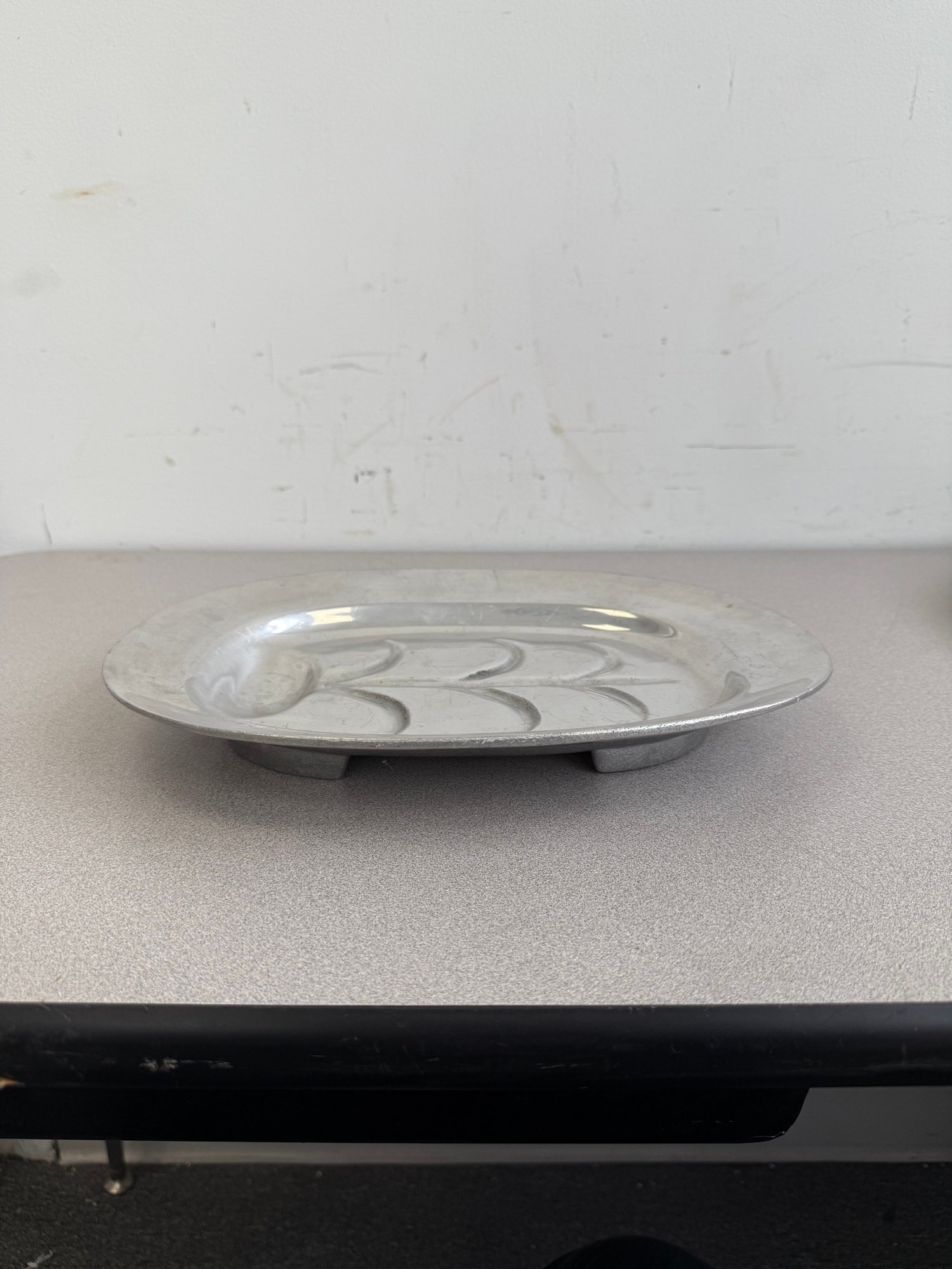 Elevate your dining experience with these timeless and practical pieces of serveware, produced for the purpose of serving meat. Crafted with both beauty and function in mind, this platter is a testament to quality American metalware design.