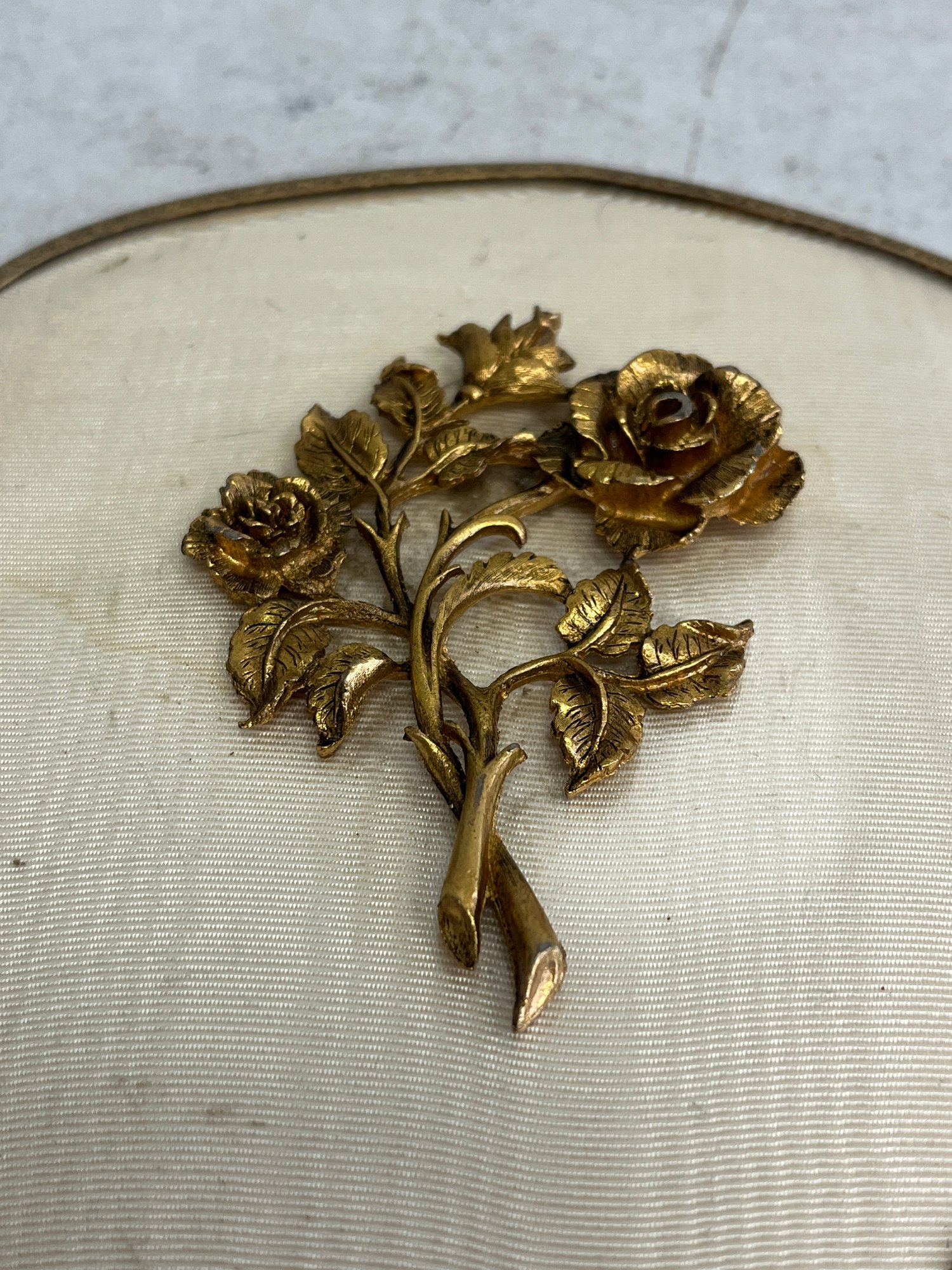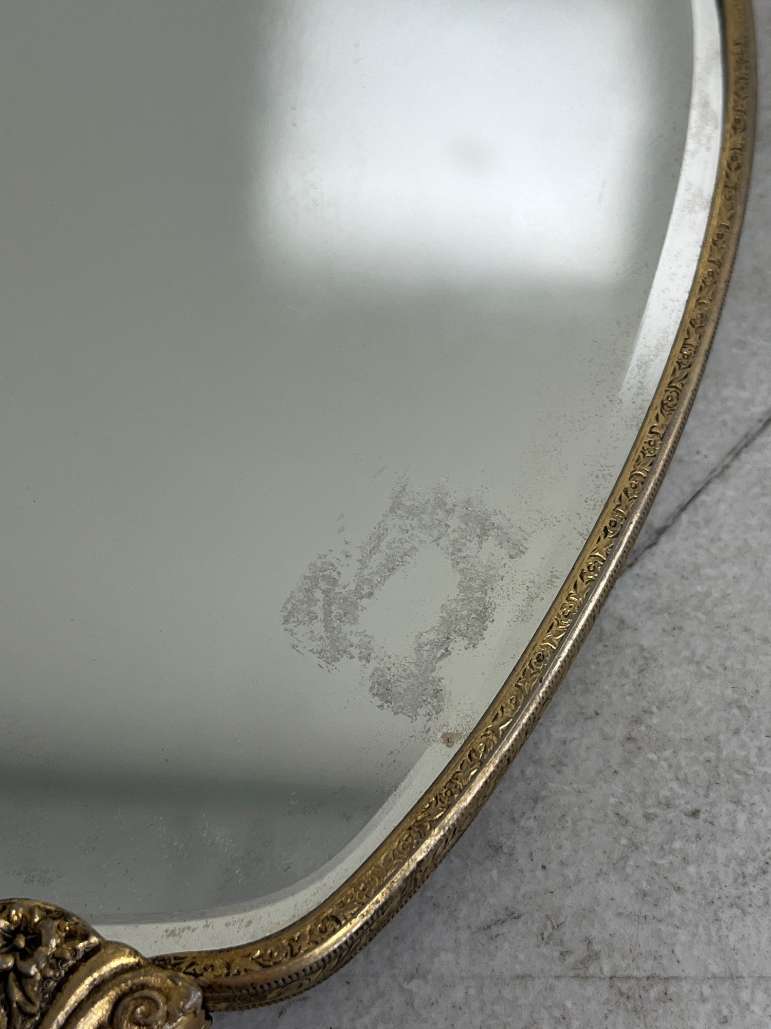 A striking pair of vintage hand mirrors, each a testament to classic vanity aesthetics. These pieces embody the luxurious Hollywood Regency or Art Nouveau revival styles popular from the 1940s to 1960s, perfect for adding a touch of old-world glamour to any dresser or collection.