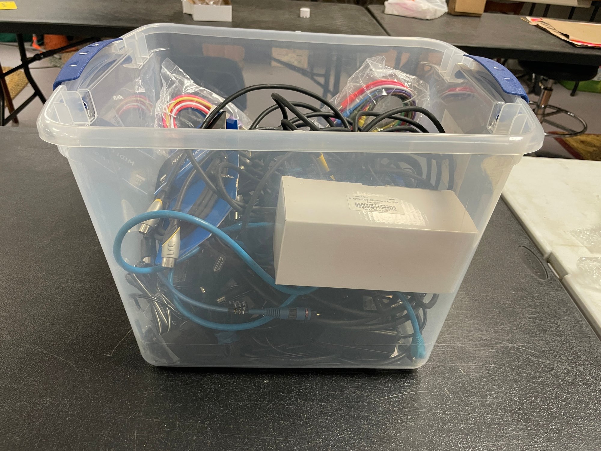 BUCKET OF CABLES/CORDS HDMI/USBPOWER SUPPLIESMIDIPATCH CABLES
