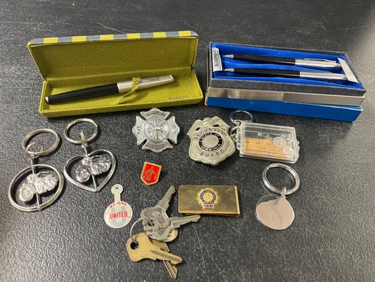 MEN'S LOT - BADGES, PENS, KEYS, ETC
