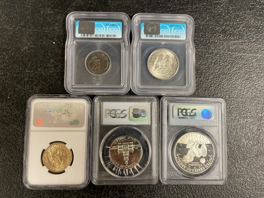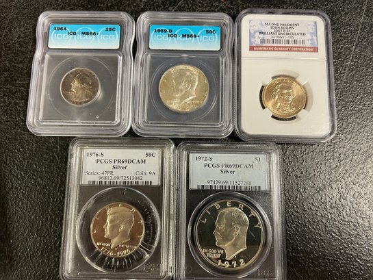 1964 WASHINGTON QUARTER, 1969-D KENNEDY 1/2, 2007D ADAMS $1, 1976-S SILVER KENNEDY PROOF CAMEO (PR69DCAM), 1972S SILVER IKE CAMEO PR69DCAM