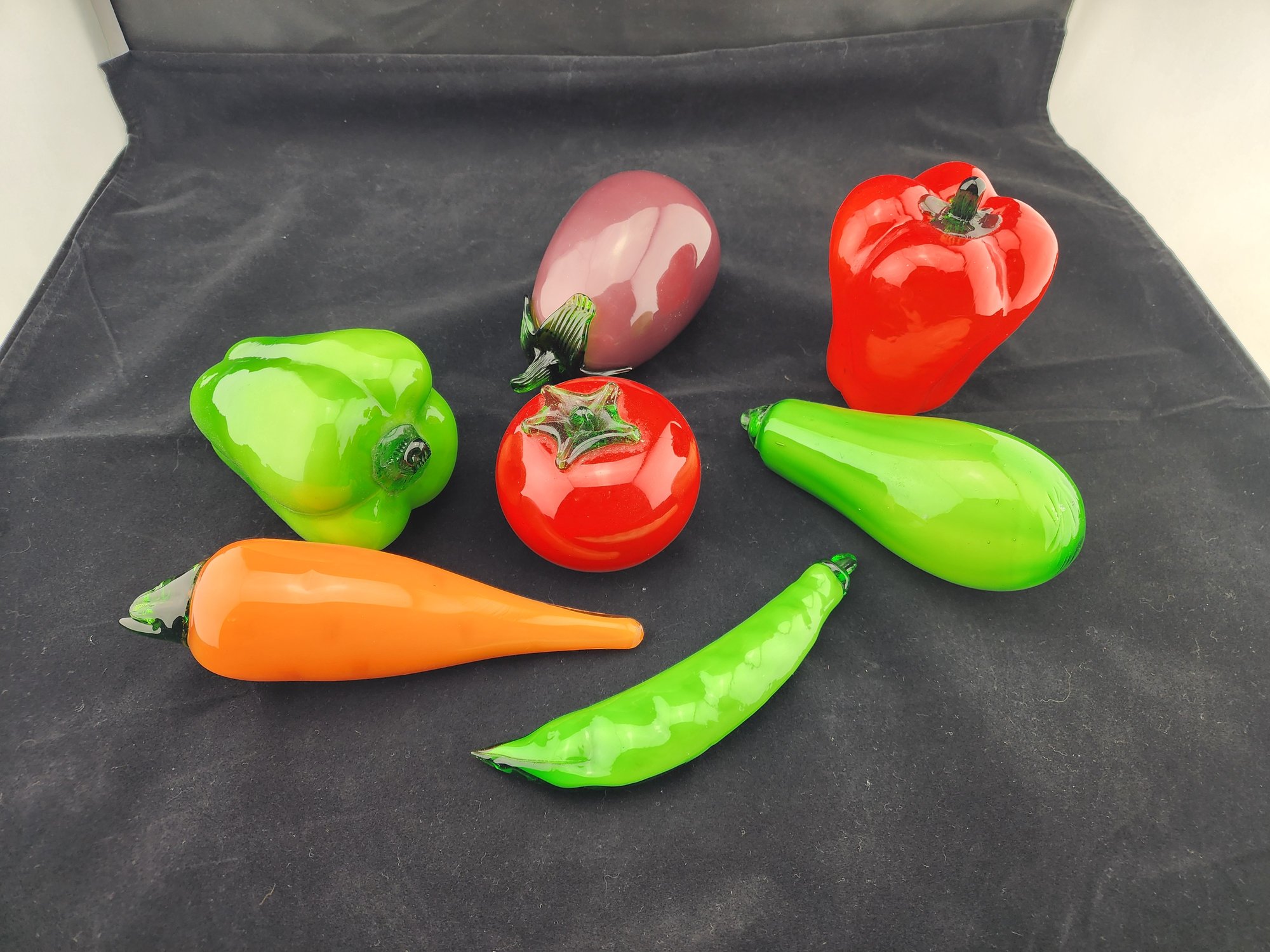 Life-sized glass vegetables: carrot, green and red bell pepper, eggplant, tomato, squash & peapod