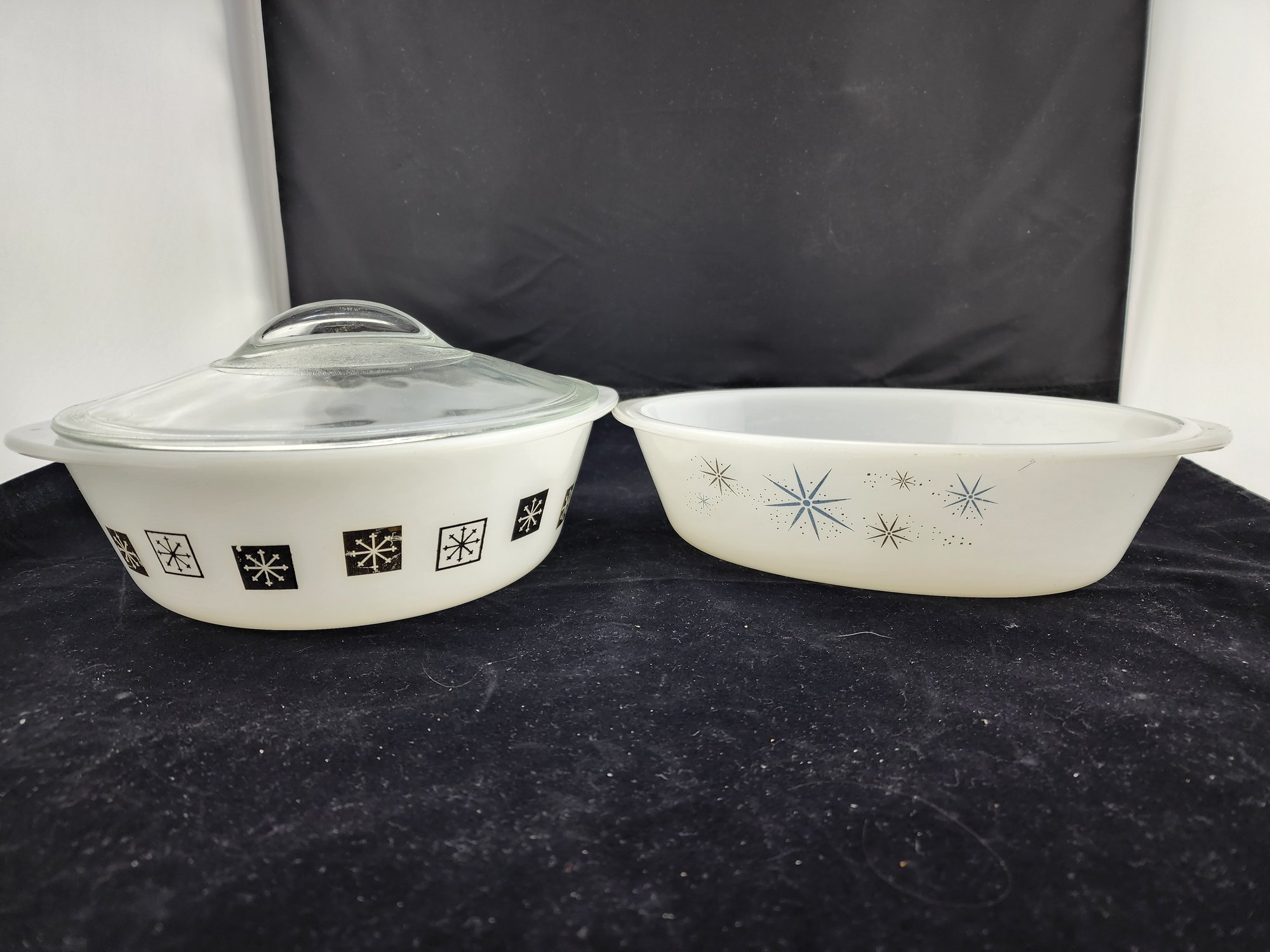 MCM round casserole with lid (this lid also fits Glasbake auction items in other lot) in a super fun gold and black atomic pattern. Smaller oval casserole is in an atomic snowflake or starburst pattern.