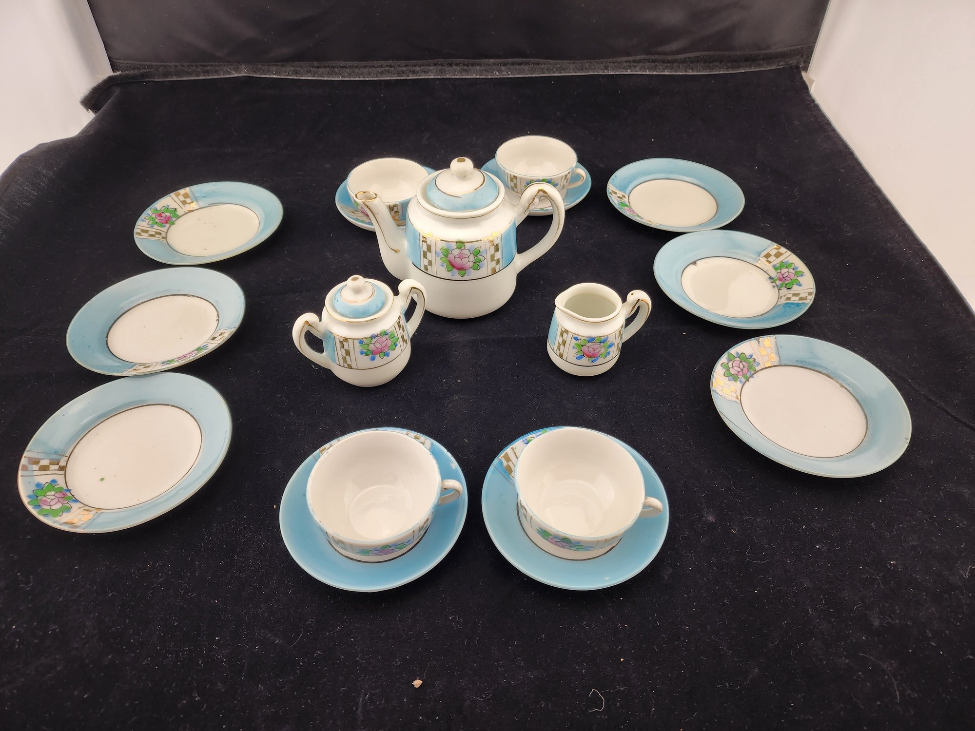 Sweet vintage child's tea set with teapot, creamer, sugar, four cups and saucers and 6 plates.