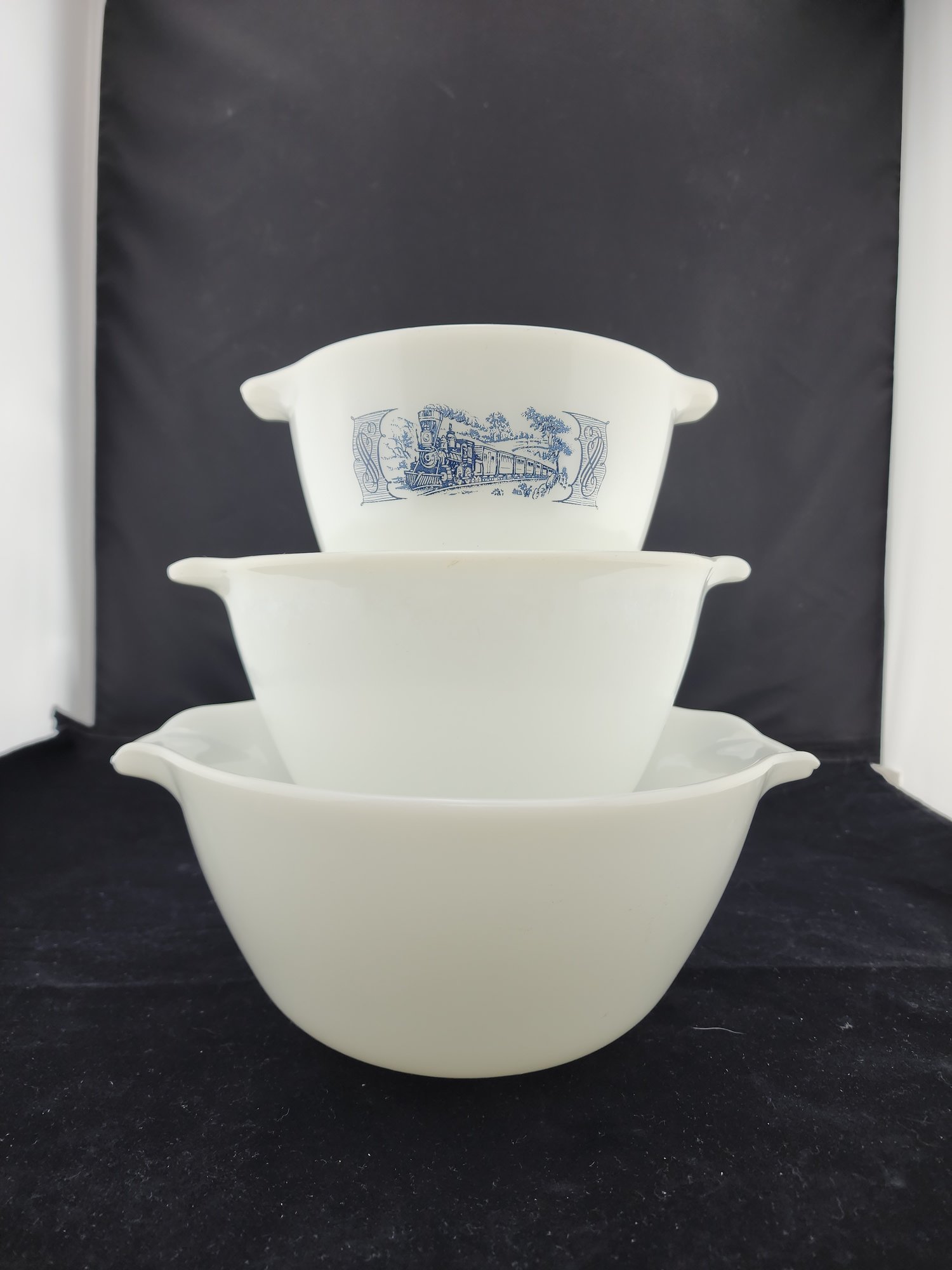 Large and Medium sized Nesting Mixing bowls in white with the FireKing stamp. Smallest bowl has a Currier & Ives scene, but has no marking on the base.